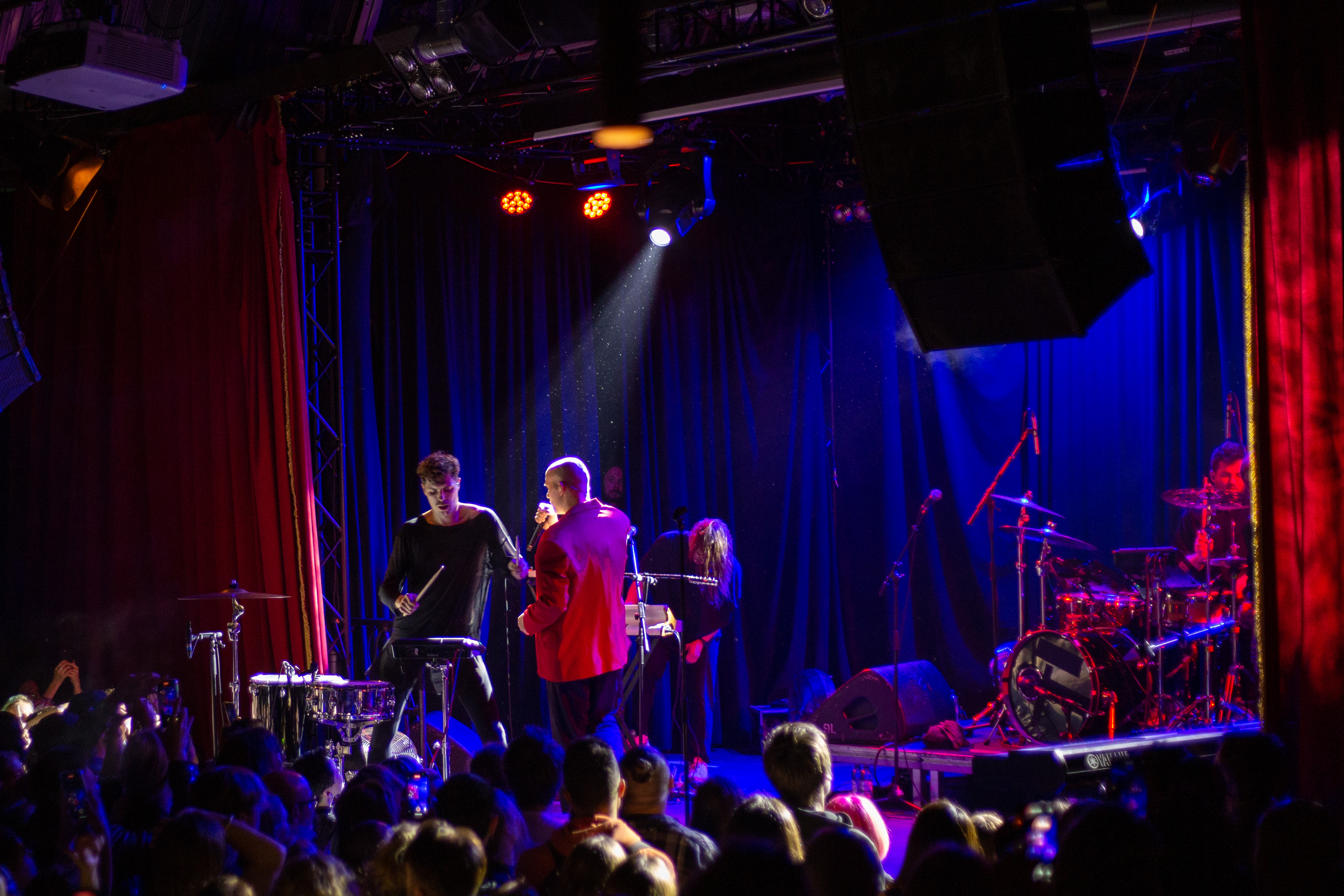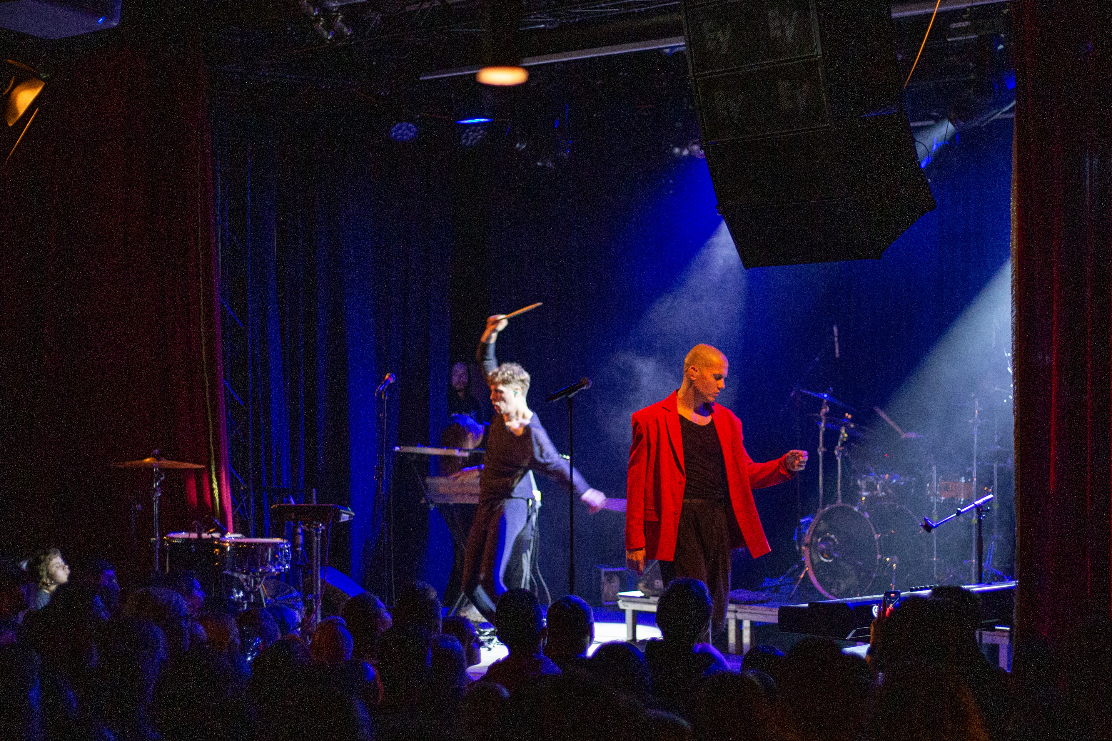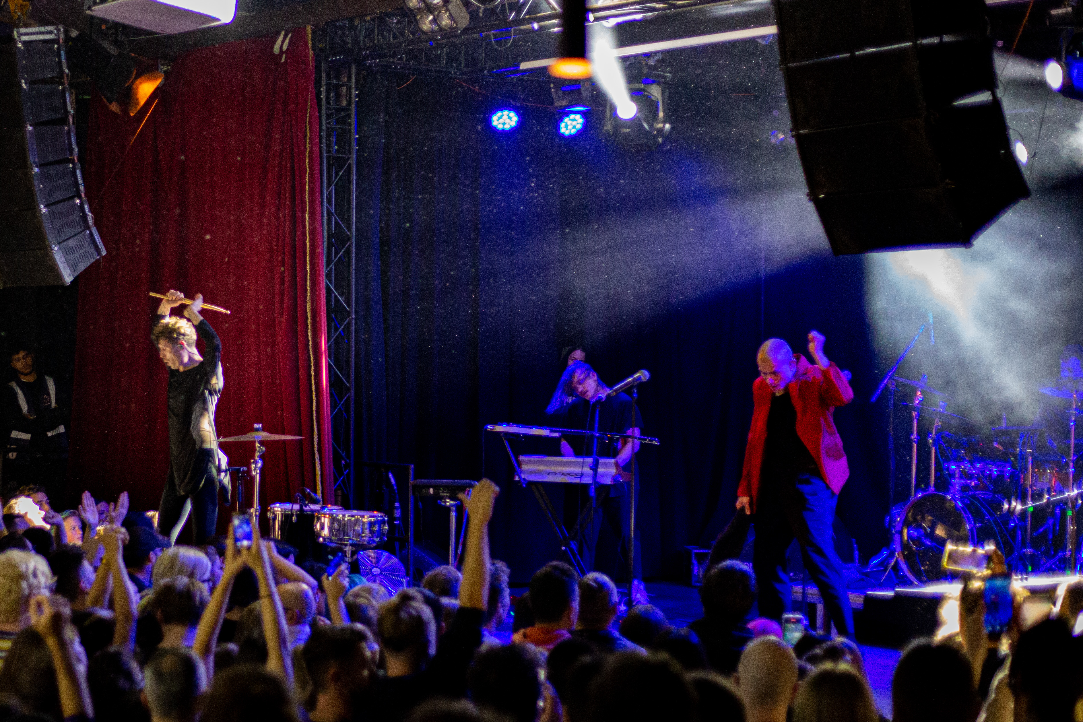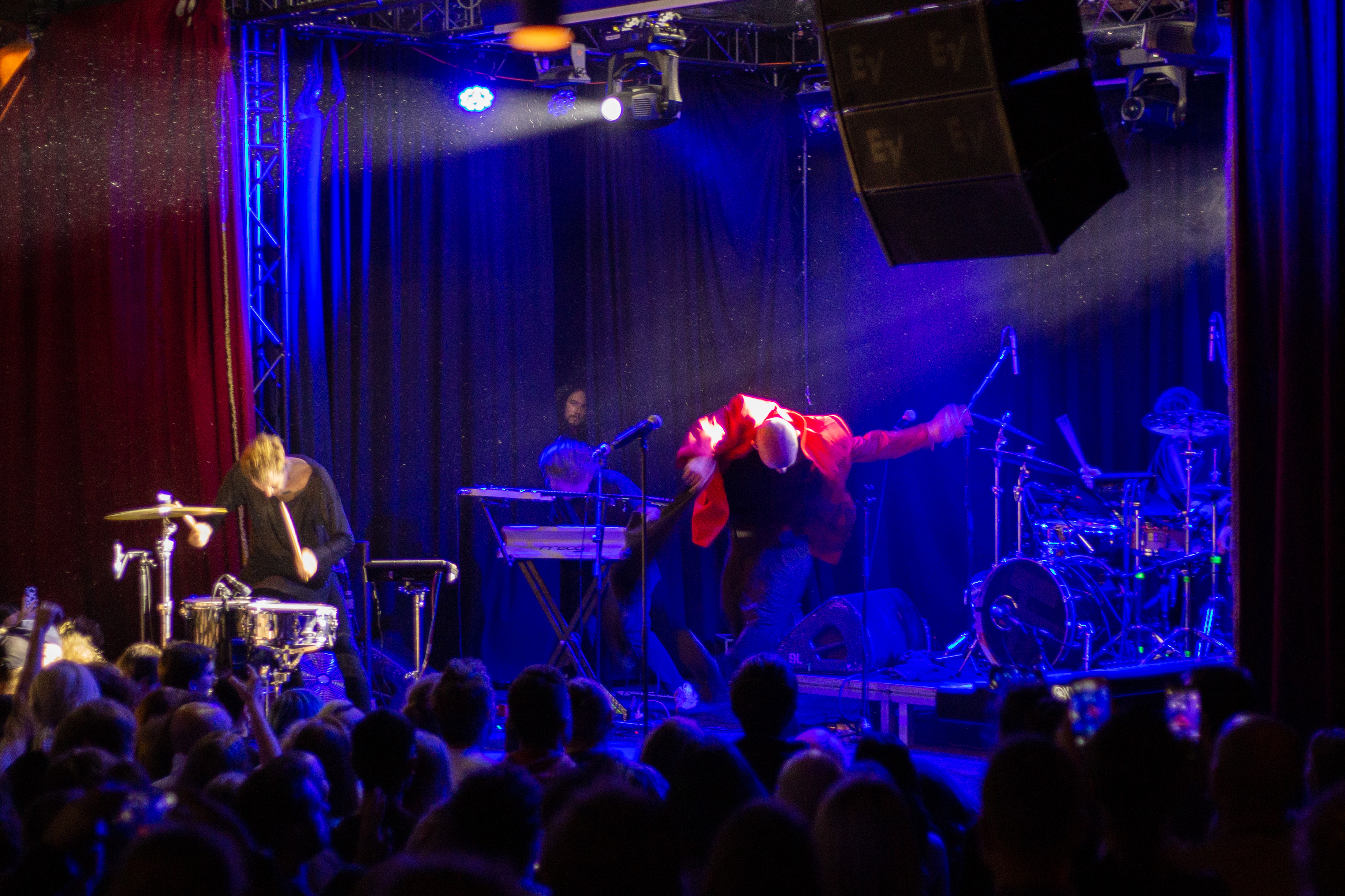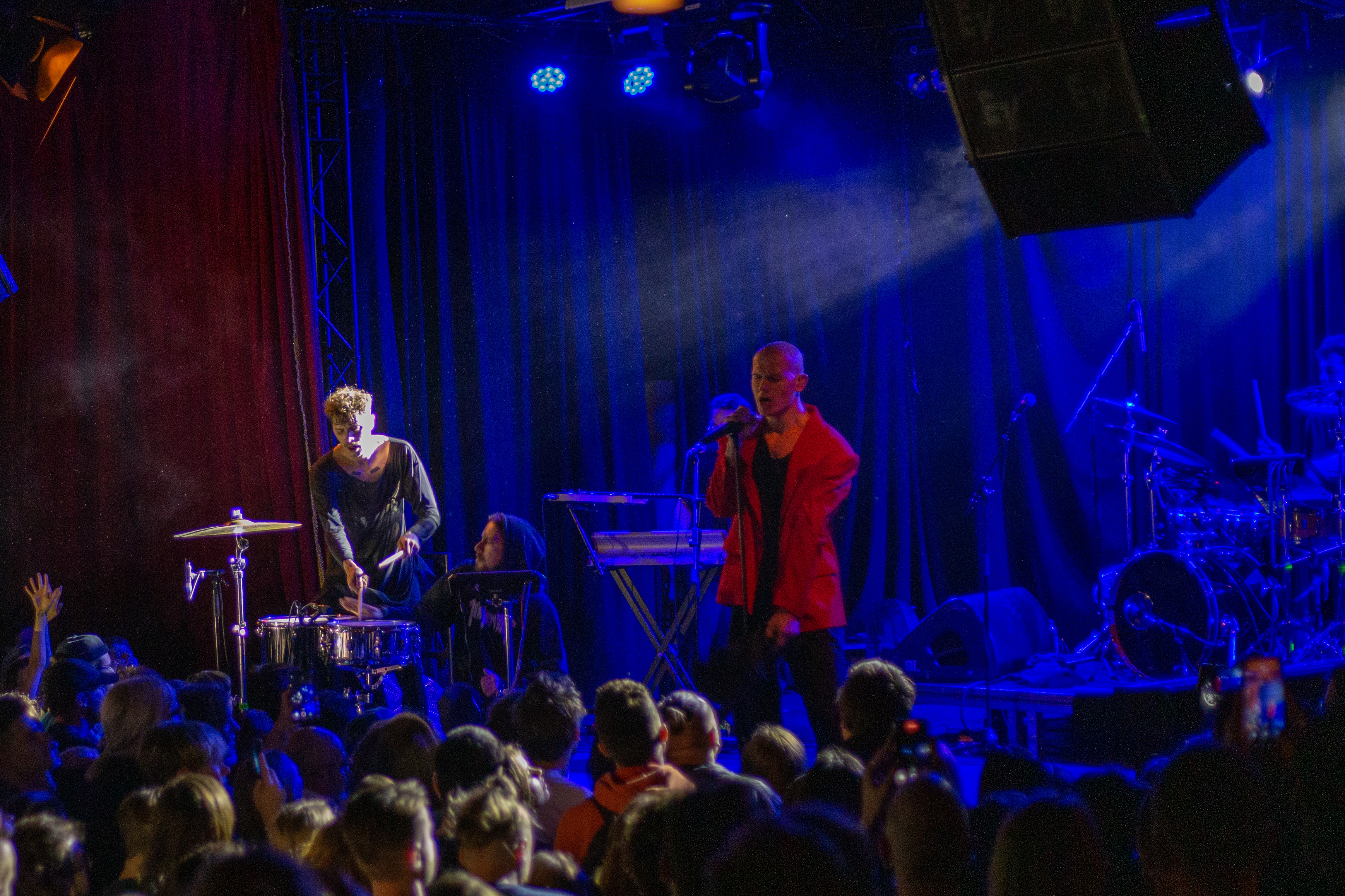 A live music performance is captured in a dimly lit stage, with a spotlight illuminating the performers. The stage is adorned with blue curtains and a red curtain, creating a vibrant contrast. The performers, dressed in black and red, are engaged in a lively dance, with one person holding a wooden stick. The audience, seated in the foreground, watches the performance with anticipation. The image captures the essence of a live music performance, with the performers, audience, and stage elements all contributing to the overall atmosphere.