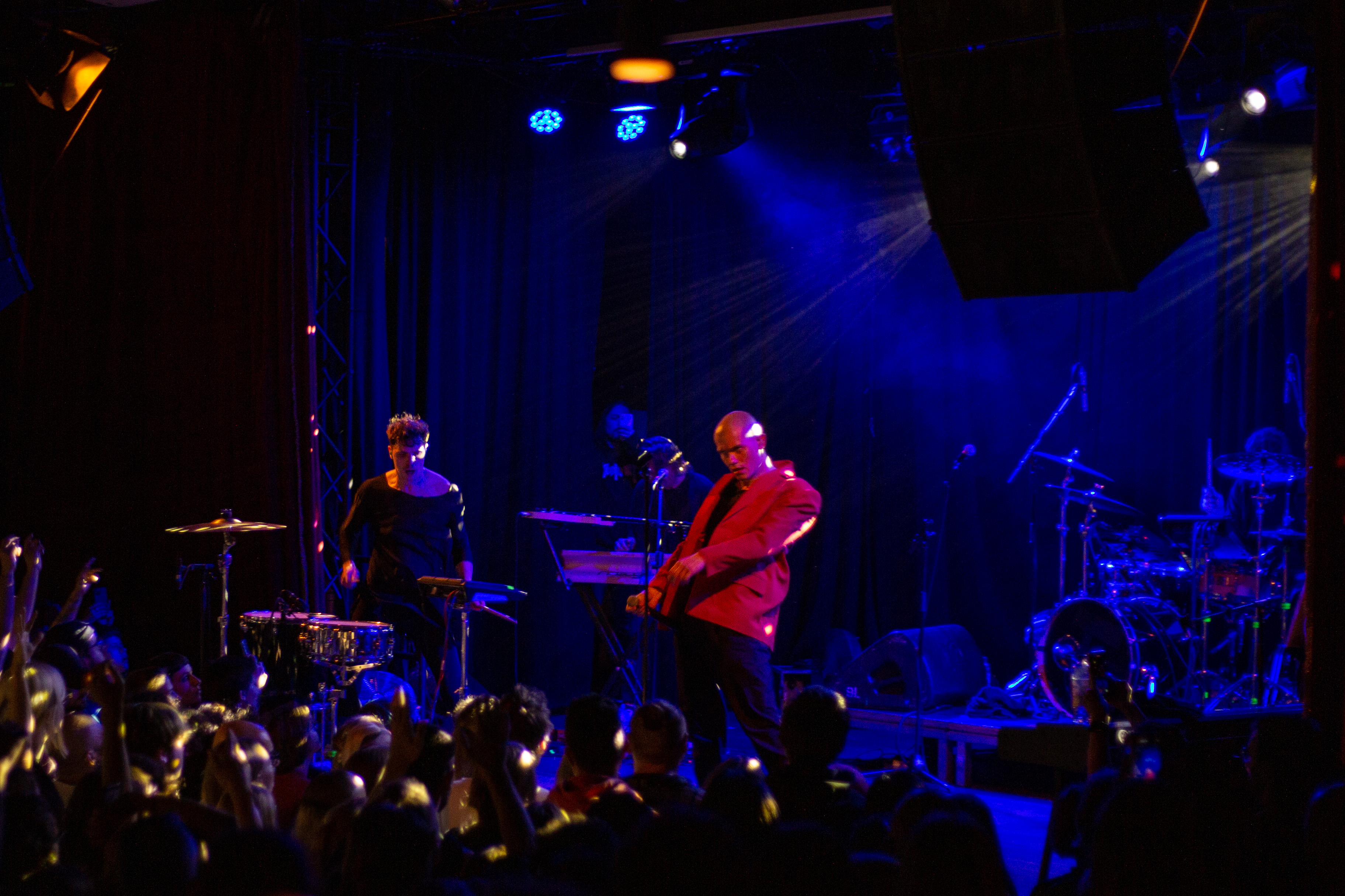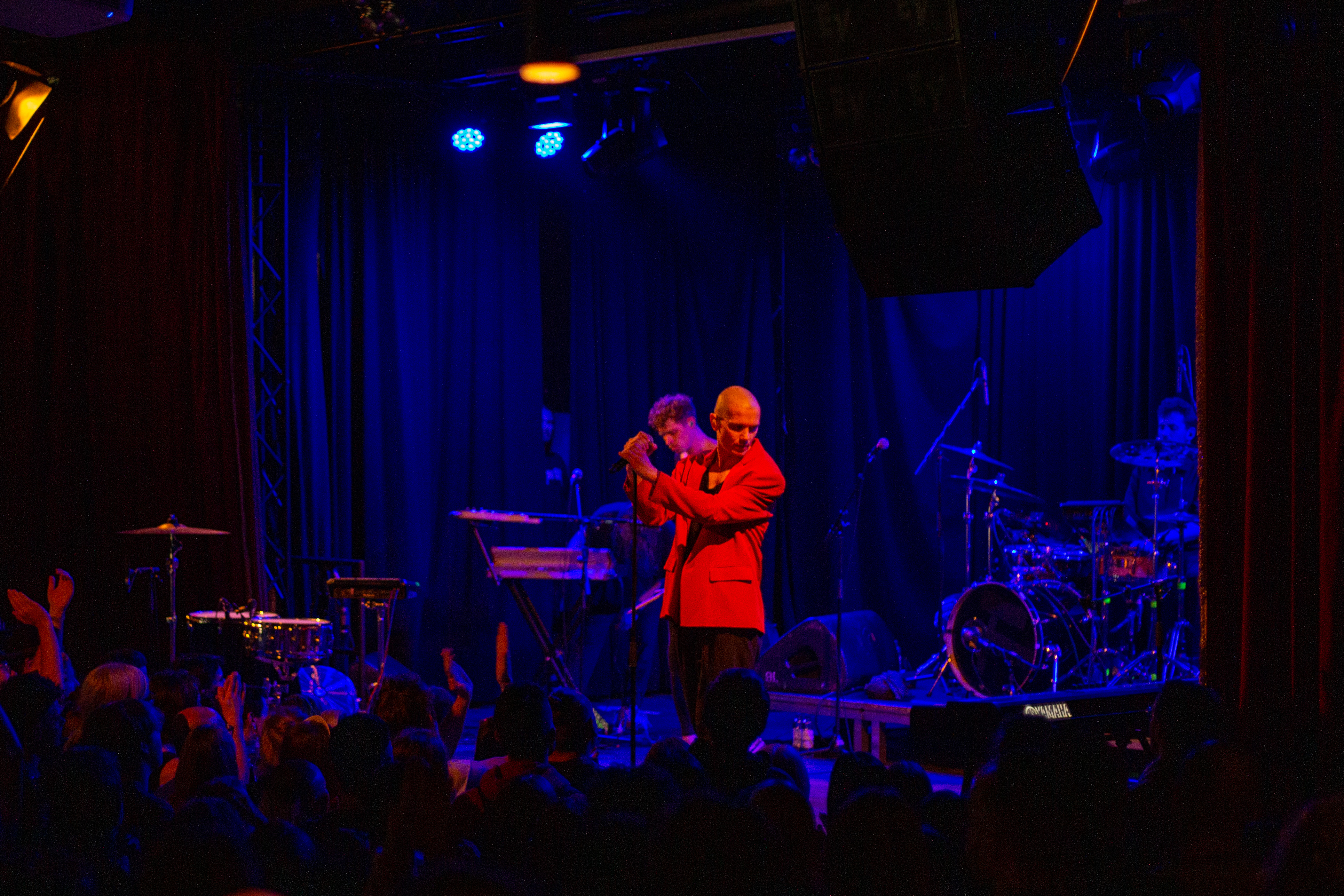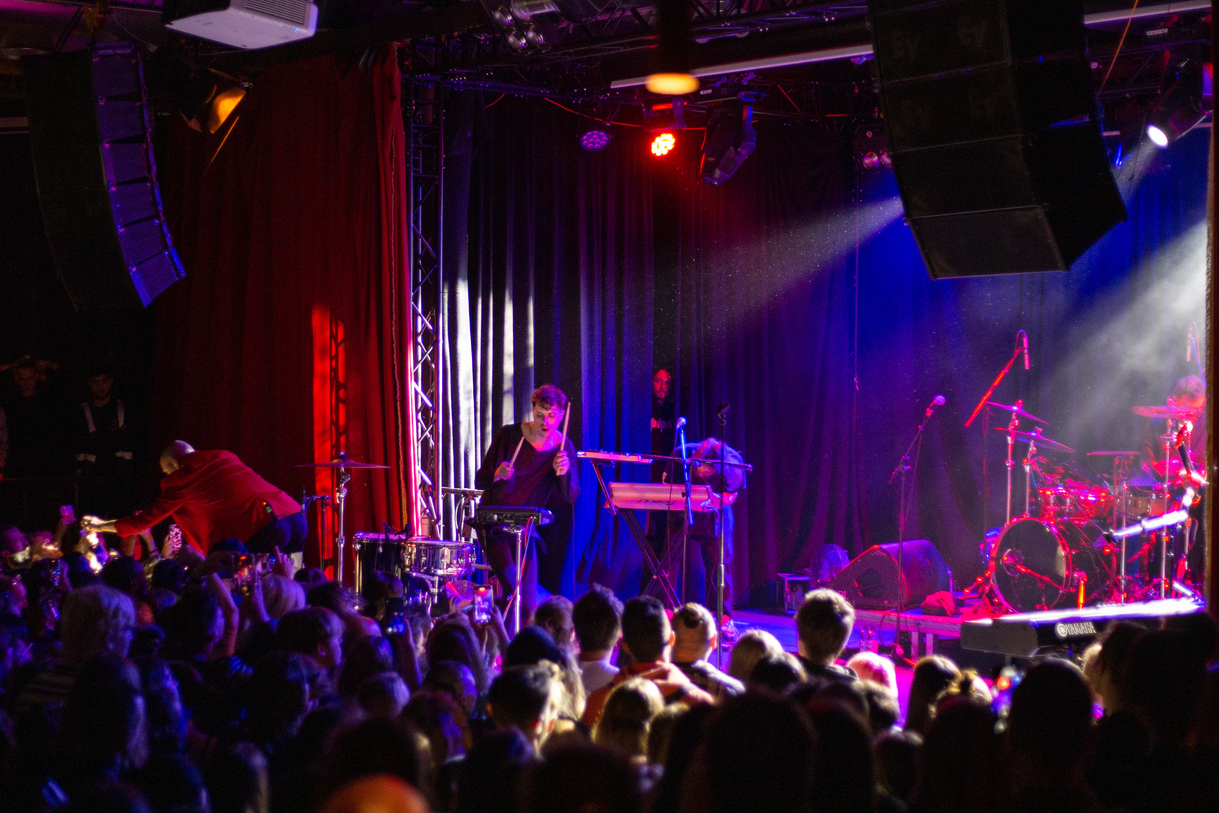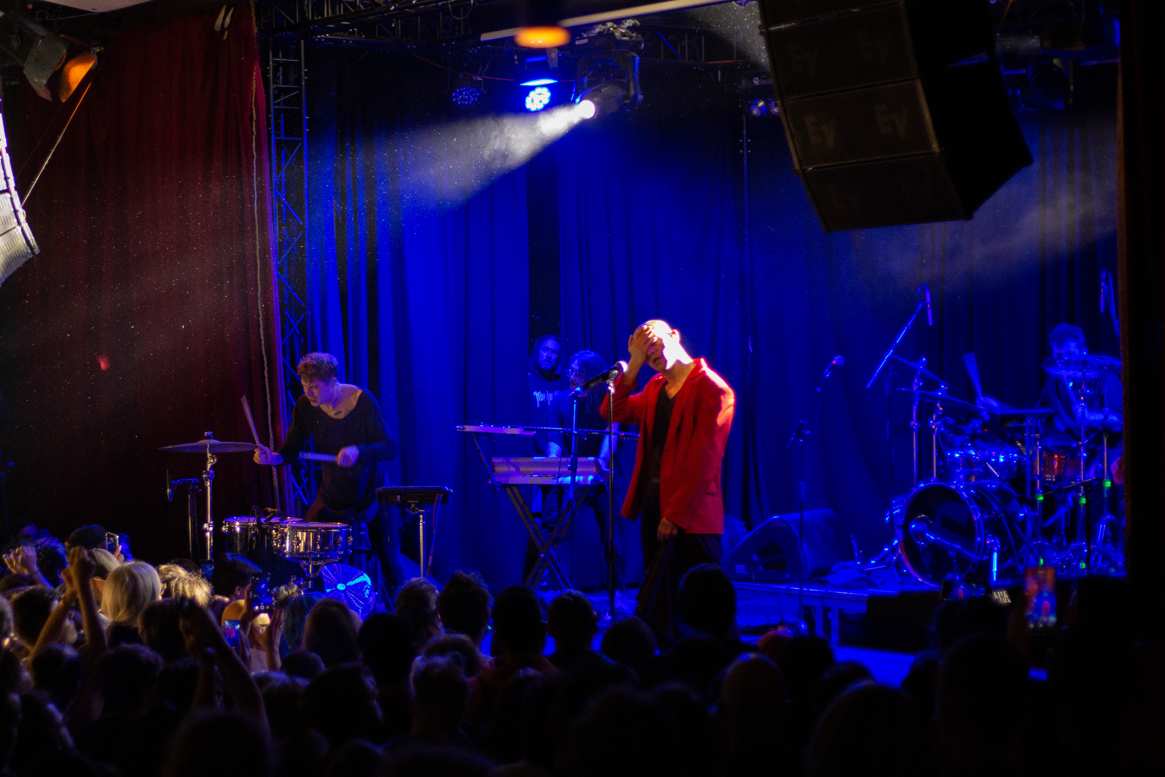 A live music performance is captured in a dimly lit stage, with a spotlight illuminating the performers. The stage is adorned with blue curtains and a red curtain, creating a vibrant contrast. The performers, dressed in black and red, are engaged in a lively dance, with one person holding a wooden stick. The audience, seated in the foreground, watches the performance with anticipation. The image captures the essence of a live music performance, with the performers, audience, and stage elements all contributing to the overall atmosphere.