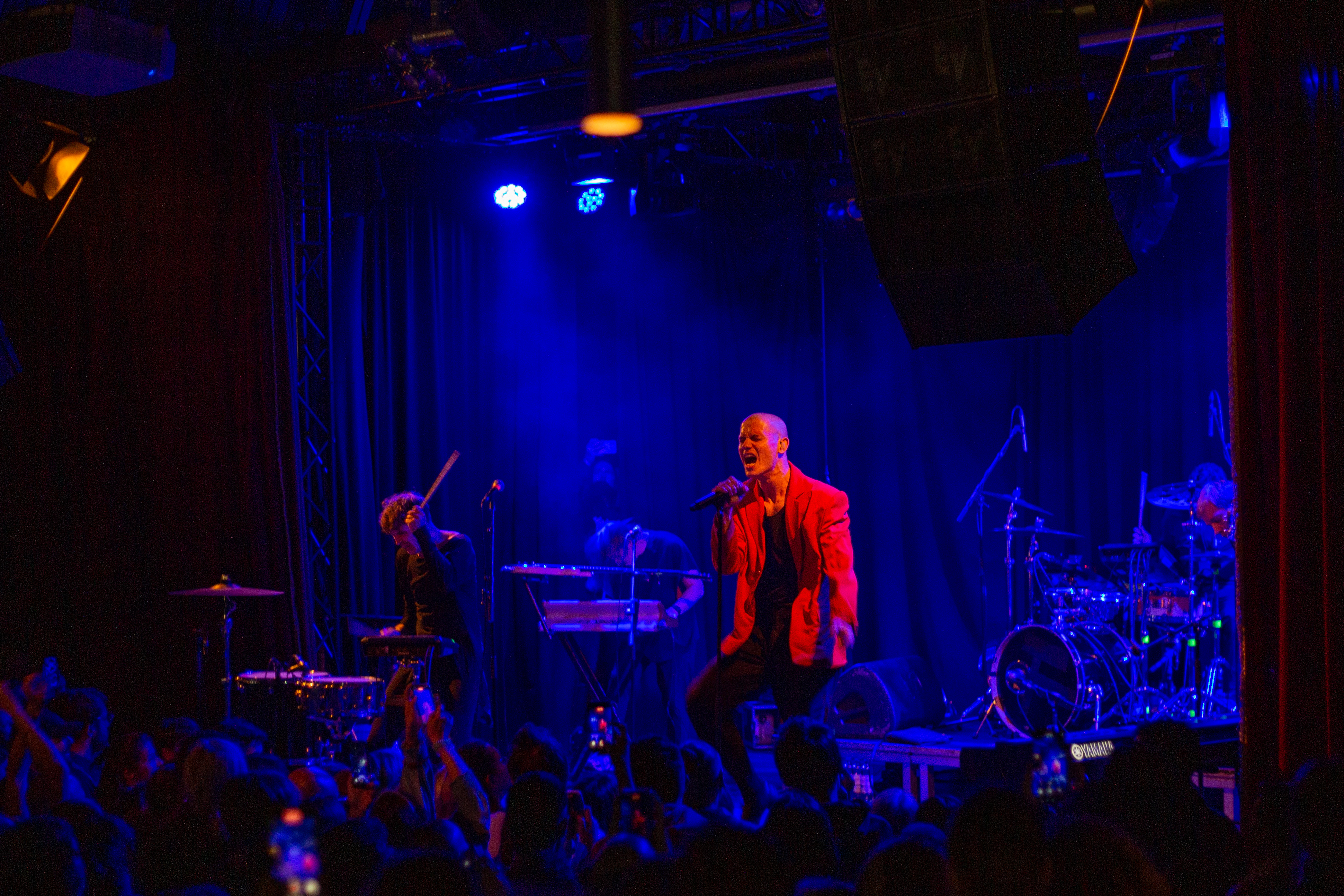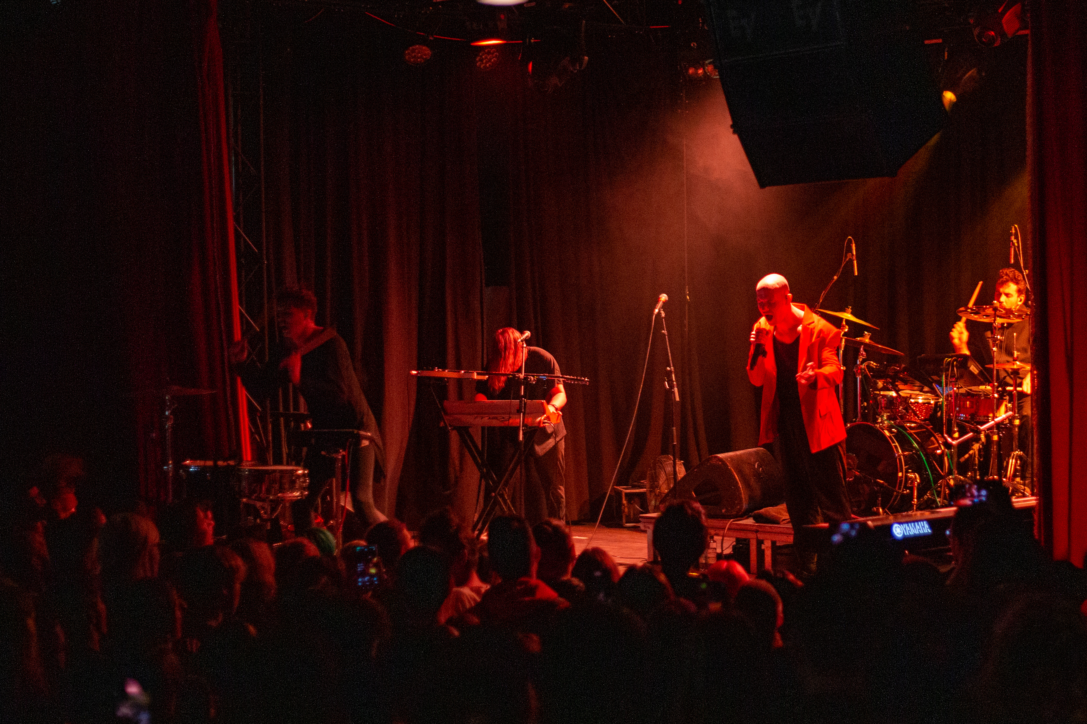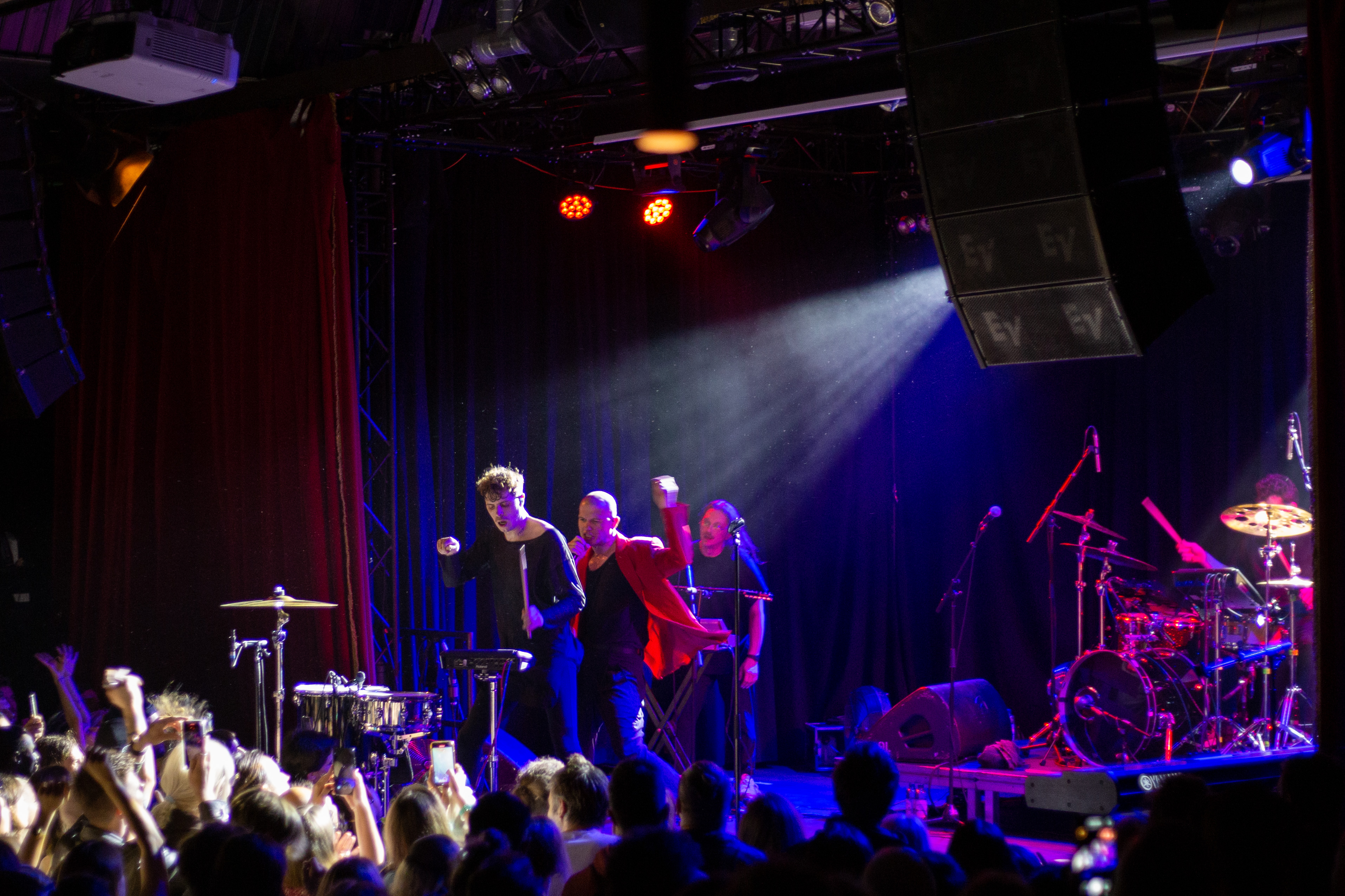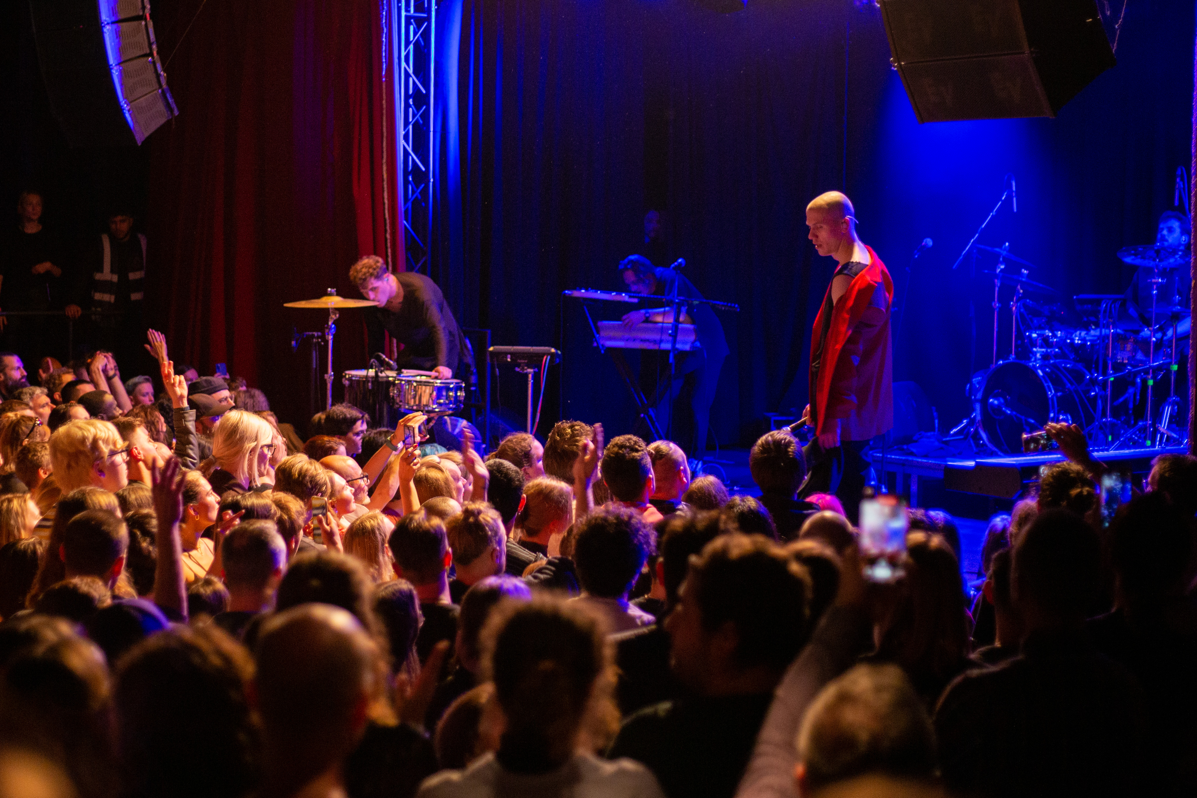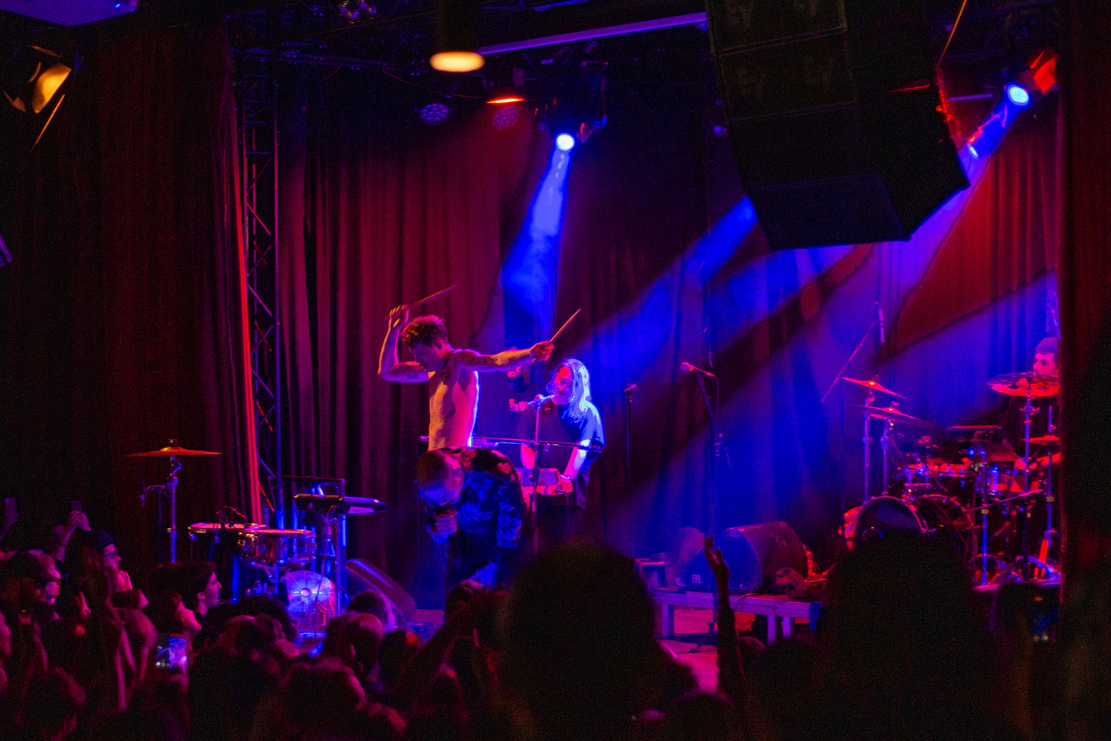 A live music performance is captured in a dimly lit stage, with a spotlight illuminating the performers. The stage is adorned with blue curtains and a red curtain, creating a vibrant contrast. The performers, dressed in black and red, are engaged in a lively dance, with one person holding a wooden stick. The audience, seated in the foreground, watches the performance with anticipation. The image captures the essence of a live music performance, with the performers, audience, and stage elements all contributing to the overall atmosphere.