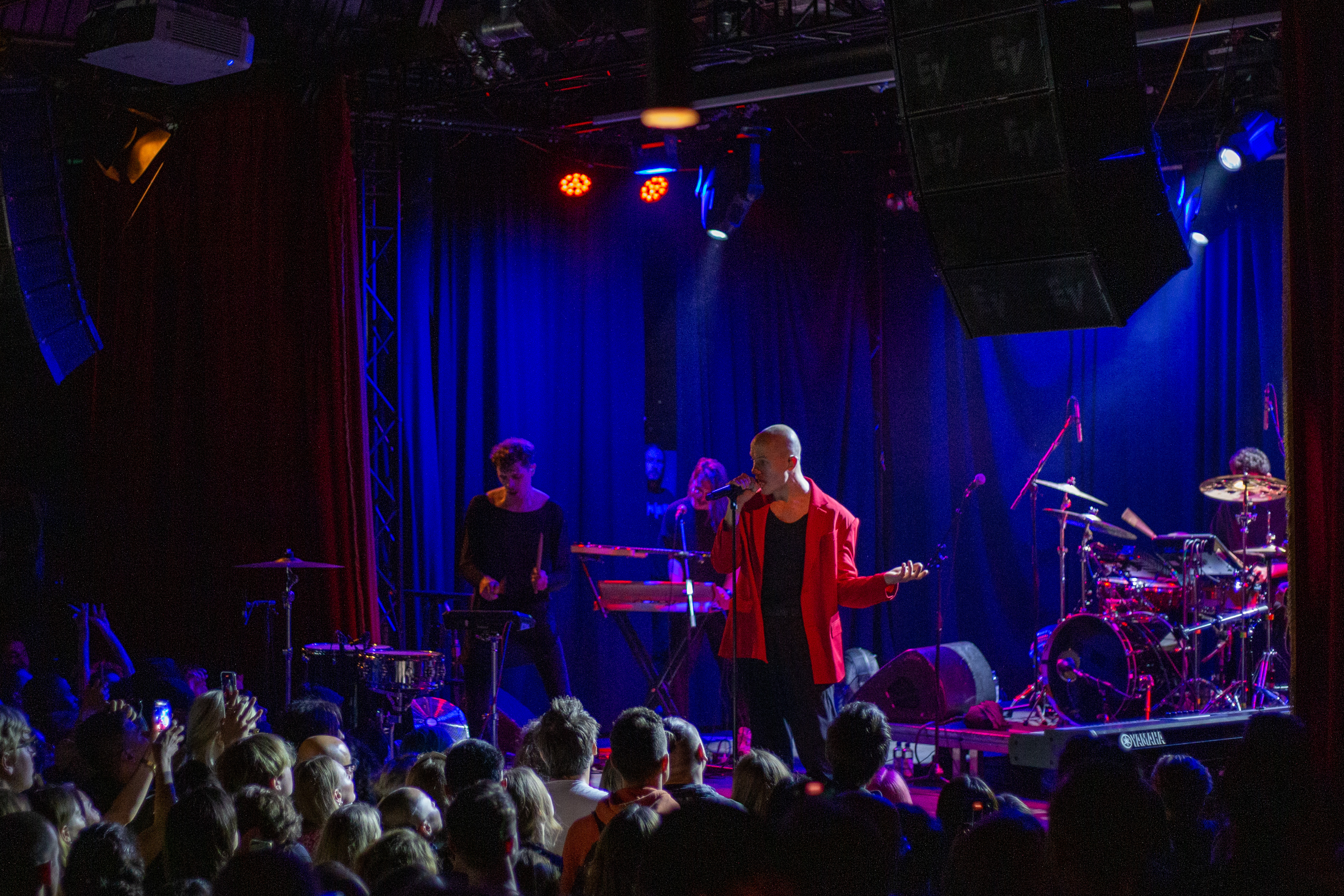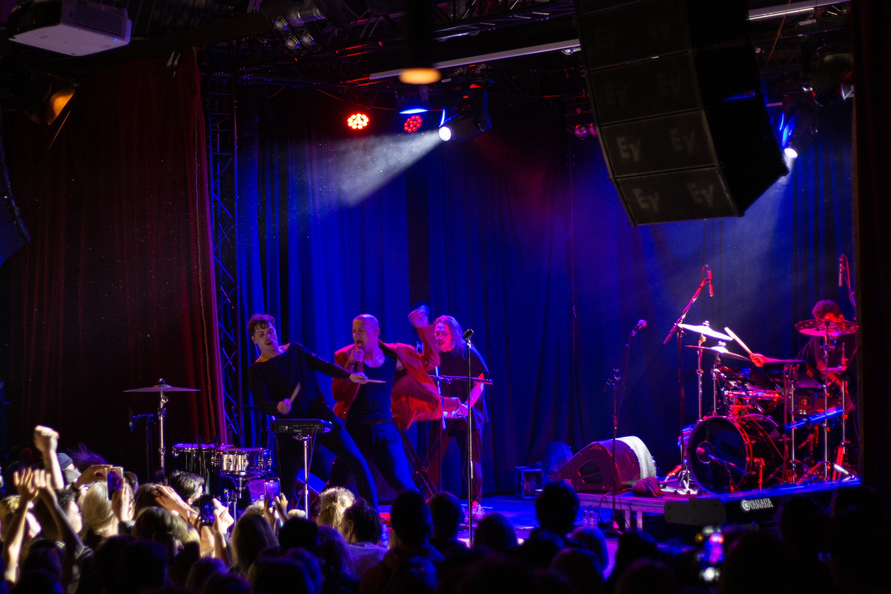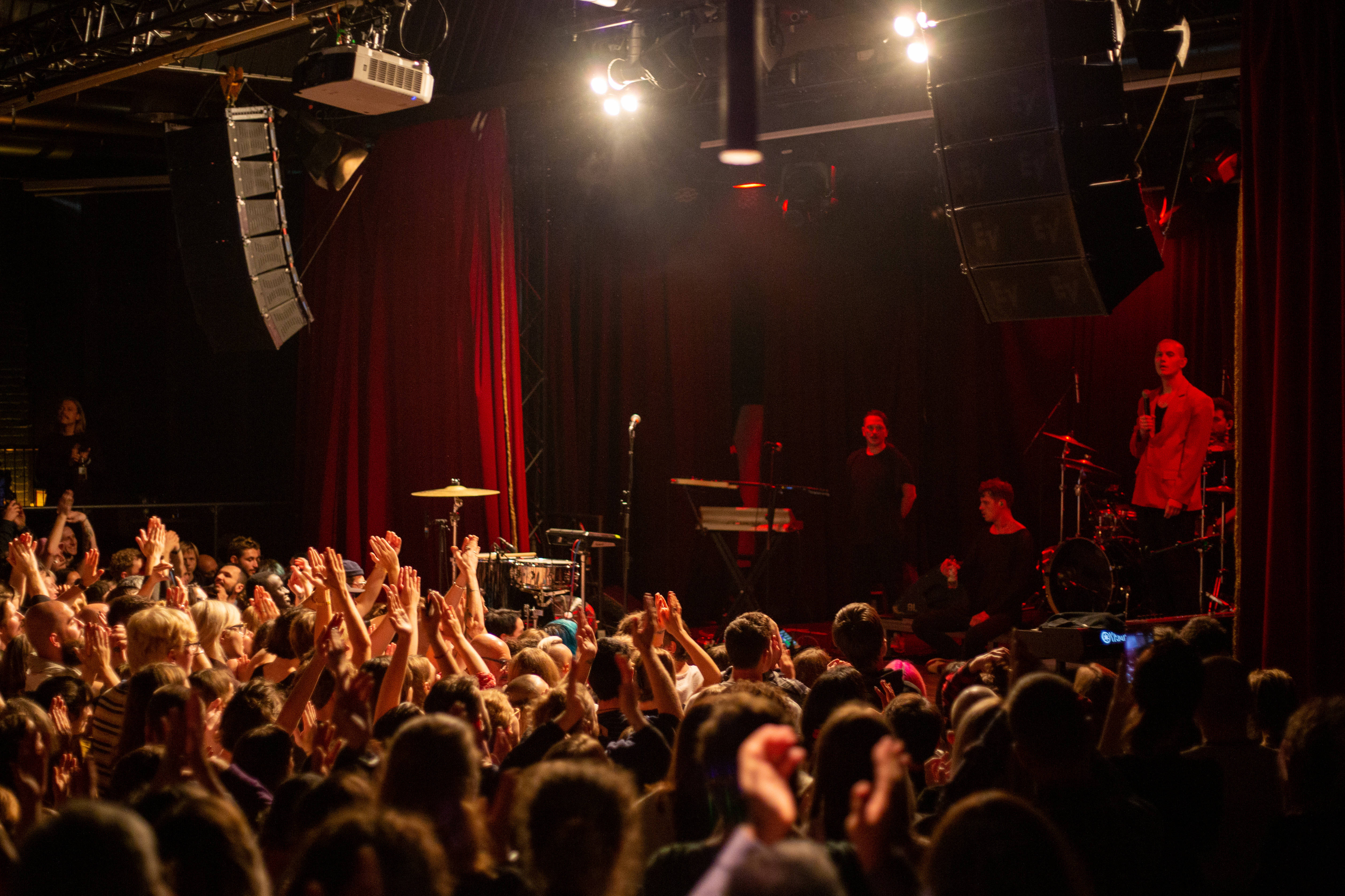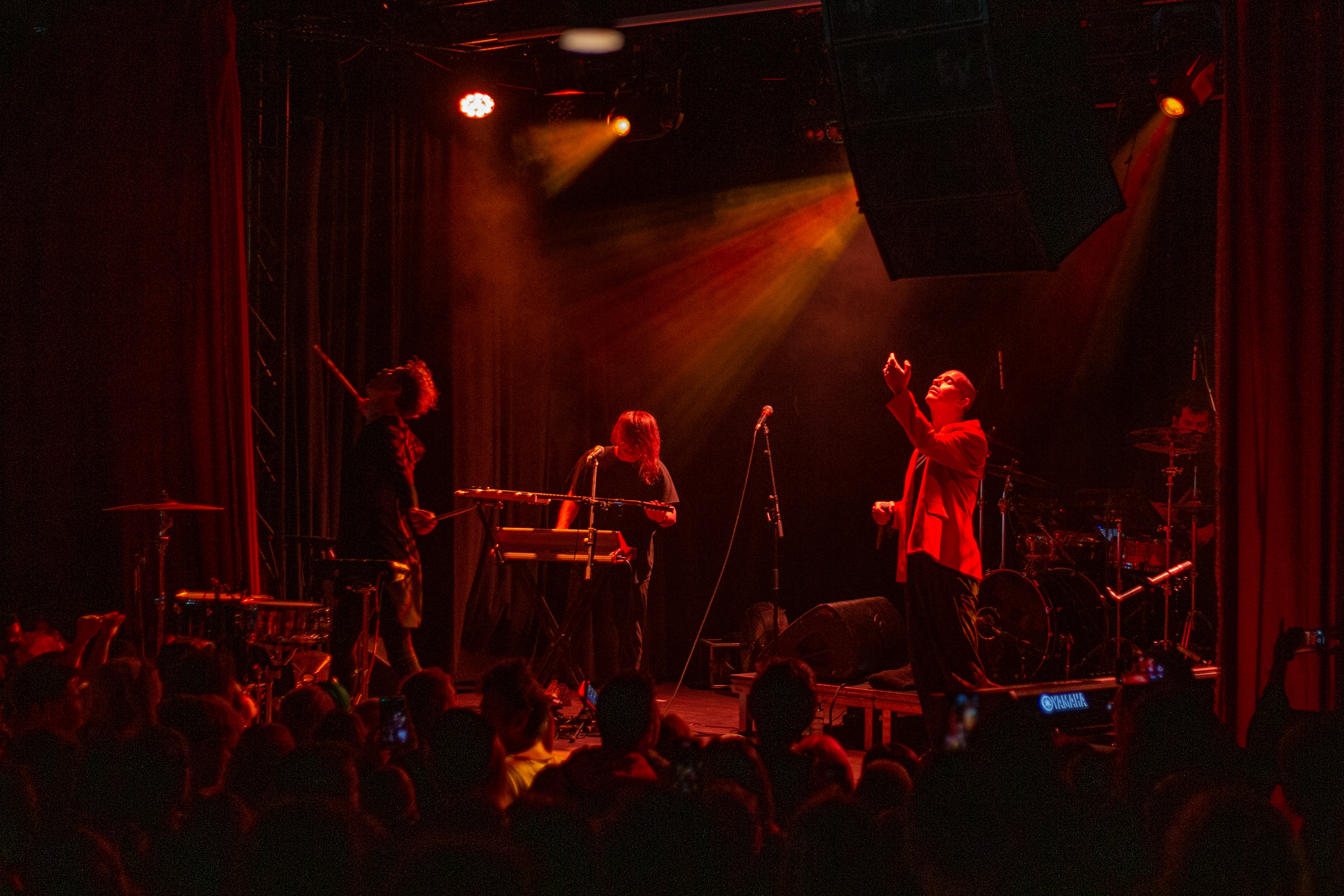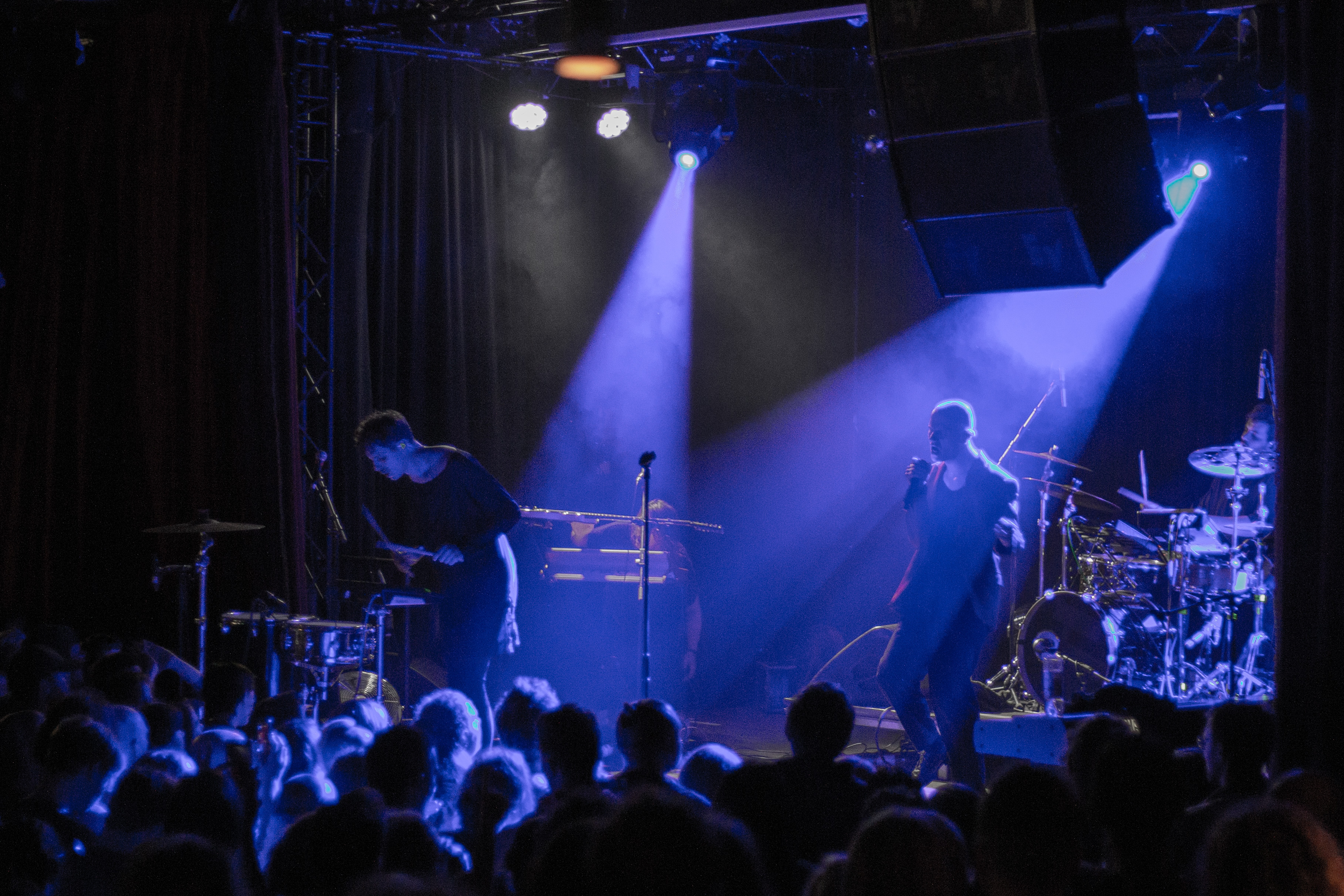 A live music performance is captured in a dimly lit stage, with a spotlight illuminating the performers. The stage is adorned with blue curtains and a red curtain, creating a vibrant contrast. The performers, dressed in black and red, are engaged in a lively dance, with one person holding a wooden stick. The audience, seated in the foreground, watches the performance with anticipation. The image captures the essence of a live music performance, with the performers, audience, and stage elements all contributing to the overall atmosphere.