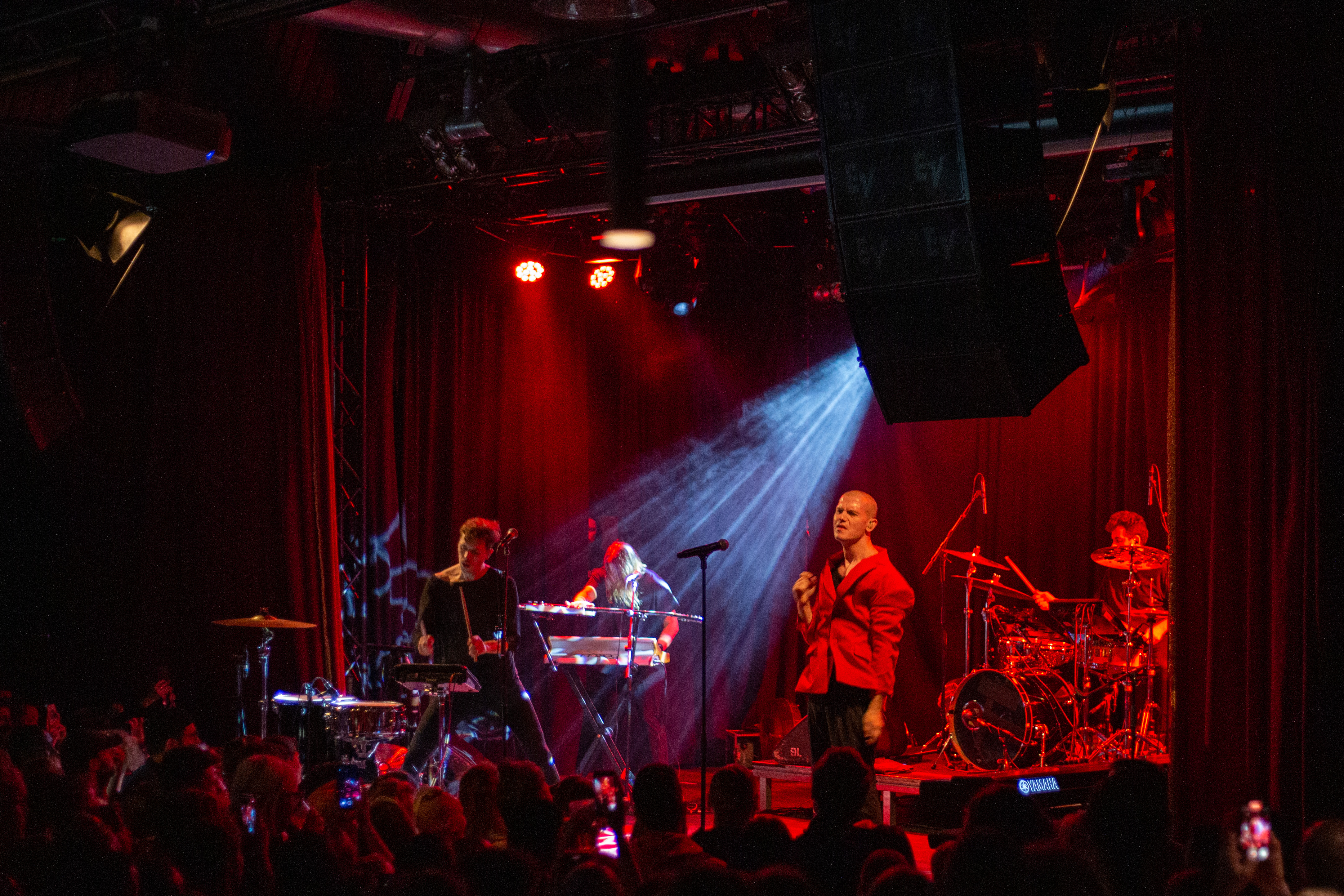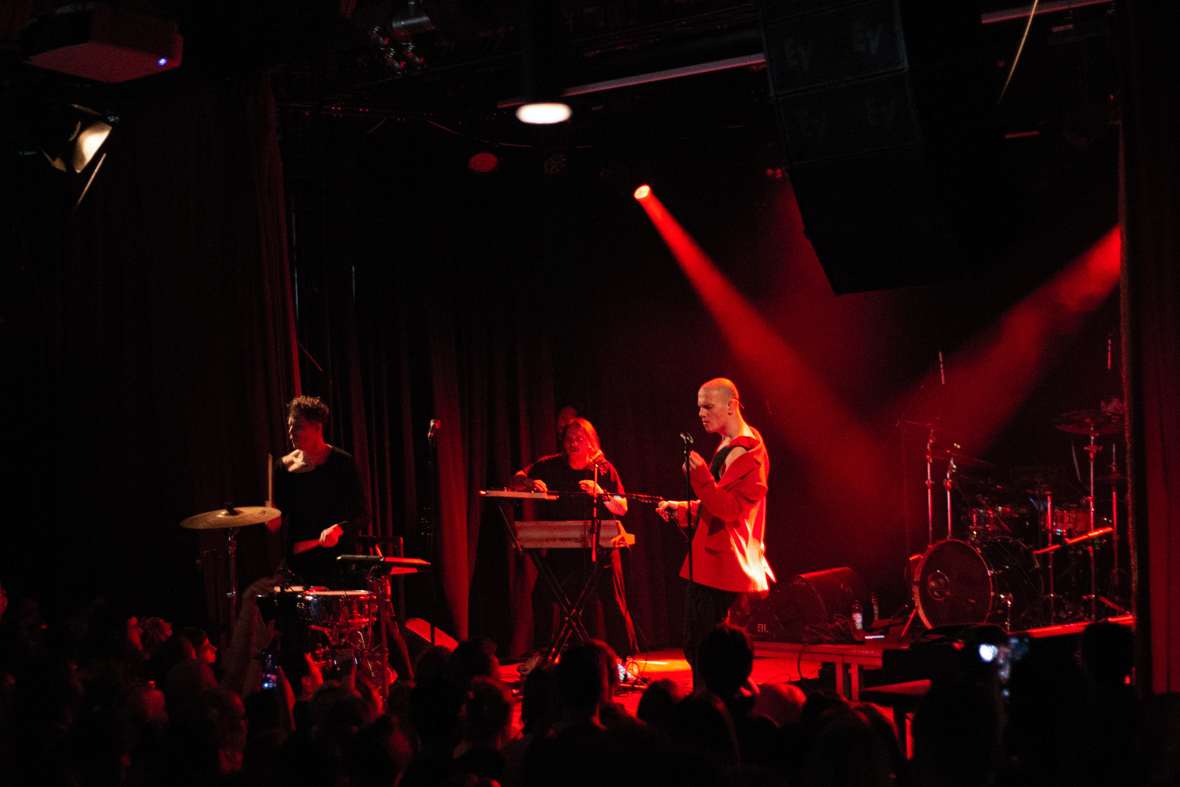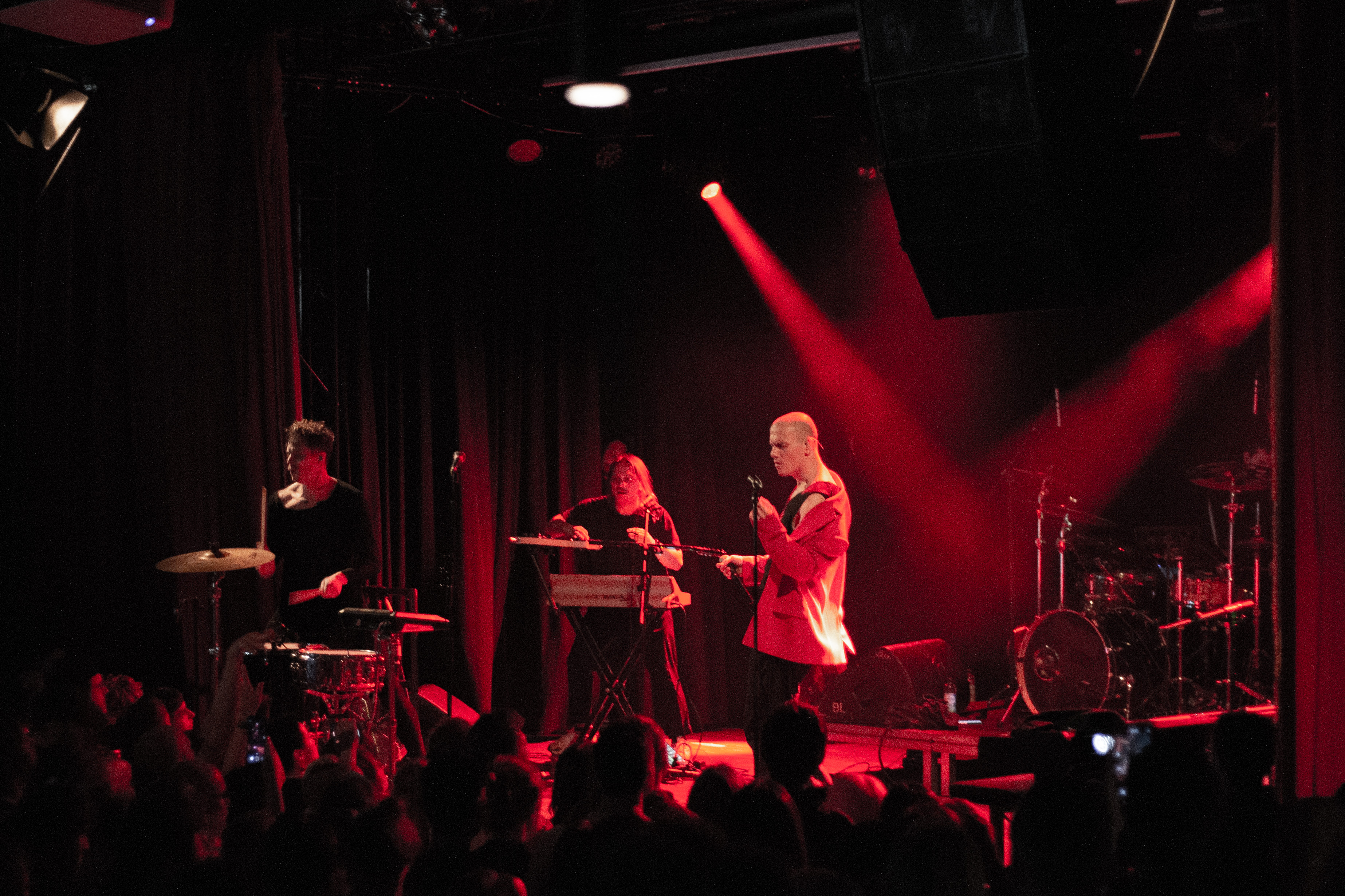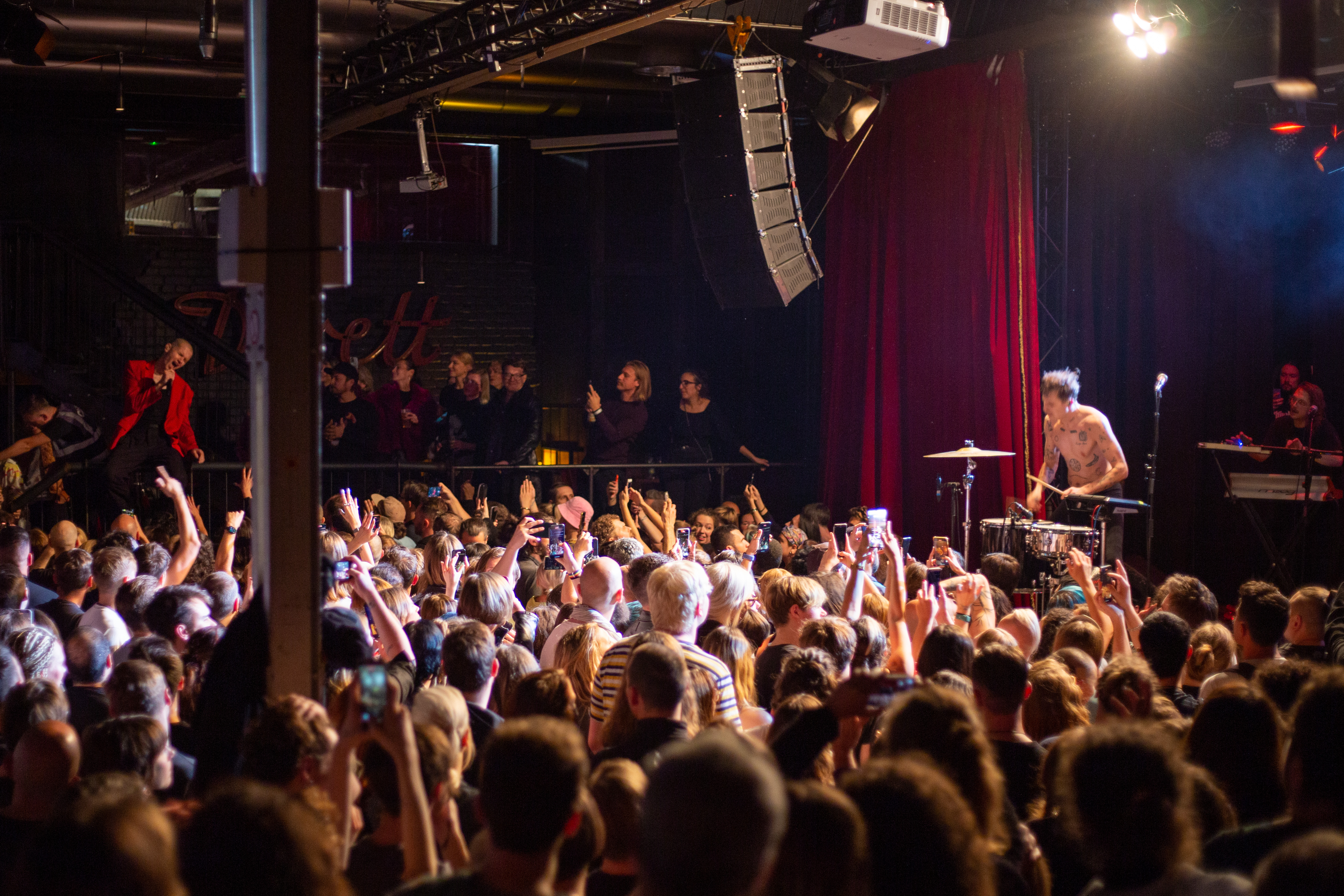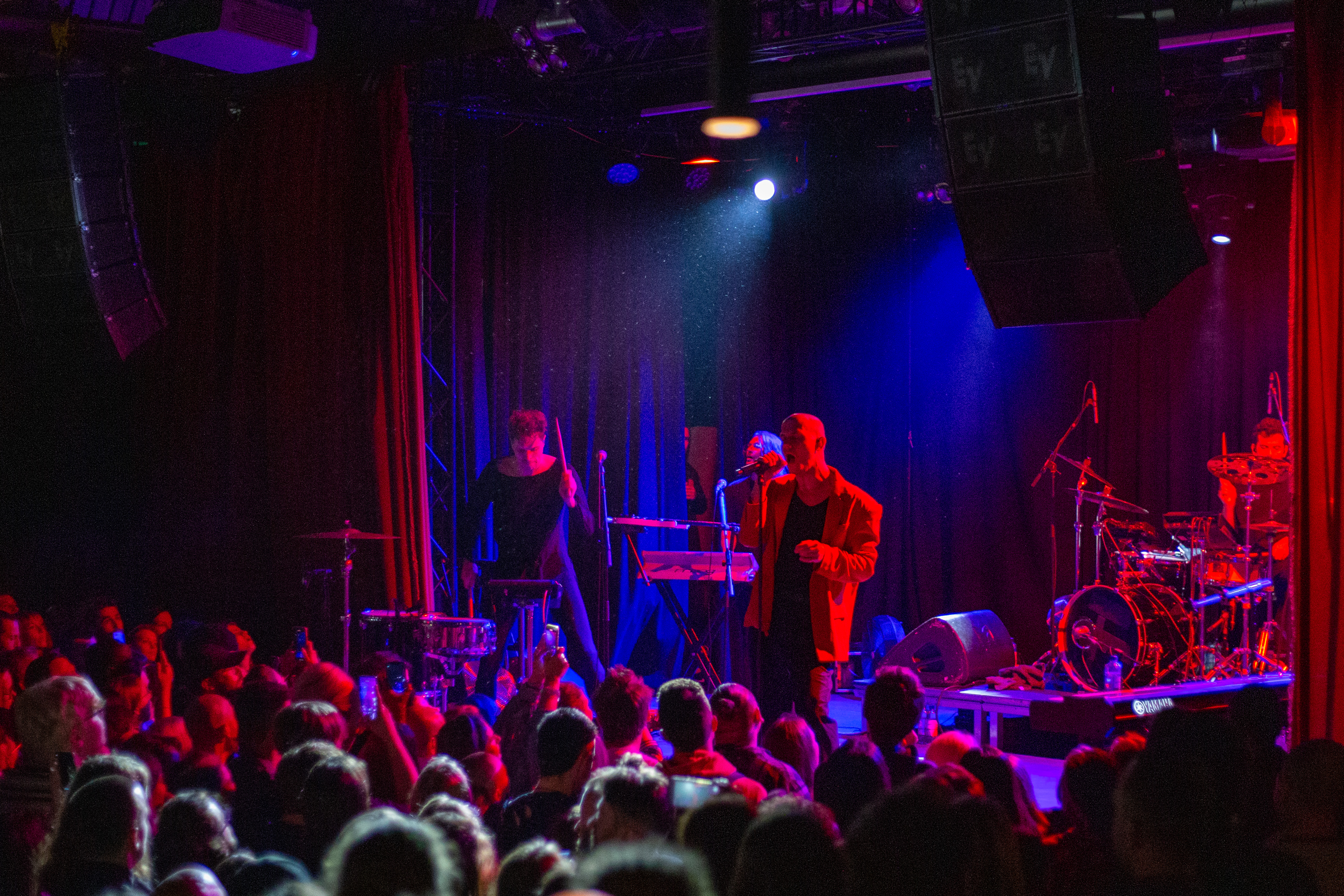 A live music performance is captured in a dimly lit stage, with a spotlight illuminating the performers. The stage is adorned with blue curtains and a red curtain, creating a vibrant contrast. The performers, dressed in black and red, are engaged in a lively dance, with one person holding a wooden stick. The audience, seated in the foreground, watches the performance with anticipation. The image captures the essence of a live music performance, with the performers, audience, and stage elements all contributing to the overall atmosphere.