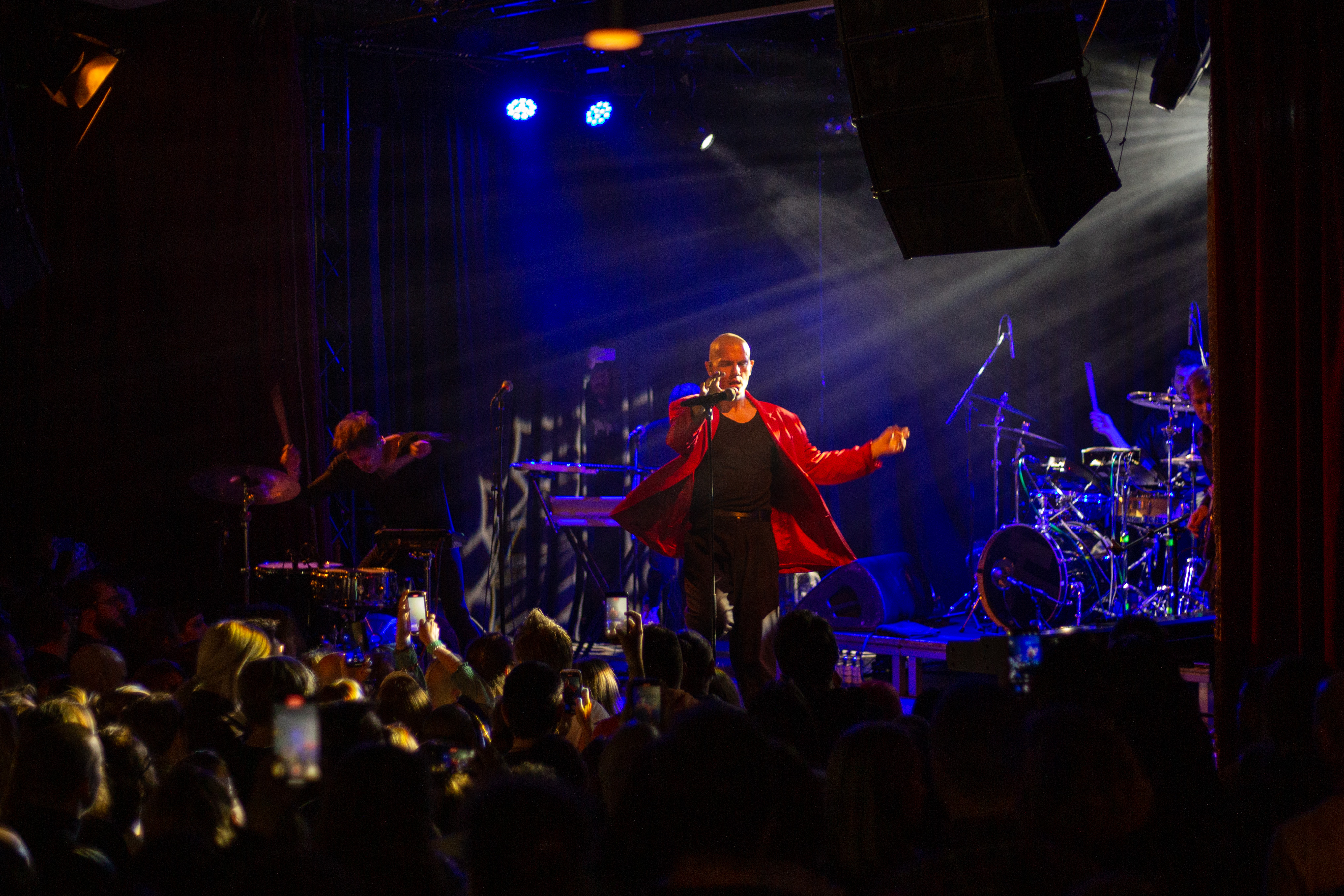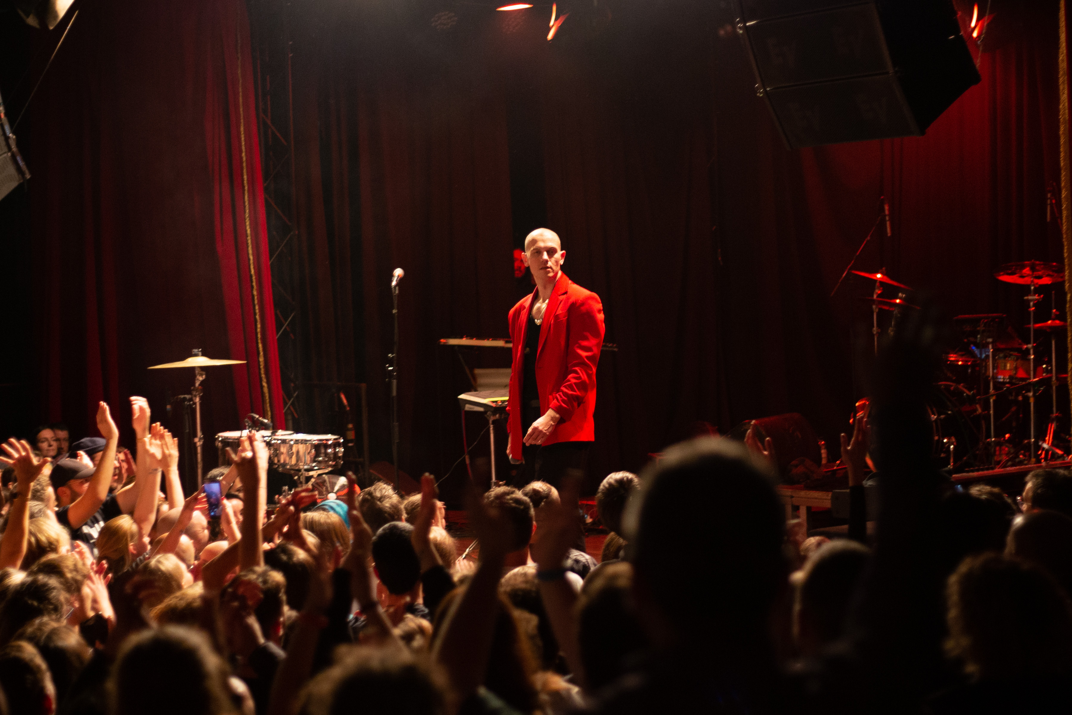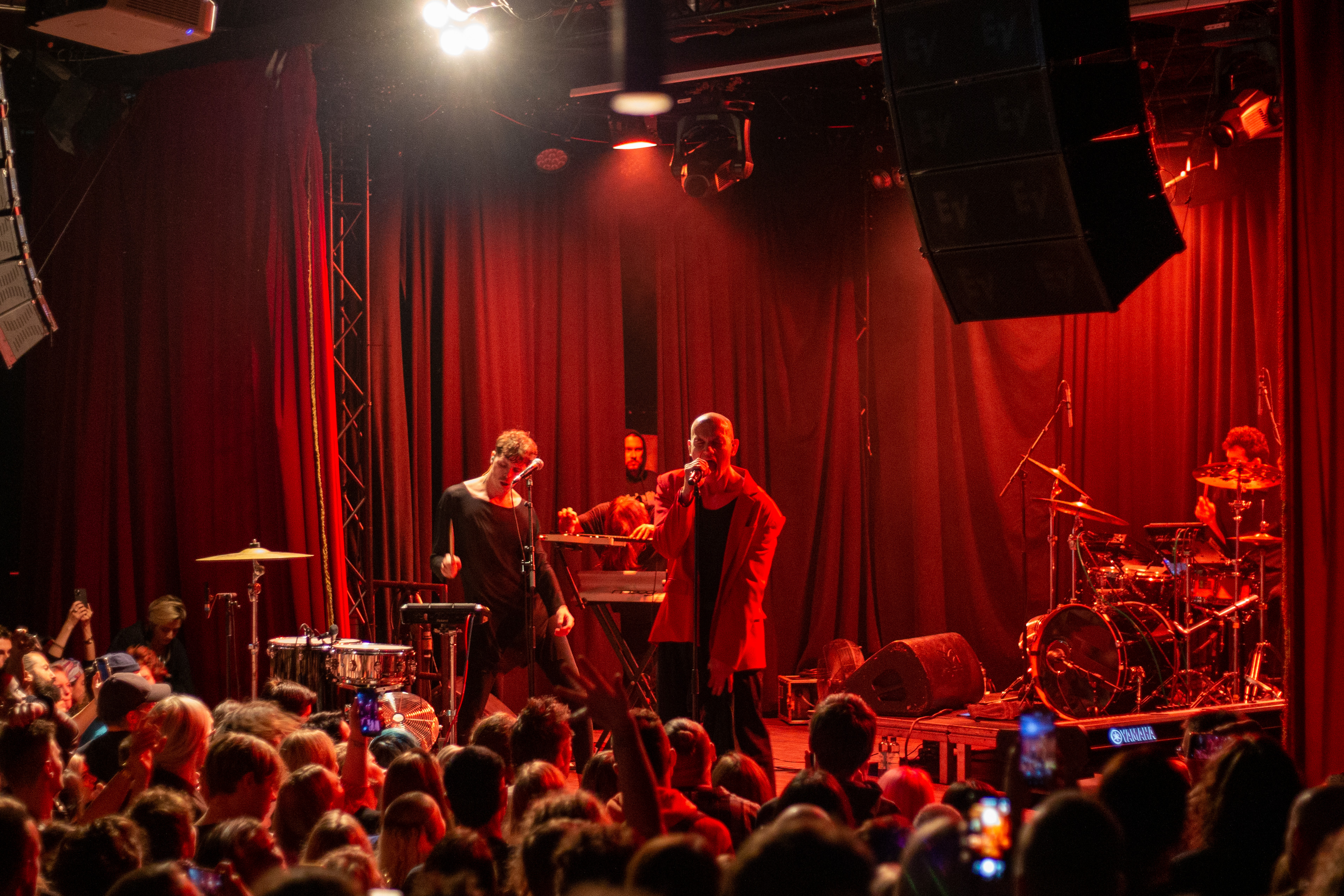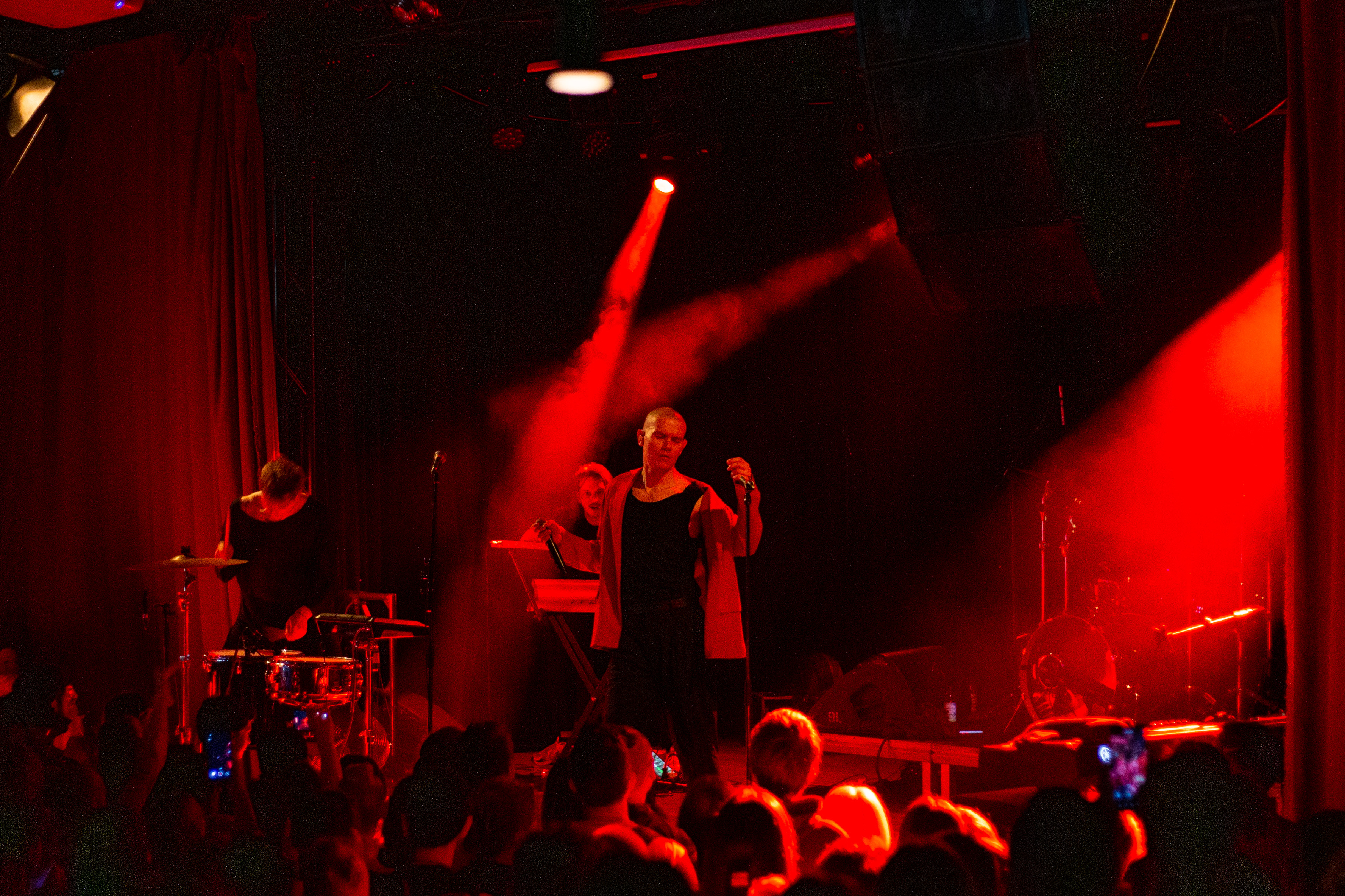 A live music performance is captured in a dimly lit stage, with a spotlight illuminating the performers. The stage is adorned with blue curtains and a red curtain, creating a vibrant contrast. The performers, dressed in black and red, are engaged in a lively dance, with one person holding a wooden stick. The audience, seated in the foreground, watches the performance with anticipation. The image captures the essence of a live music performance, with the performers, audience, and stage elements all contributing to the overall atmosphere.