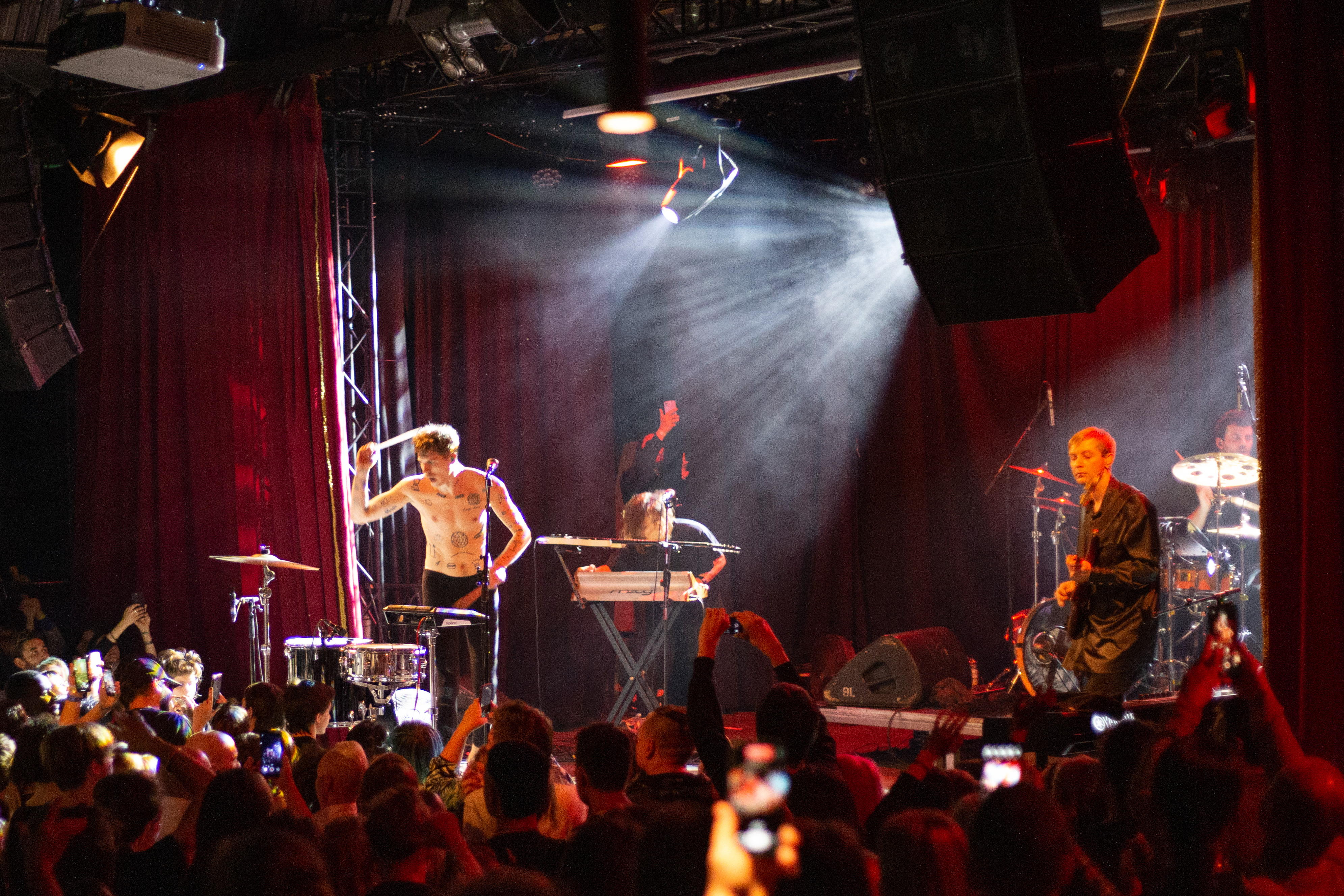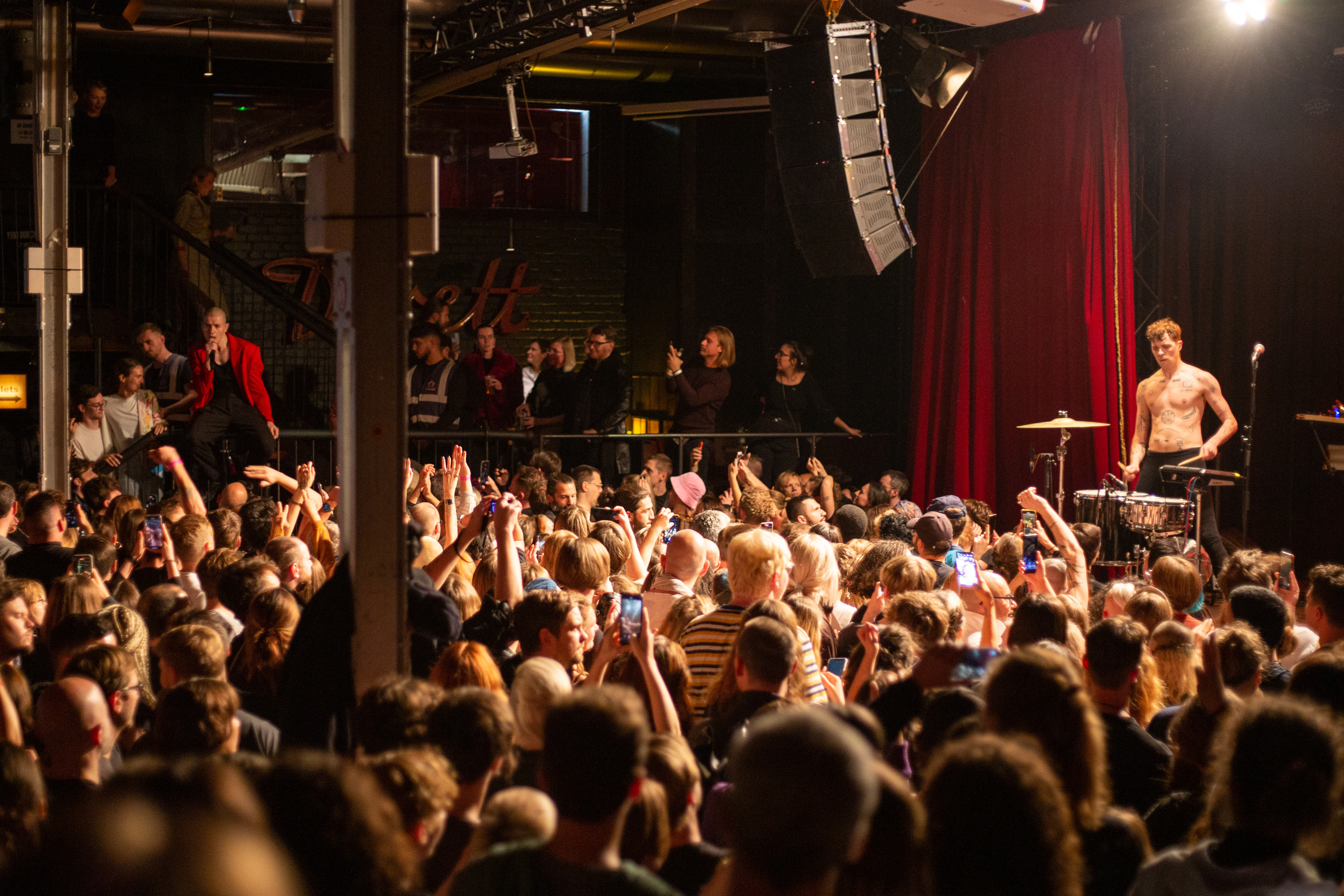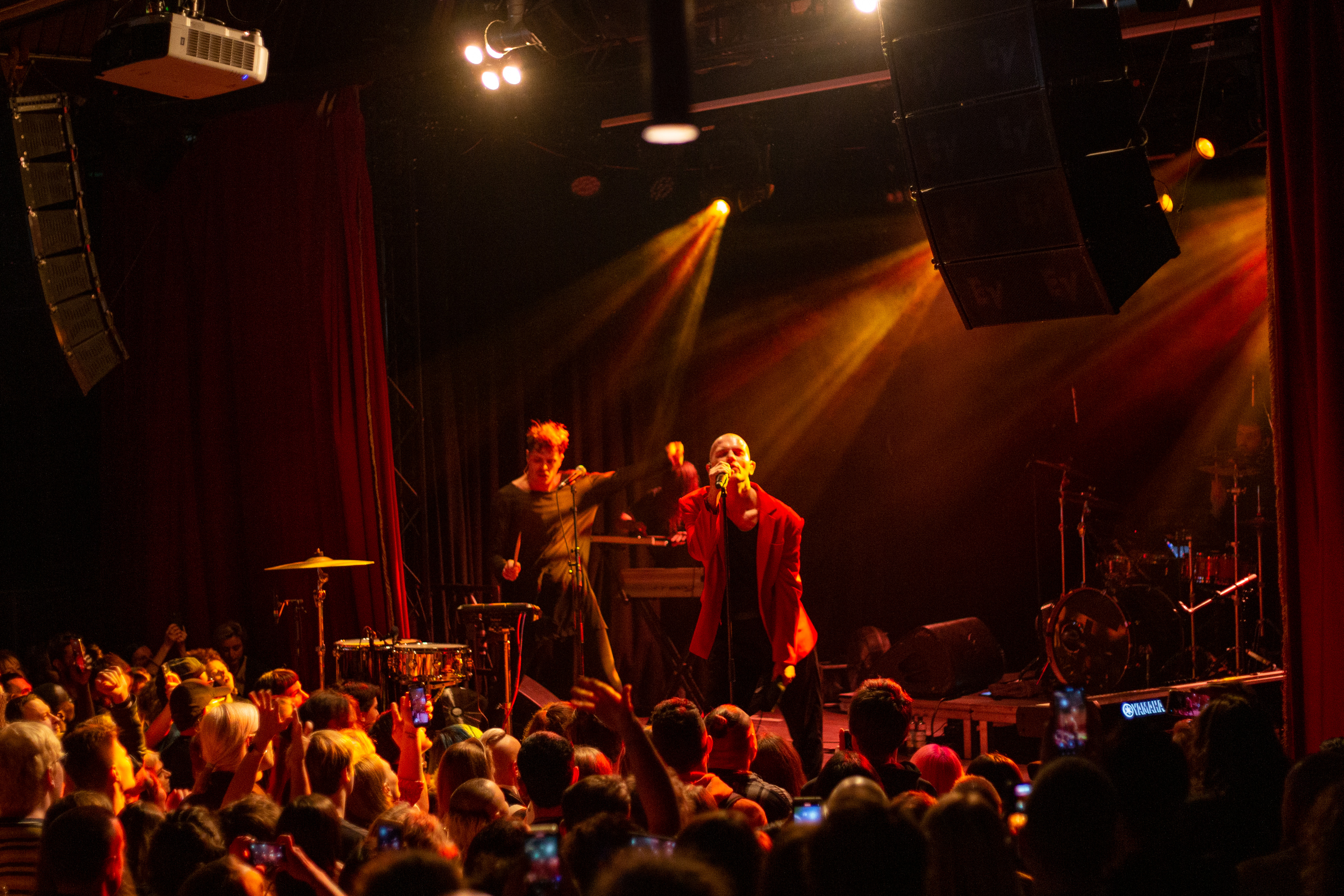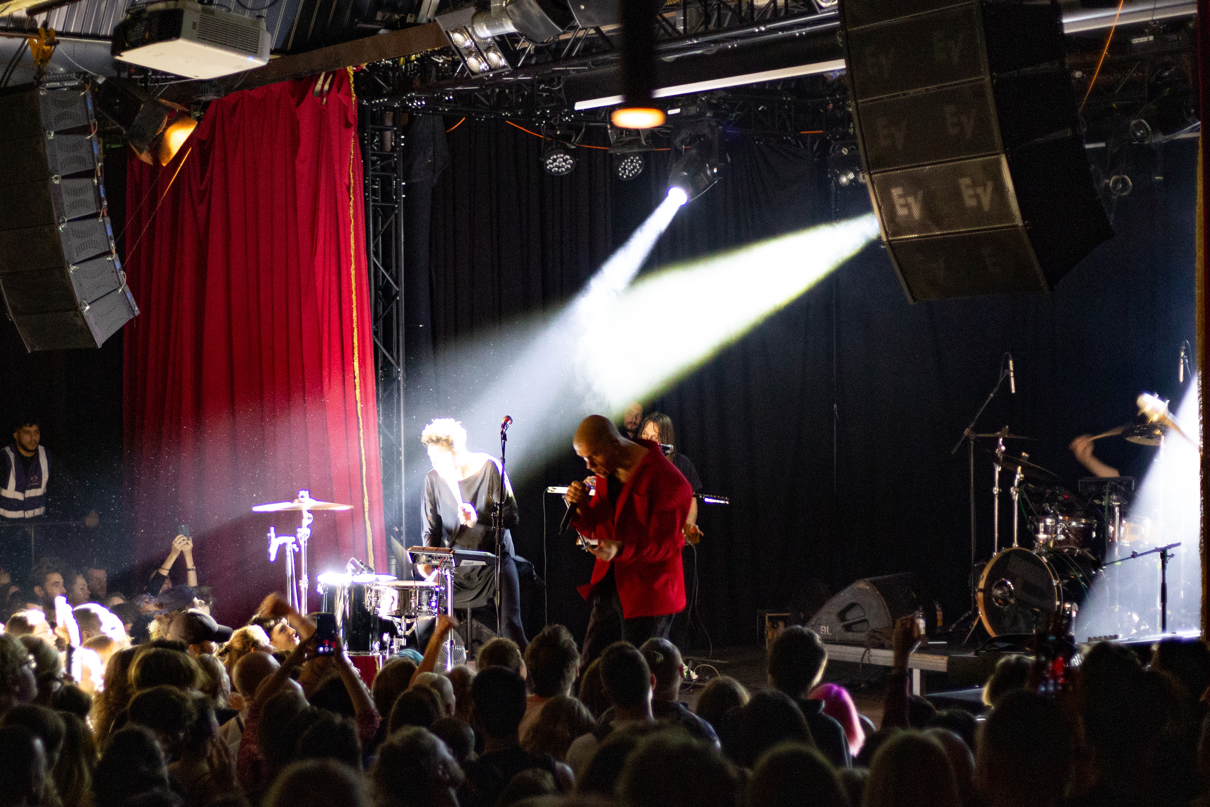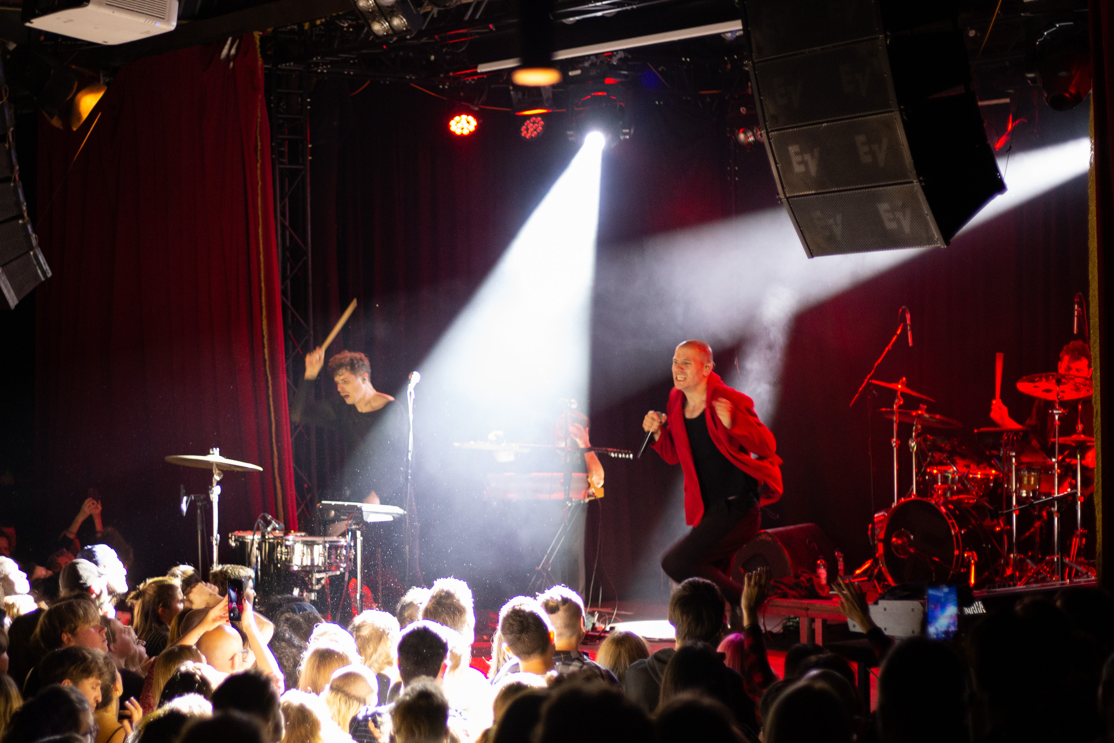 A live music performance is captured in a dimly lit stage, with a spotlight illuminating the performers. The stage is adorned with blue curtains and a red curtain, creating a vibrant contrast. The performers, dressed in black and red, are engaged in a lively dance, with one person holding a wooden stick. The audience, seated in the foreground, watches the performance with anticipation. The image captures the essence of a live music performance, with the performers, audience, and stage elements all contributing to the overall atmosphere.