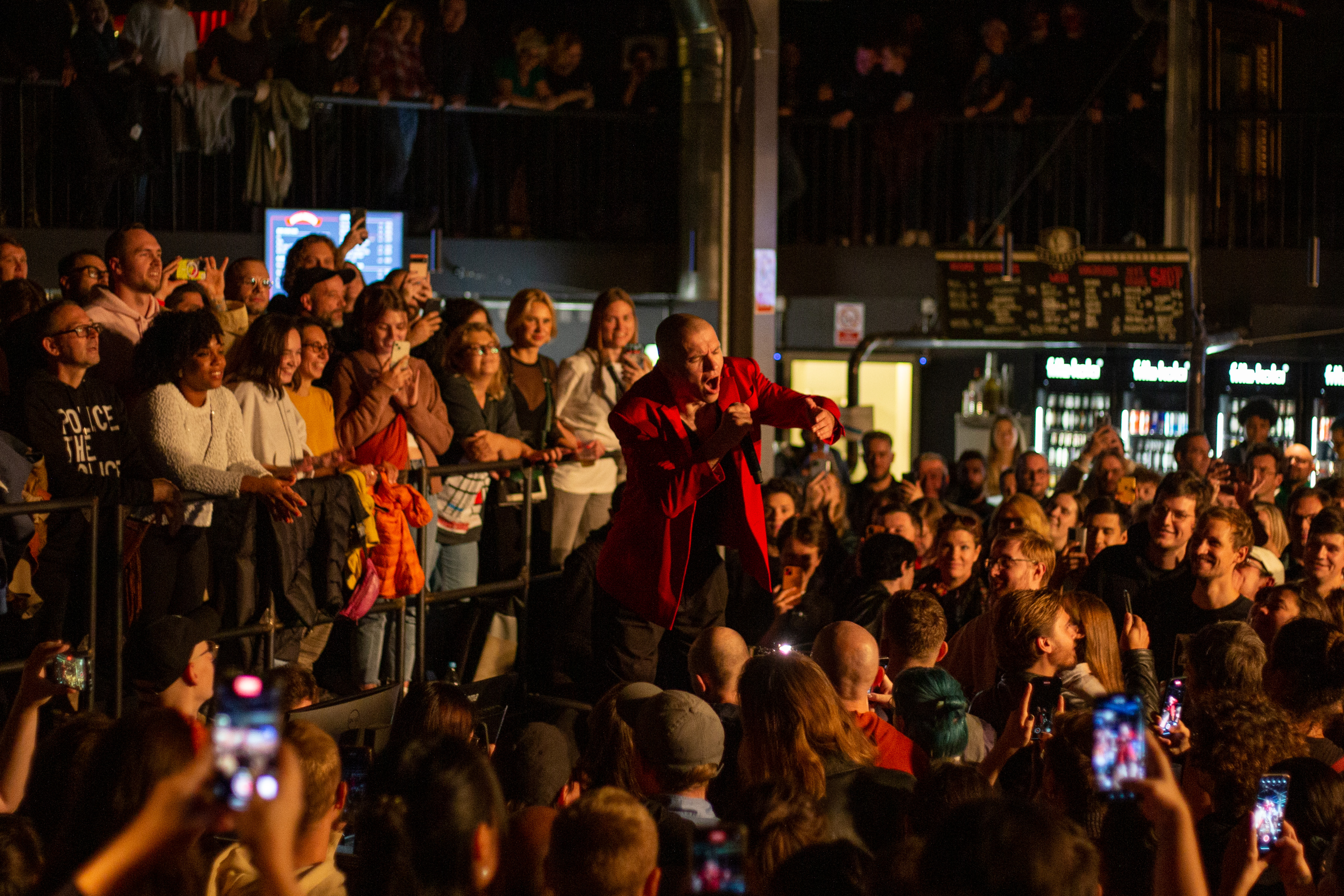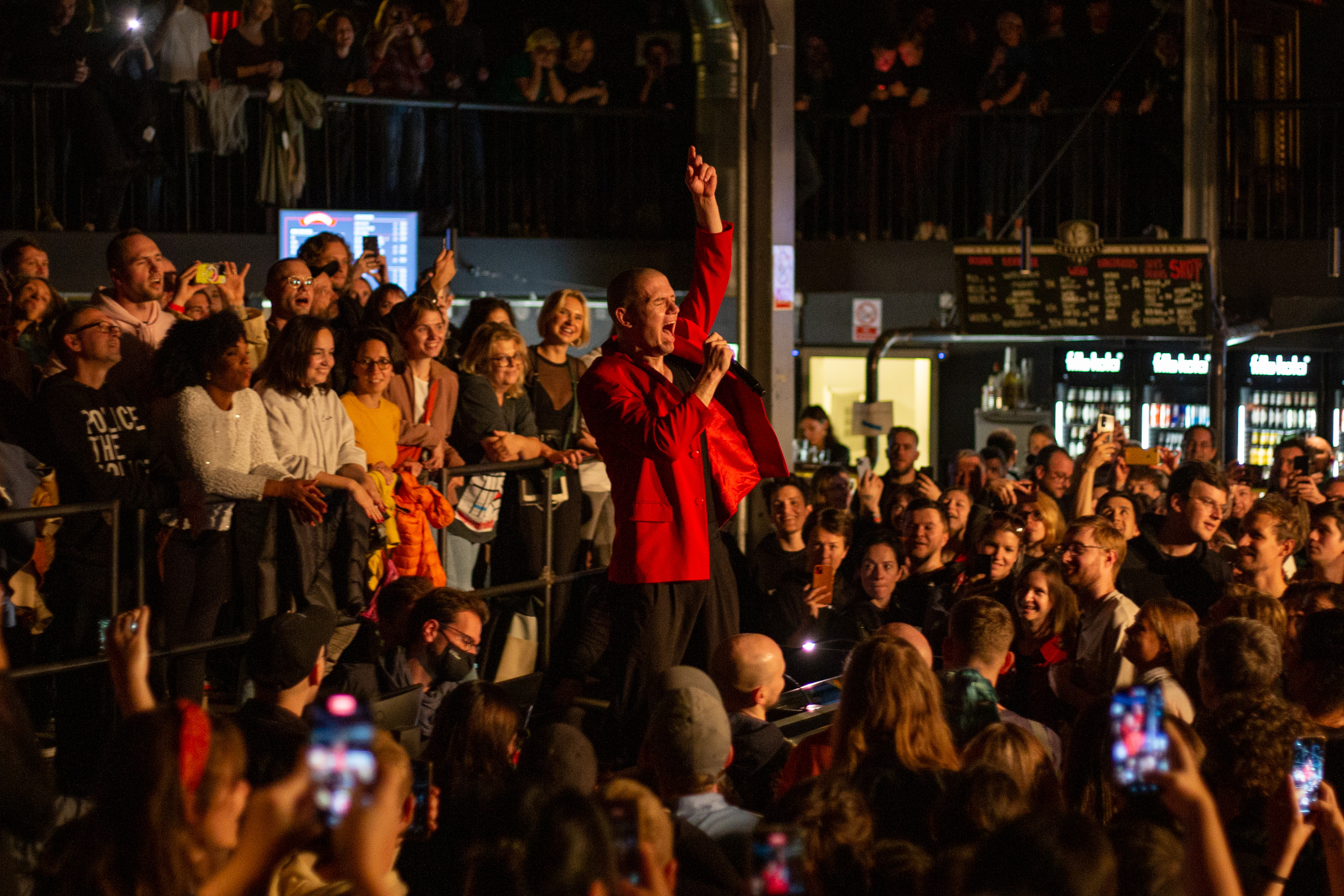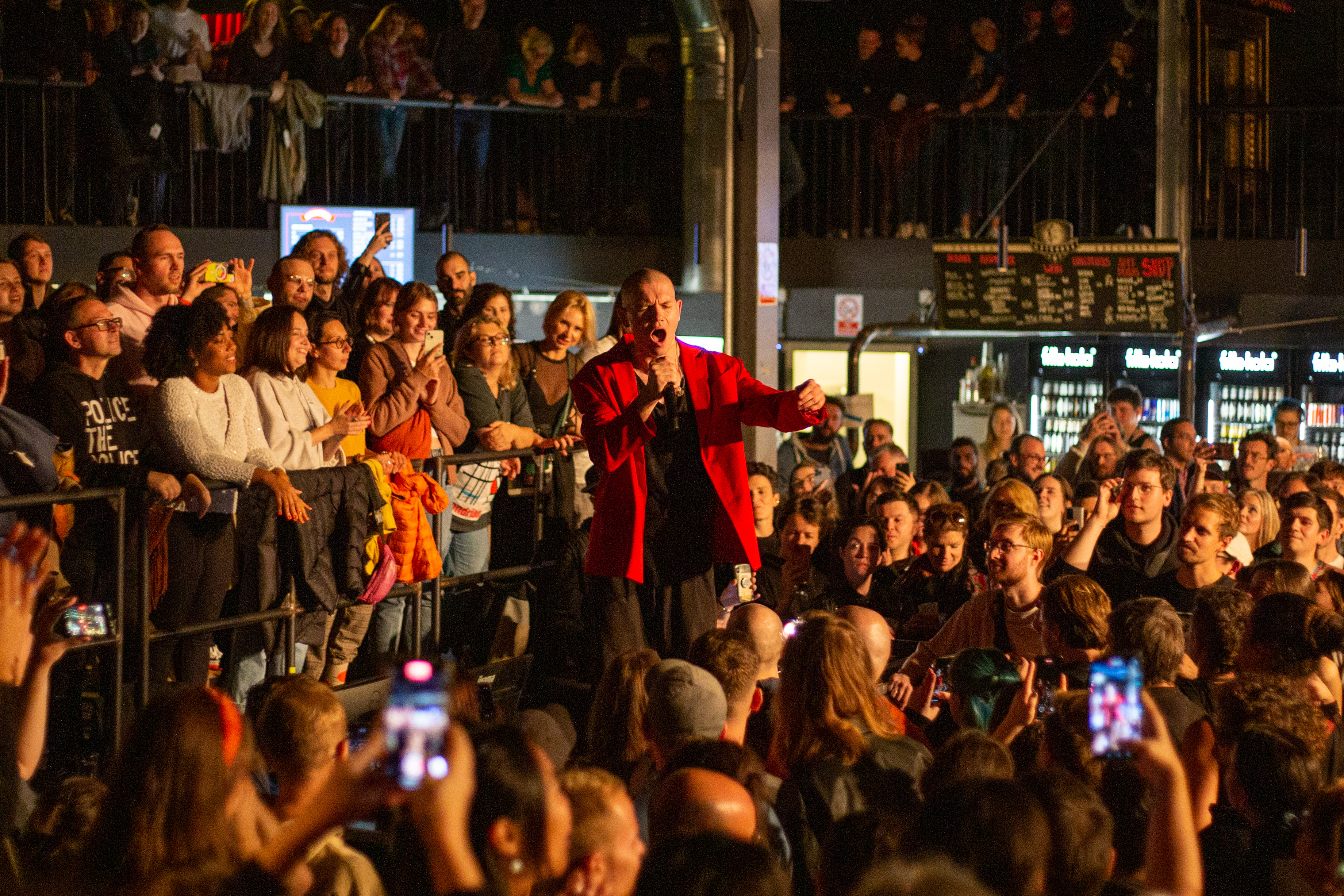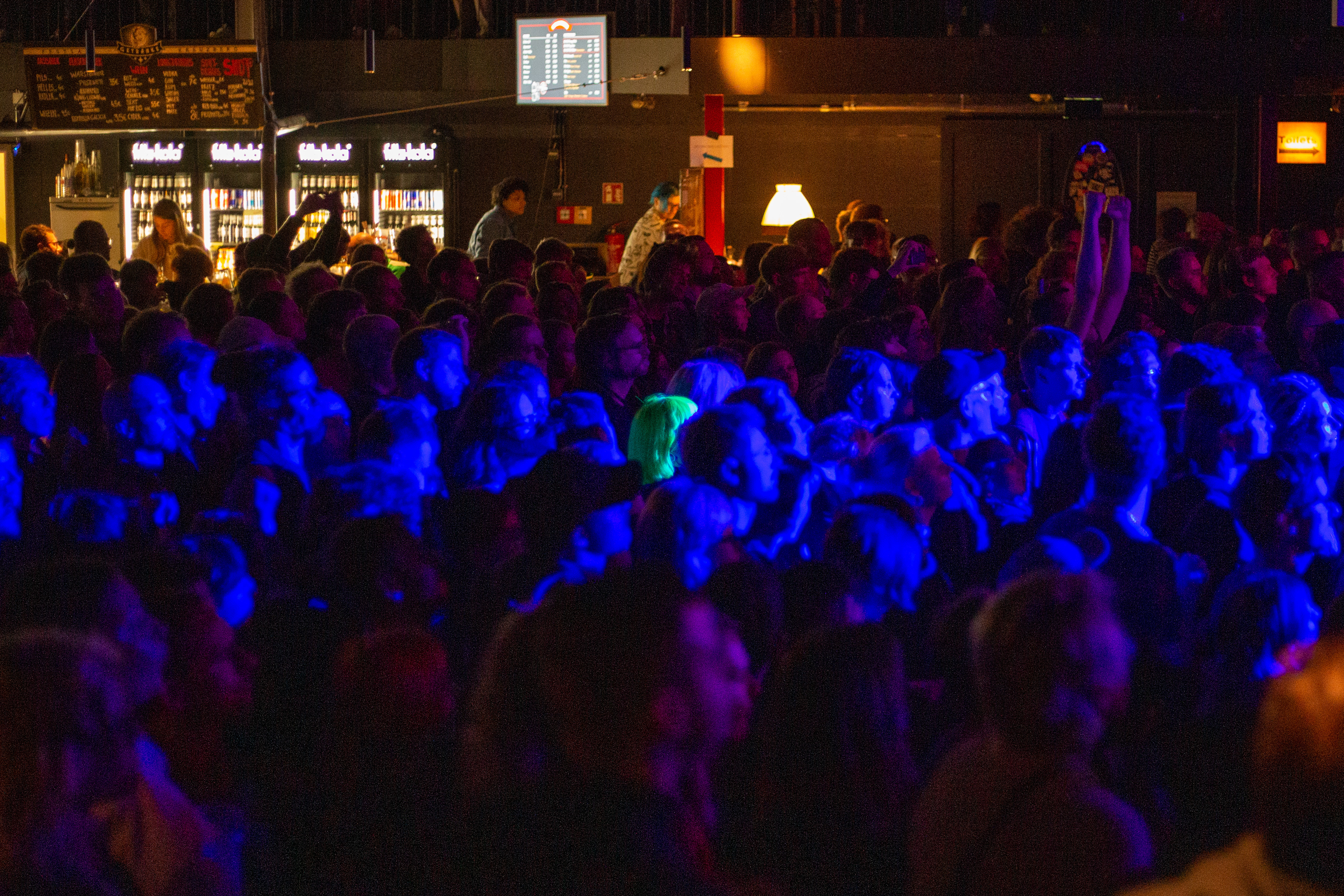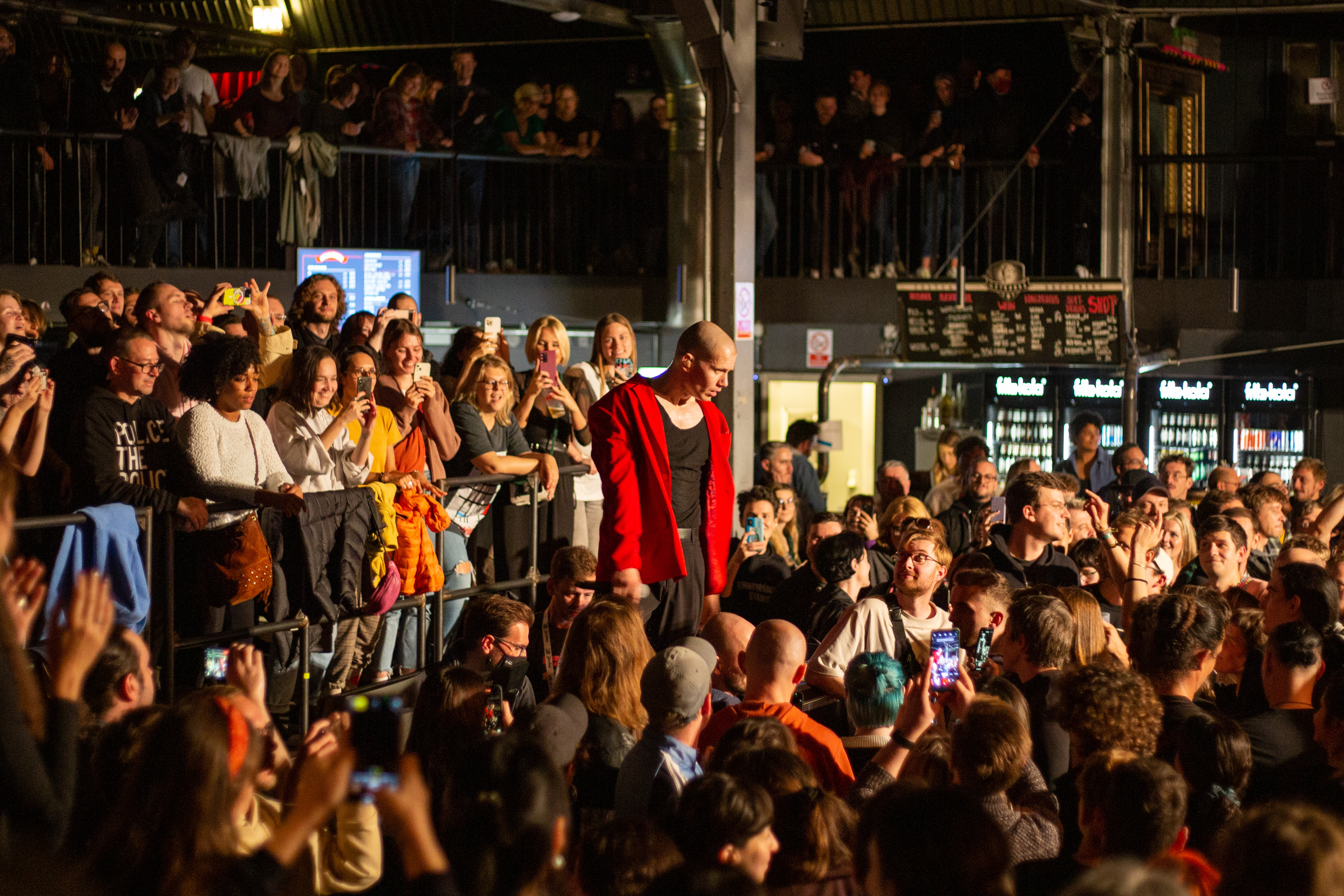 A live music performance is captured in a dimly lit stage, with a spotlight illuminating the performers. The stage is adorned with blue curtains and a red curtain, creating a vibrant contrast. The performers, dressed in black and red, are engaged in a lively dance, with one person holding a wooden stick. The audience, seated in the foreground, watches the performance with anticipation. The image captures the essence of a live music performance, with the performers, audience, and stage elements all contributing to the overall atmosphere.