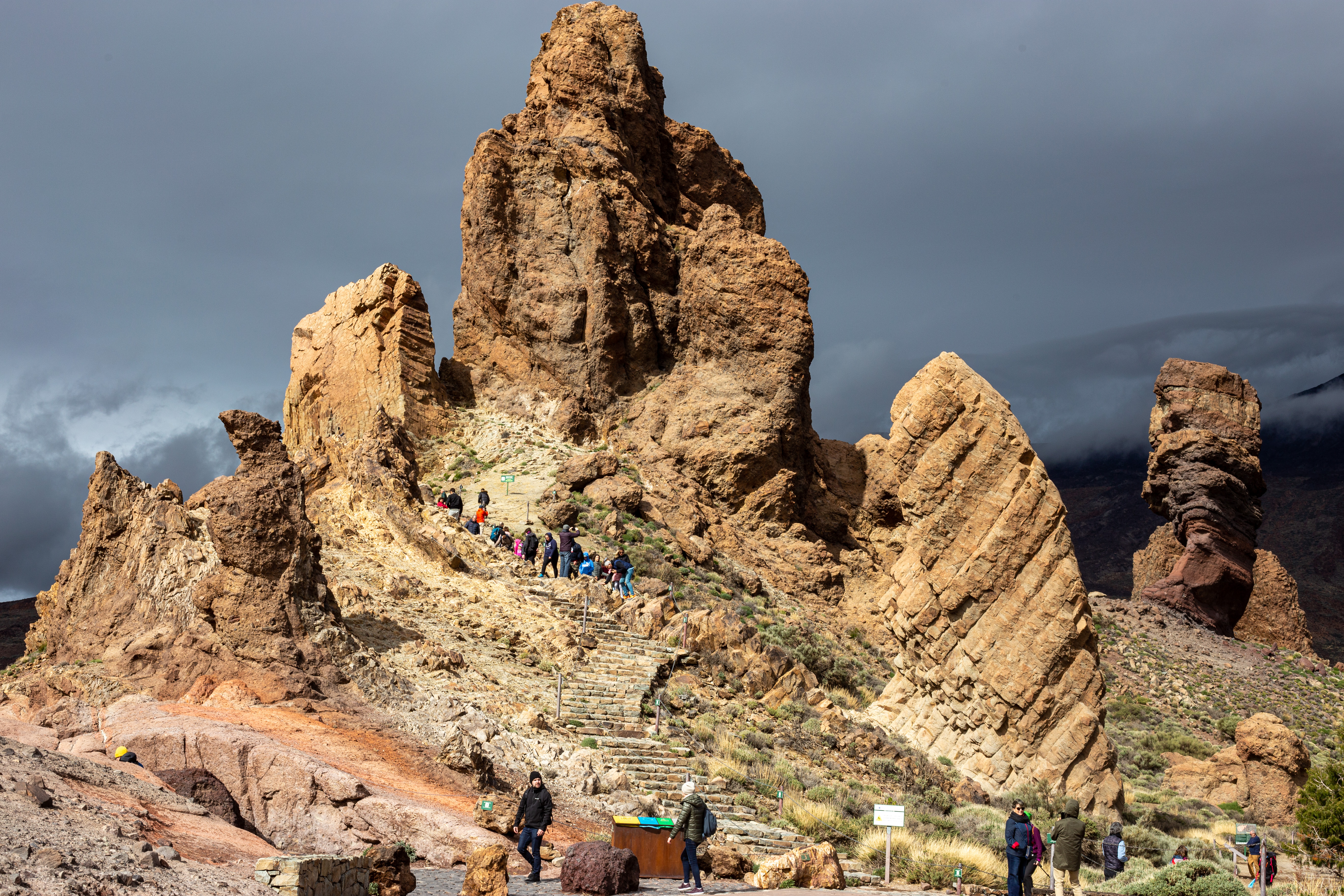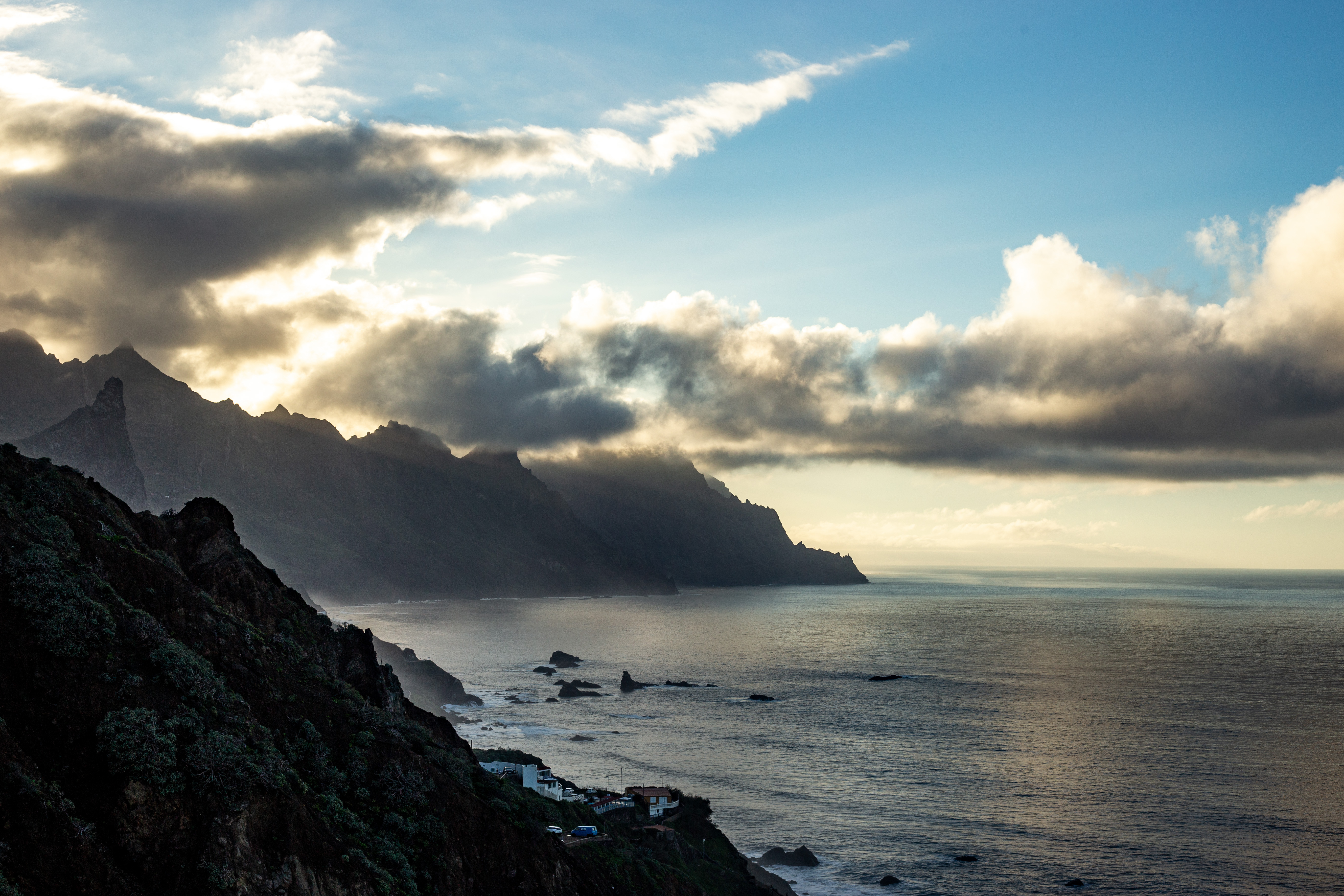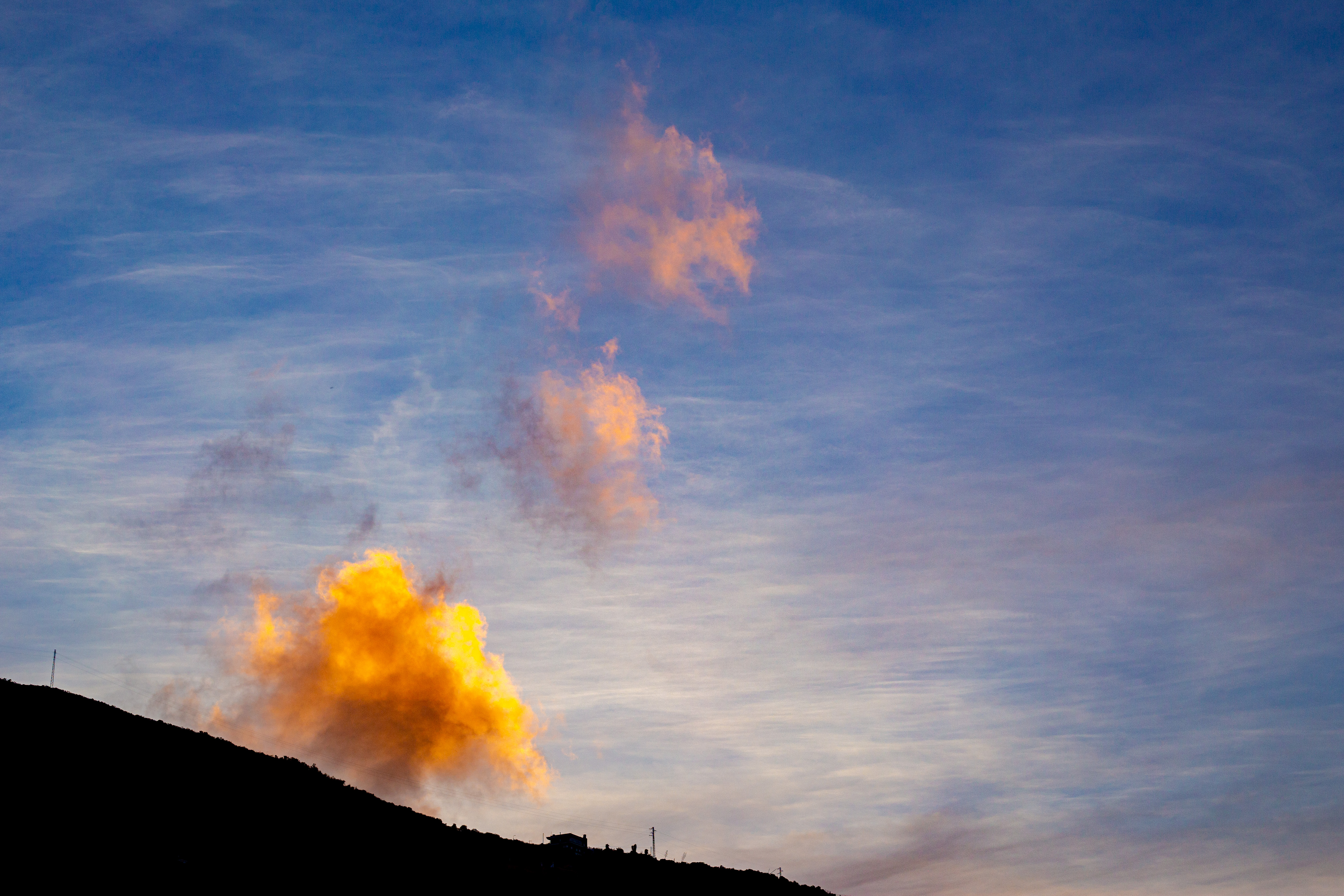 A breathtaking sunset over a mountain range is captured in the image. The sky is a gradient of orange and pink, with the sun setting behind the mountains. The mountains, with their dark silhouettes, are illuminated by the setting sun, creating a dramatic effect. The perspective of the image is from a distance, looking up at the mountains, emphasizing their grandeur. The image does not contain any discernible text or countable objects. The relative positions of the objects suggest a vast, open landscape with the mountains as the main focus. The image does not provide any information about the exact location of the landmark.