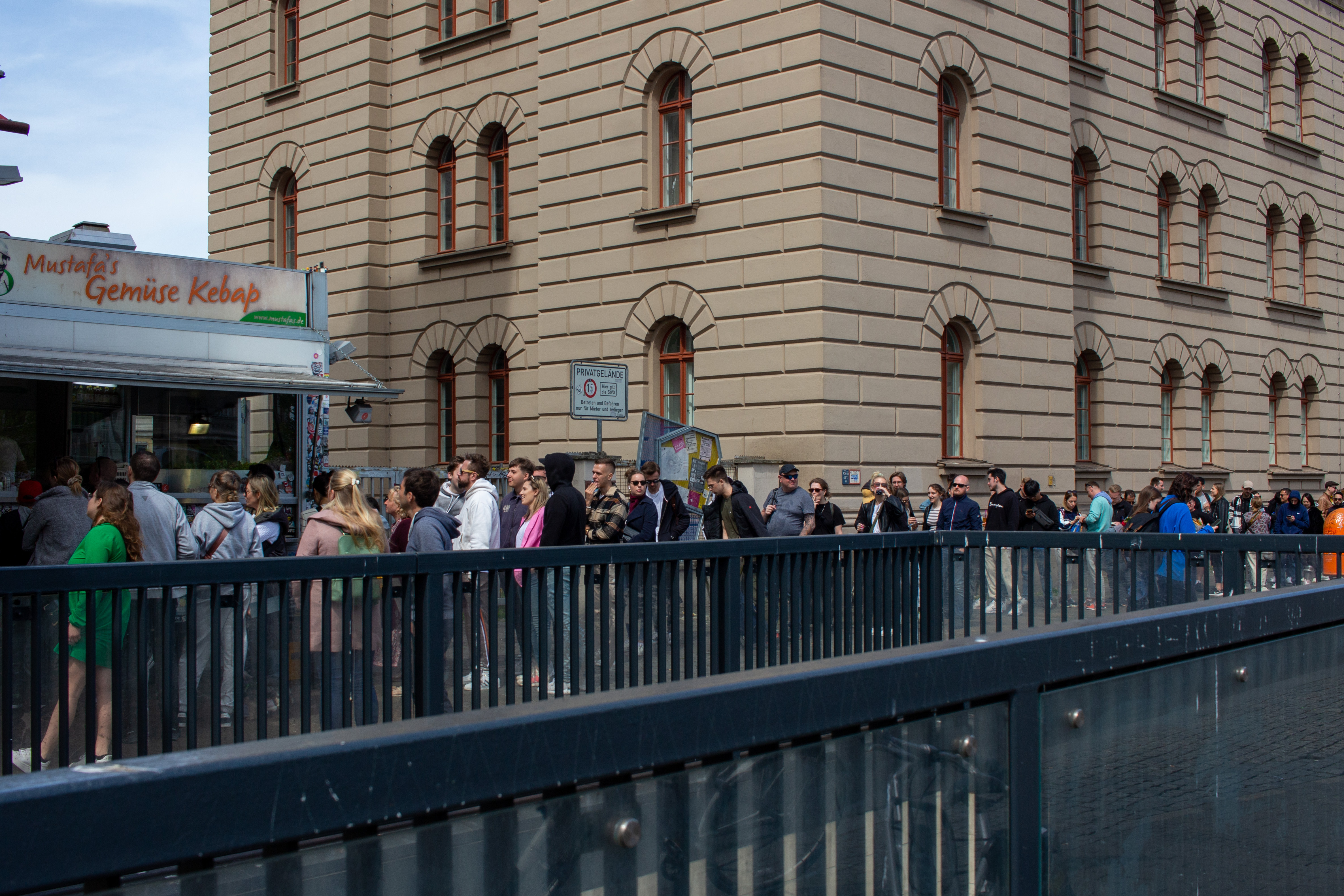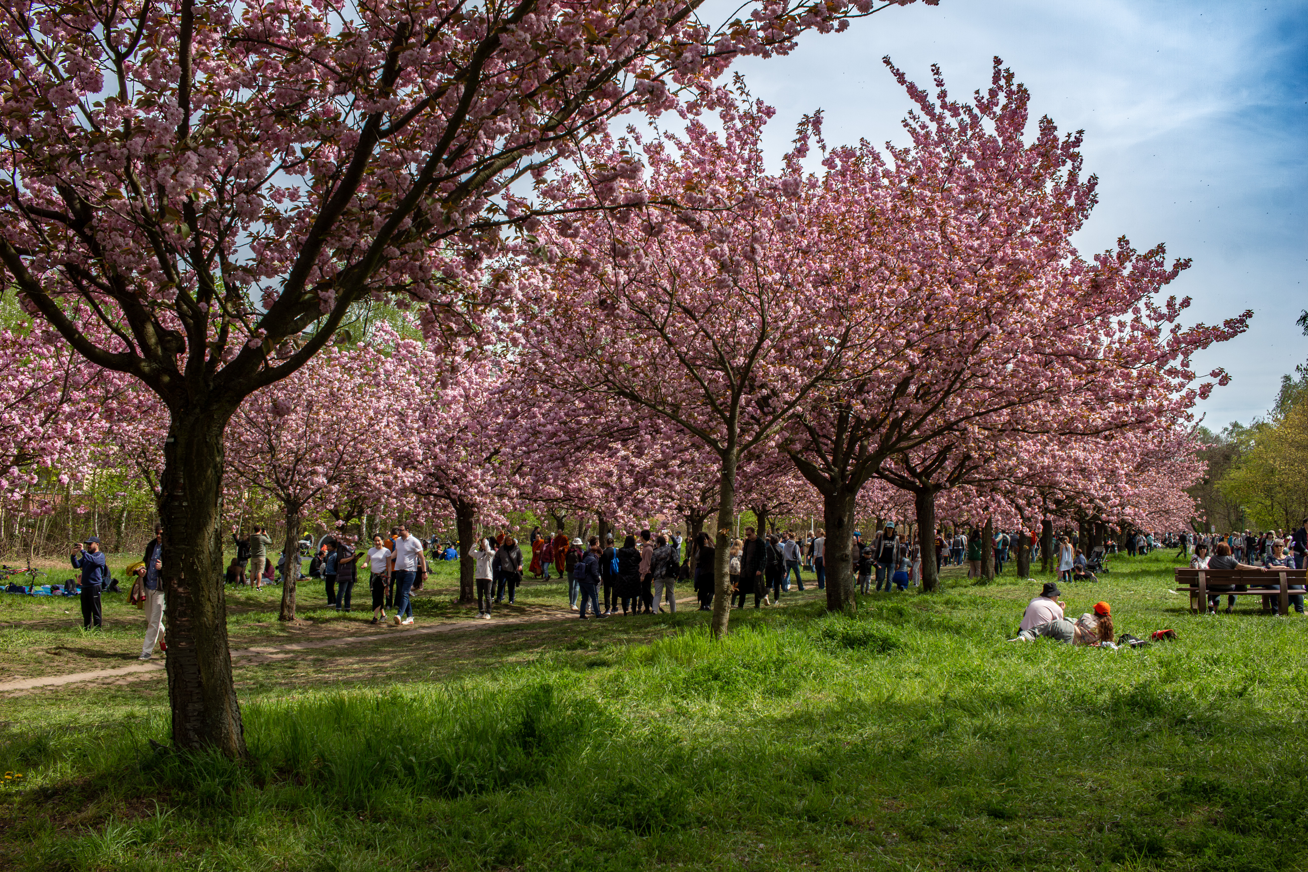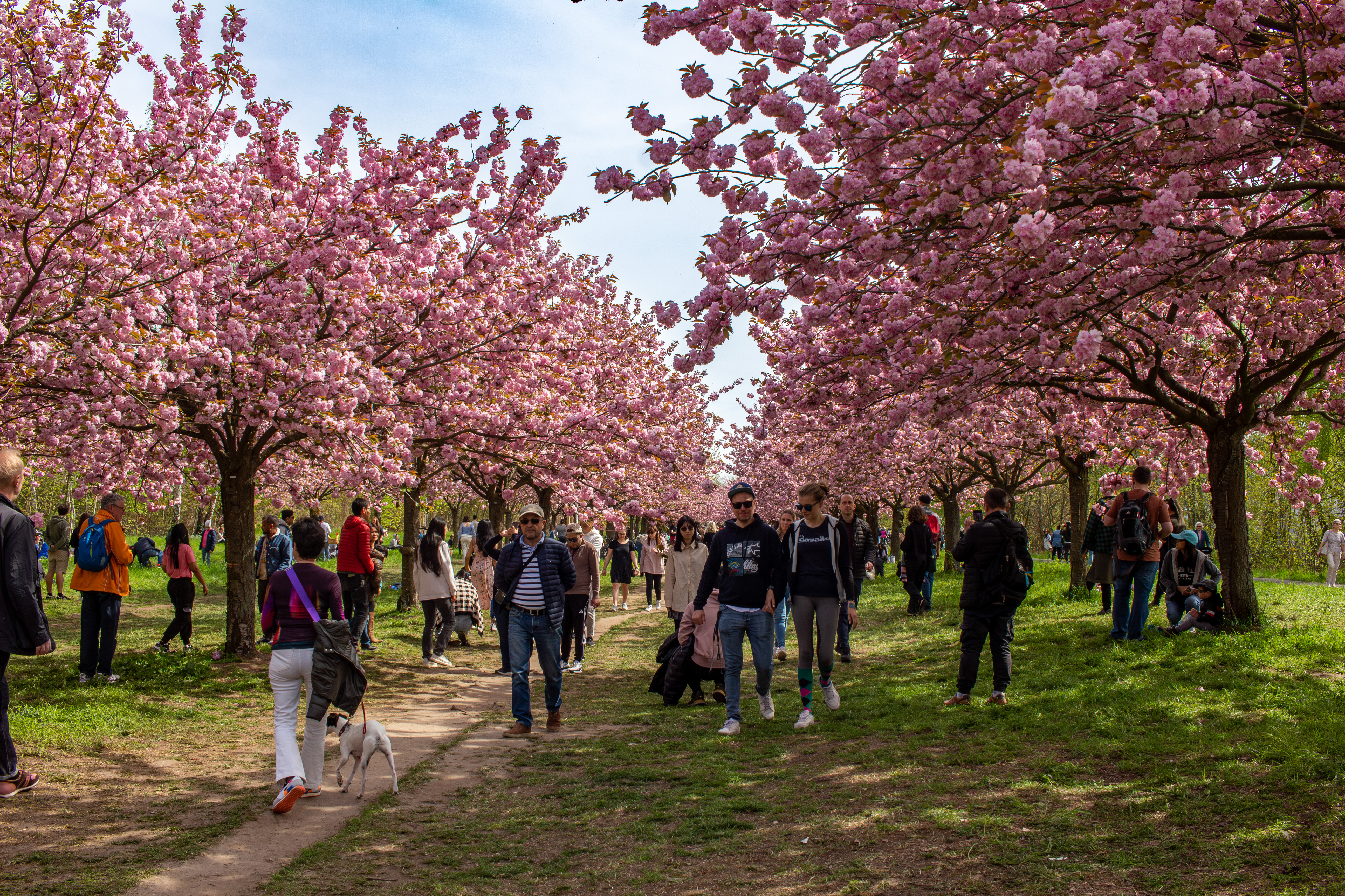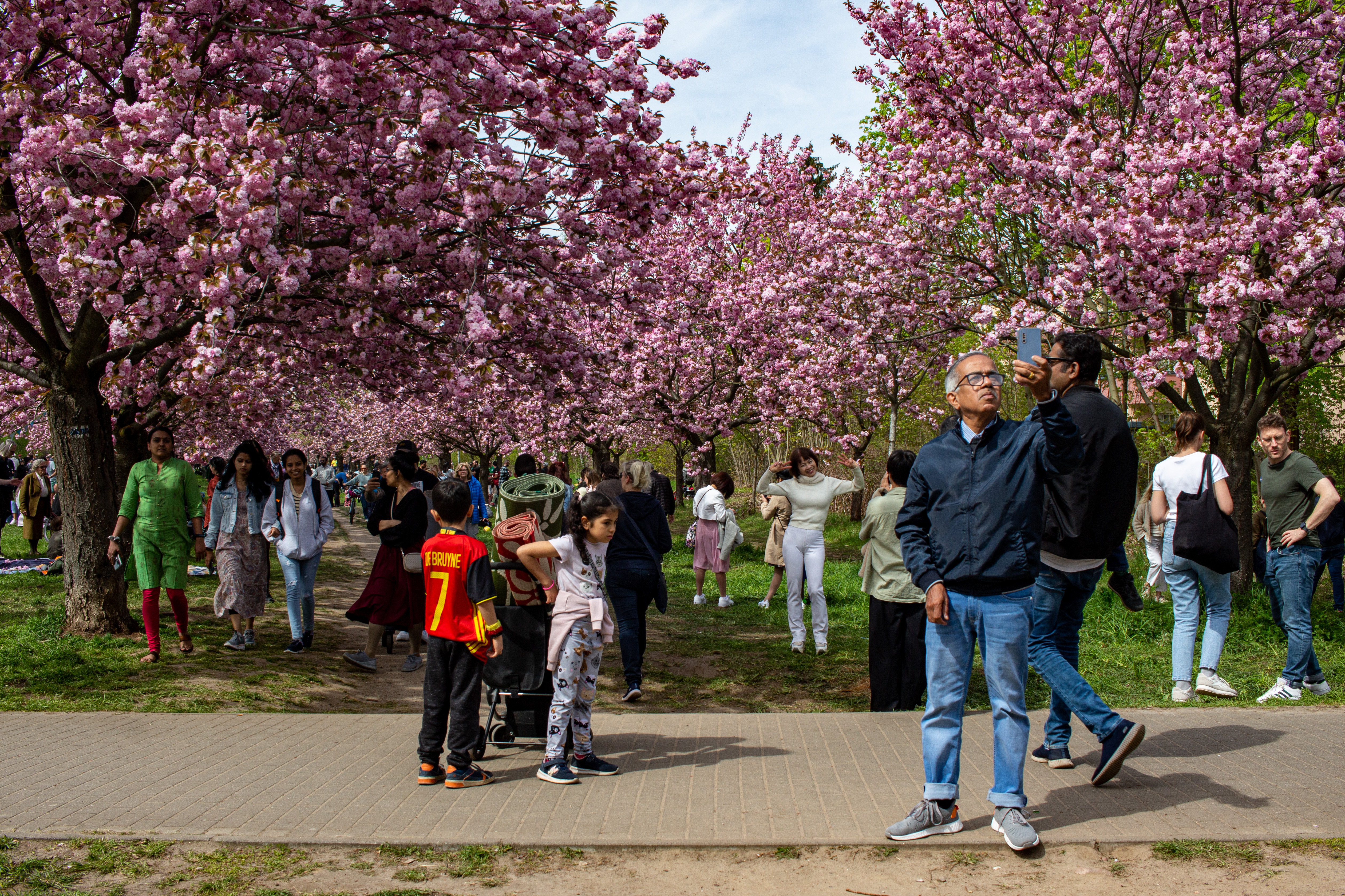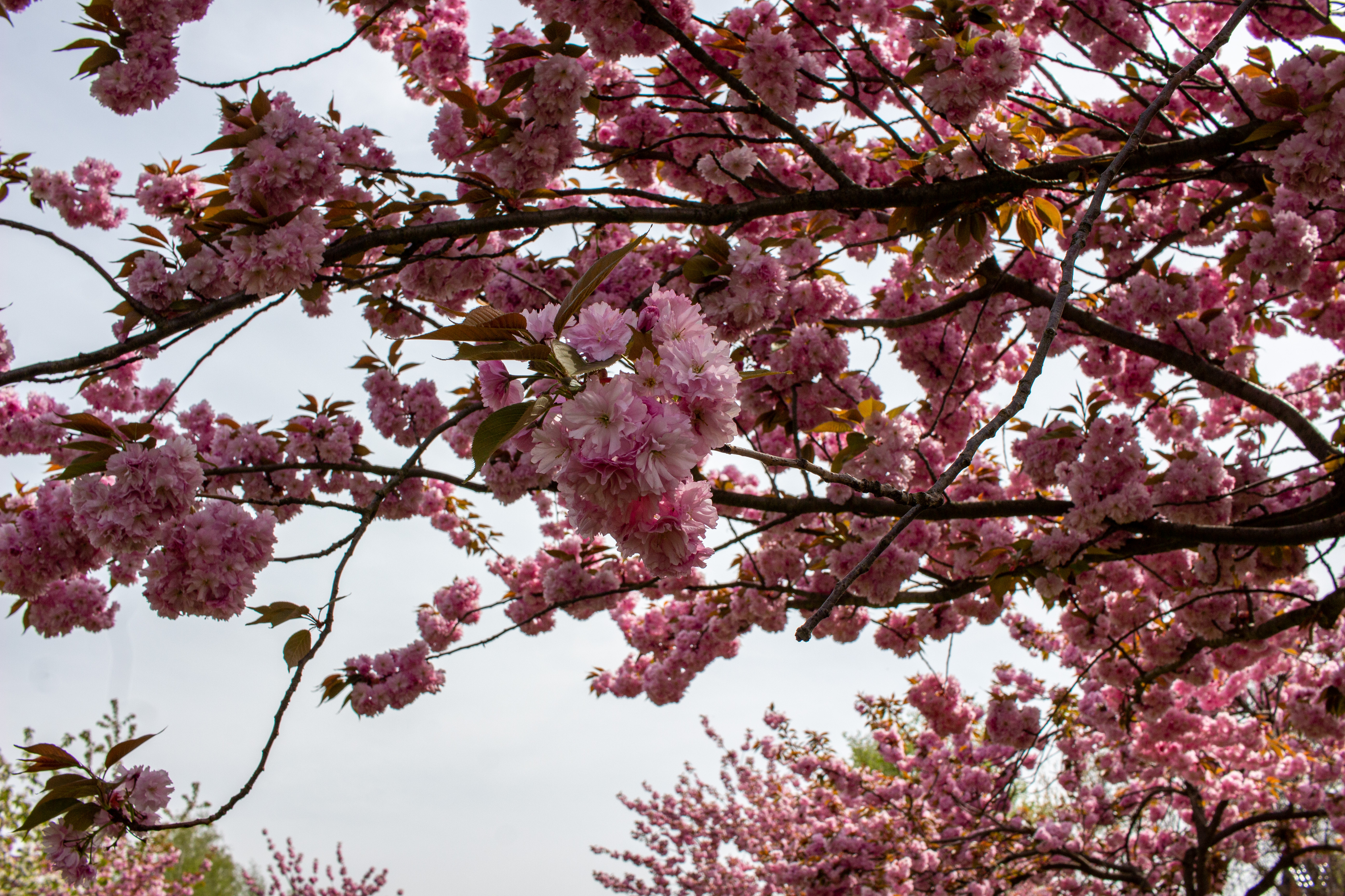 A cherry blossom tree in full bloom, with pink flowers and green leaves, is the focal point of the image. The tree is set against a light blue sky, creating a serene backdrop. The perspective is from below, looking up at the tree, emphasizing its height and grandeur. The image does not contain any discernible text or countable objects. The relative positions of the tree and the sky suggest a natural, outdoor setting.