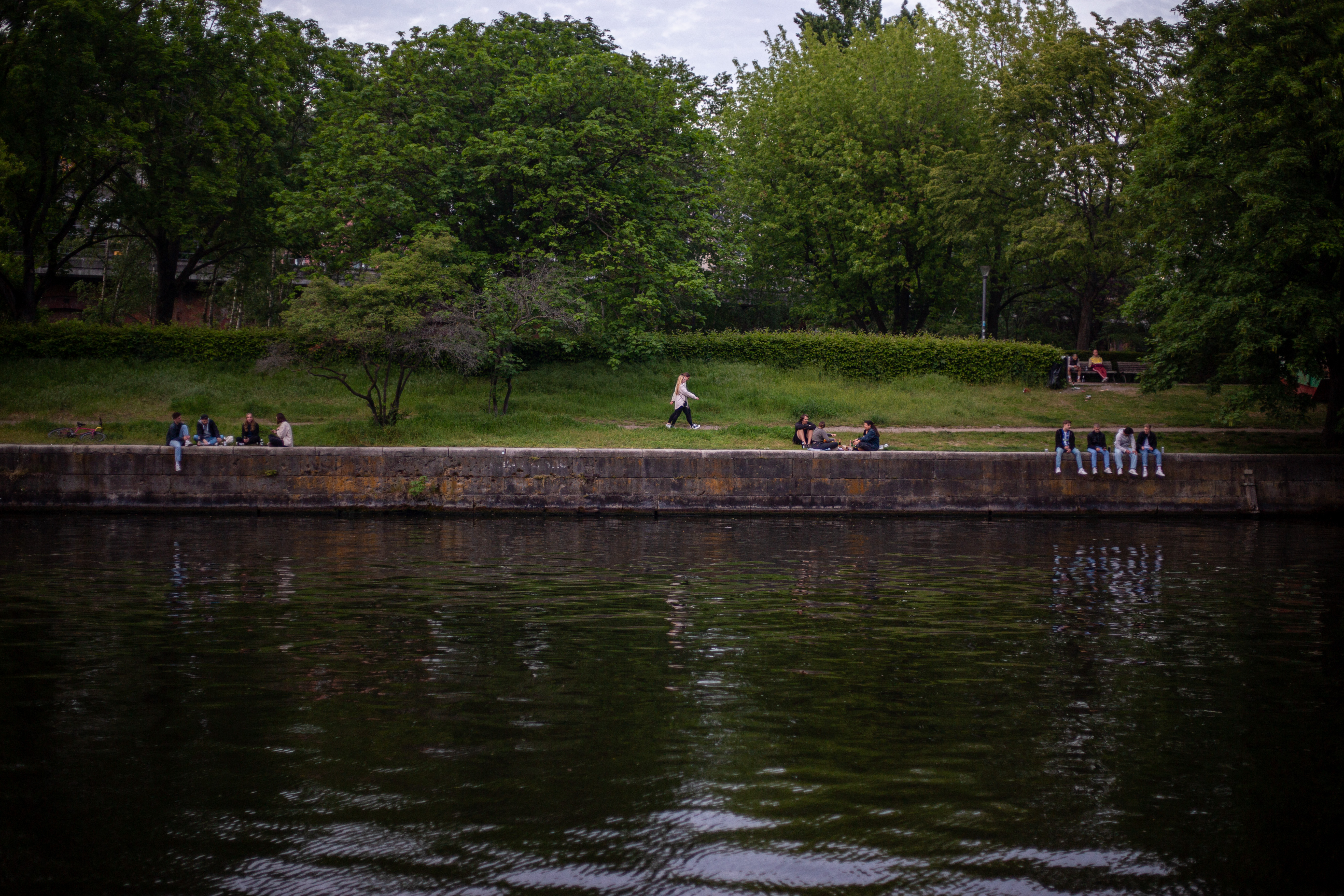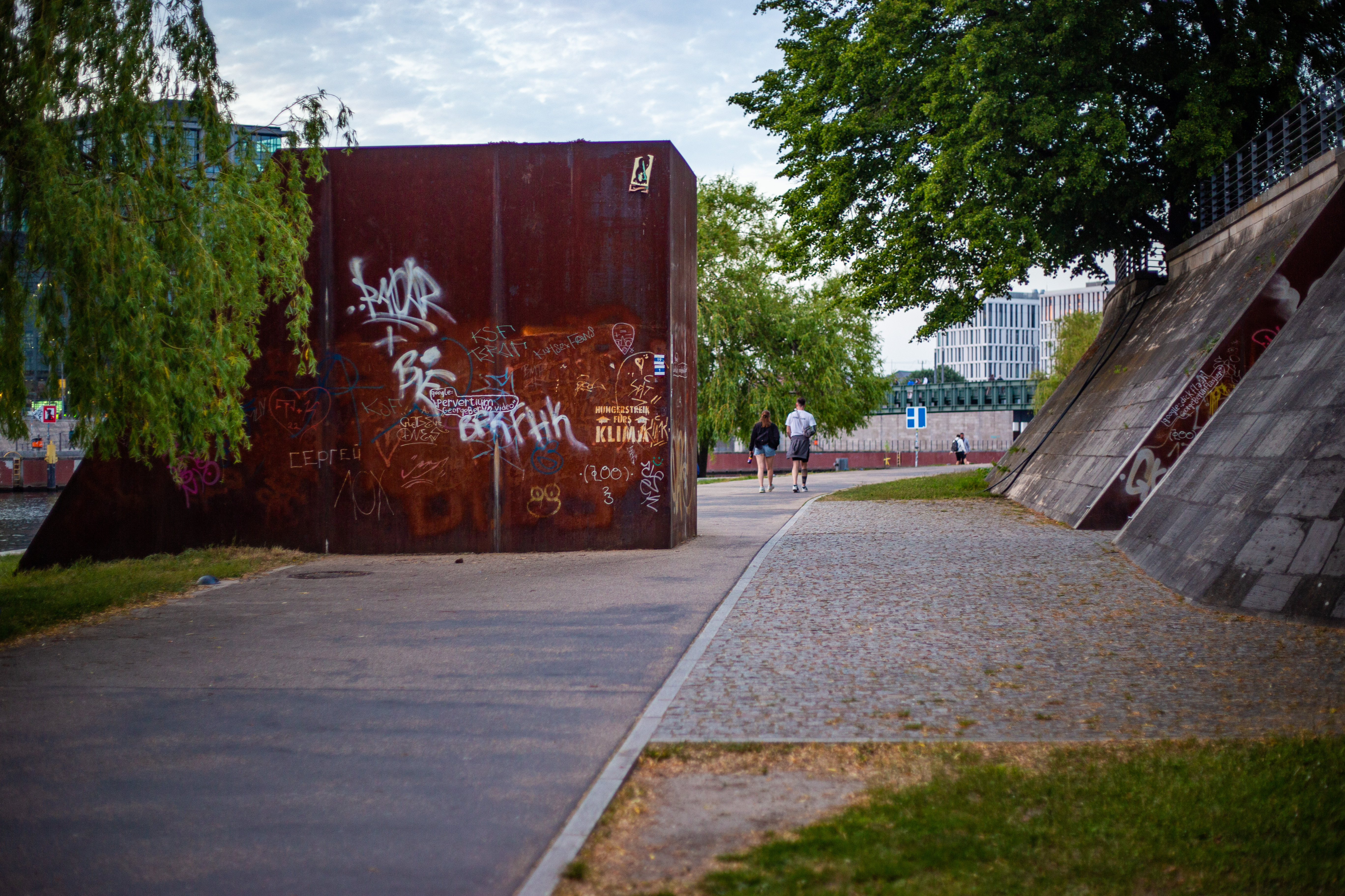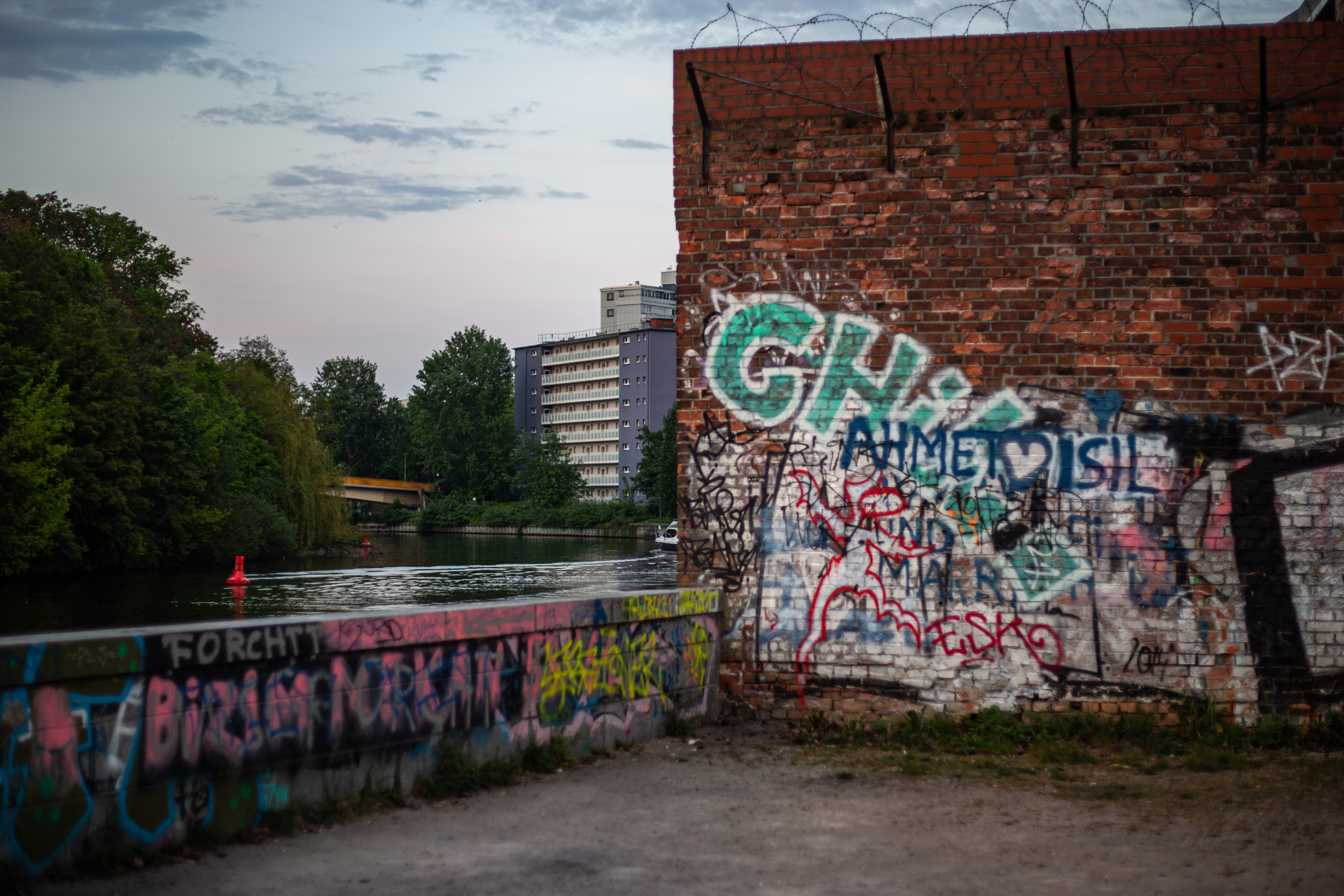 A vibrant urban scene features a red brick wall with graffiti, a serene river reflecting the cityscape, and a red fire hydrant. The graffiti, in shades of blue, green, and white, adds a splash of color to the scene. The river, reflecting the city's energy, stretches into the distance. The cityscape, with its tall buildings and trees, is visible in the background. The image captures a moment of urban life, blending art, nature, and architecture.