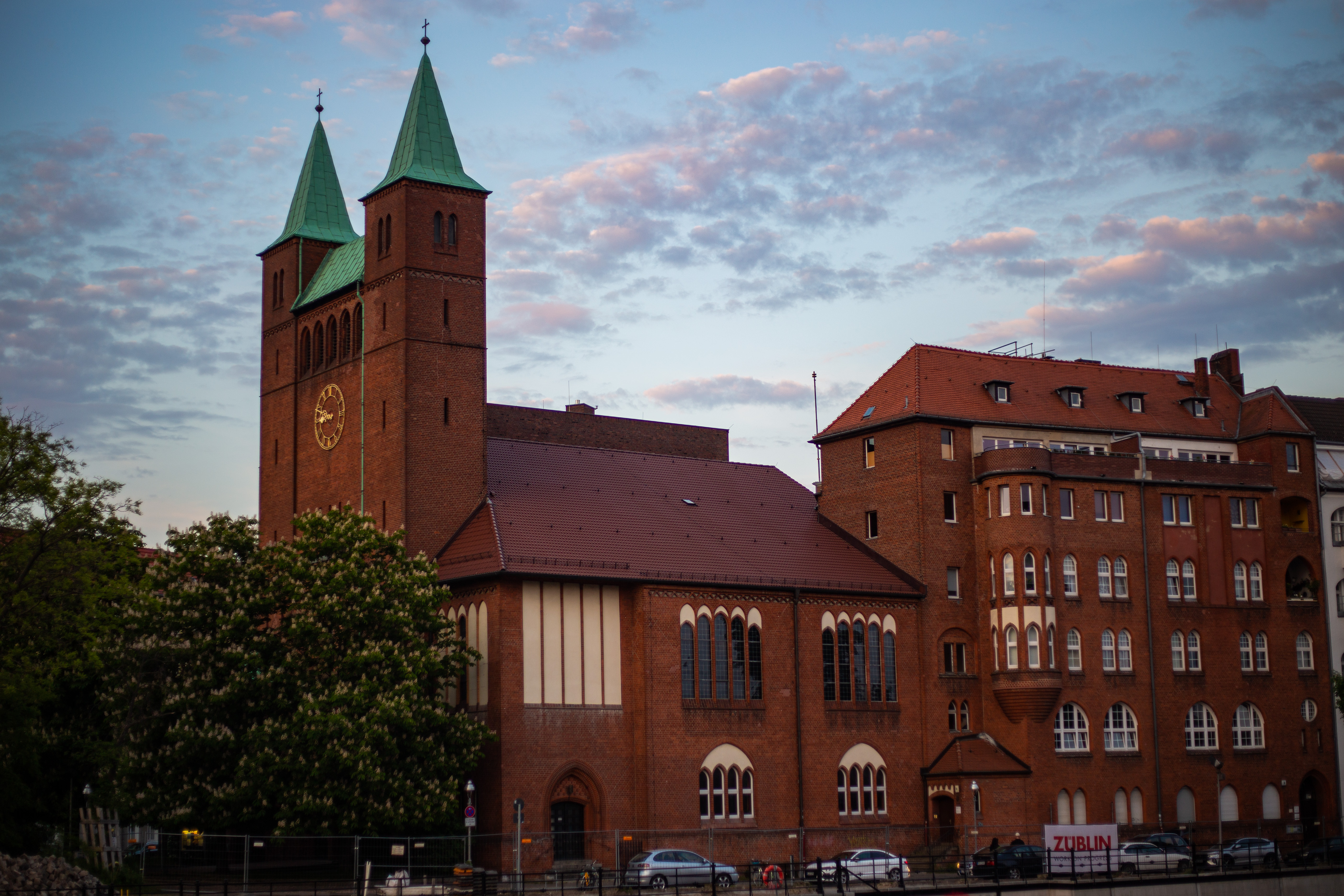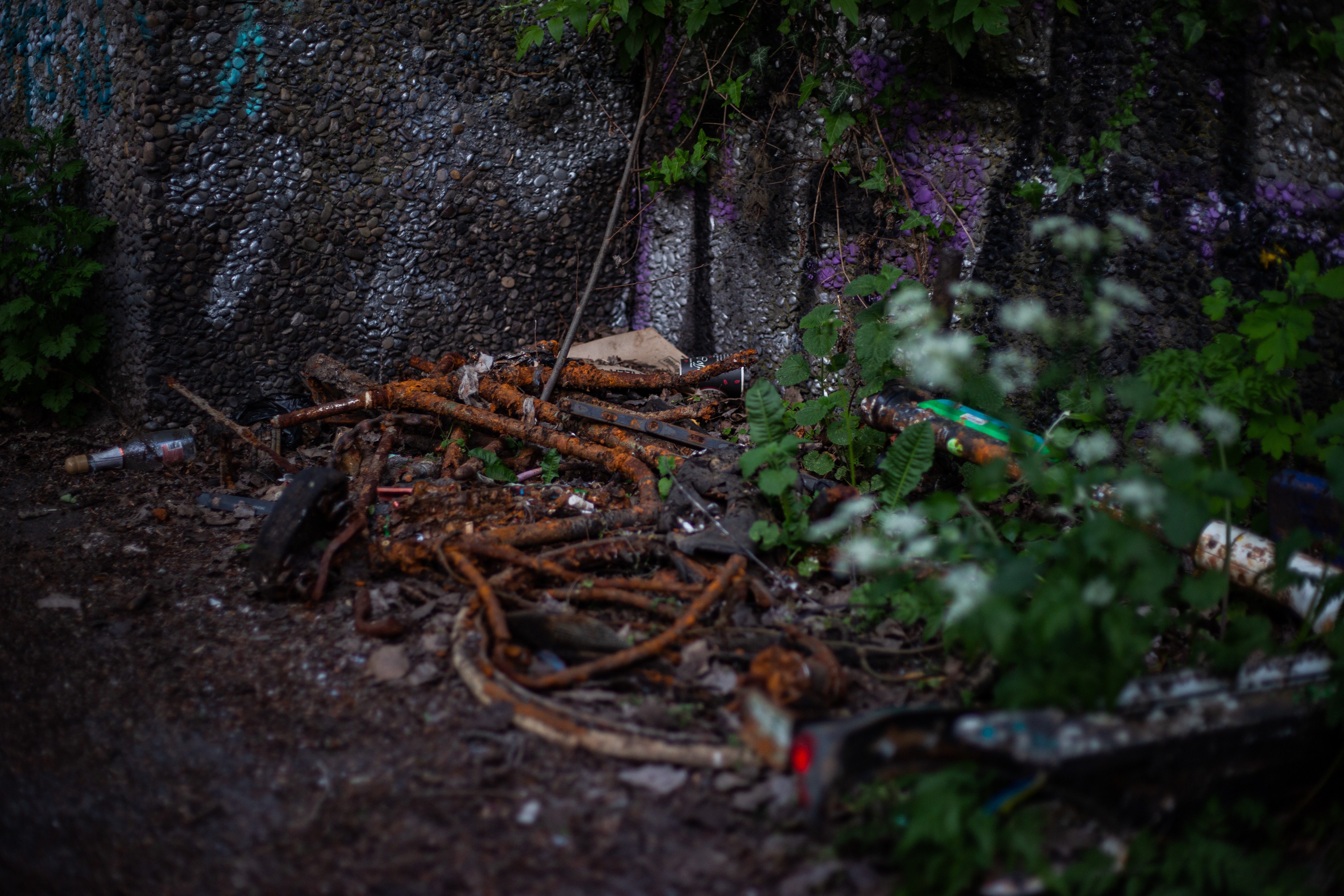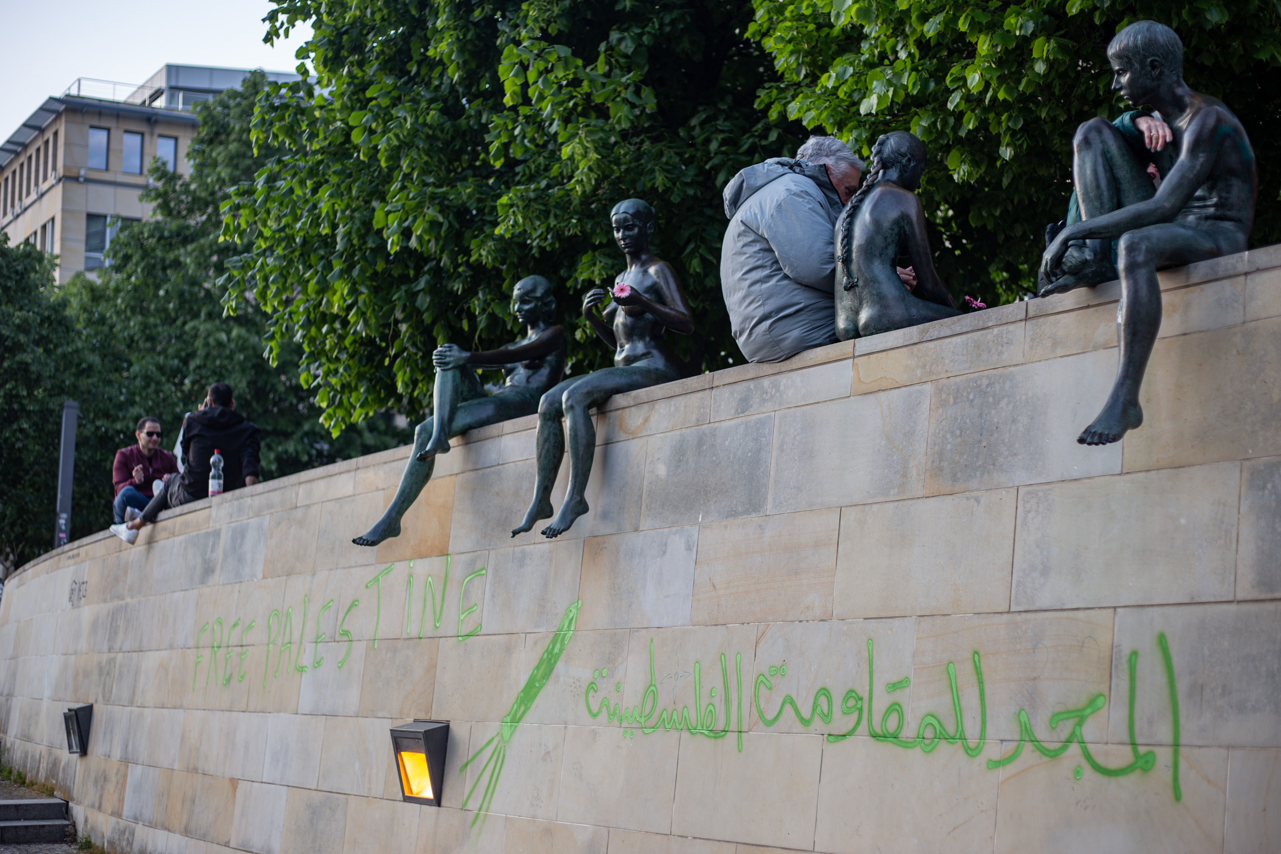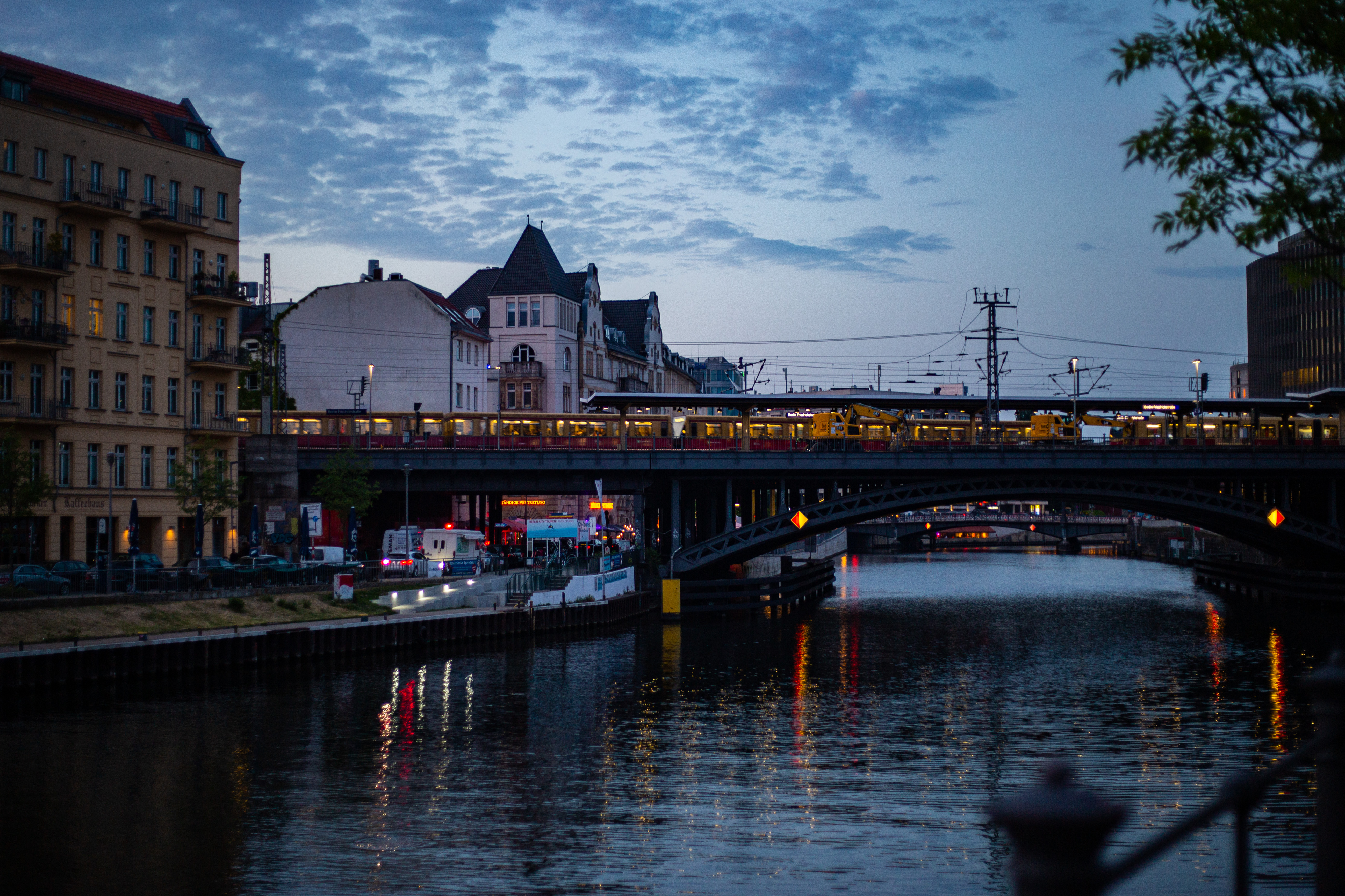 A vibrant urban scene features a red brick wall with graffiti, a serene river reflecting the cityscape, and a red fire hydrant. The graffiti, in shades of blue, green, and white, adds a splash of color to the scene. The river, reflecting the city's energy, stretches into the distance. The cityscape, with its tall buildings and trees, is visible in the background. The image captures a moment of urban life, blending art, nature, and architecture.