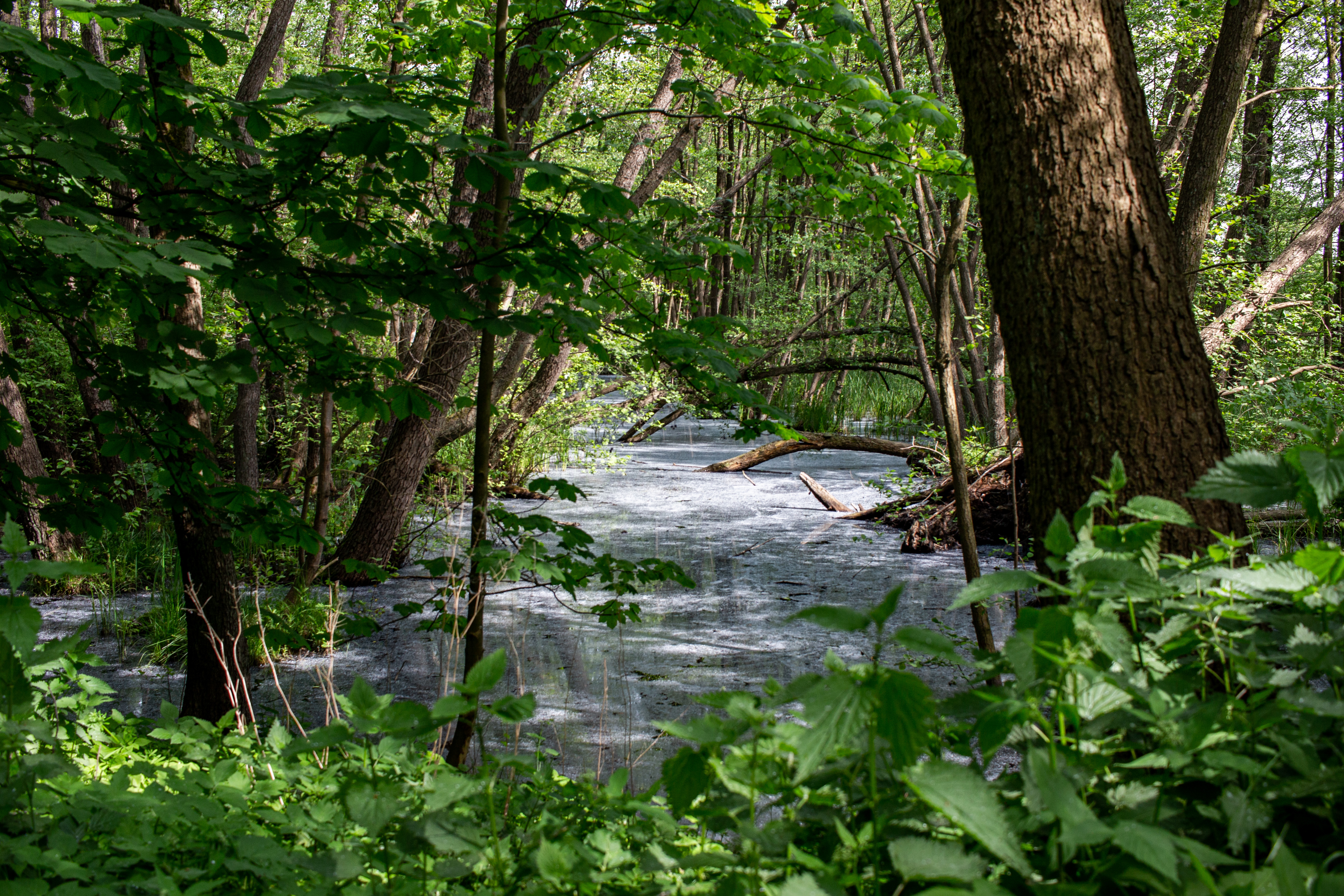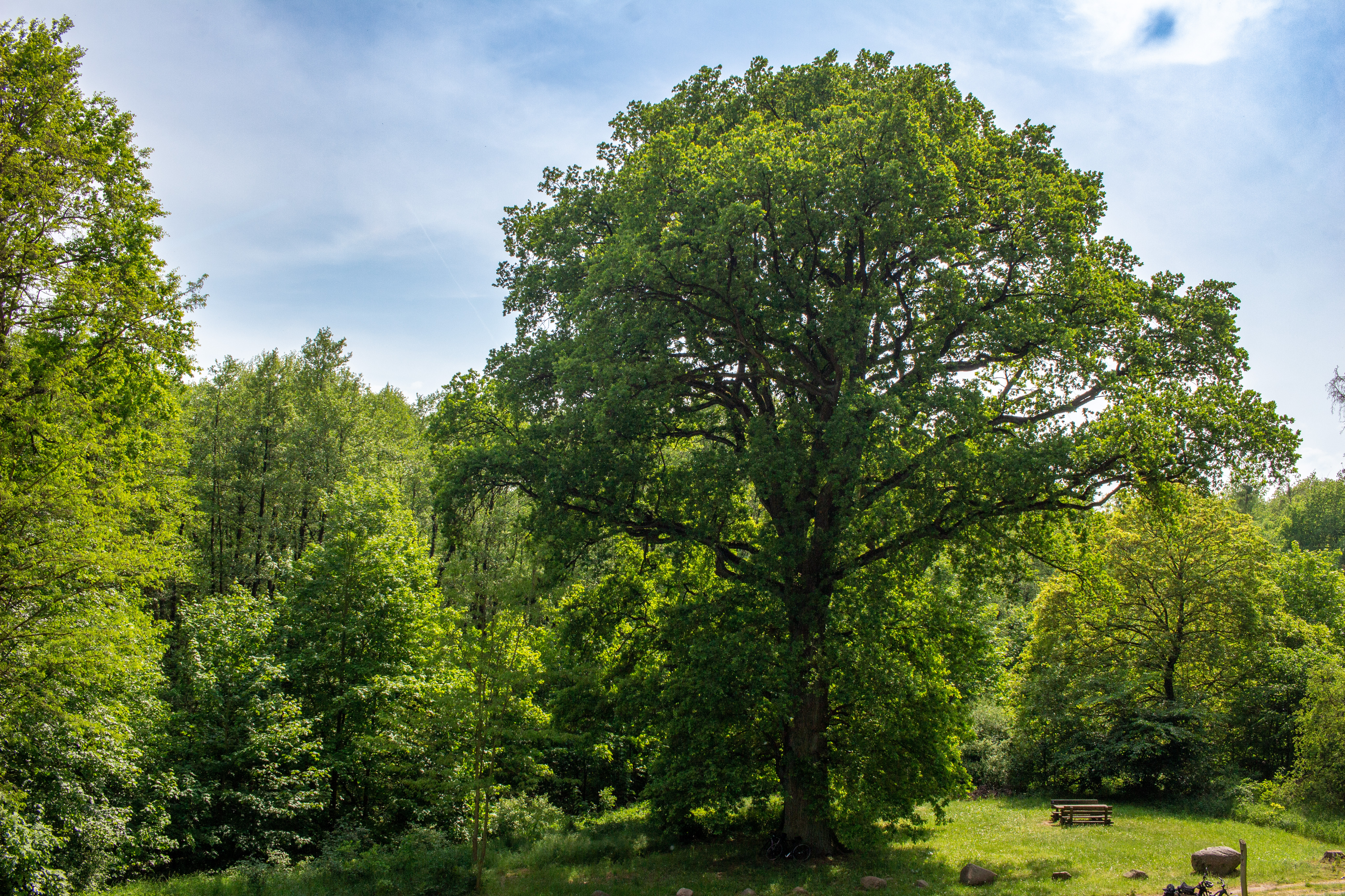 A large, mature oak tree stands in a lush green park, surrounded by other trees and shrubs. The tree's large, robust trunk and broad canopy of green leaves create a sense of tranquility. The park is filled with greenery, including grass, bushes, and trees, and a few benches are scattered around, inviting visitors to rest and enjoy the natural surroundings. The sky above is a clear blue, with a few clouds adding depth to the scene. The image captures a peaceful moment in a park, with the oak tree as the central focus.