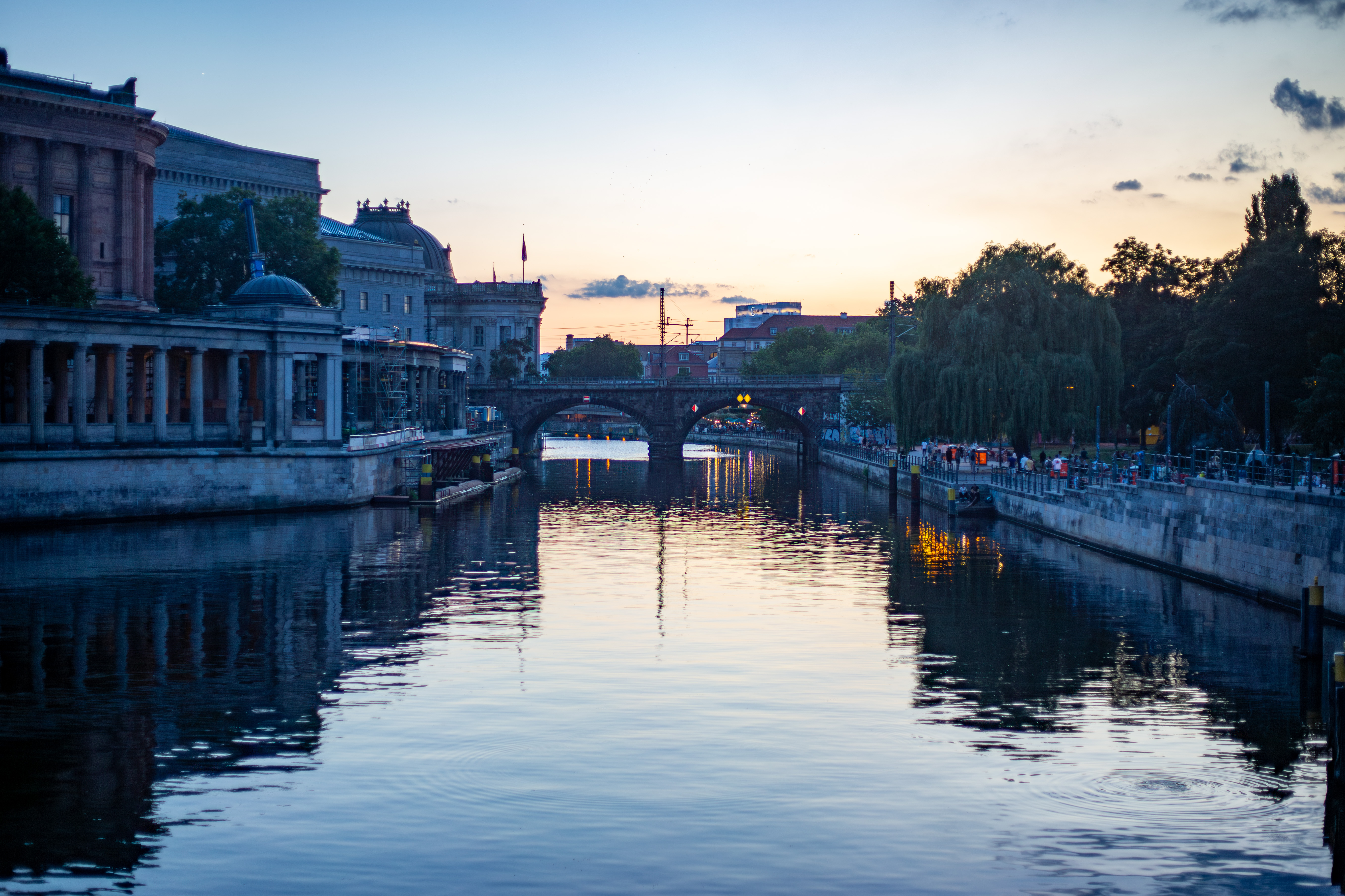 At dusk, a dark stone bridge with a curved design spans a tranquil river, reflecting the city's lights and creating a mesmerizing mirror image. The river is lined with buildings, some with ornate facades and colorful lights, and street lamps that add to the urban ambiance. The sky is a deep blue, and the scene is bathed in warm, inviting light. The image captures the essence of a city at dusk, with the bridge, river, and buildings all contributing to the urban landscape.