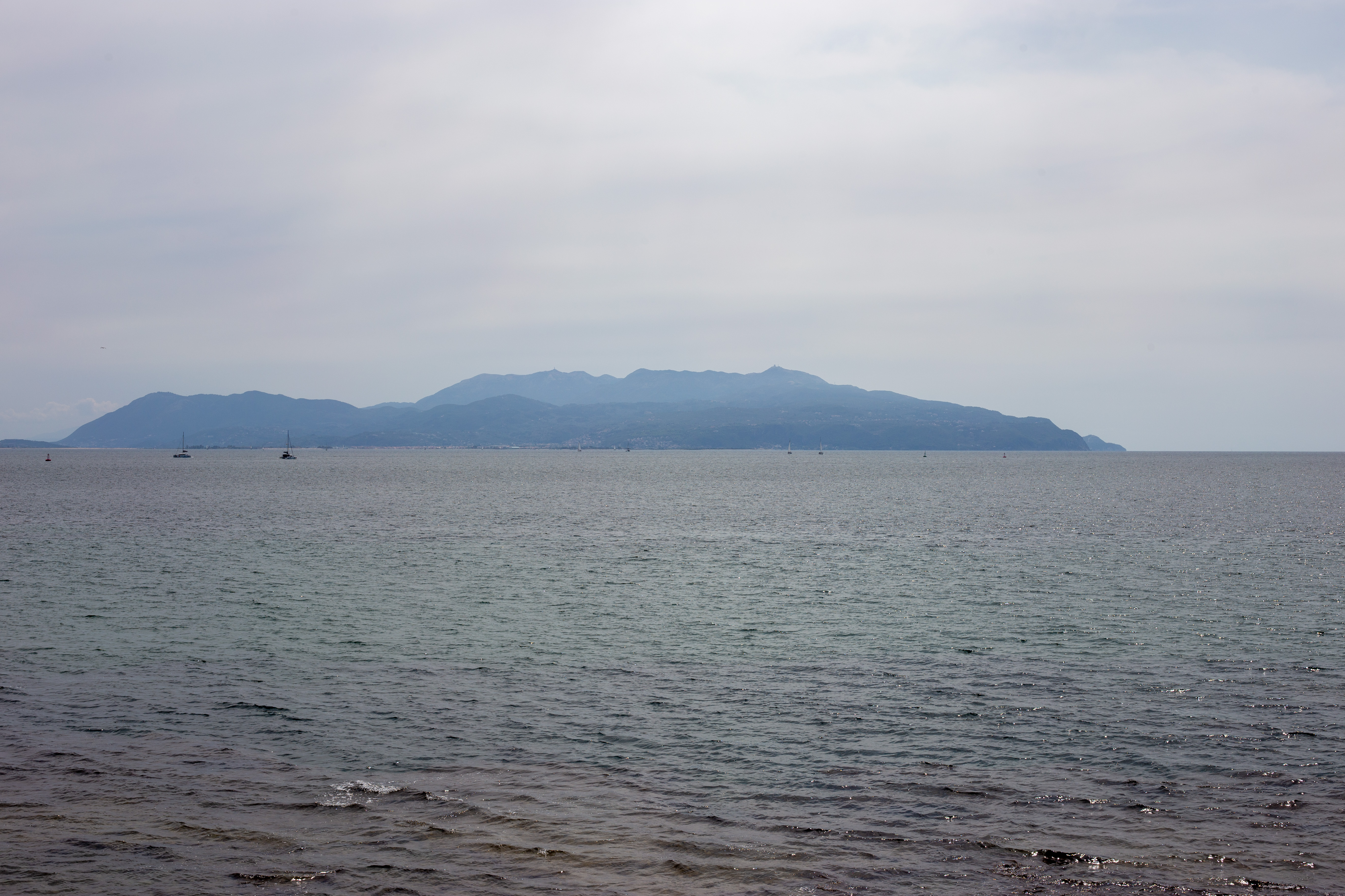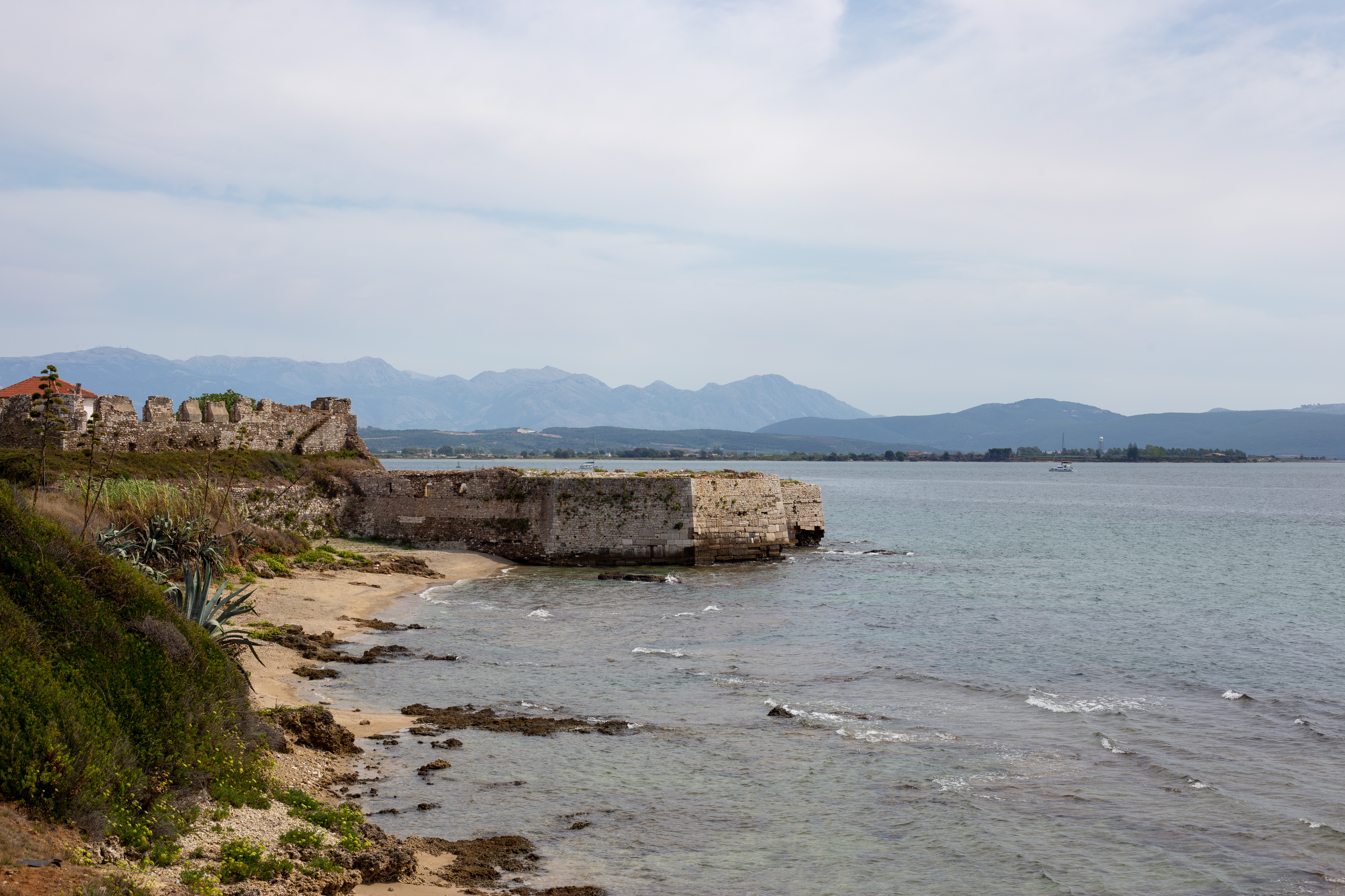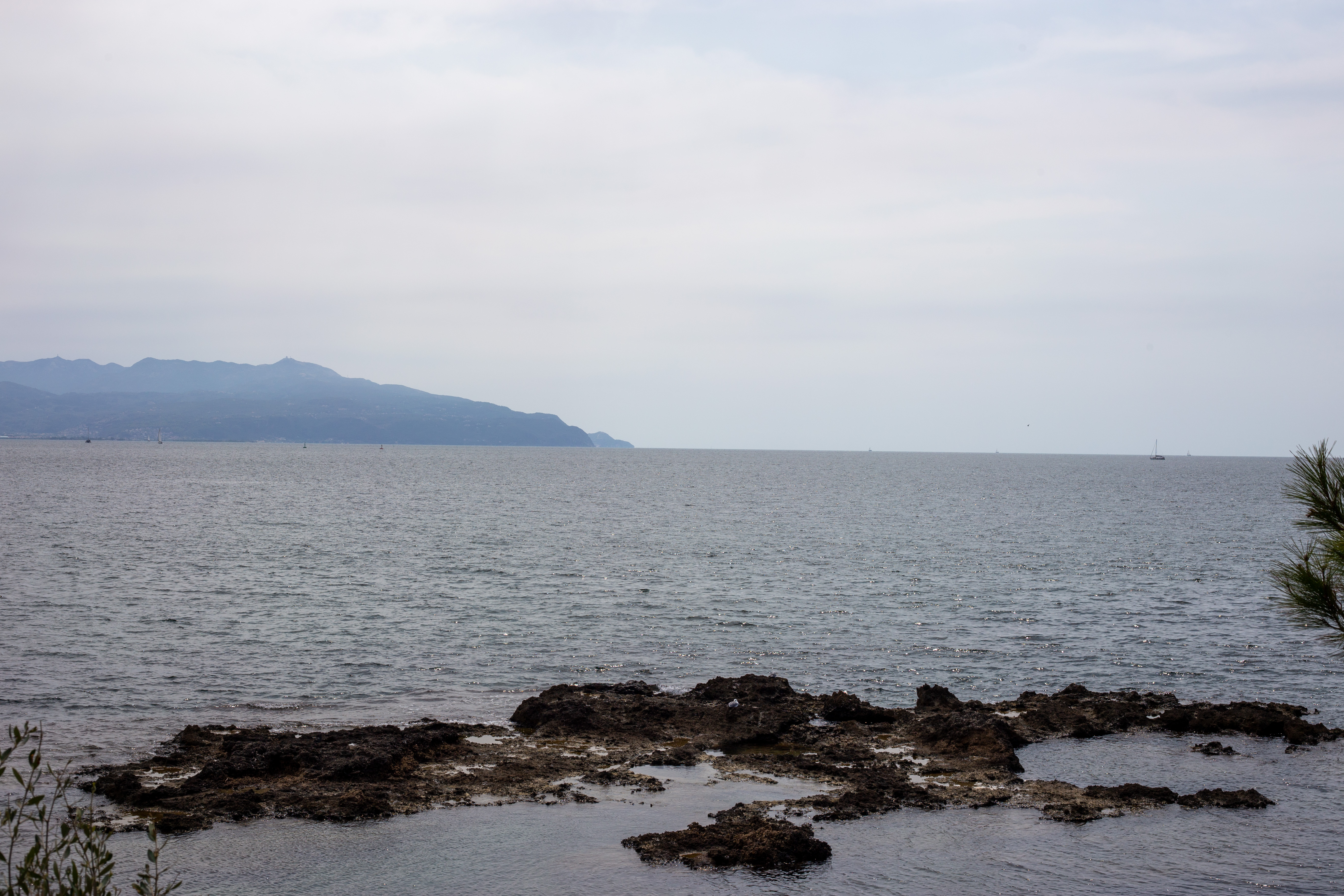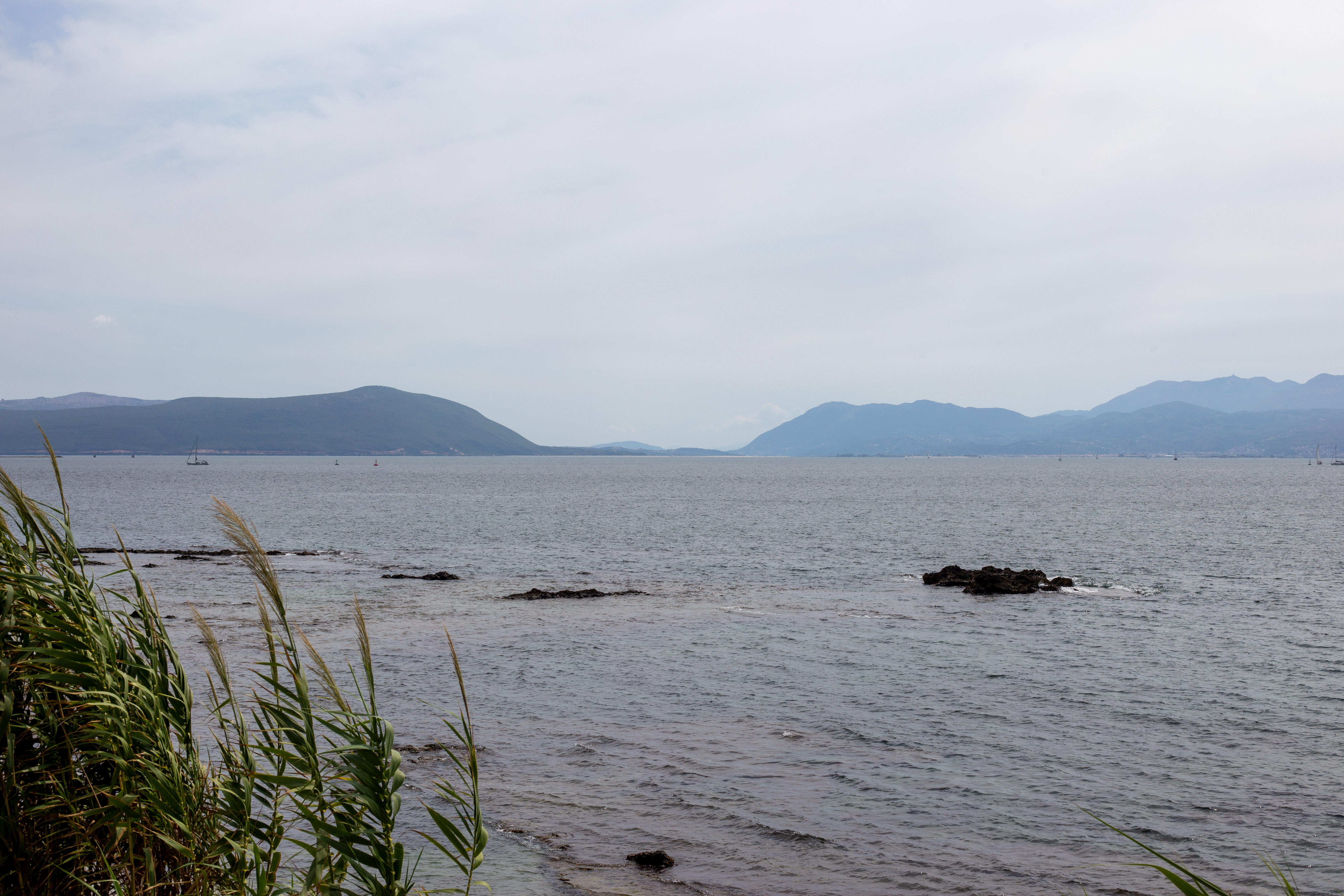 A serene coastal landscape is captured, with a calm body of water reflecting the overcast sky. The water is dark blue, and the mountains in the distance are covered in a light green hue. The foreground features tall green plants and rocks, adding a touch of ruggedness to the scene. The perspective is from a high vantage point, looking towards the horizon, emphasizing the vastness of the landscape. The sky is a light blue, and the overall mood is tranquil and peaceful.