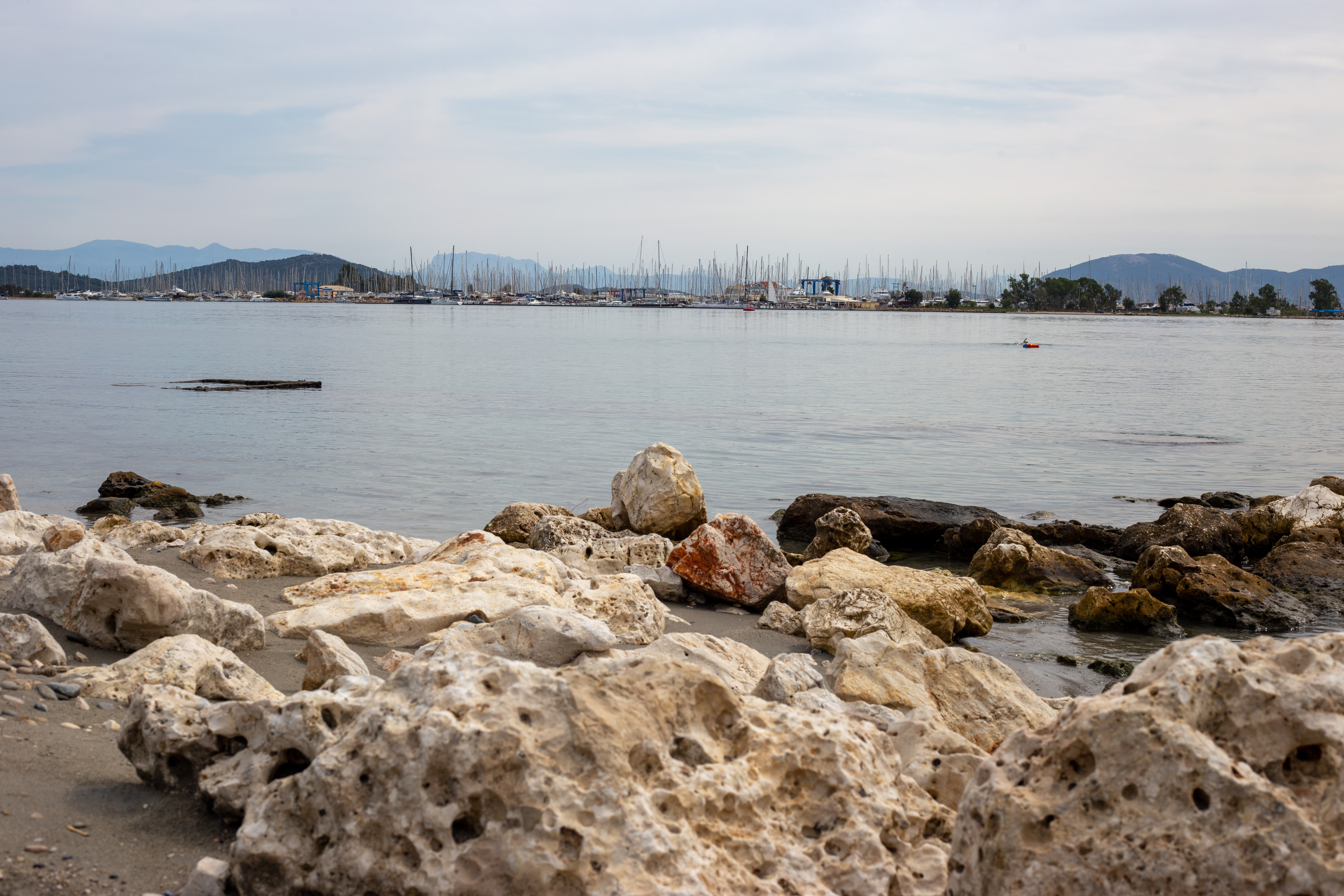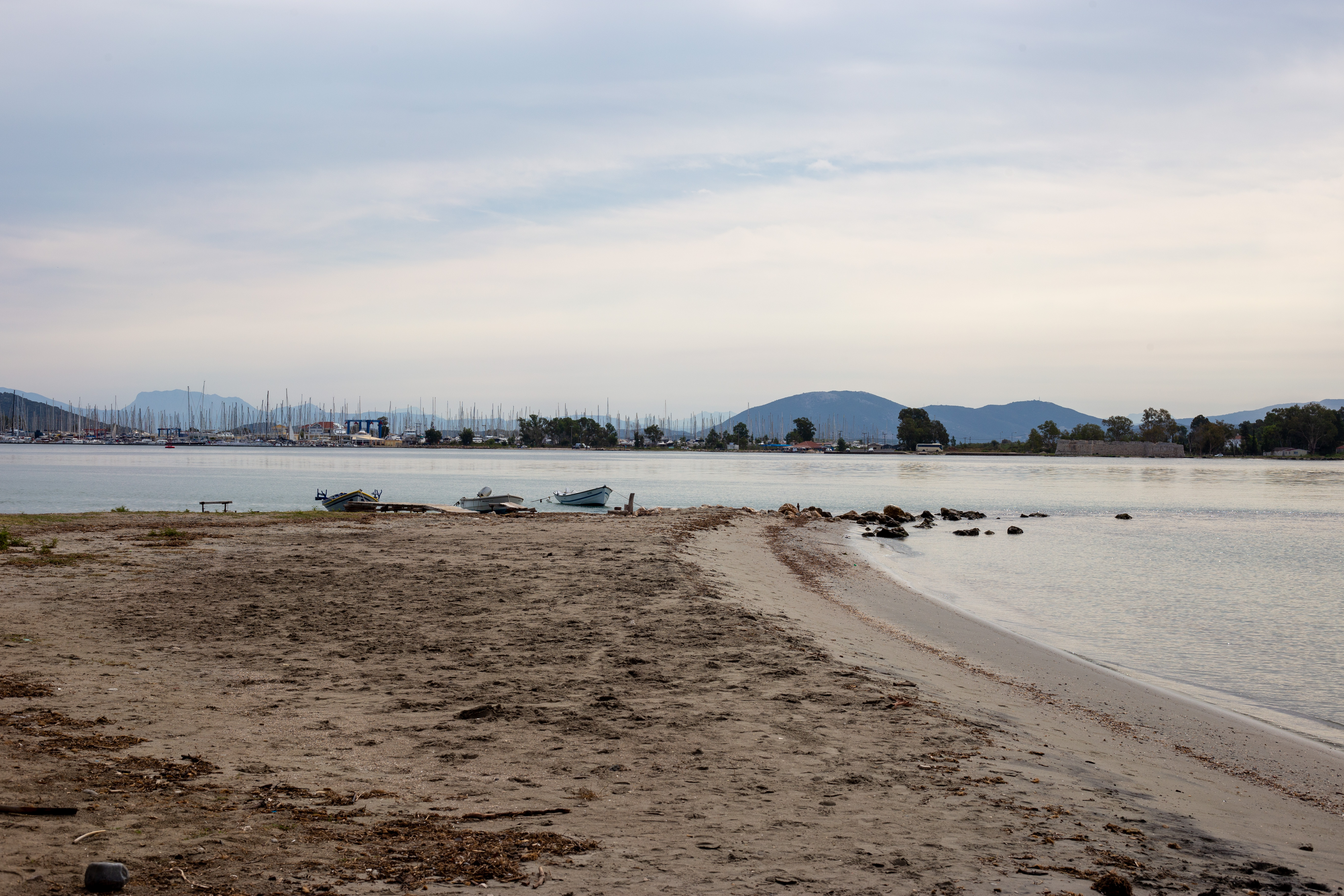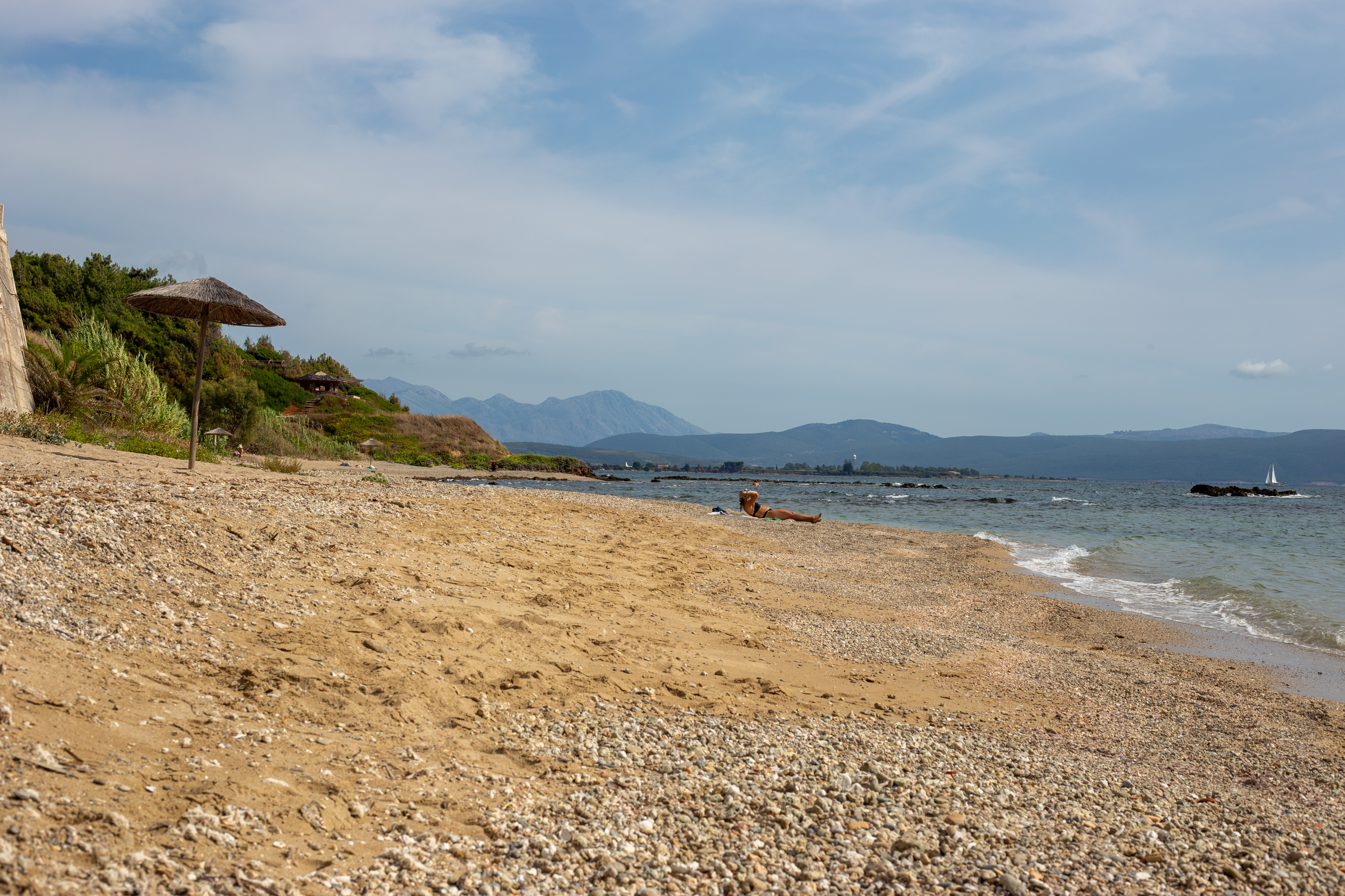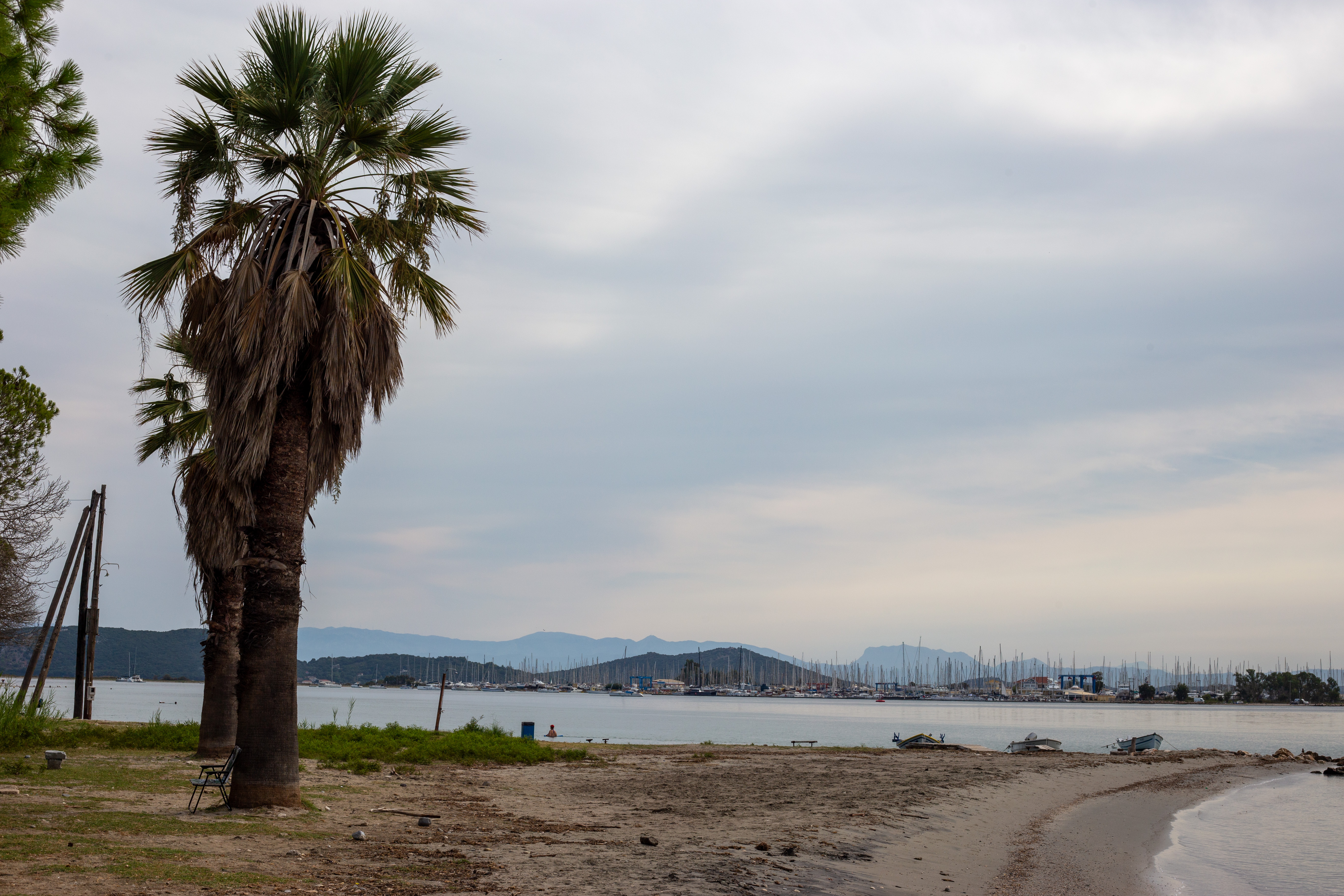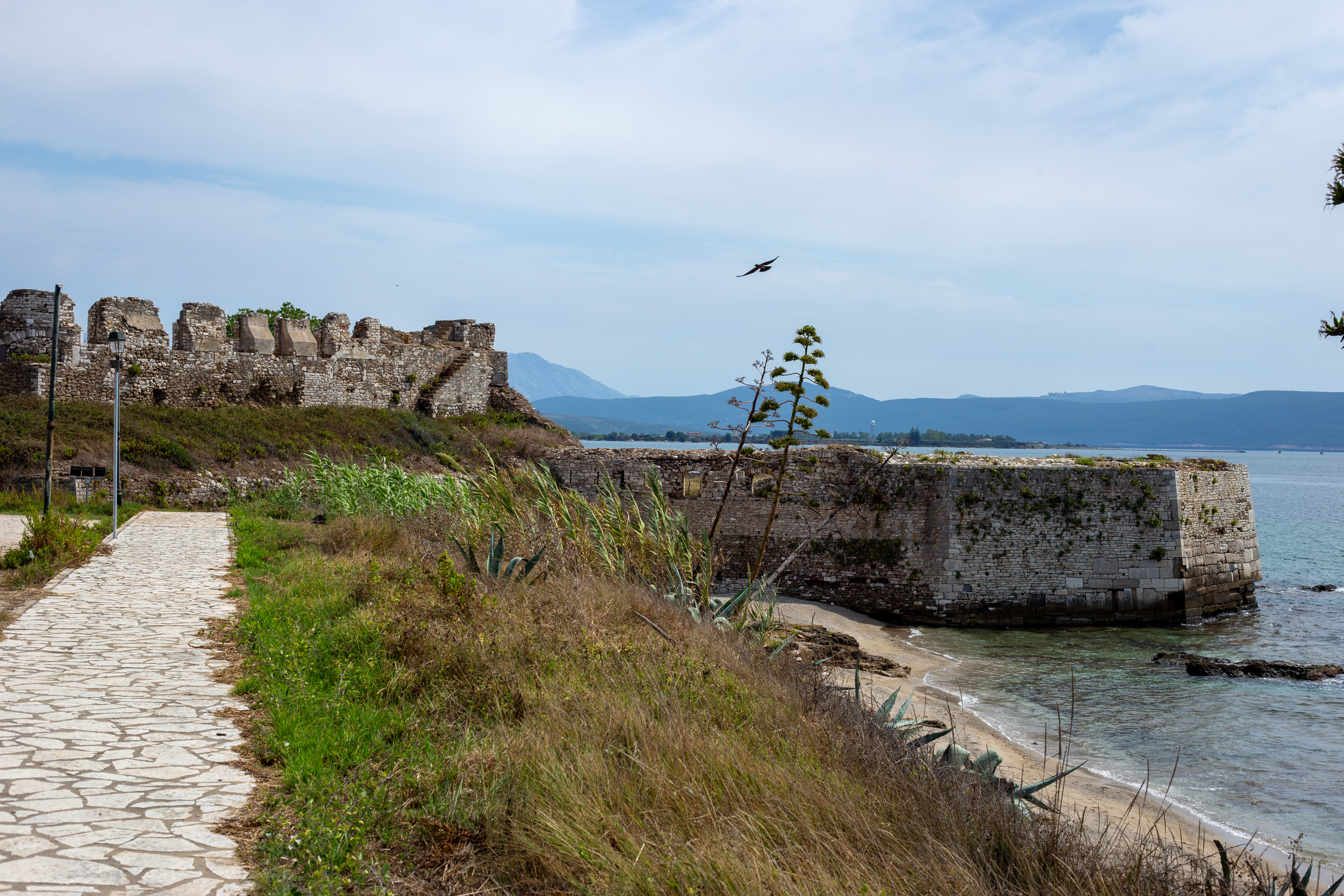 A serene coastal landscape is captured, with a calm body of water reflecting the overcast sky. The water is dark blue, and the mountains in the distance are covered in a light green hue. The foreground features tall green plants and rocks, adding a touch of ruggedness to the scene. The perspective is from a high vantage point, looking towards the horizon, emphasizing the vastness of the landscape. The sky is a light blue, and the overall mood is tranquil and peaceful.