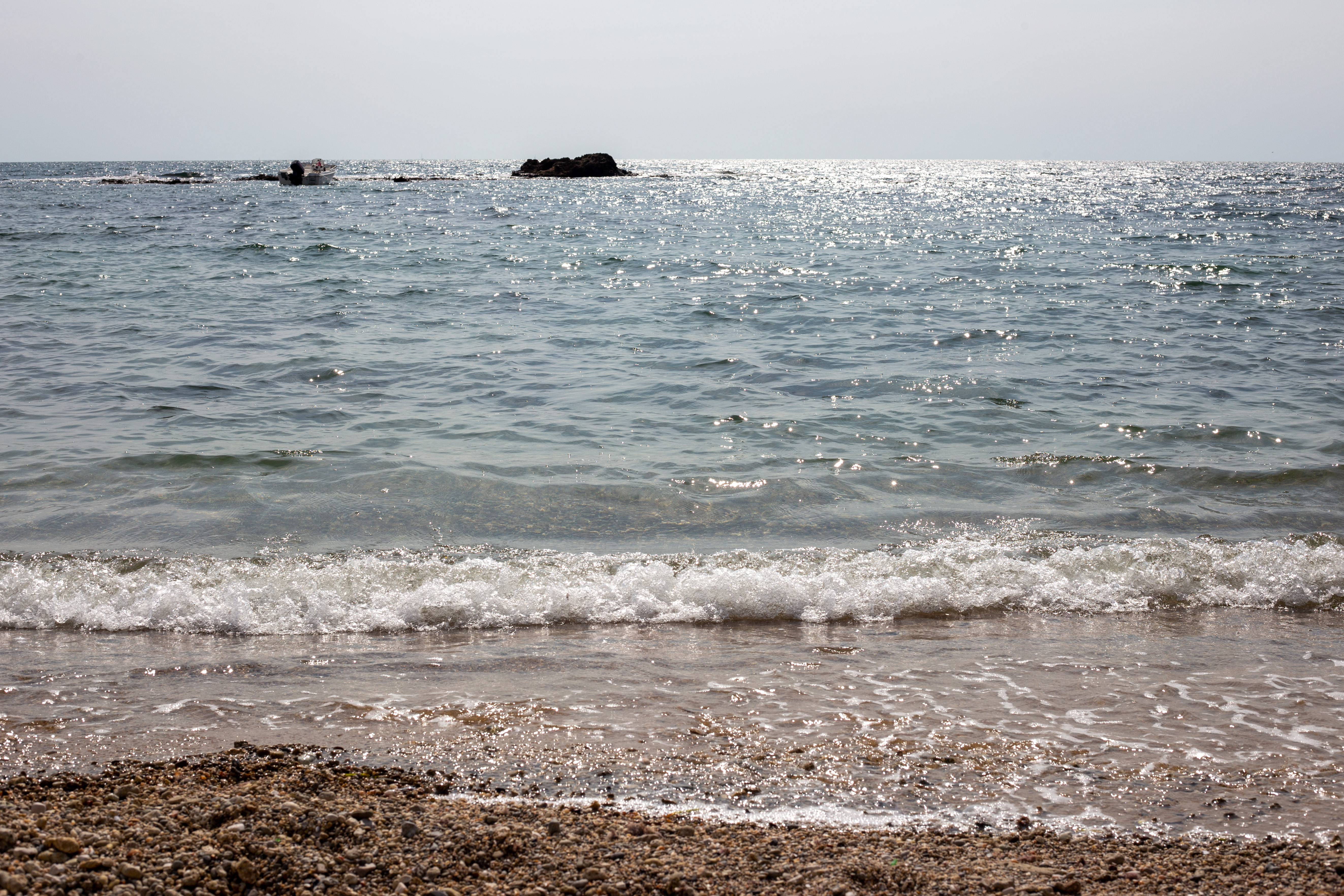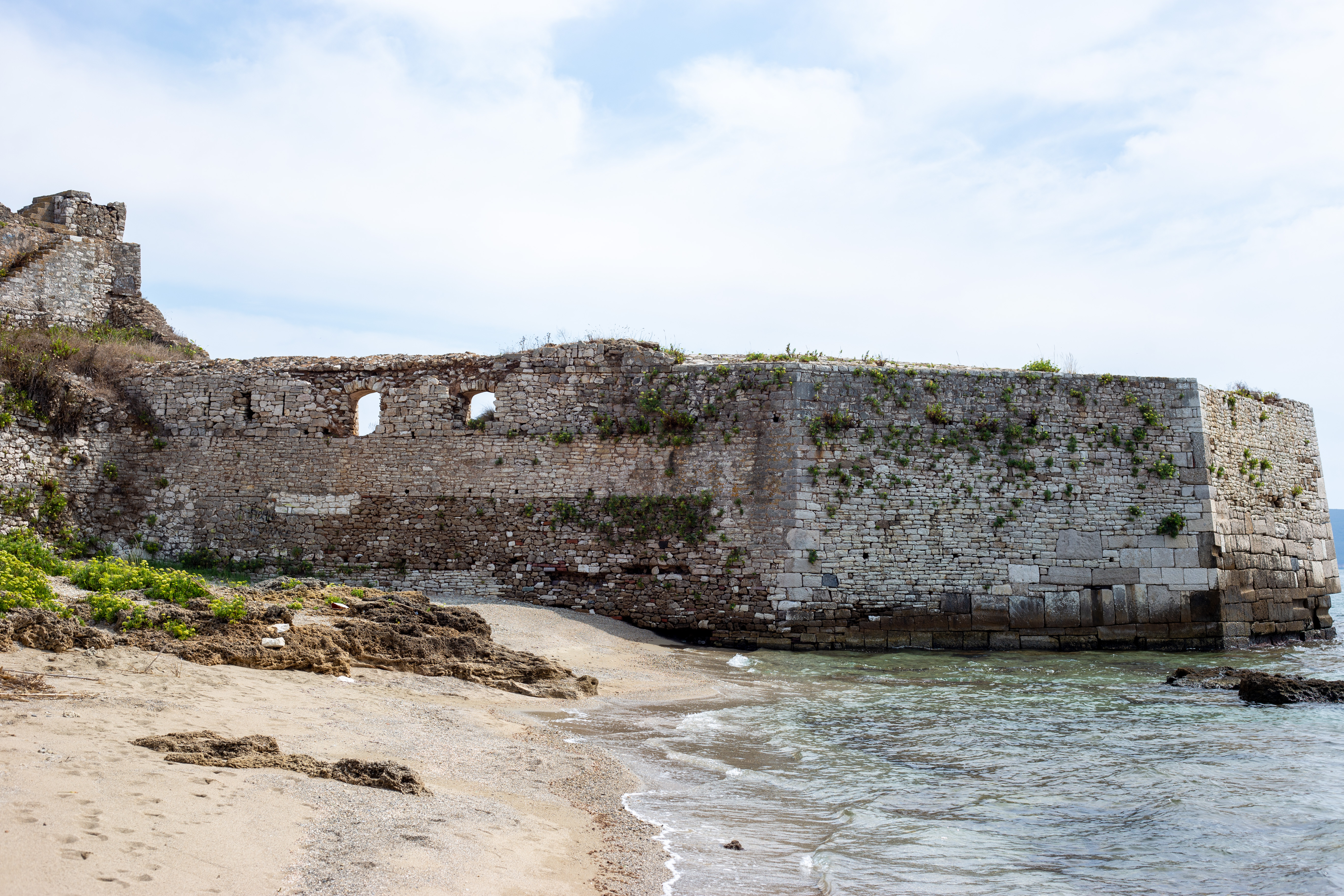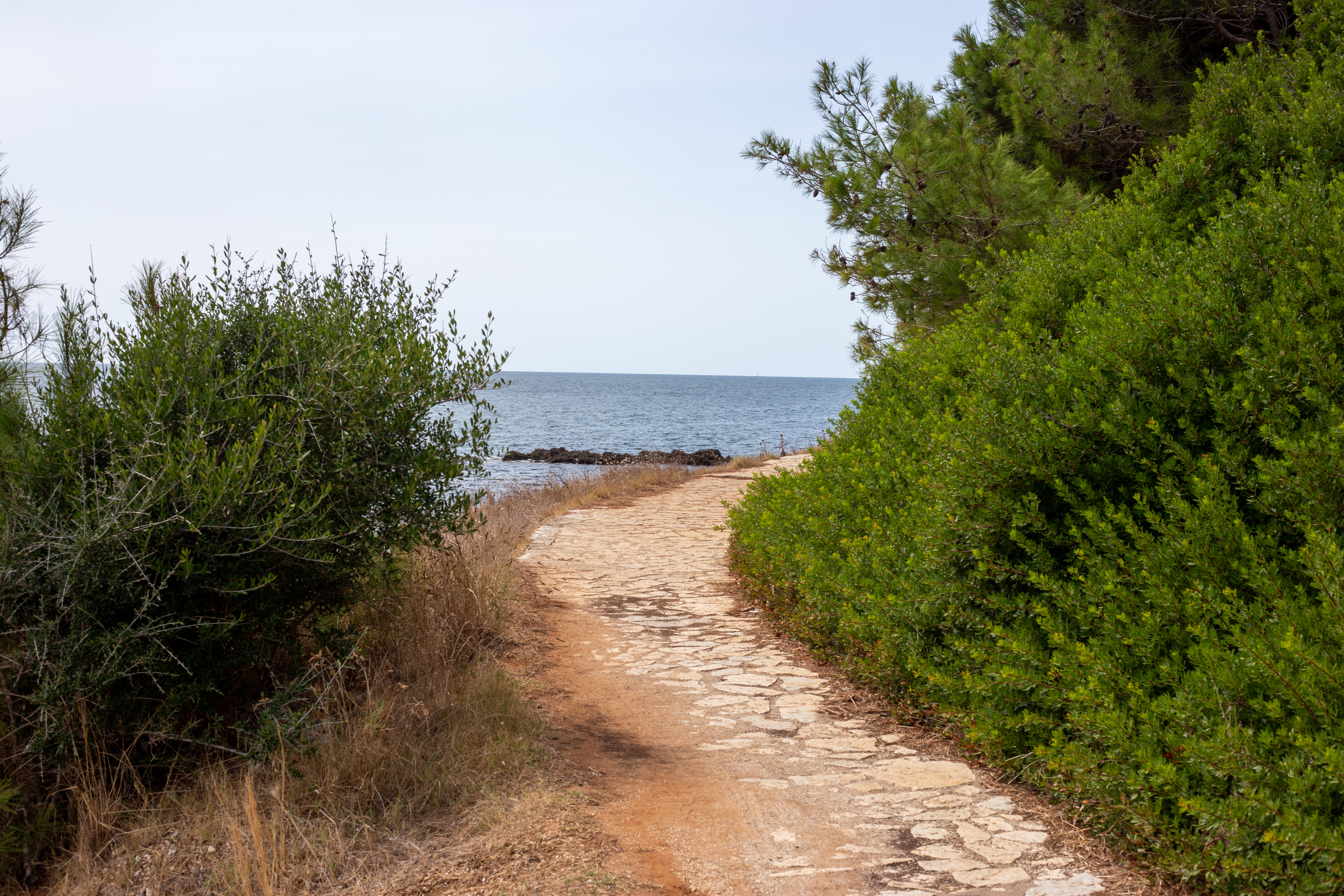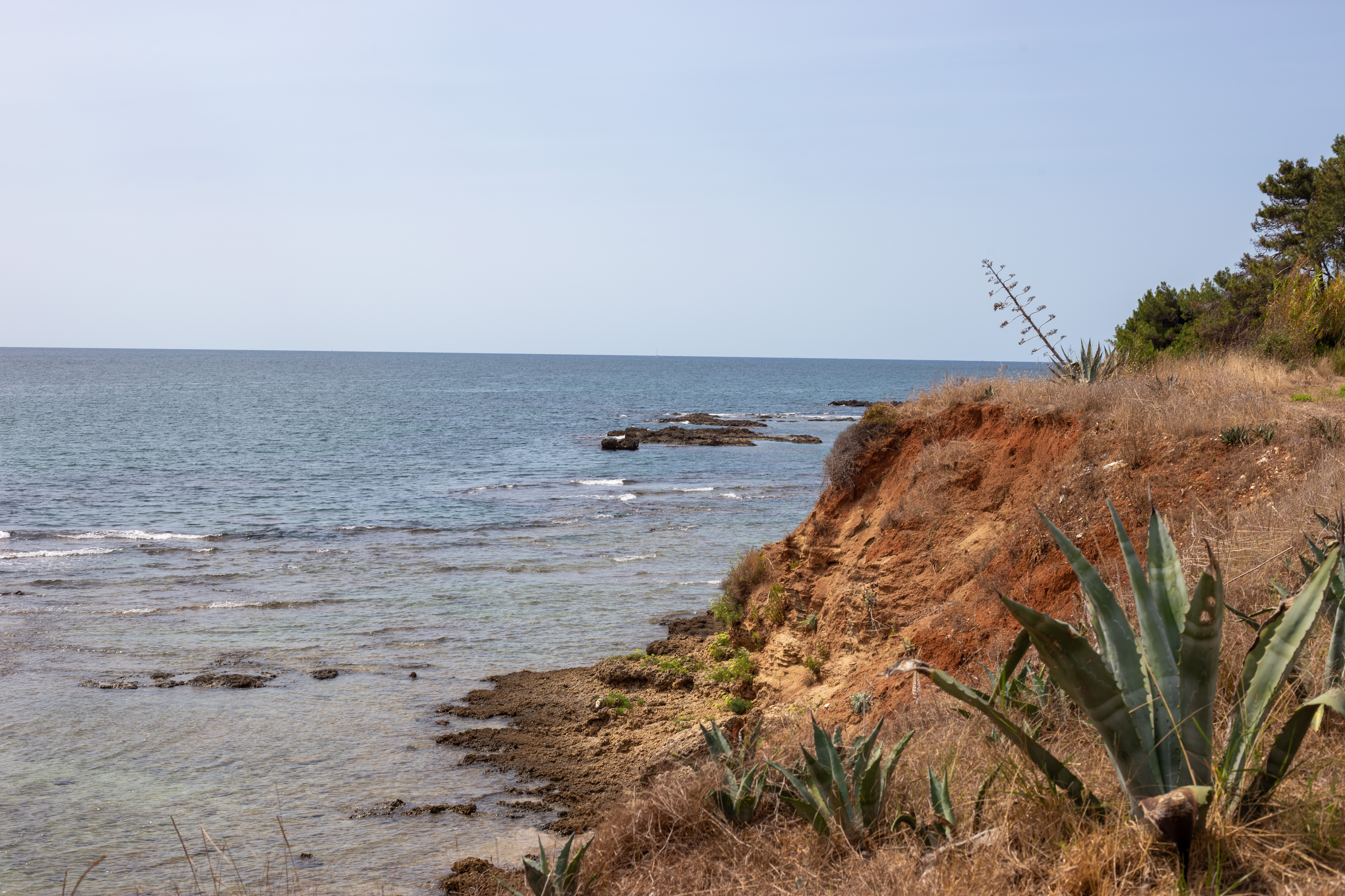 A serene coastal landscape is captured, with a calm body of water reflecting the overcast sky. The water is dark blue, and the mountains in the distance are covered in a light green hue. The foreground features tall green plants and rocks, adding a touch of ruggedness to the scene. The perspective is from a high vantage point, looking towards the horizon, emphasizing the vastness of the landscape. The sky is a light blue, and the overall mood is tranquil and peaceful.