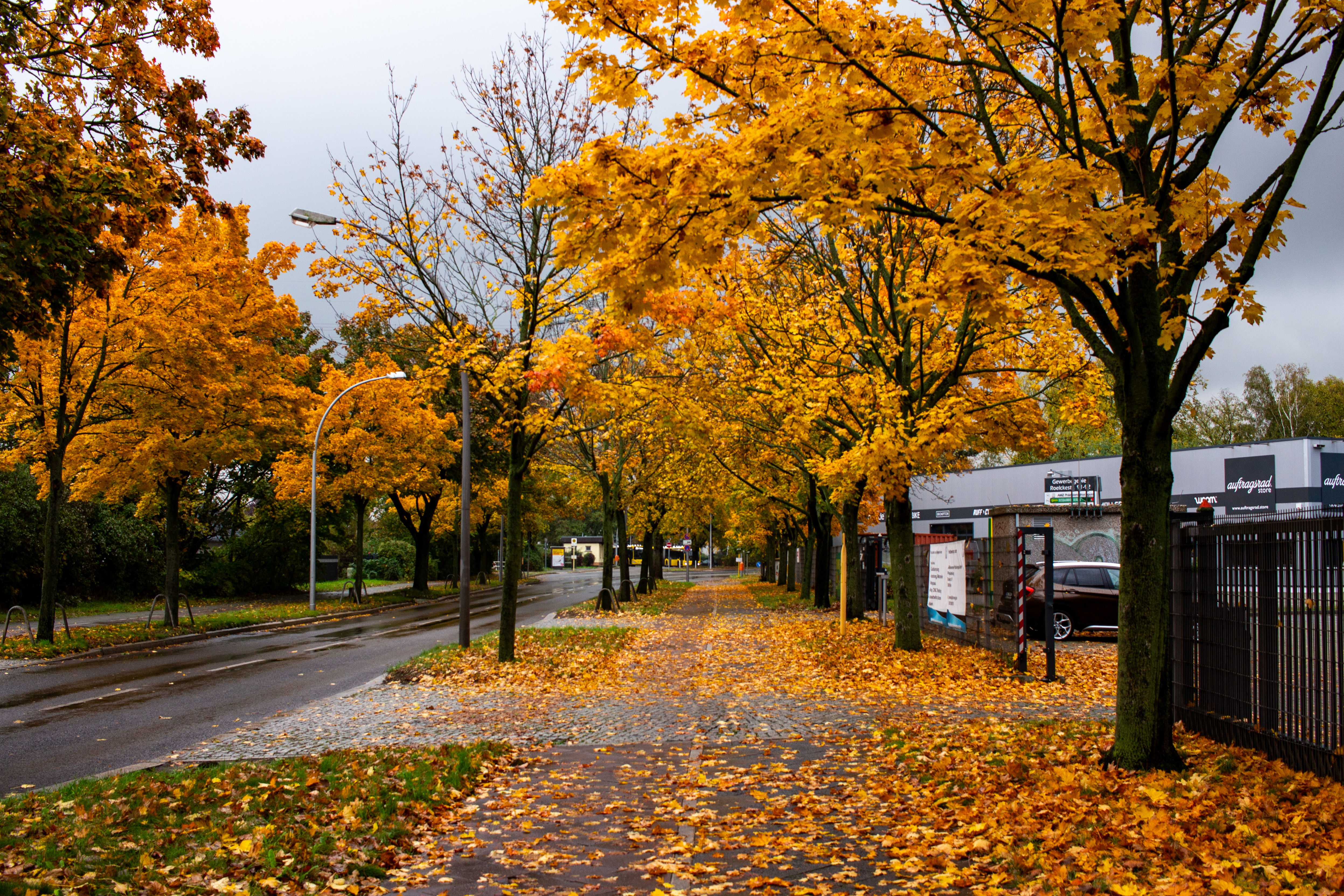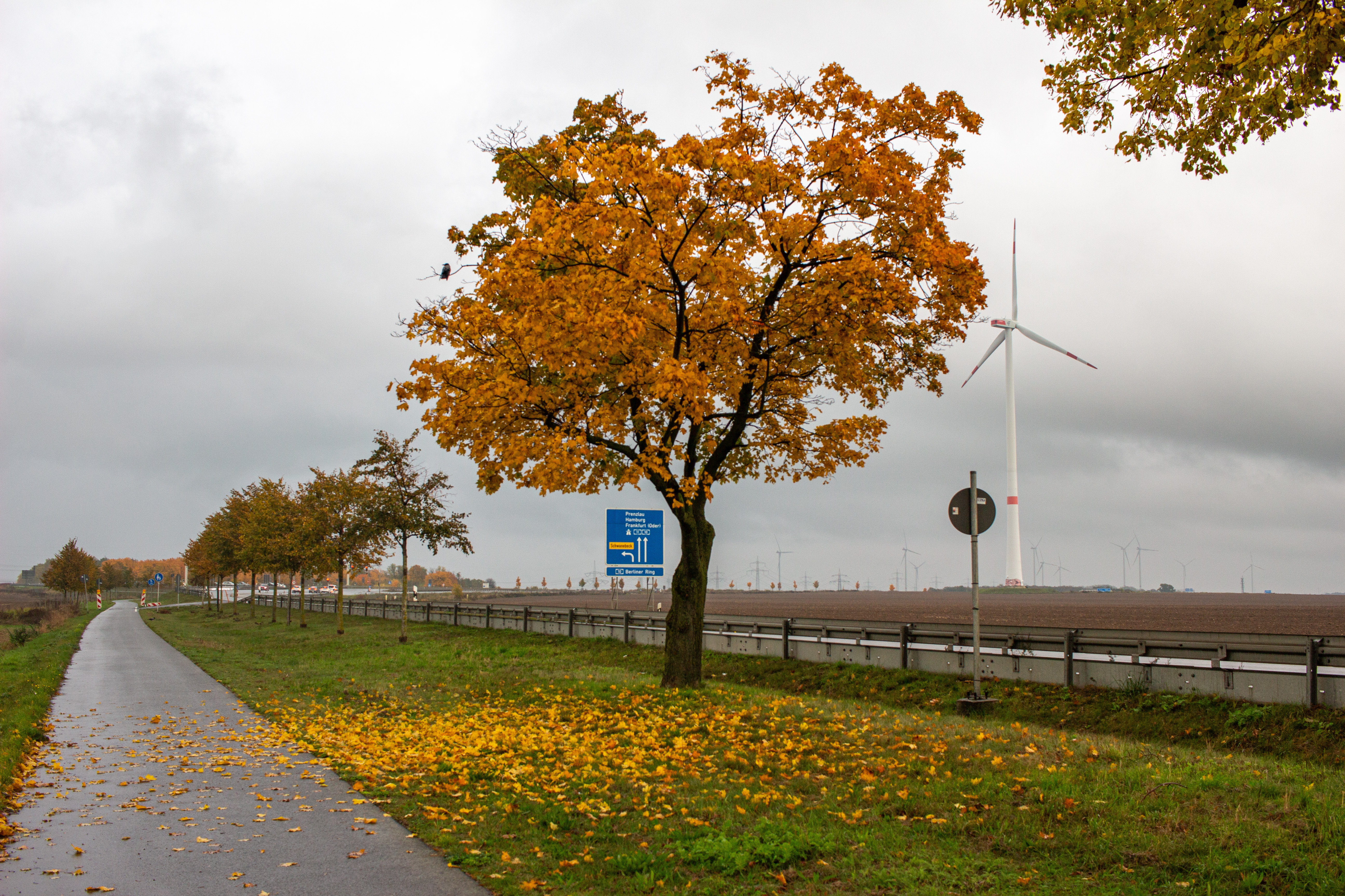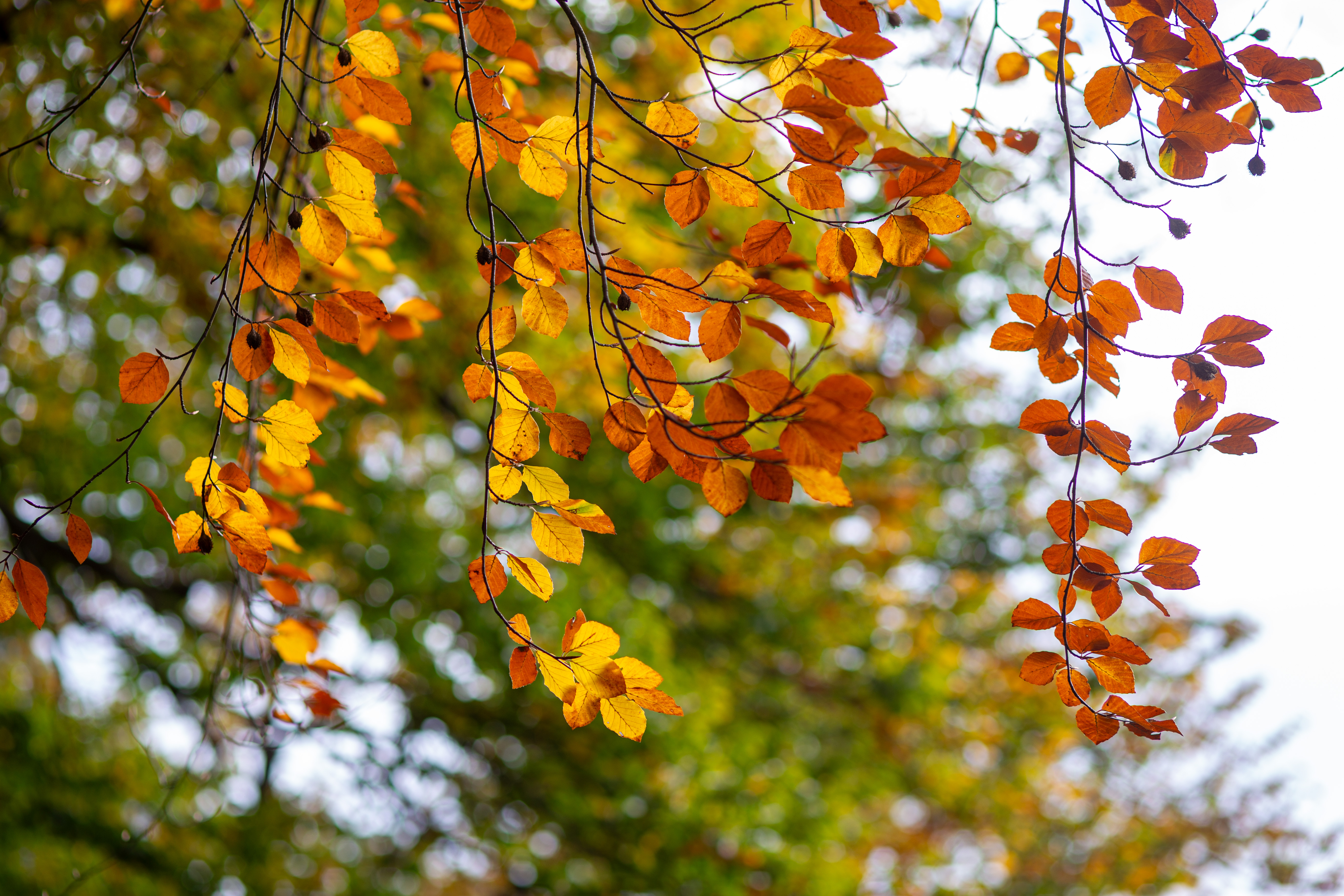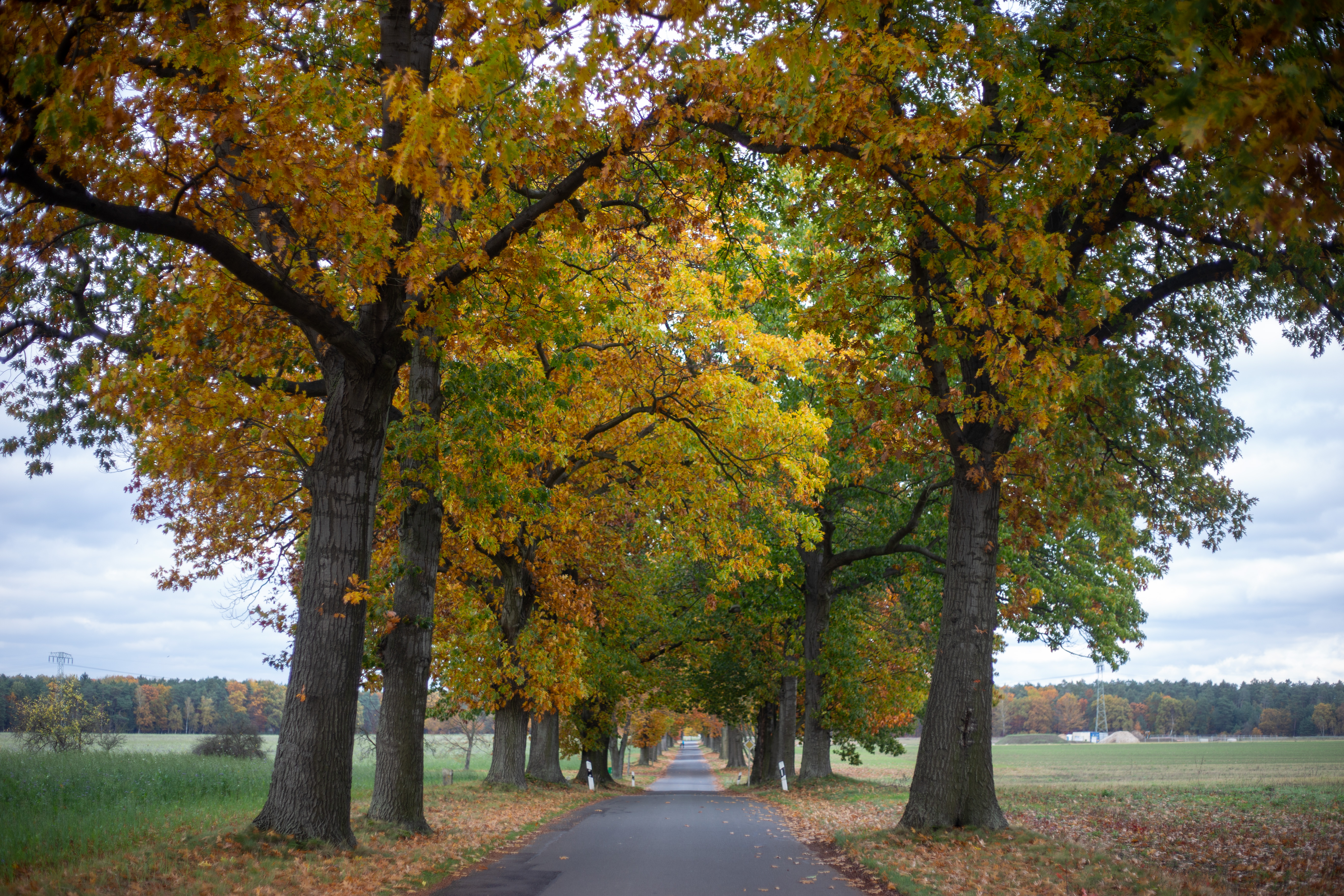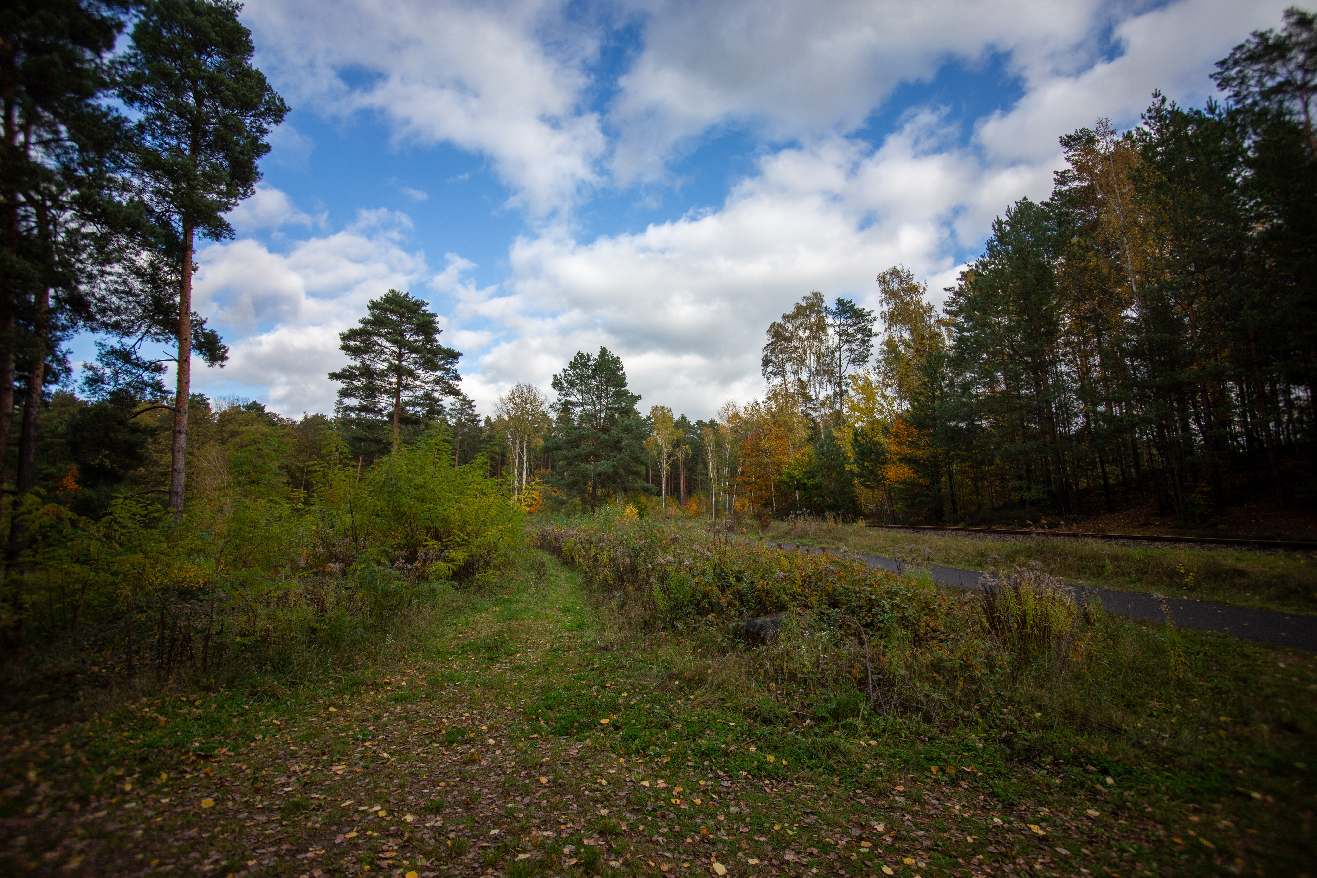 A serene autumn forest scene is captured, with a winding road meandering through the landscape. The road, a black asphalt, contrasts with the vibrant green of the trees. The trees, with their varying heights and colors, create a dynamic and layered visual. The sky above is a clear blue with white clouds, adding depth to the scene. The image is taken from a low angle, emphasizing the grandeur of the trees and the winding road. The colors are predominantly green, blue, and brown, creating a harmonious and tranquil atmosphere. The landmark identifier "sa_15007" does not provide additional information about the location of this forest.