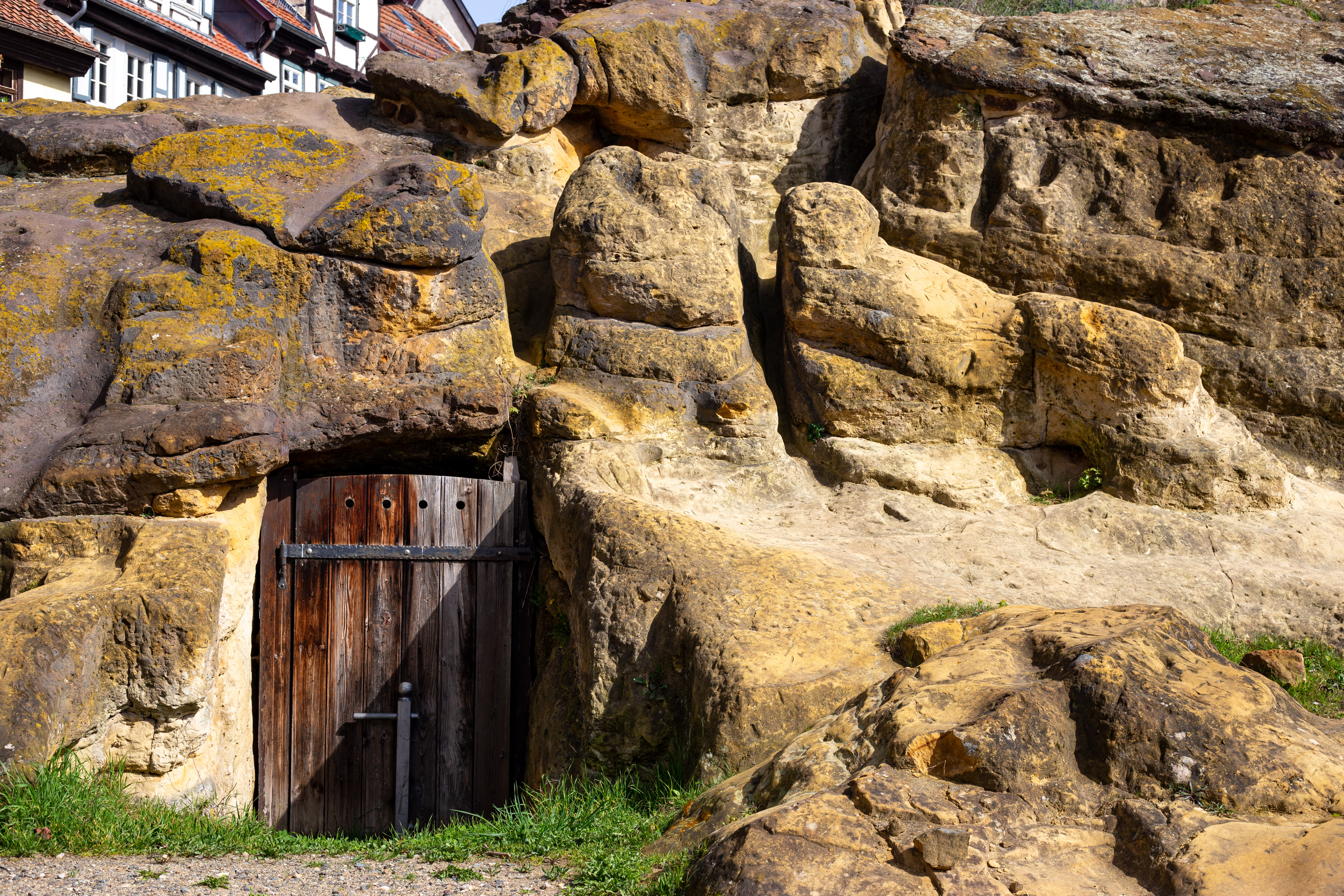 The image showcases the entrance of the Church of St. Martin in Gelsenburg, Germany, featuring a Gothic architectural style. The entrance is adorned with a large, ornate stone archway, flanked by two statues of a man and a woman. Above the archway, a plaque with German text is inscribed, and a lion and a bird are depicted on either side. The building's stone facade is weathered, adding to its historical charm. The perspective of the image is from below, looking up at the archway, emphasizing its grandeur. The landmark identifier "sa_1574" could be a reference to the specific location or event associated with this building.