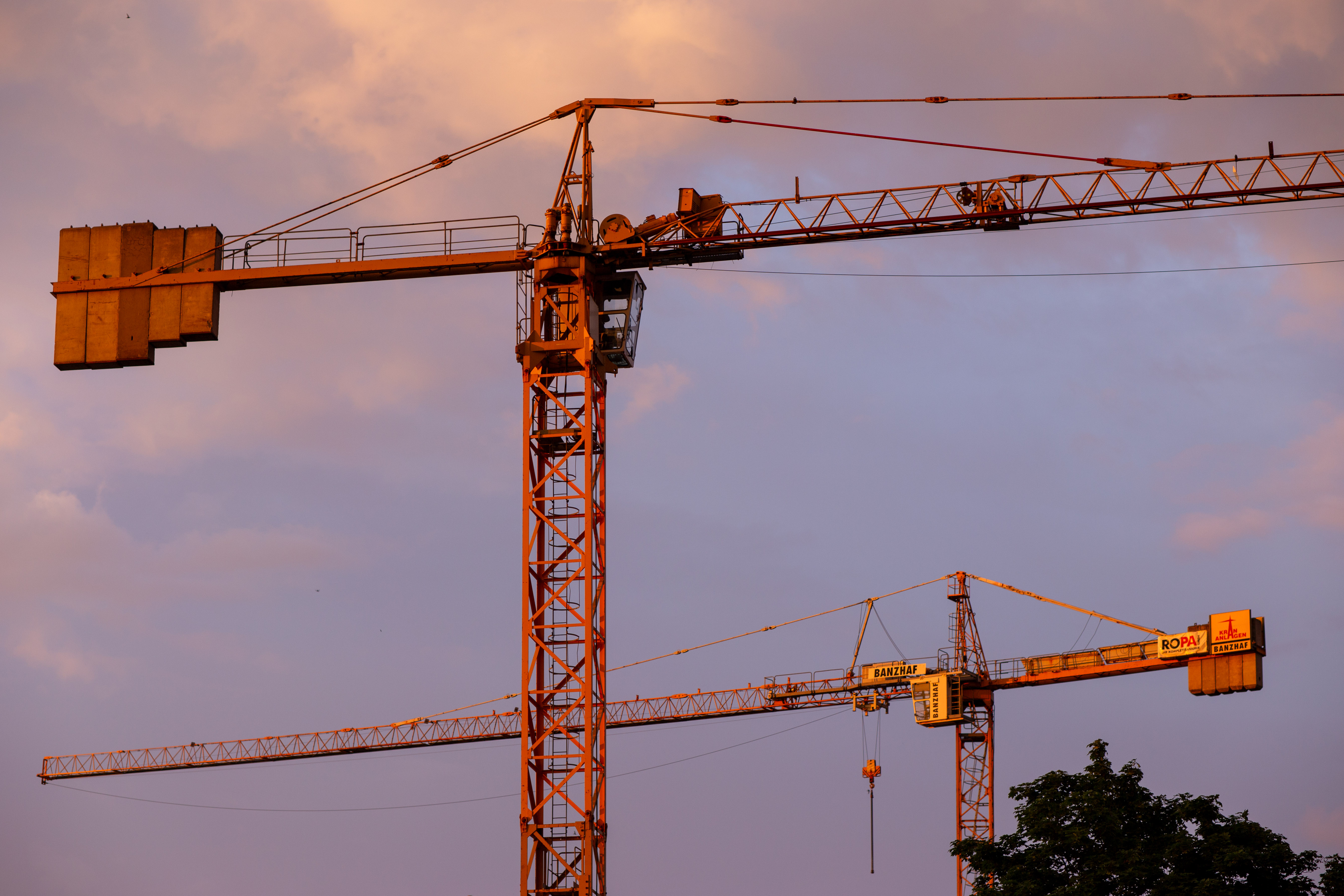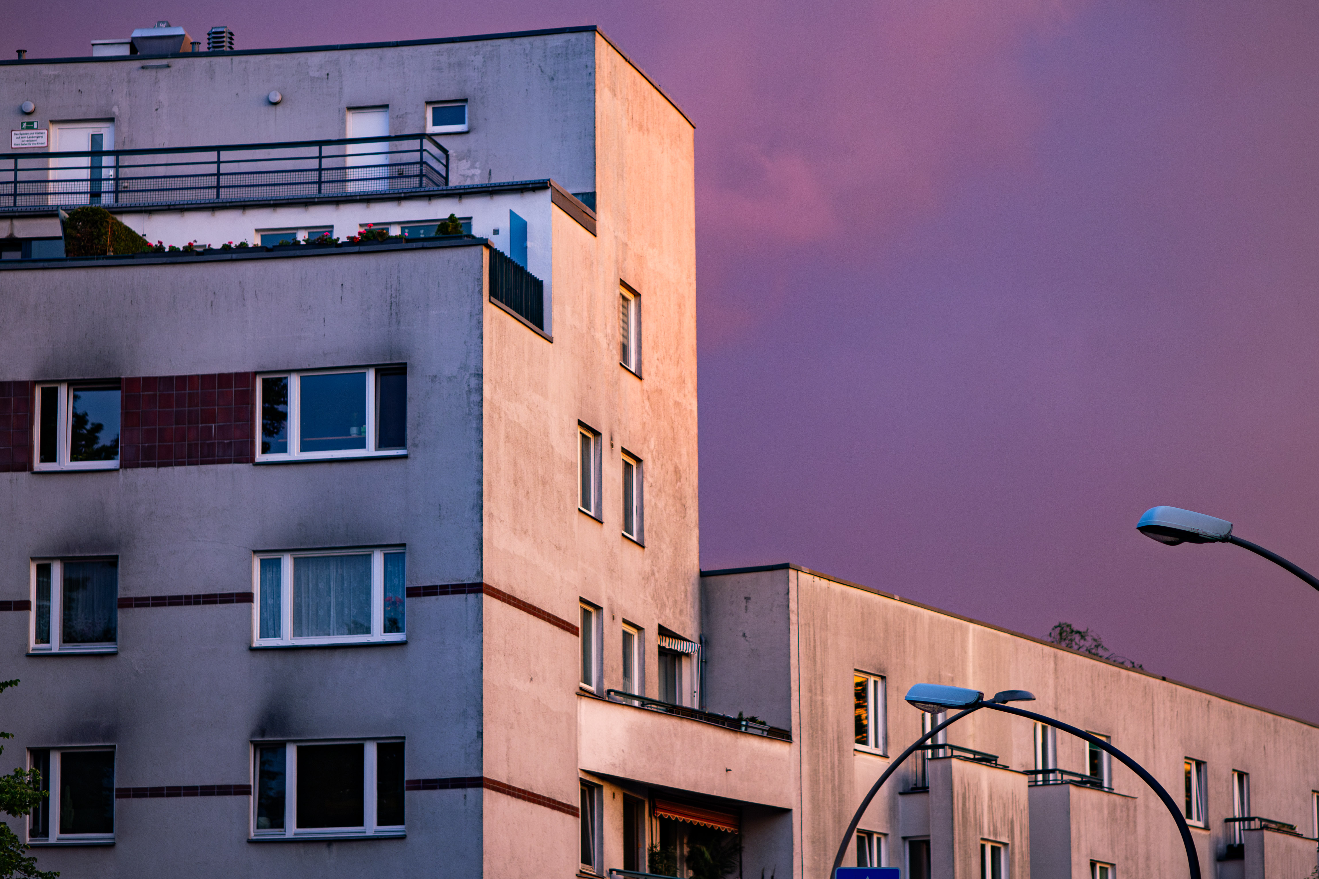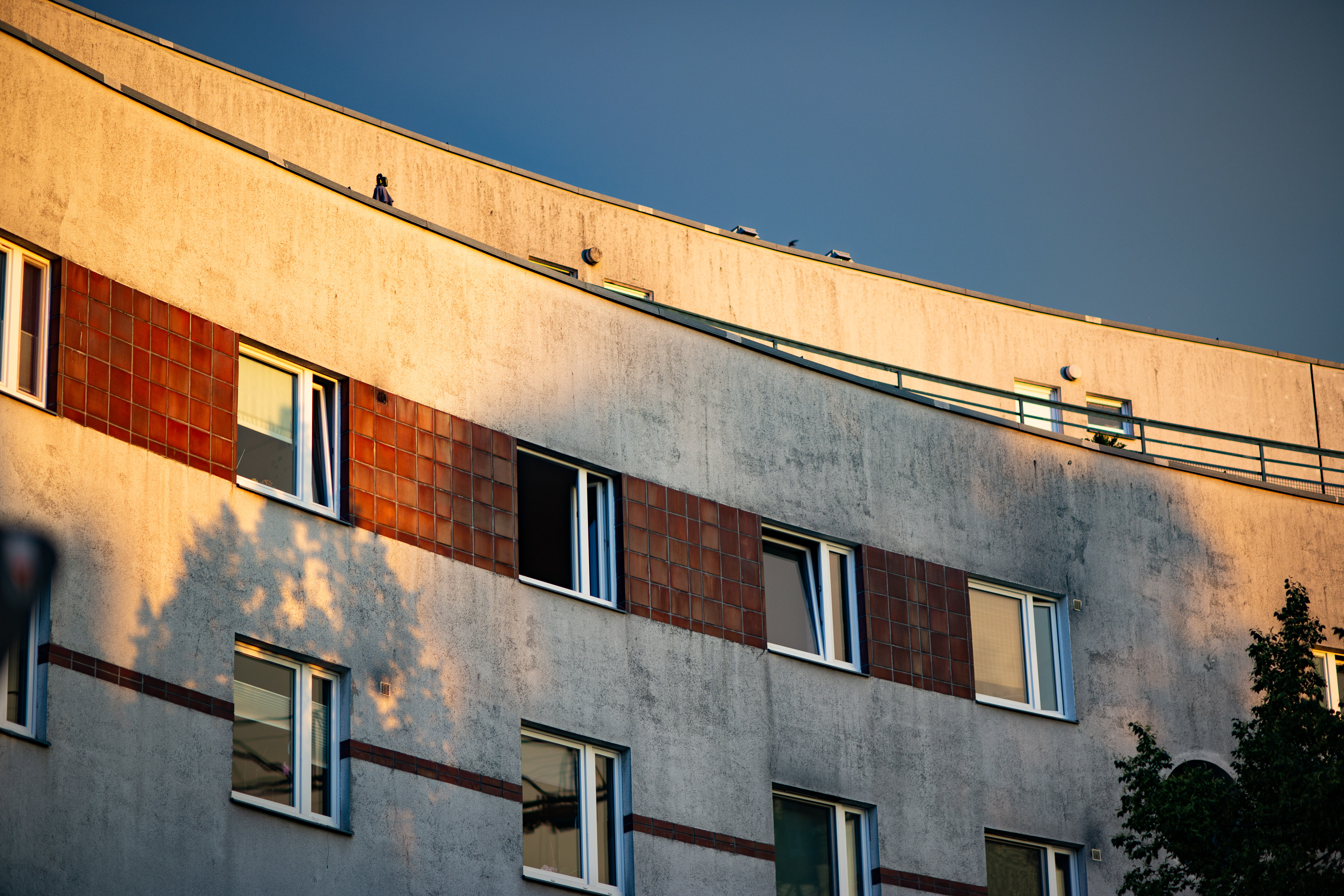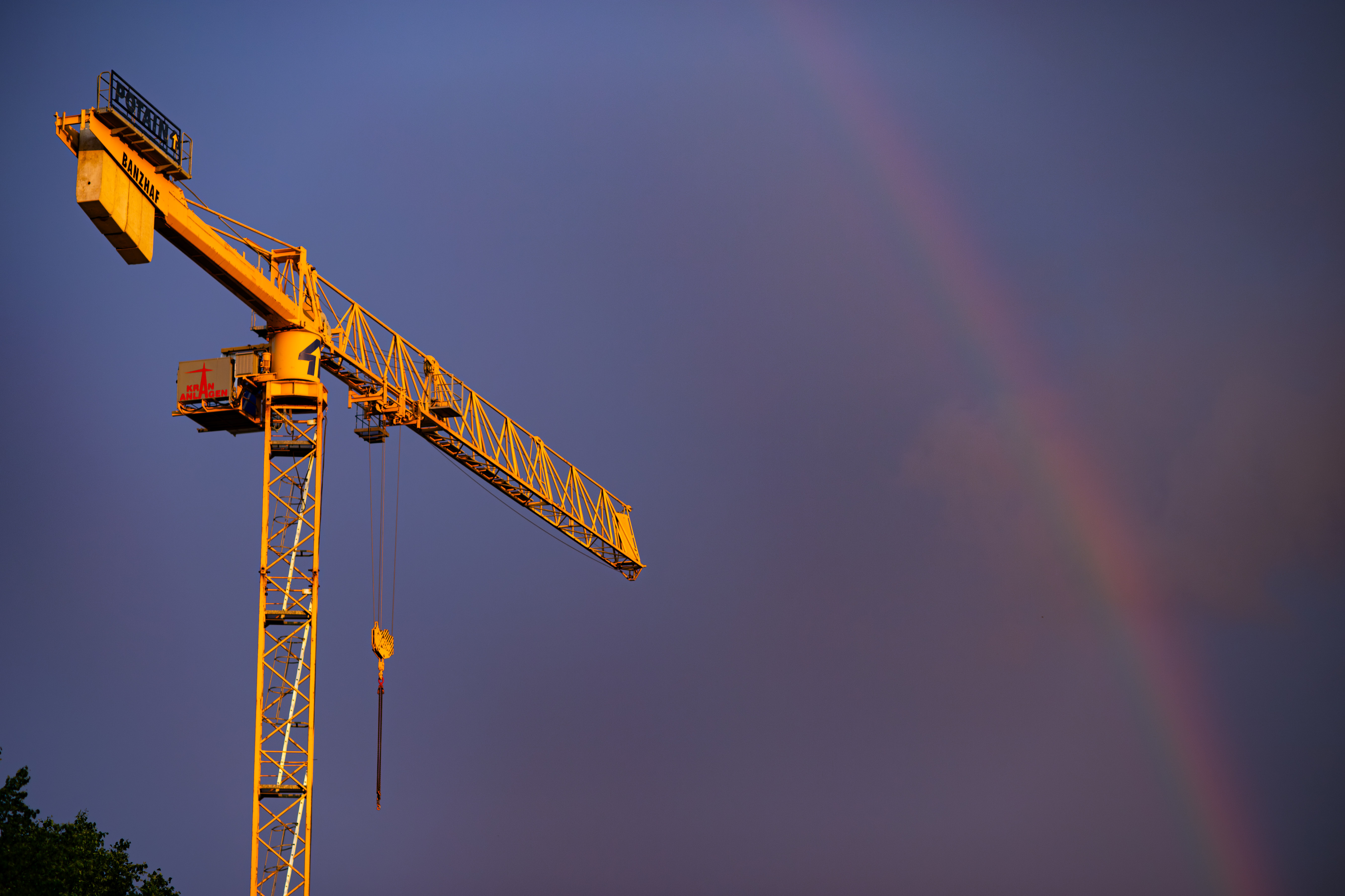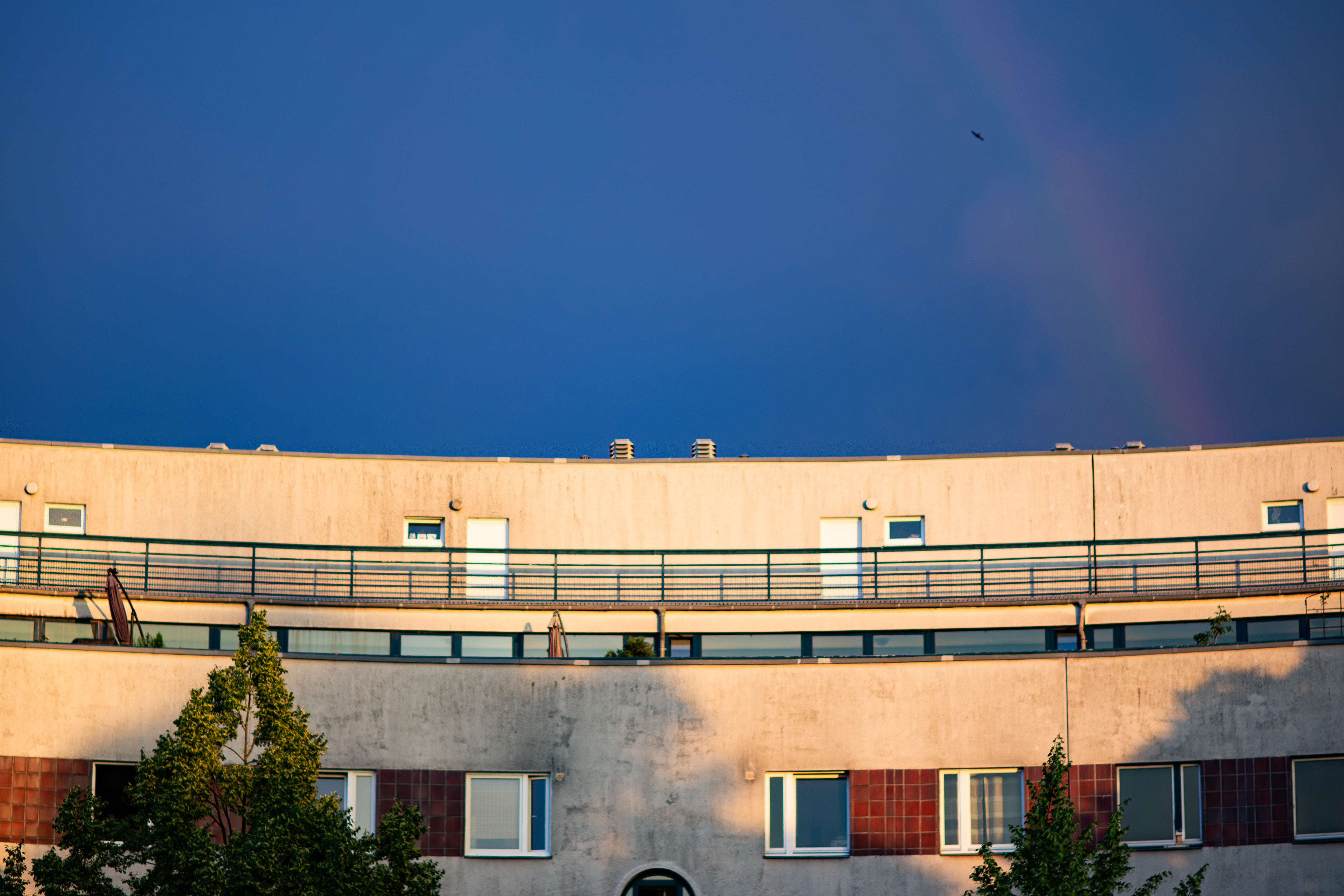 A curved, beige building with white trim and red trim is captured in a low-angle shot, emphasizing its grandeur. The building features multiple windows and balconies, and a green railing runs along its side. The sky is a clear blue with a rainbow arching over the building, adding a touch of magic to the scene. The building is surrounded by trees, creating a serene and tranquil atmosphere.