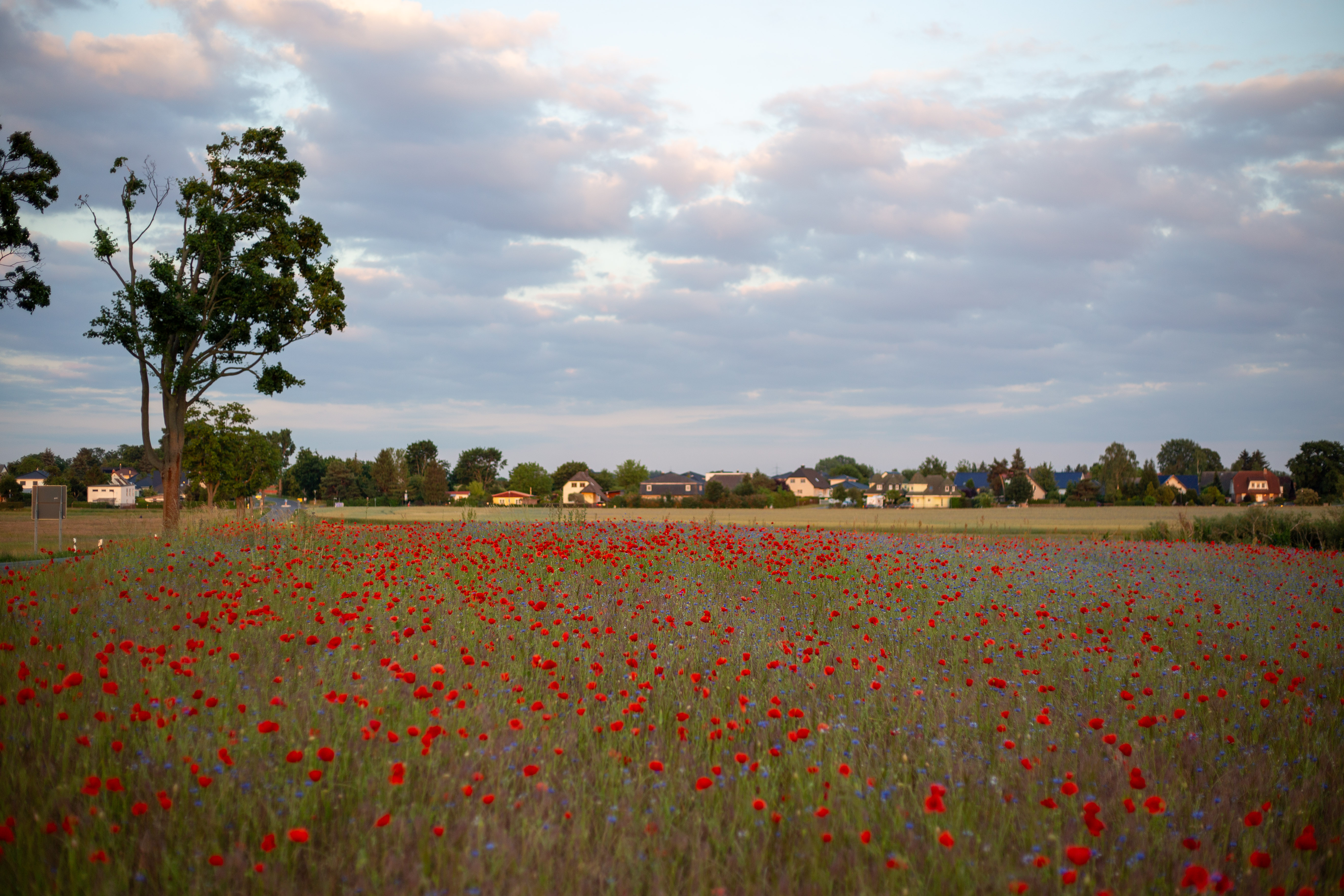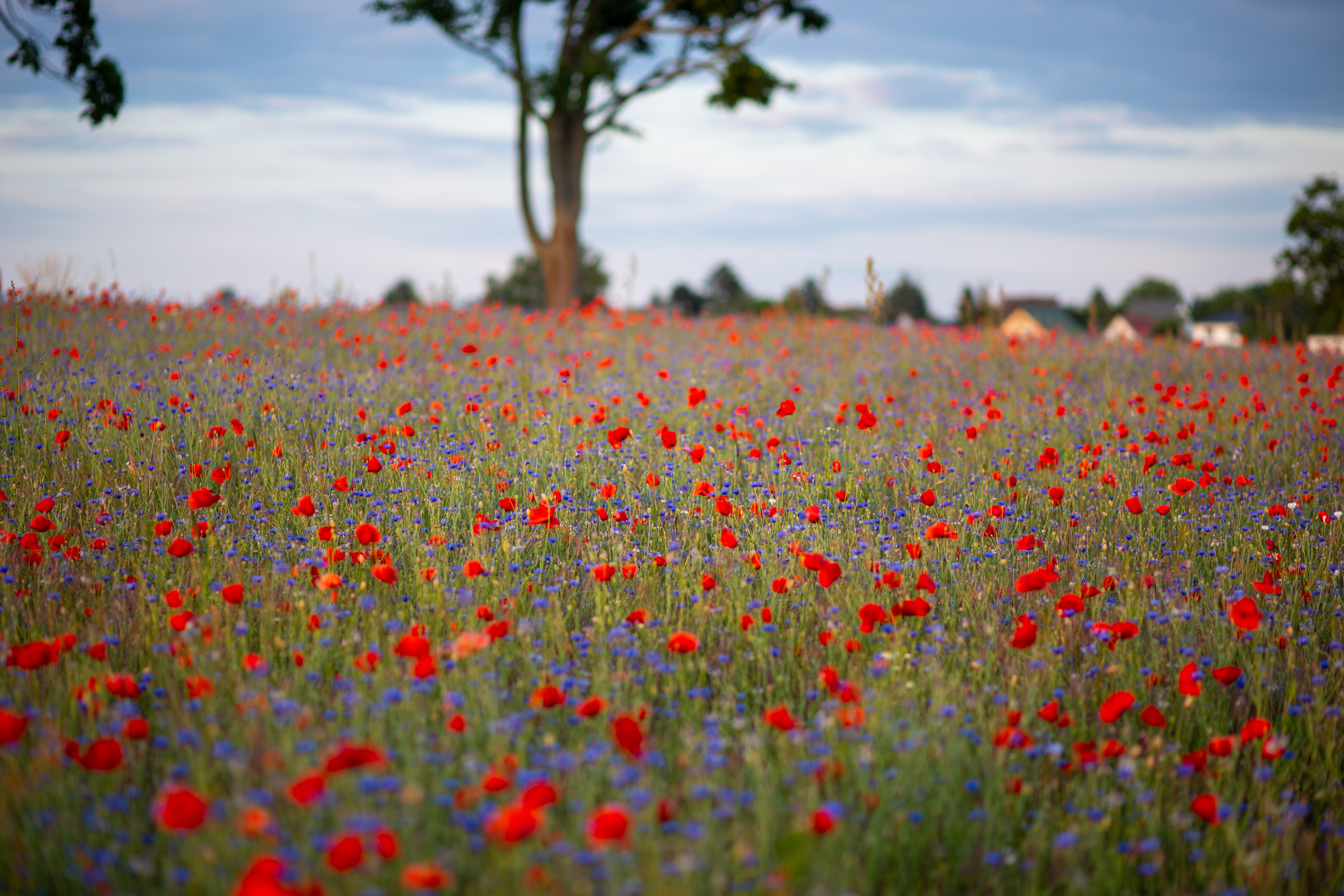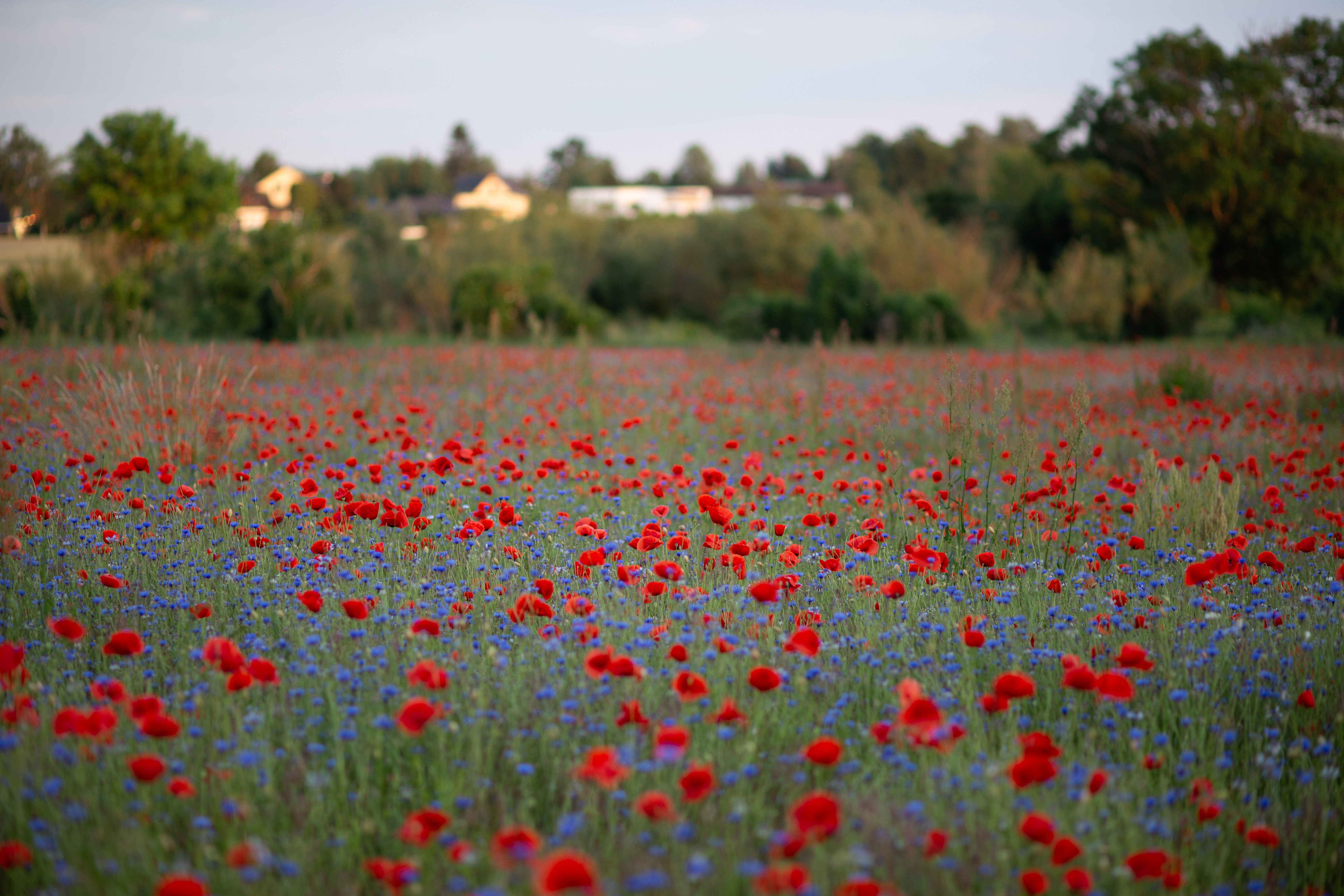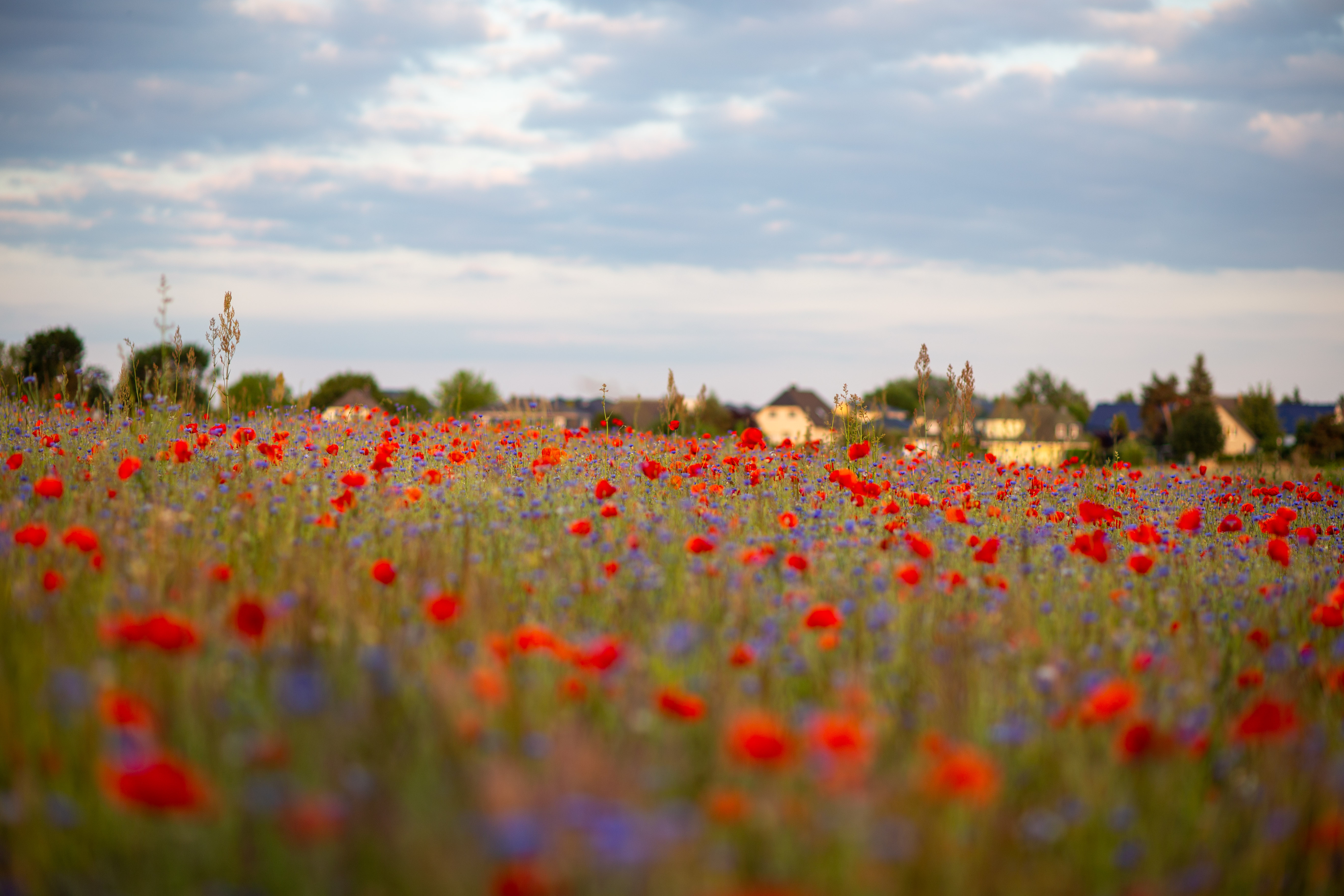 A serene countryside scene features a field of vibrant red poppies, contrasting with the blue sky and greenery. The poppies are scattered across the field, creating a sense of depth and scale. In the distance, houses and trees can be seen, adding a touch of human presence. The image is taken from a low angle, emphasizing the height of the poppies and the vastness of the field. The colors, objects, and perspective all contribute to a harmonious and tranquil composition.