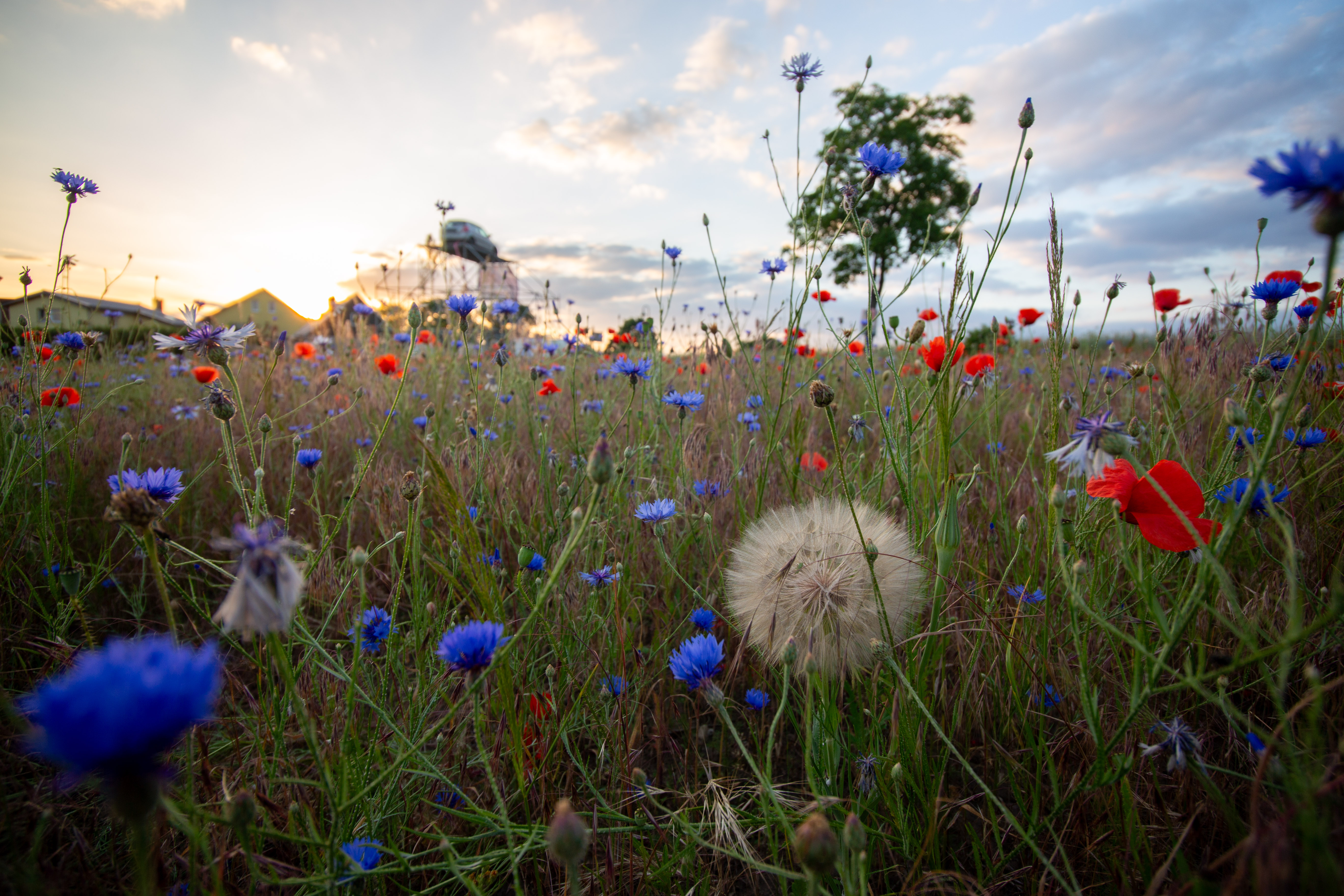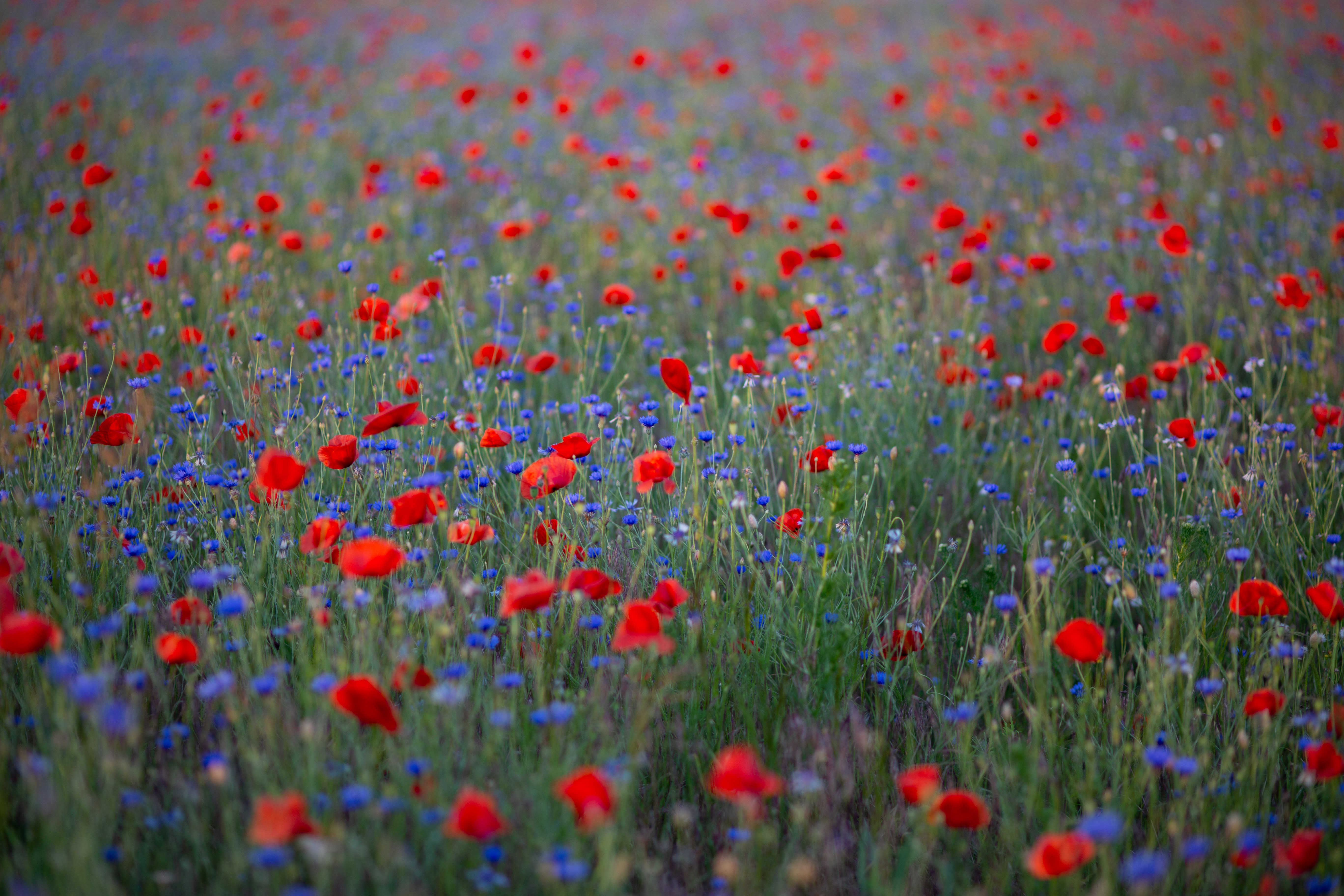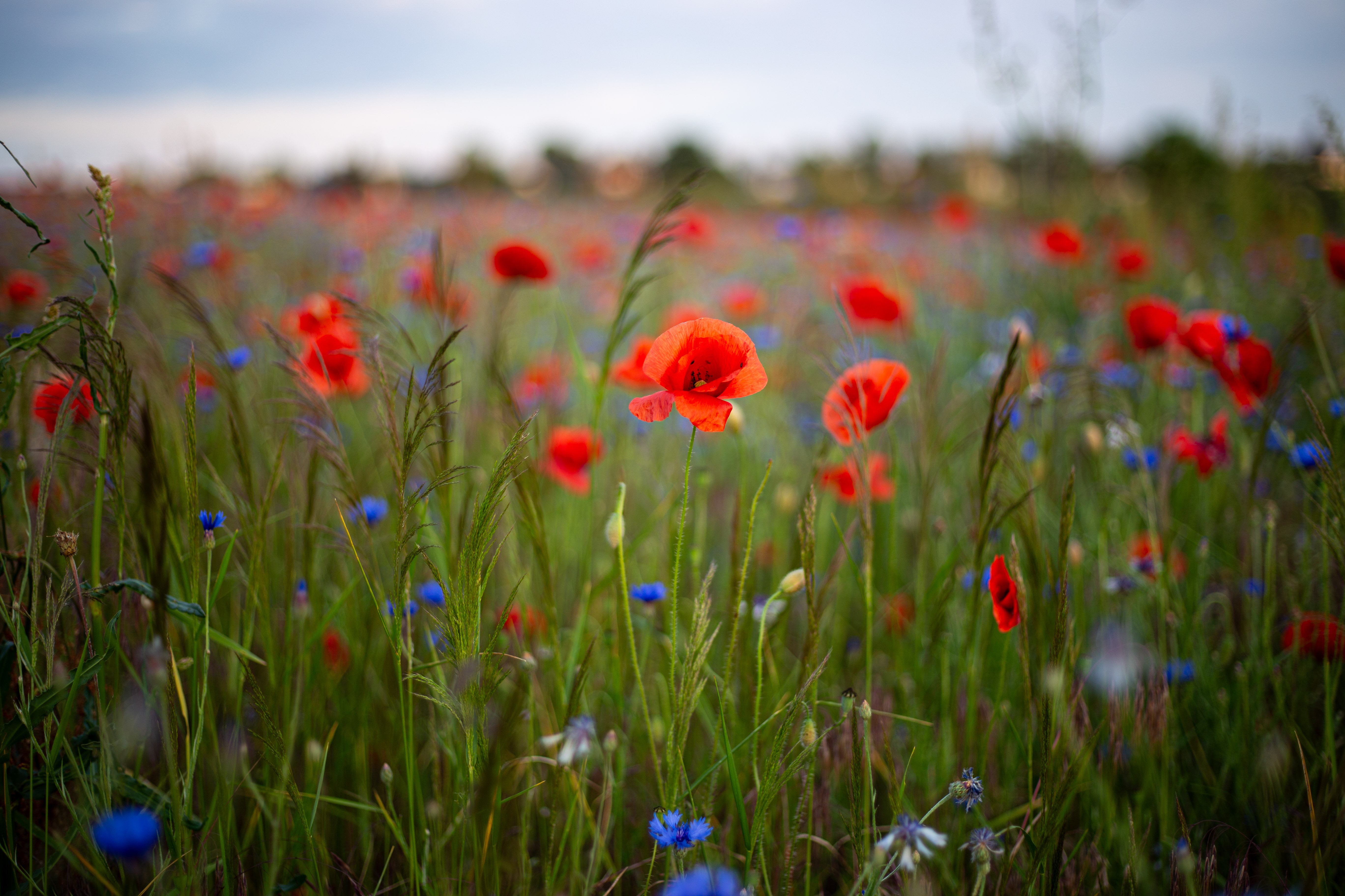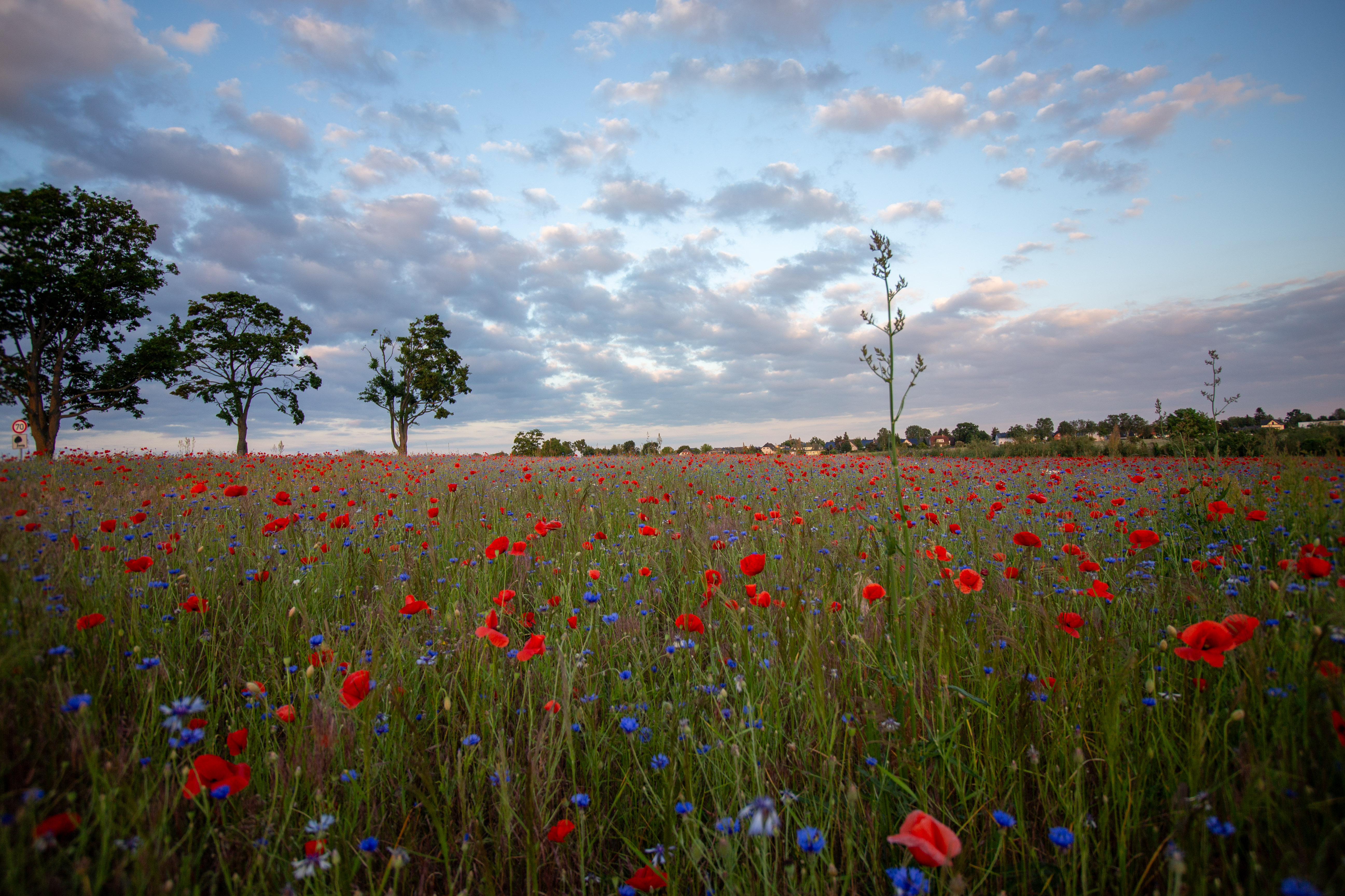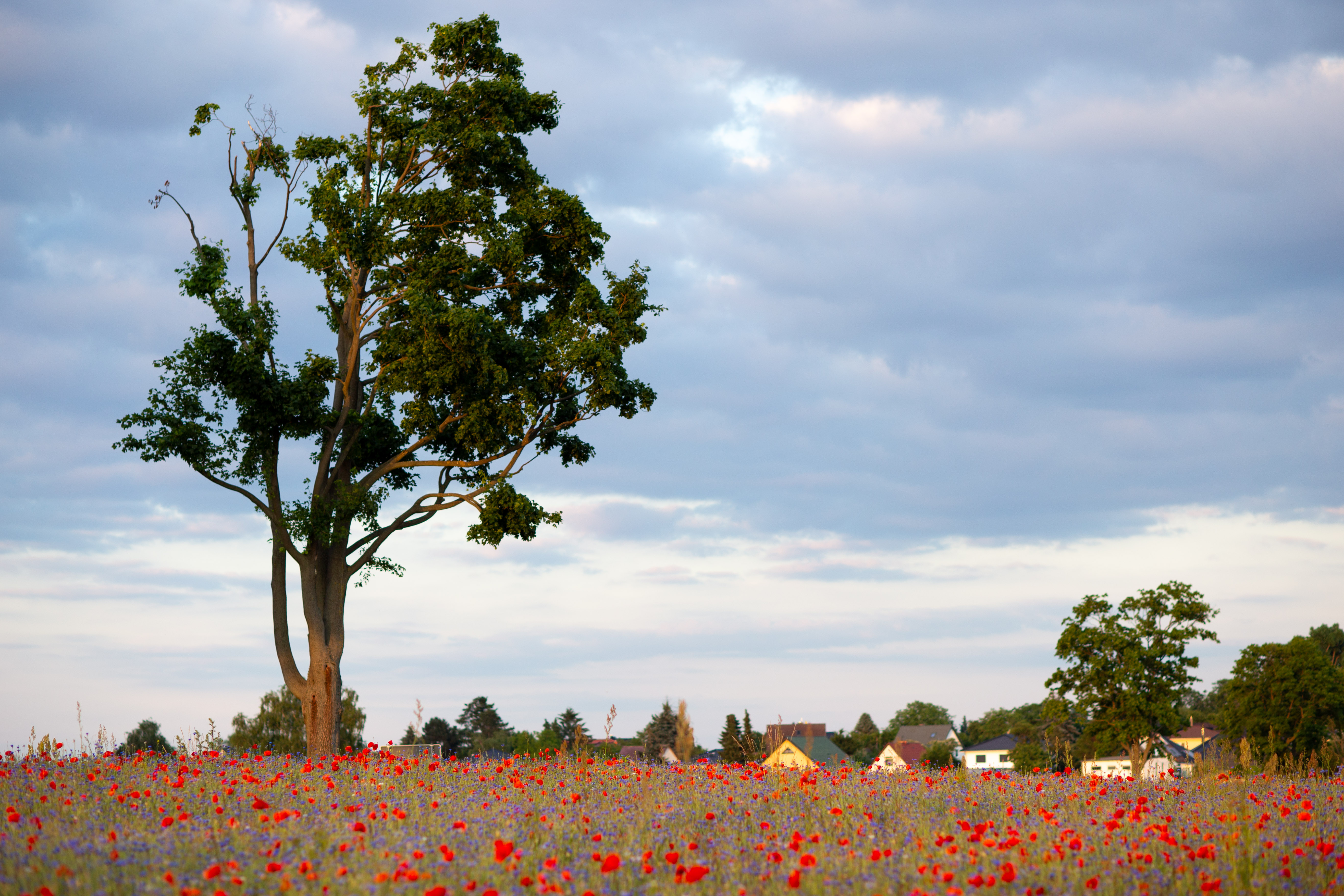 A serene countryside scene features a field of vibrant red poppies, contrasting with the blue sky and greenery. The poppies are scattered across the field, creating a sense of depth and scale. In the distance, houses and trees can be seen, adding a touch of human presence. The image is taken from a low angle, emphasizing the height of the poppies and the vastness of the field. The colors, objects, and perspective all contribute to a harmonious and tranquil composition.