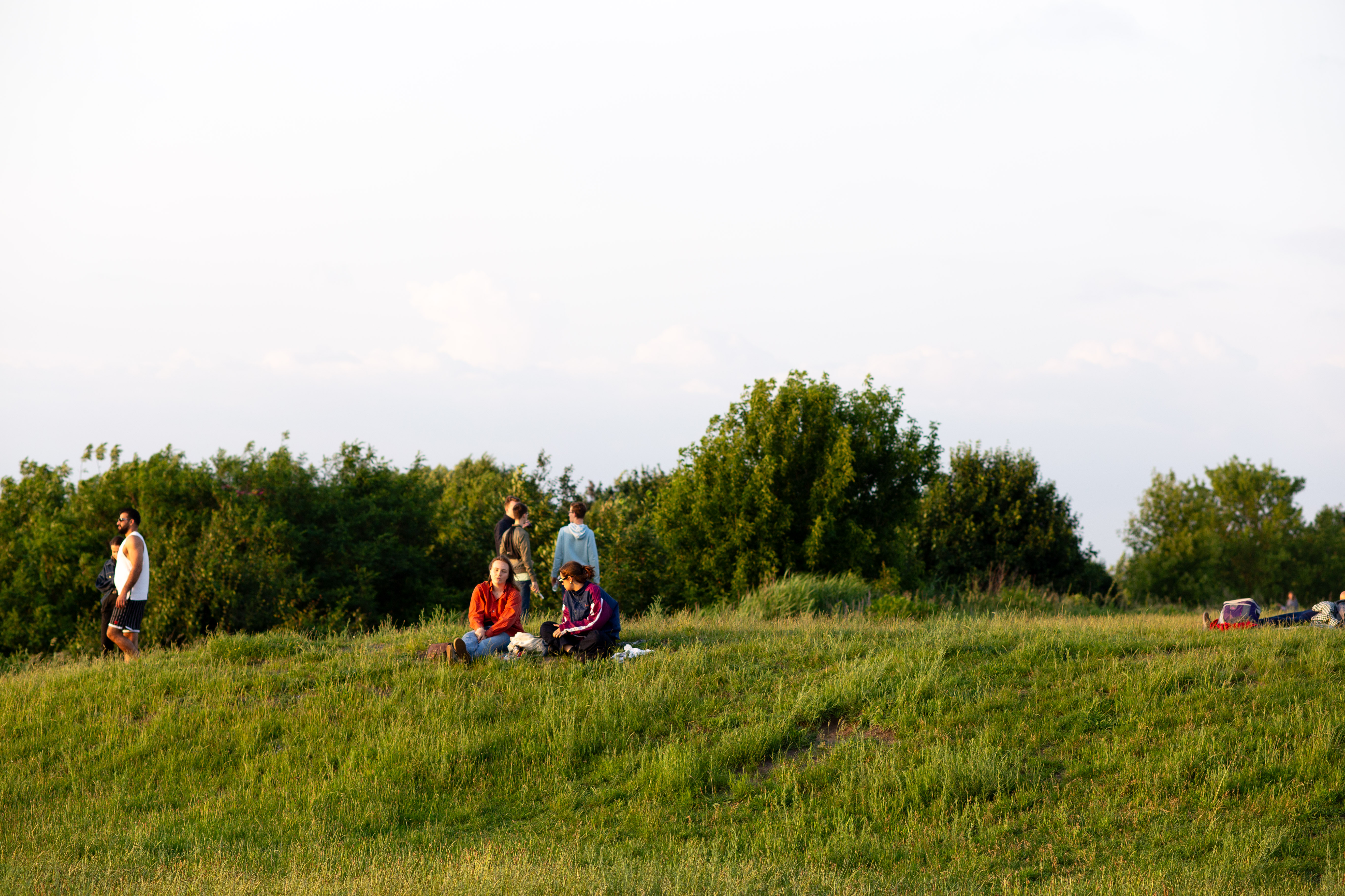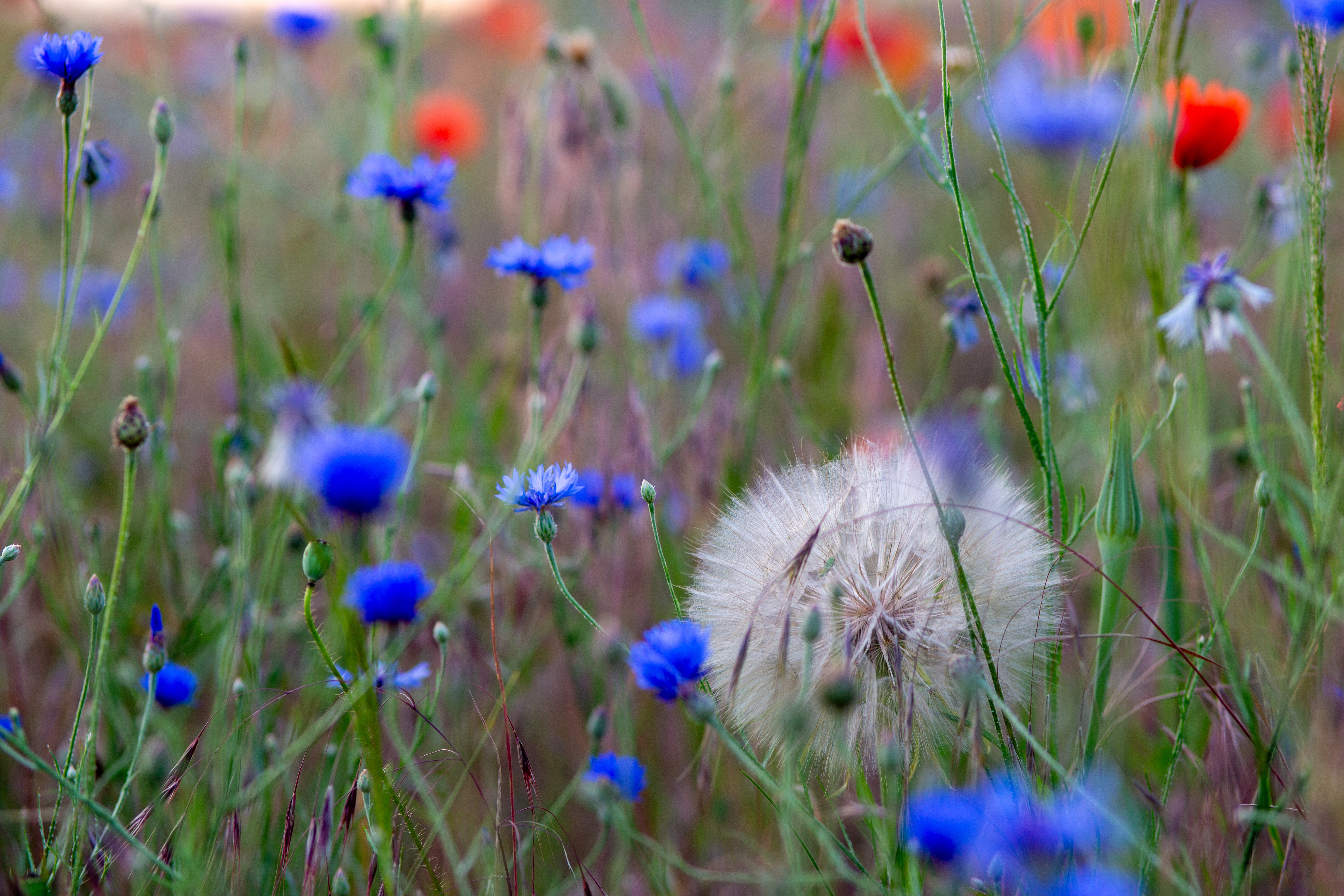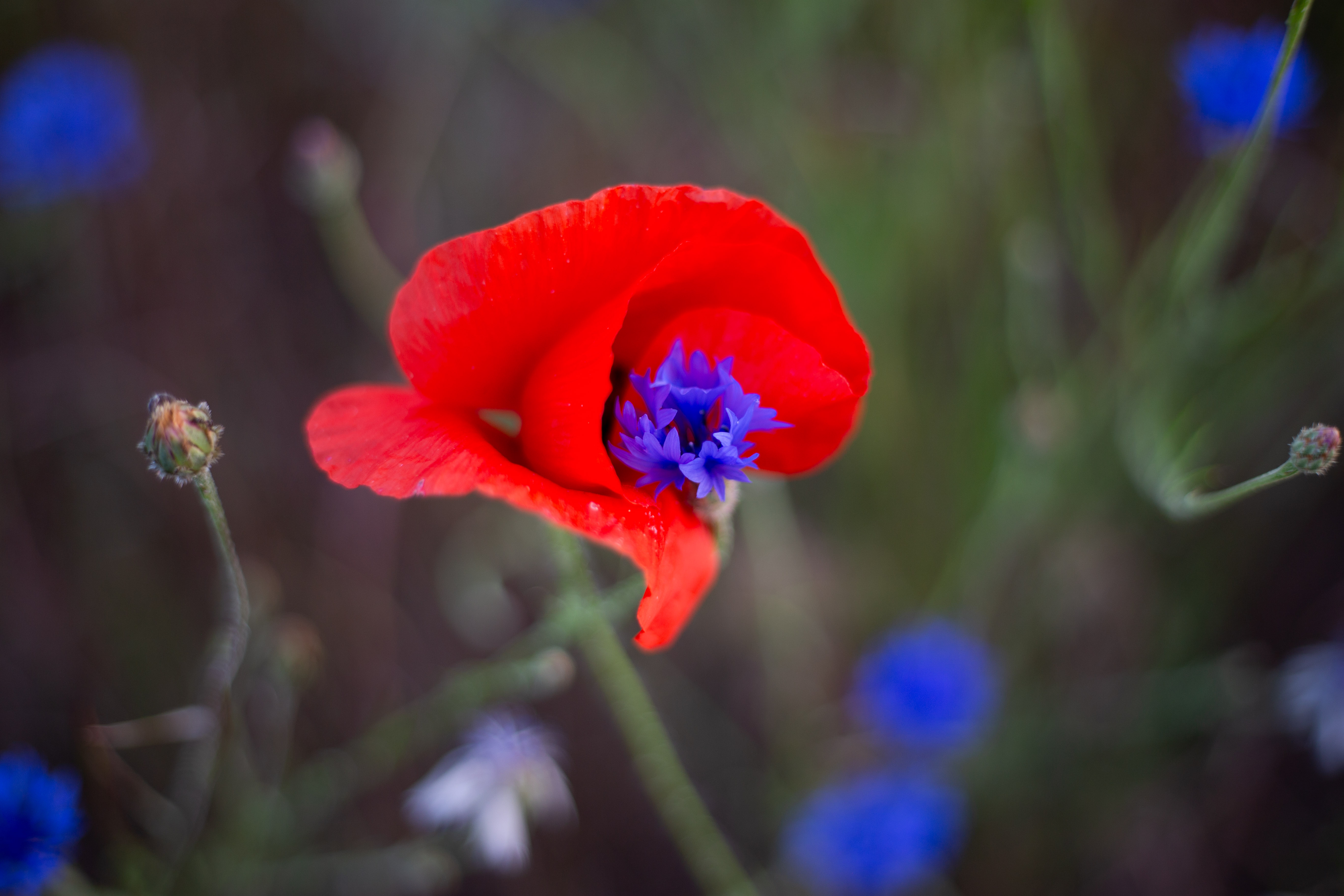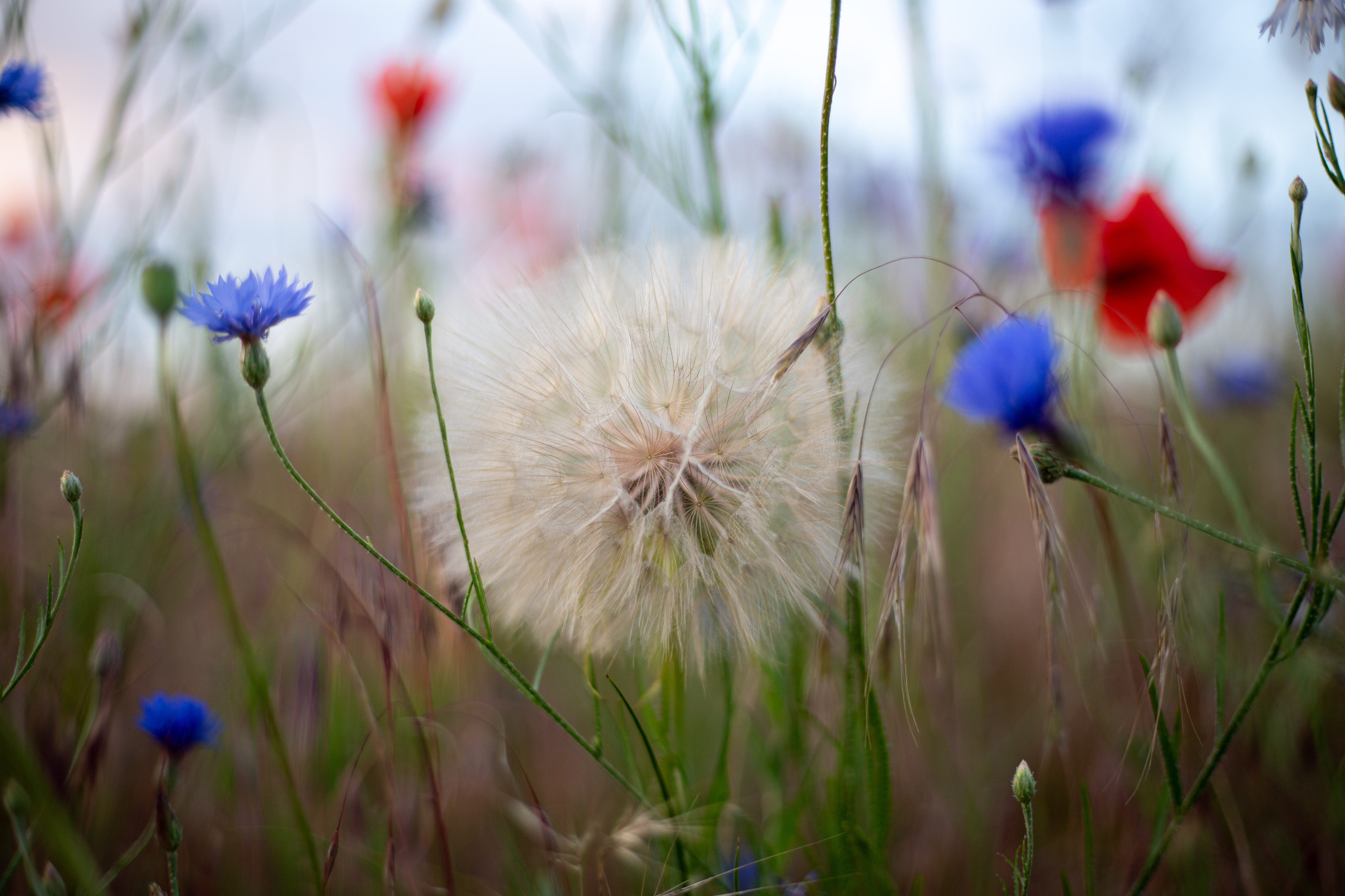 A serene countryside scene features a field of vibrant red poppies, contrasting with the blue sky and greenery. The poppies are scattered across the field, creating a sense of depth and scale. In the distance, houses and trees can be seen, adding a touch of human presence. The image is taken from a low angle, emphasizing the height of the poppies and the vastness of the field. The colors, objects, and perspective all contribute to a harmonious and tranquil composition.