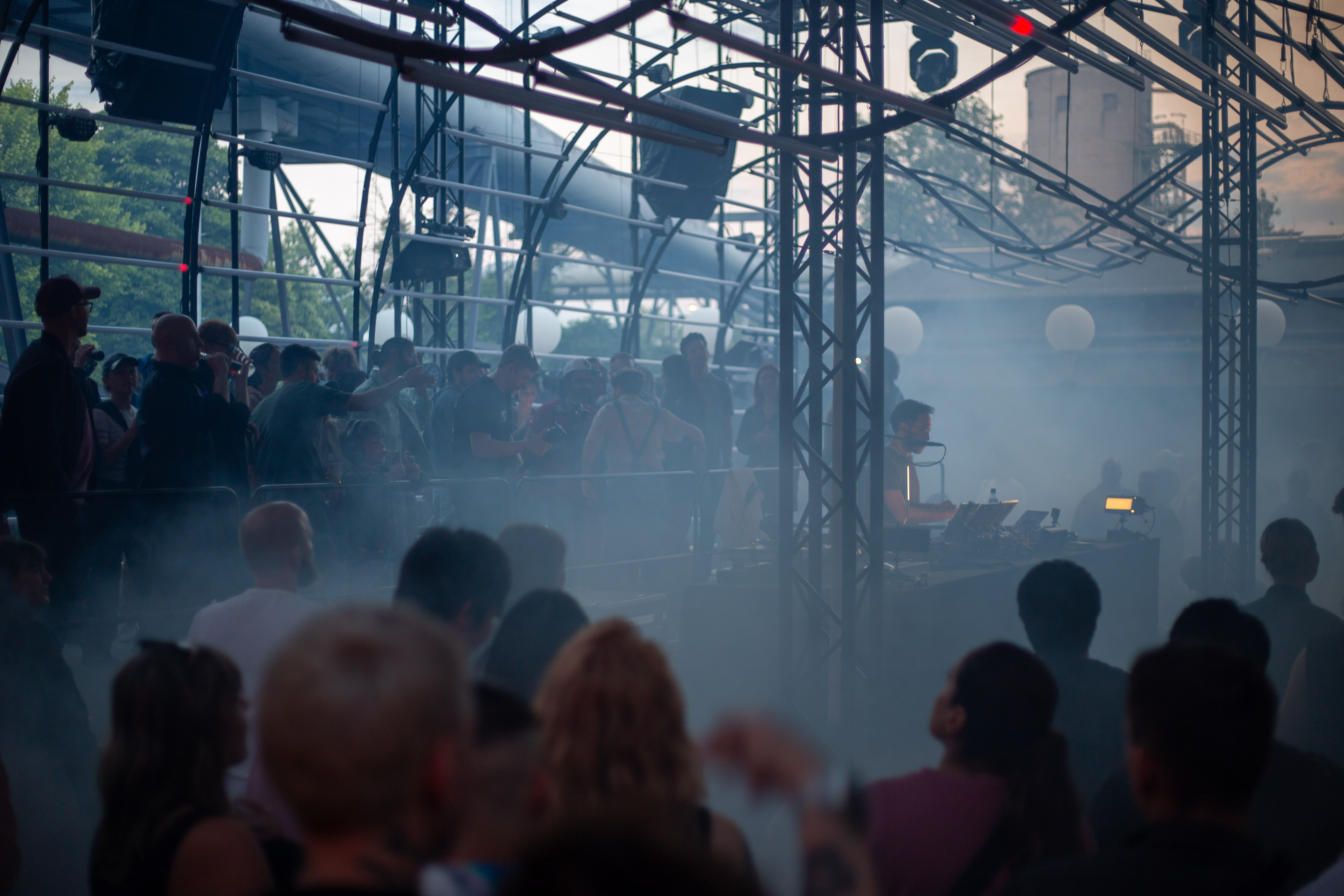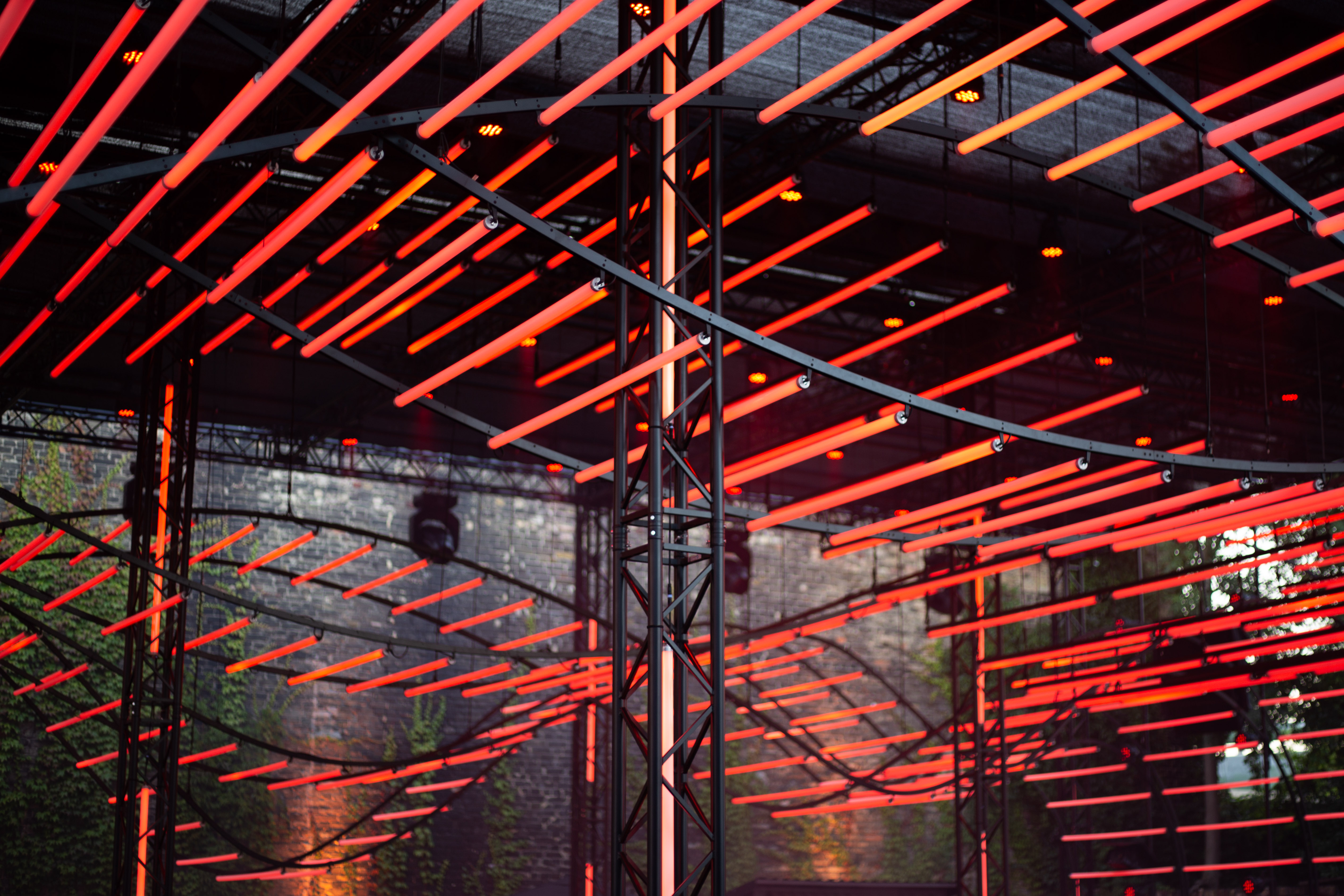 A dimly lit nightclub scene features a blue-lit ceiling with vertical lines, creating a mesmerizing effect. A white triangular object hangs from the ceiling, adding intrigue. The perspective is from the ground, looking up at the ceiling, emphasizing the height and grandeur of the structure. The image is taken from a low angle, emphasizing the height and grandeur of the ceiling. The landmark information "sa_15007" does not provide additional context to the image.