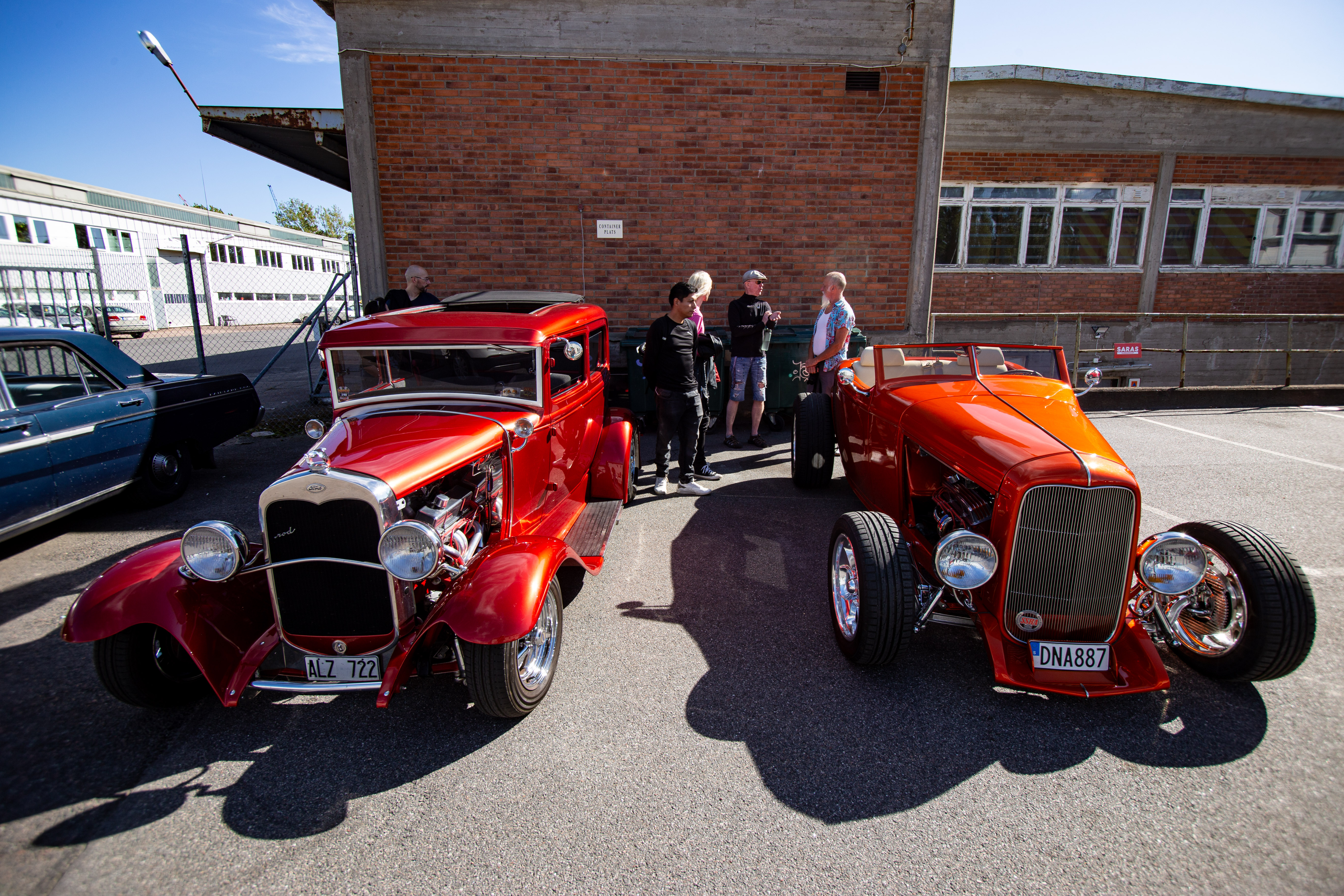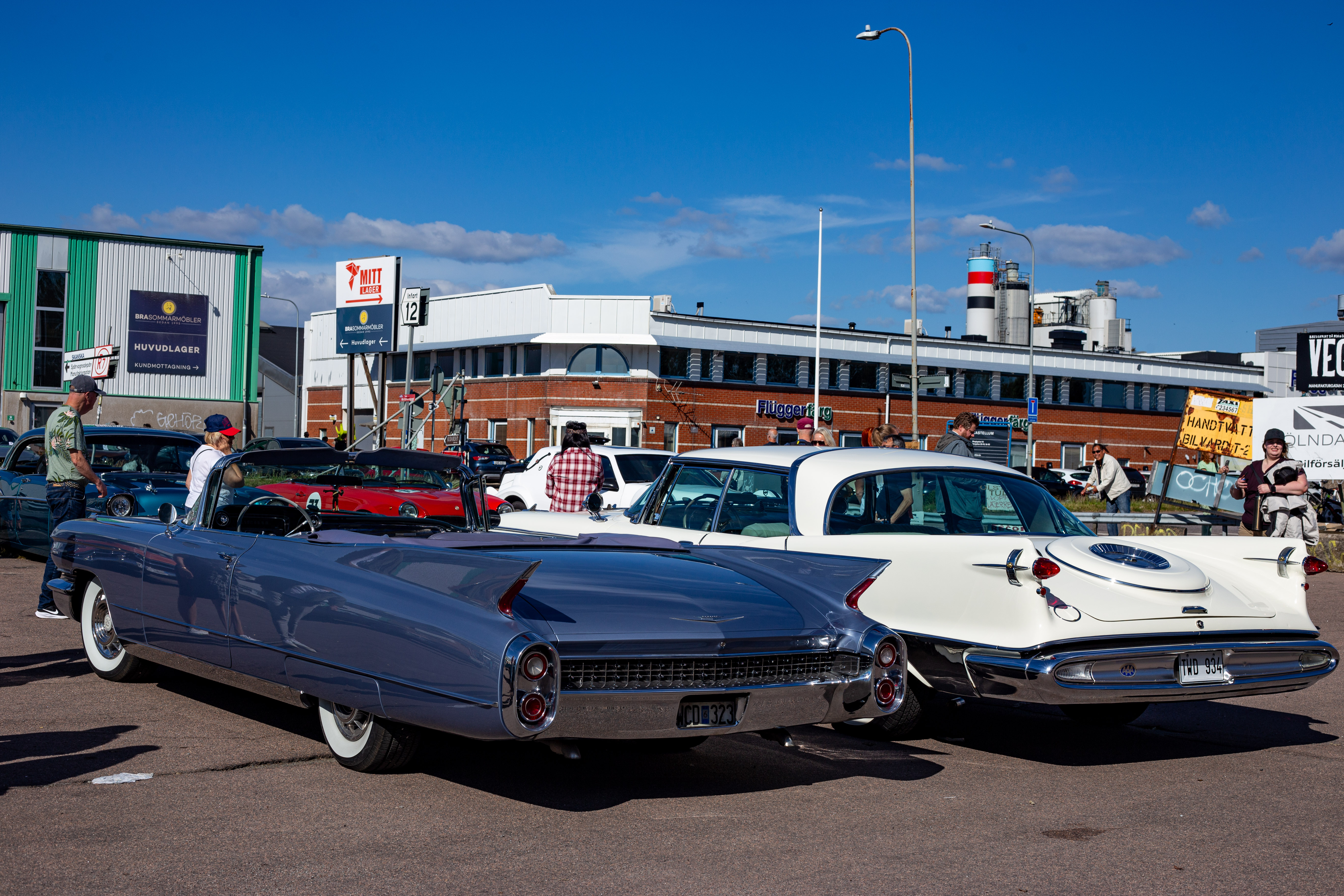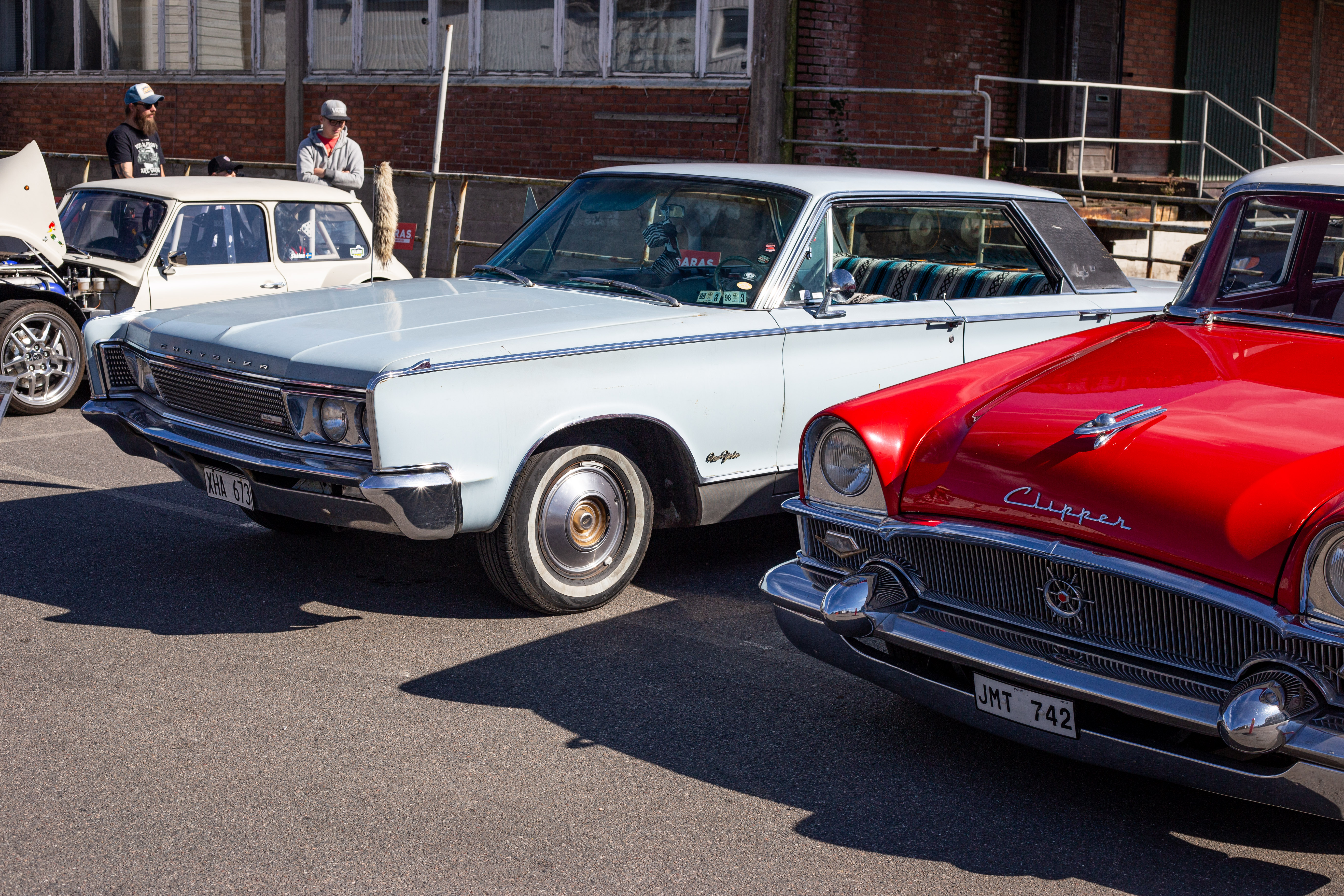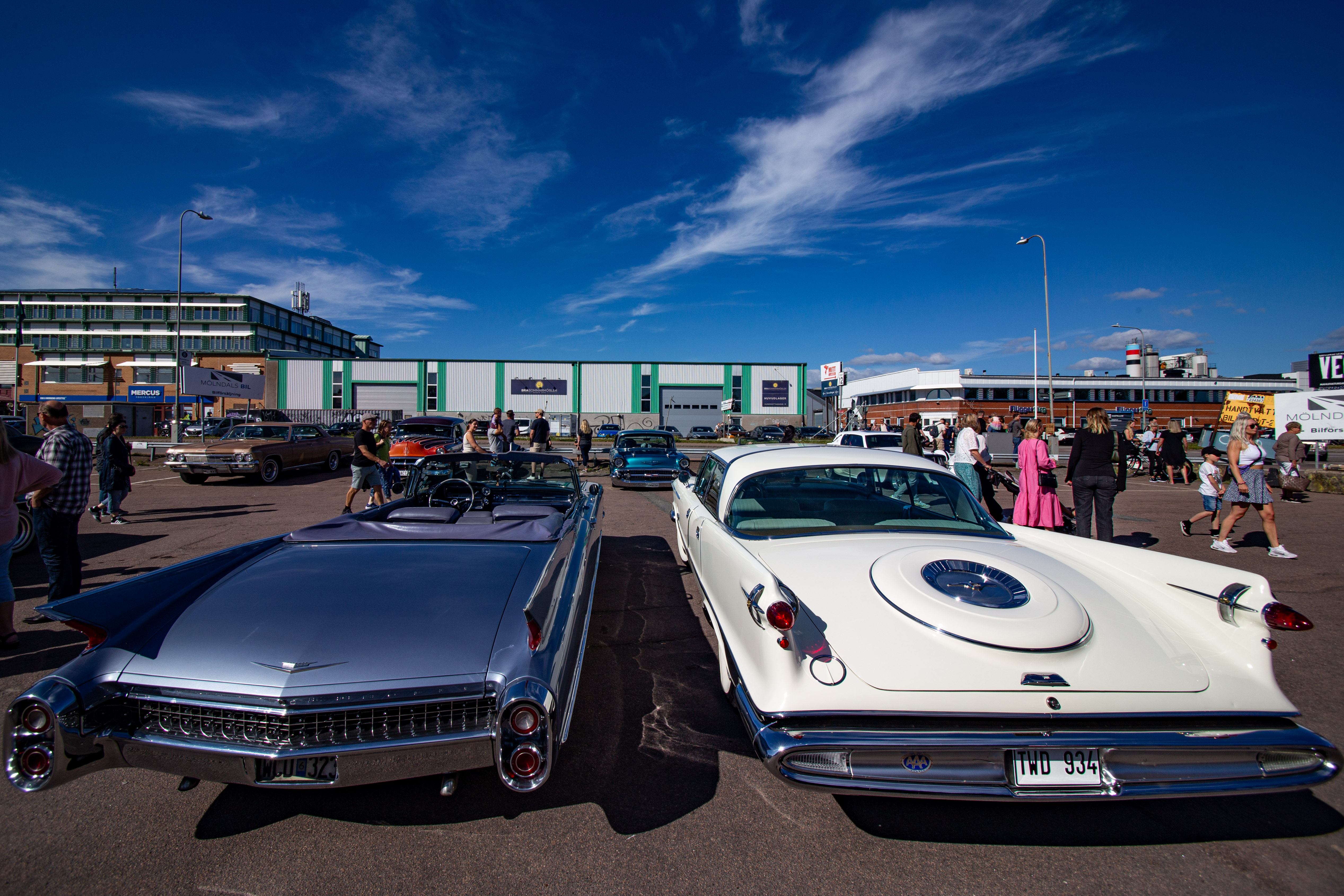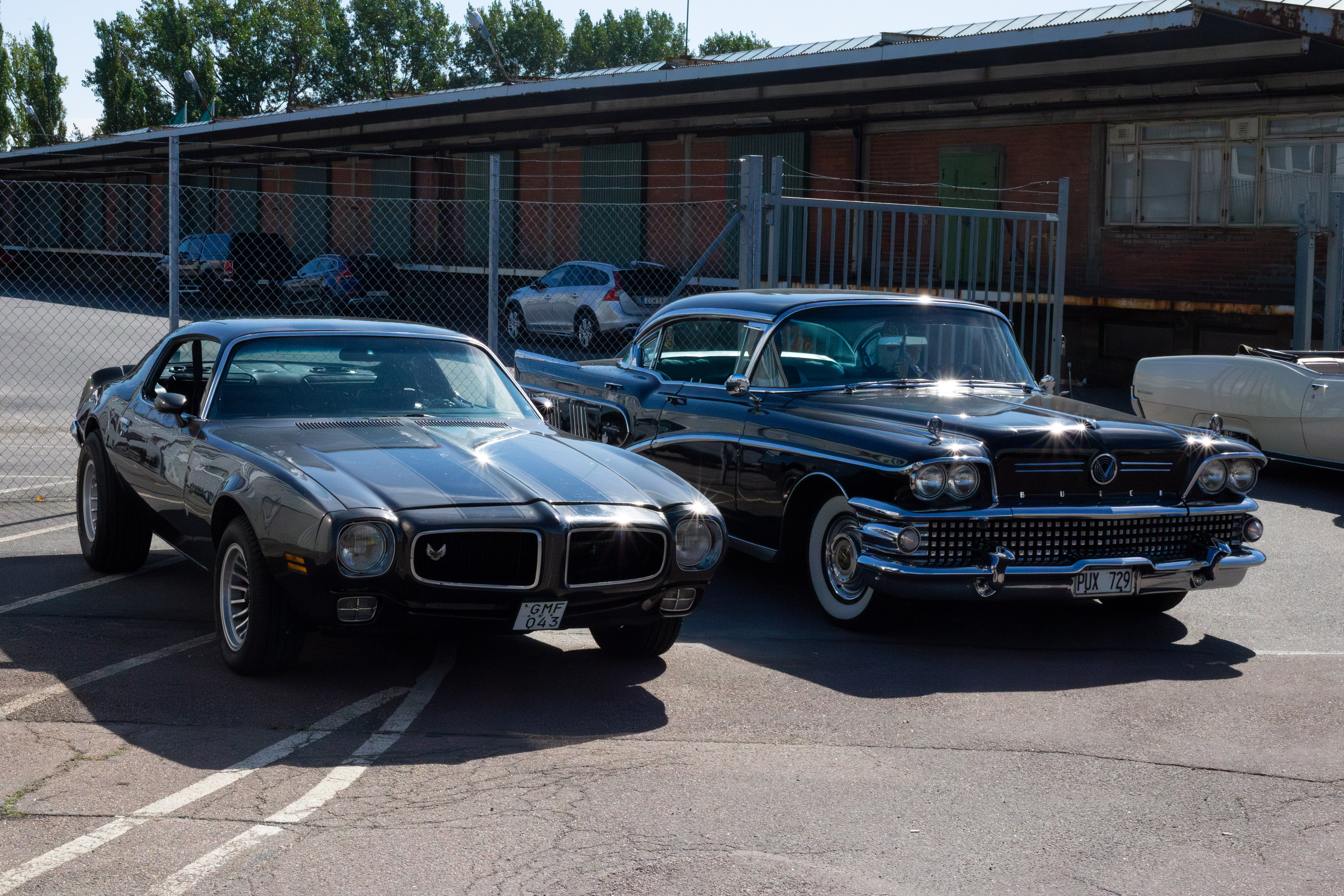 At a vintage car show, two classic cars, a white and a silver one, are parked side by side in a spacious parking lot. The white car has a chrome grille and a blue license plate, while the silver car has a chrome grille and a license plate with the number "100". The parking lot is bustling with people, and the background features a green building with a blue roof. The sky is a clear blue with a few clouds, and the overall atmosphere is lively and nostalgic.