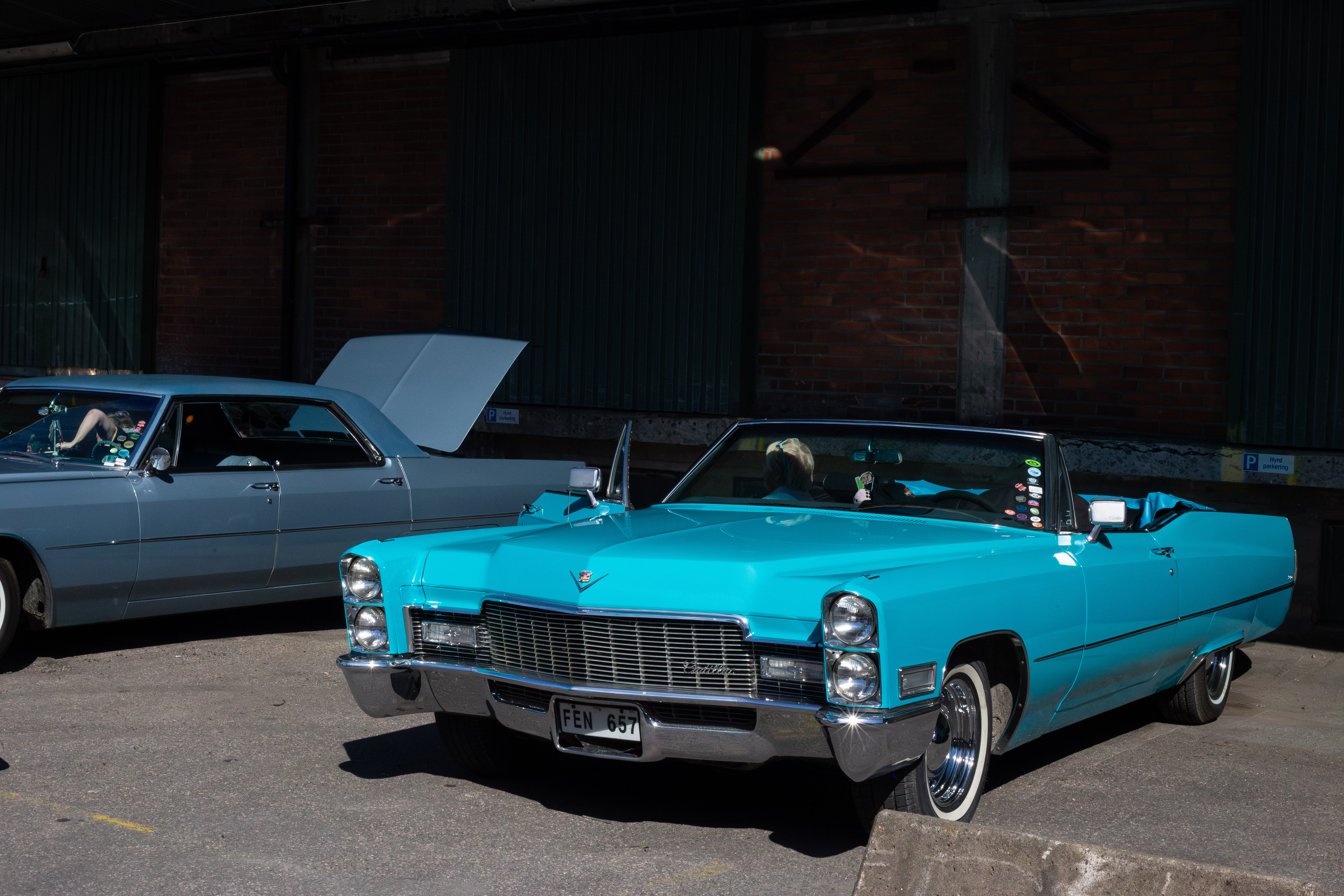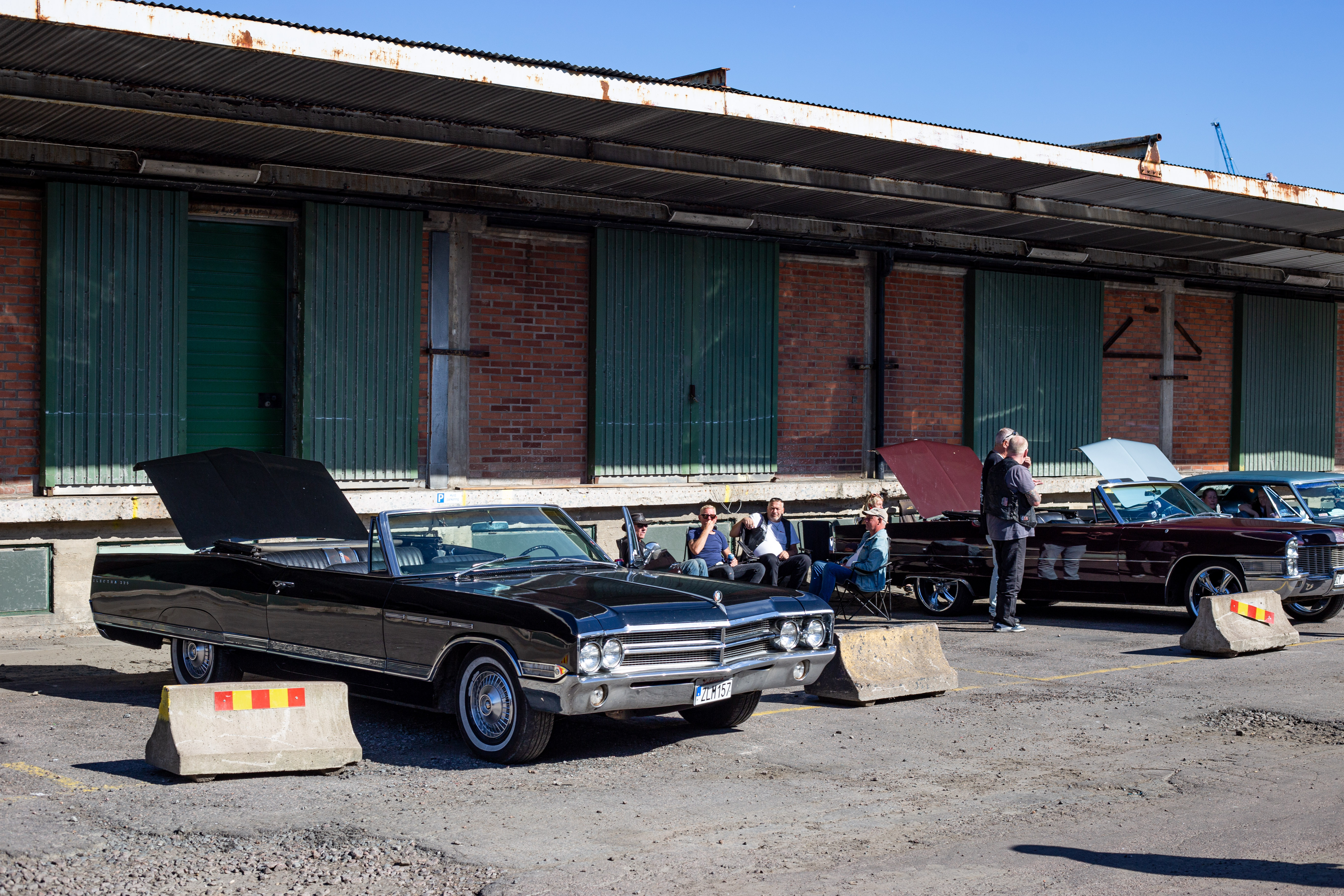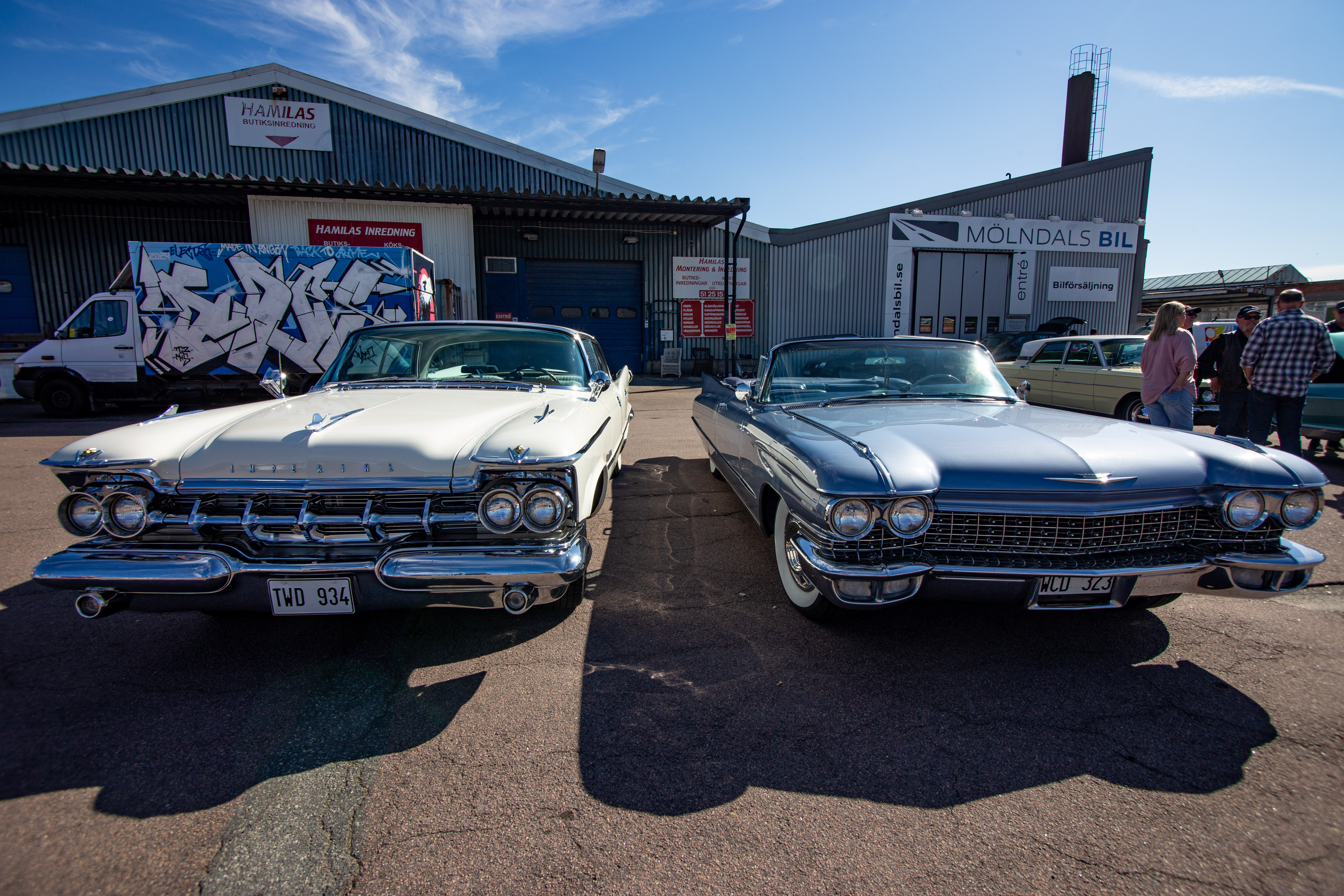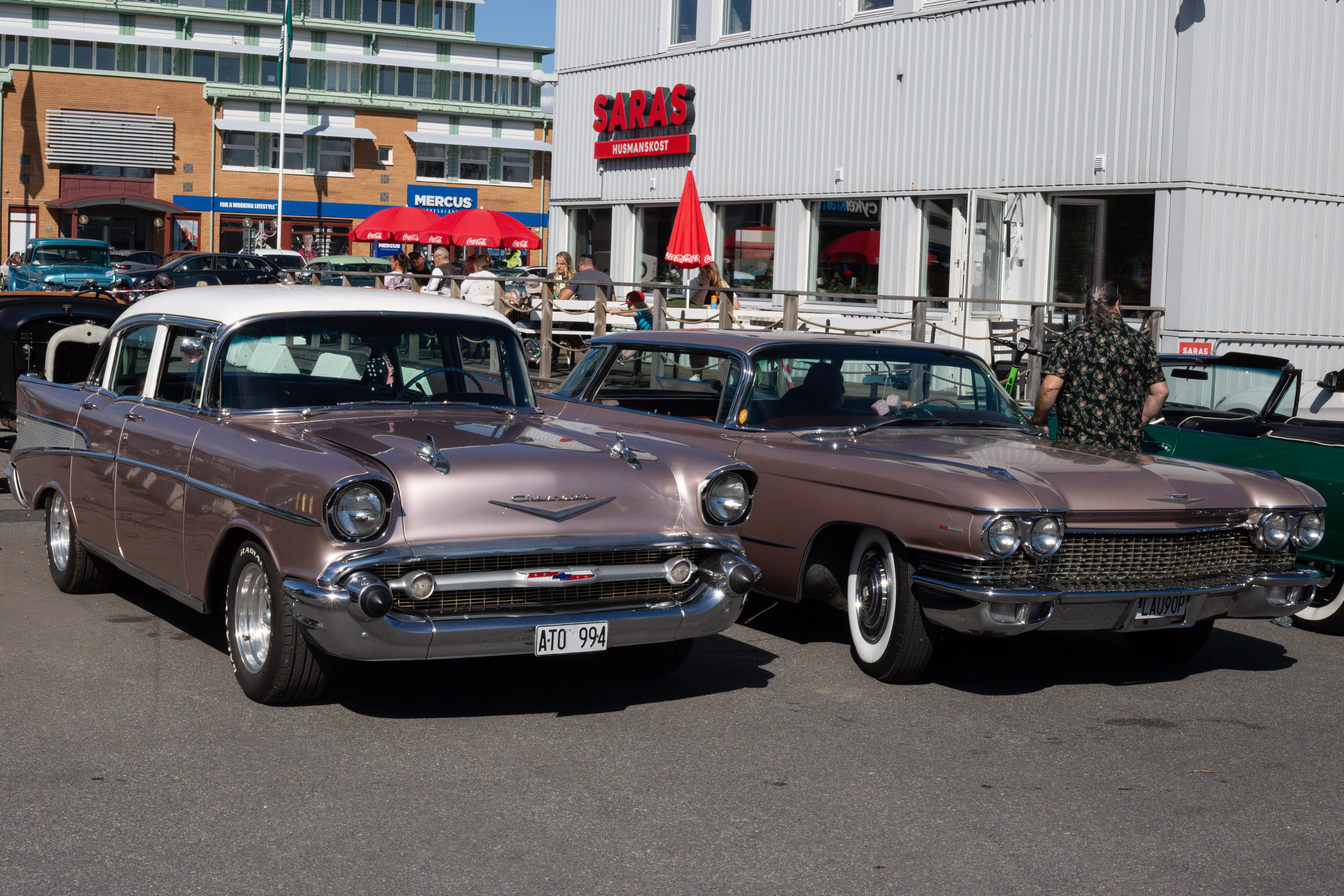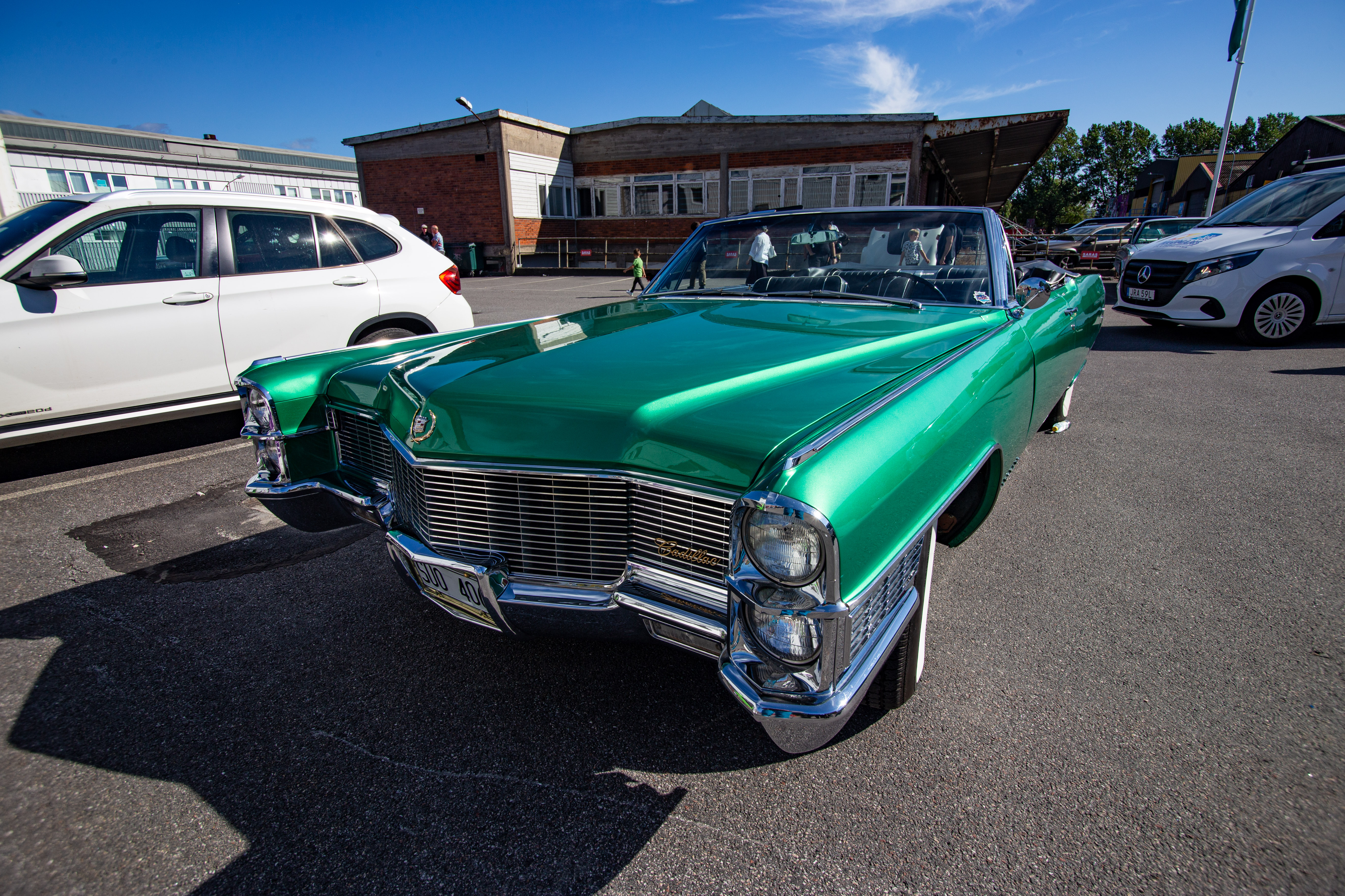At a vintage car show, two classic cars, a white and a silver one, are parked side by side in a spacious parking lot. The white car has a chrome grille and a blue license plate, while the silver car has a chrome grille and a license plate with the number "100". The parking lot is bustling with people, and the background features a green building with a blue roof. The sky is a clear blue with a few clouds, and the overall atmosphere is lively and nostalgic.