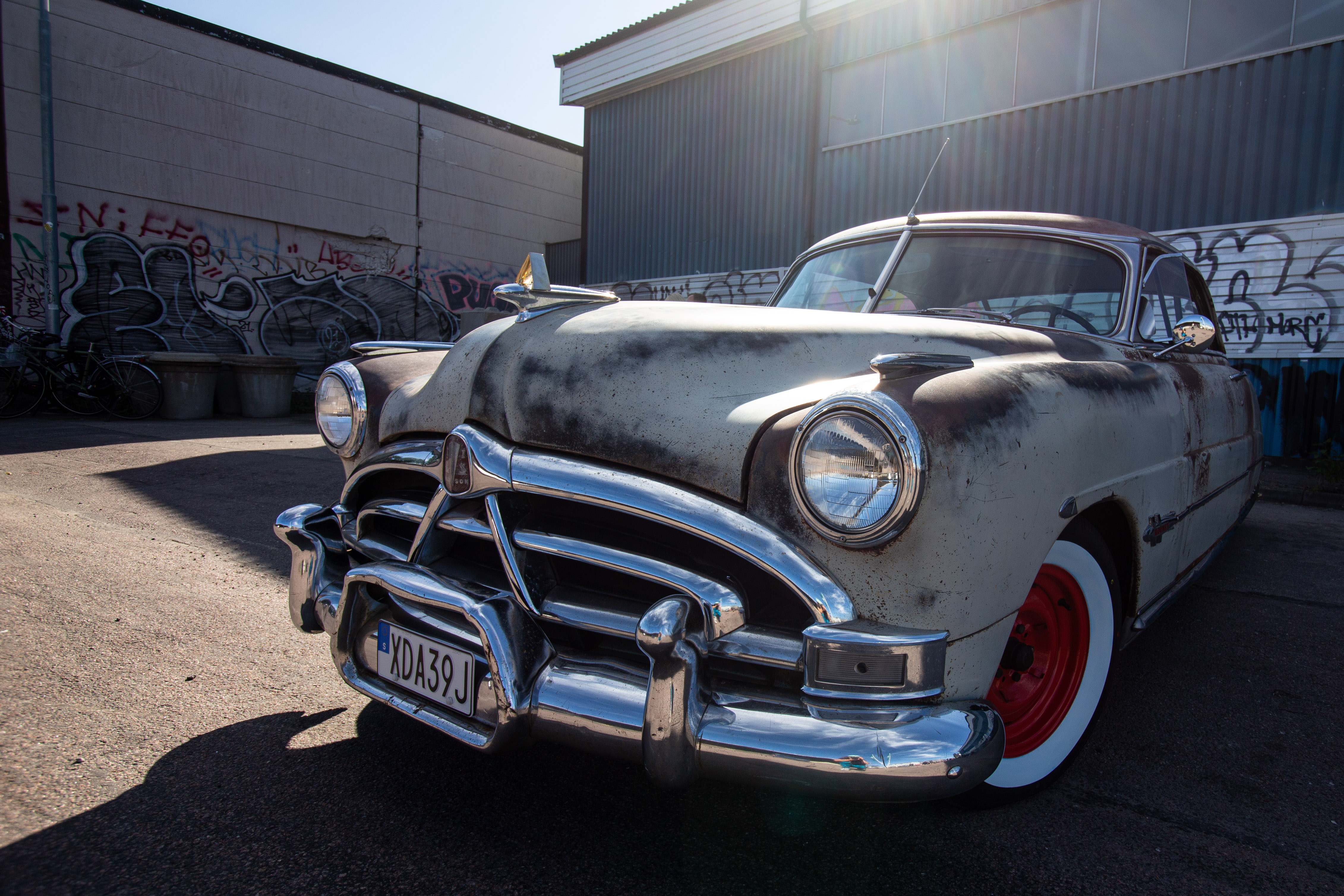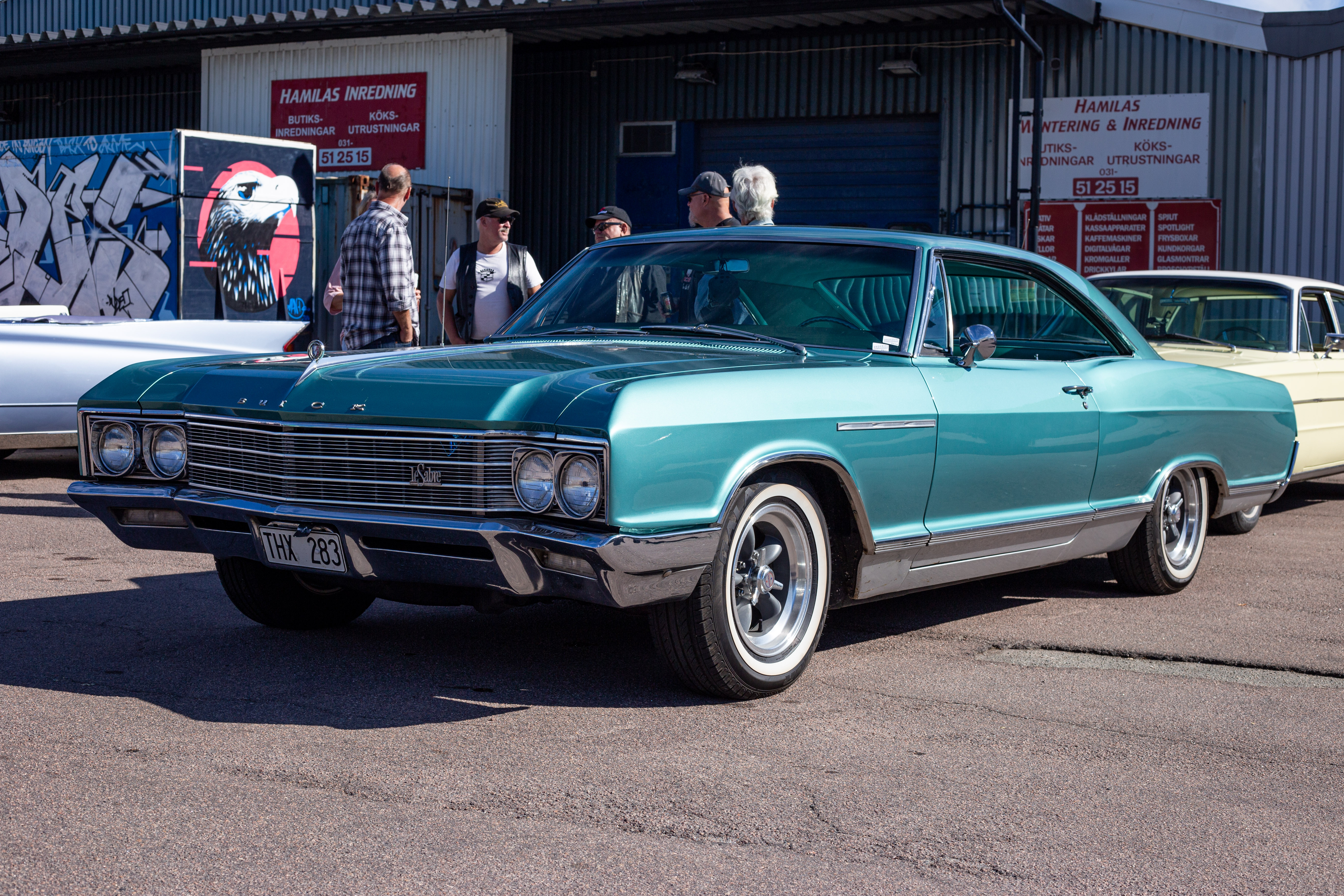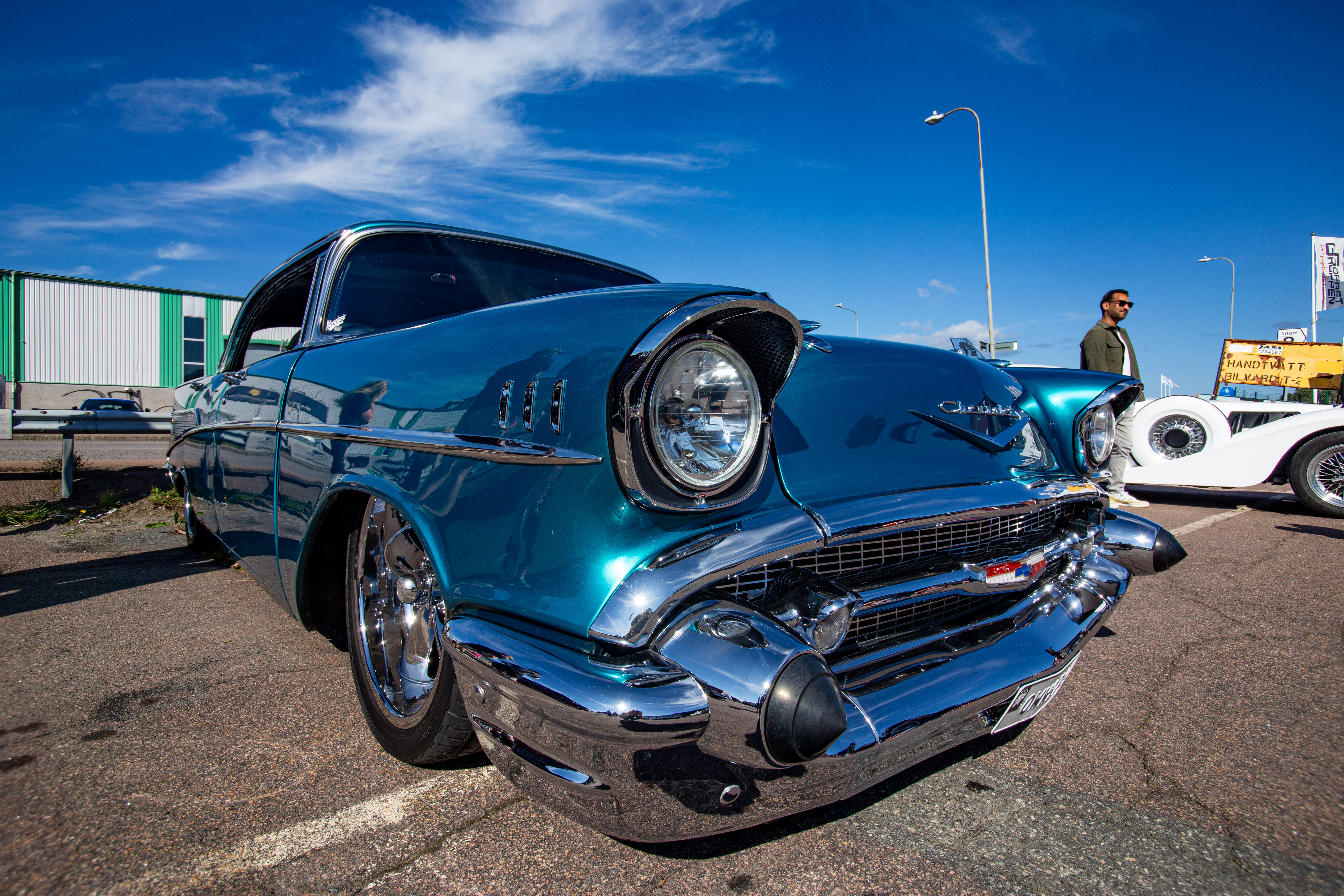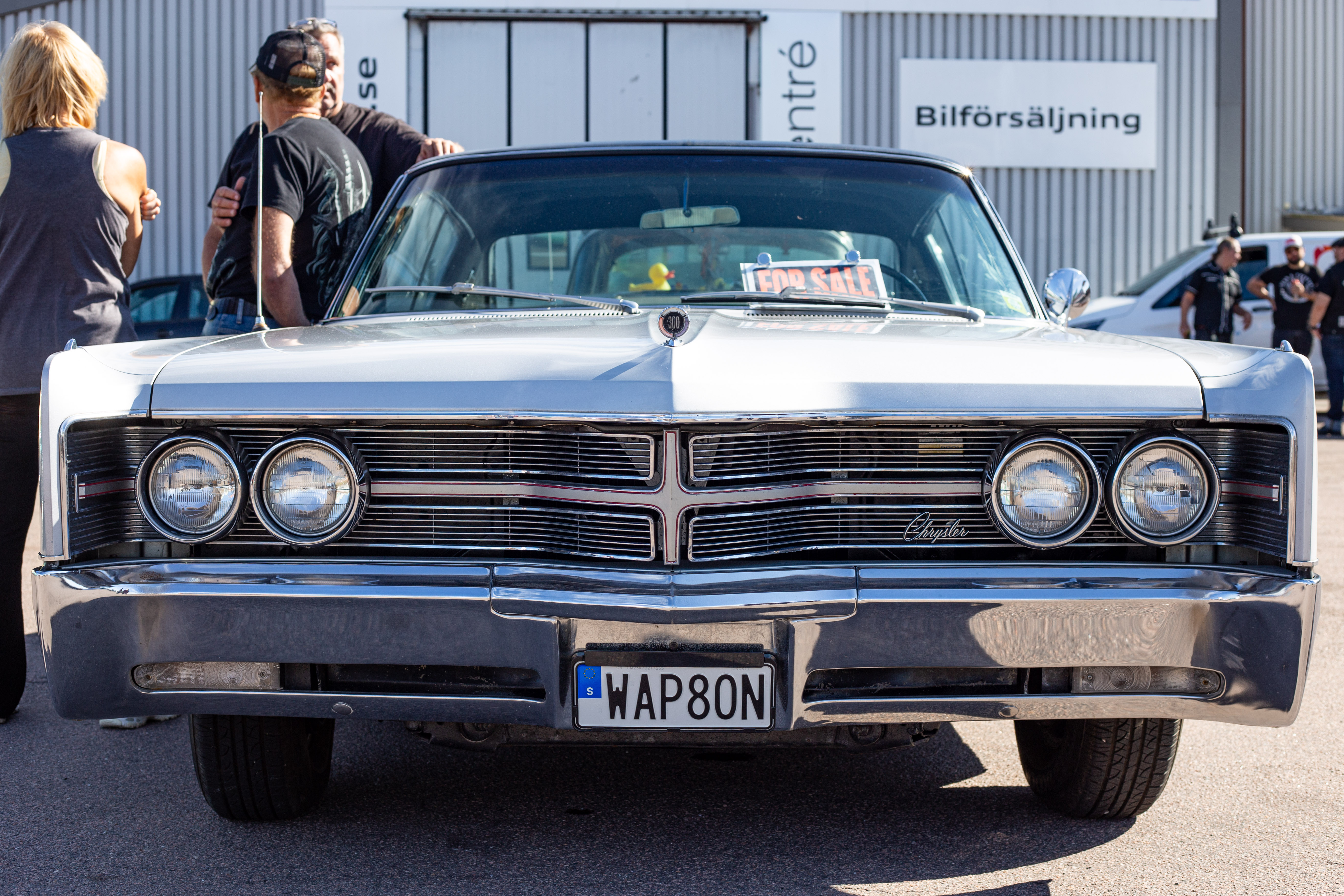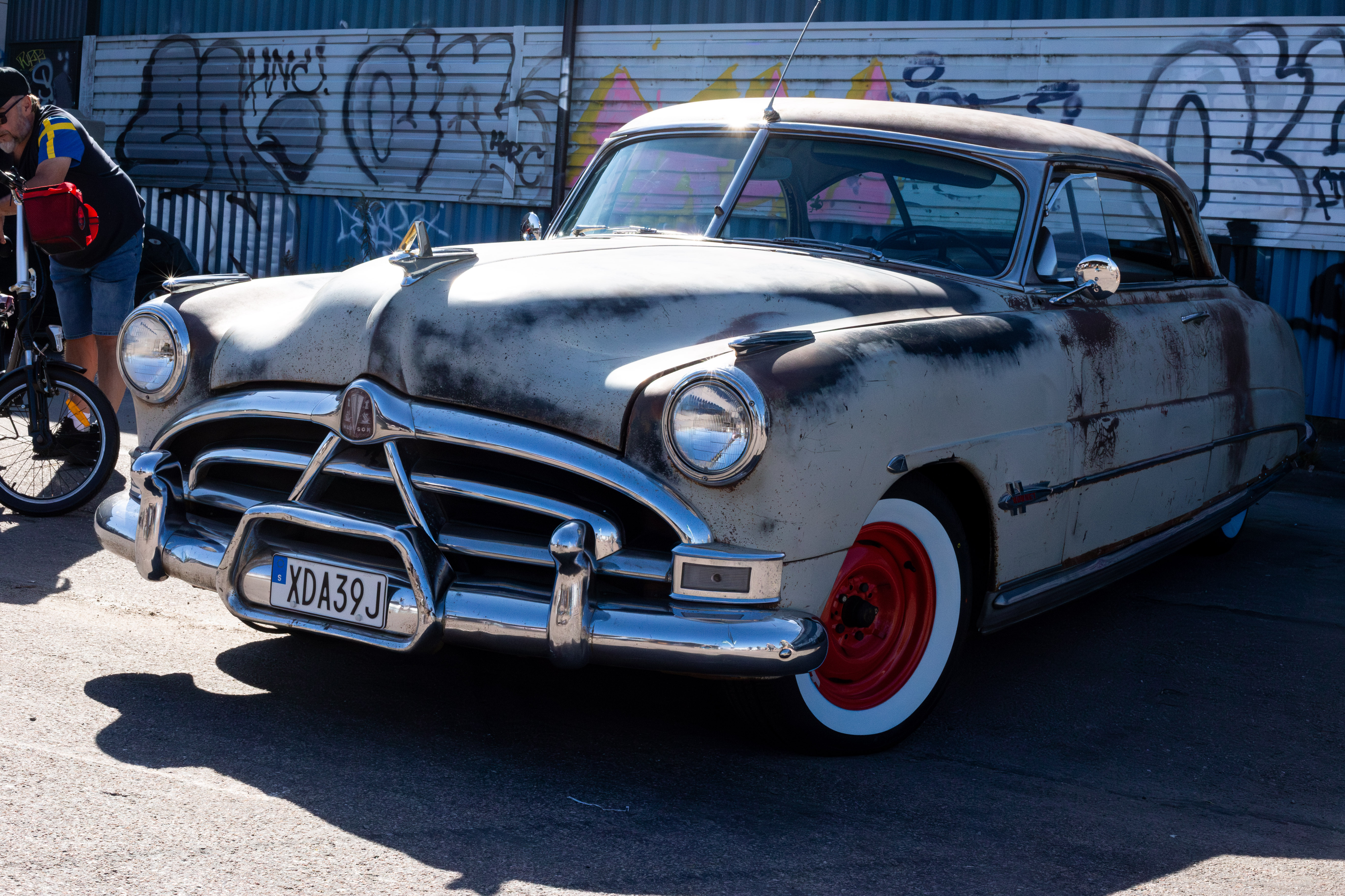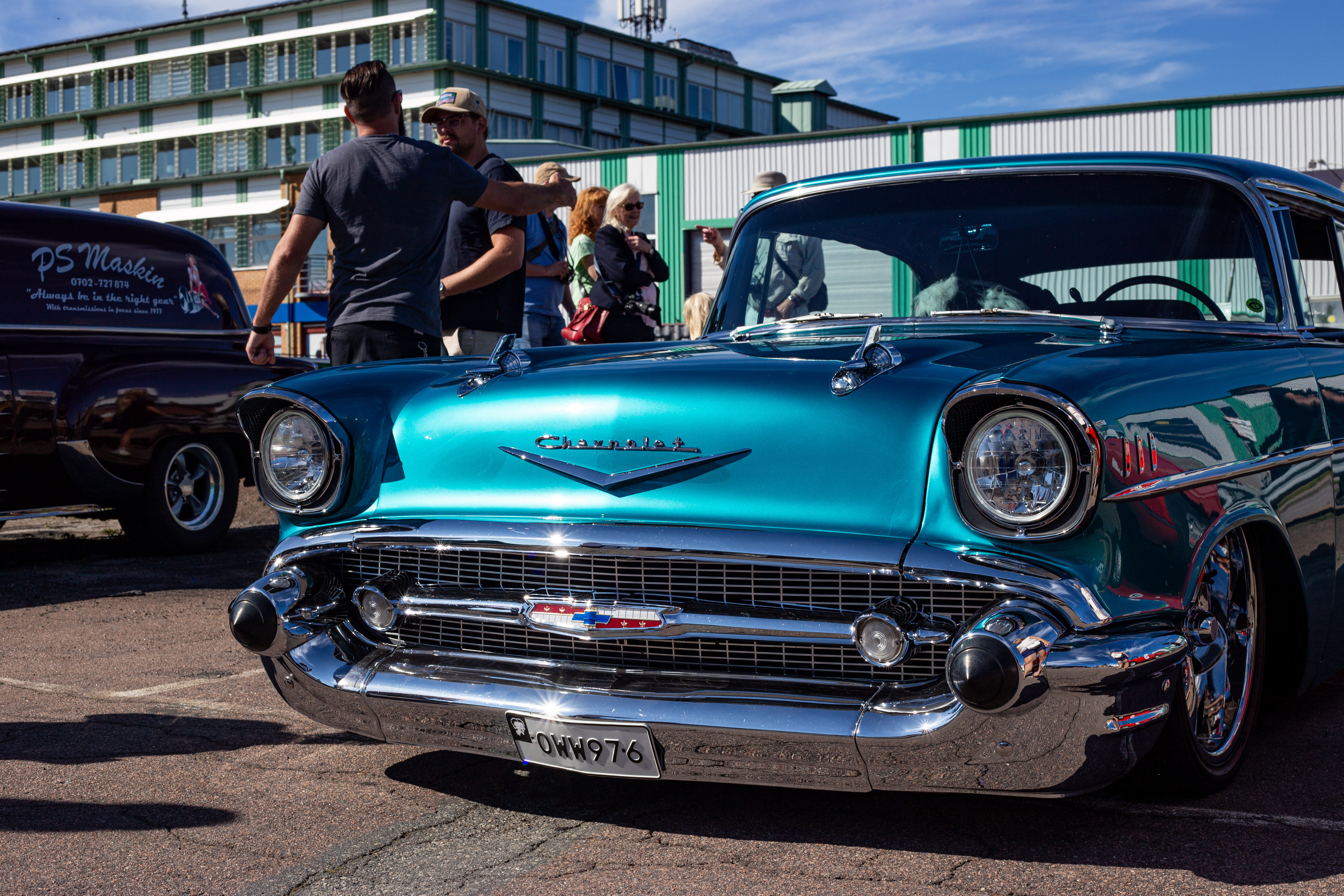 At a vintage car show, two classic cars, a white and a silver one, are parked side by side in a spacious parking lot. The white car has a chrome grille and a blue license plate, while the silver car has a chrome grille and a license plate with the number "100". The parking lot is bustling with people, and the background features a green building with a blue roof. The sky is a clear blue with a few clouds, and the overall atmosphere is lively and nostalgic.