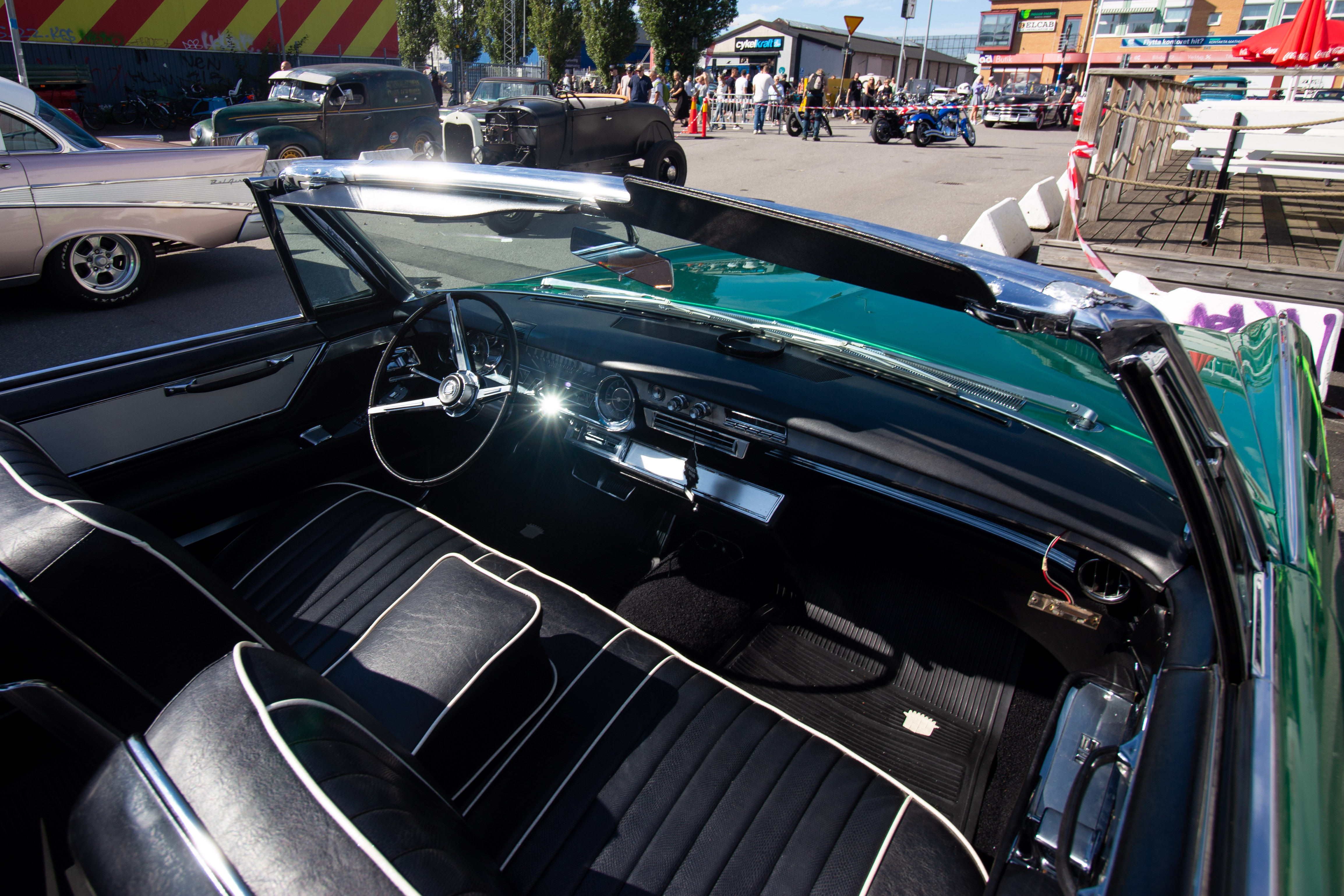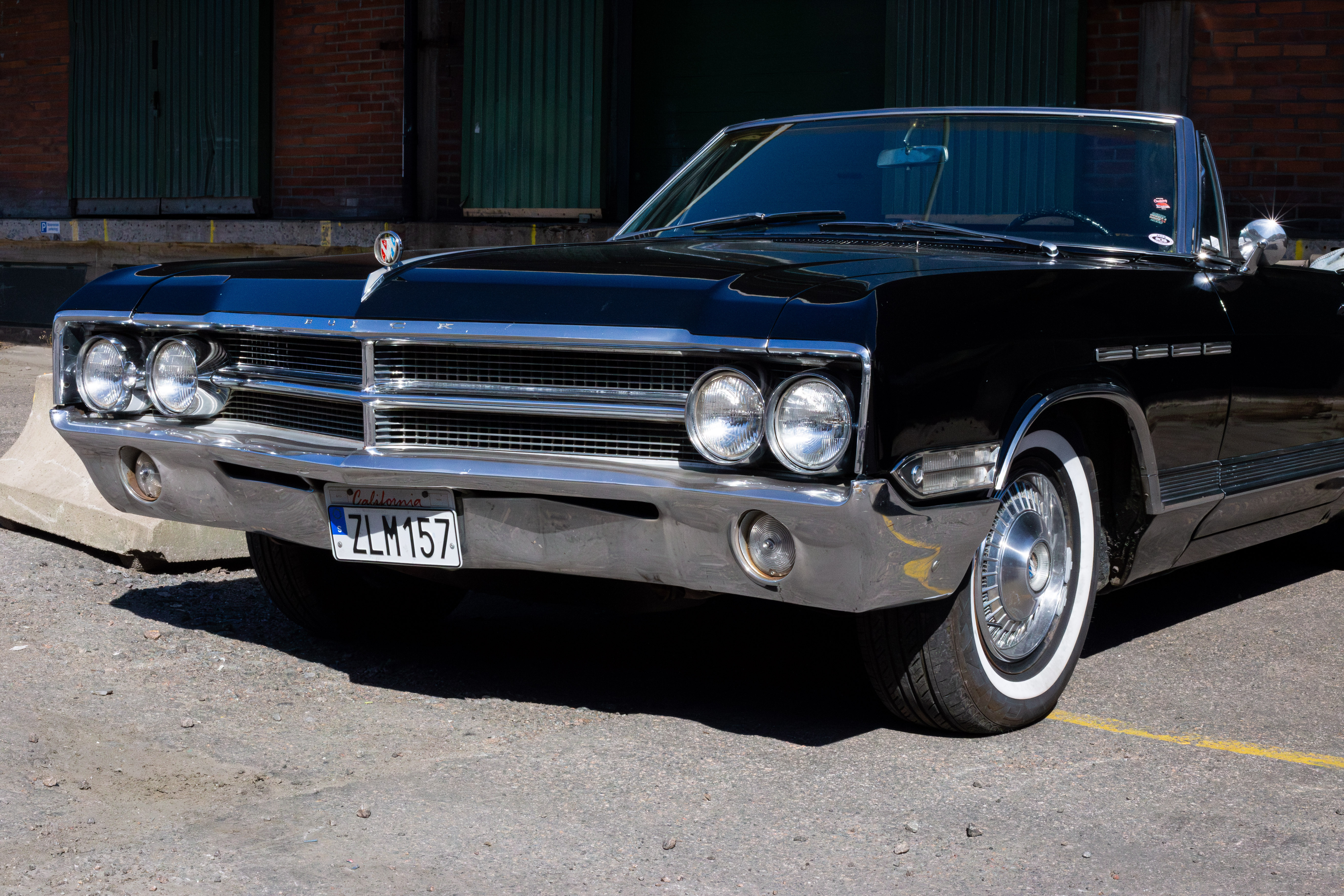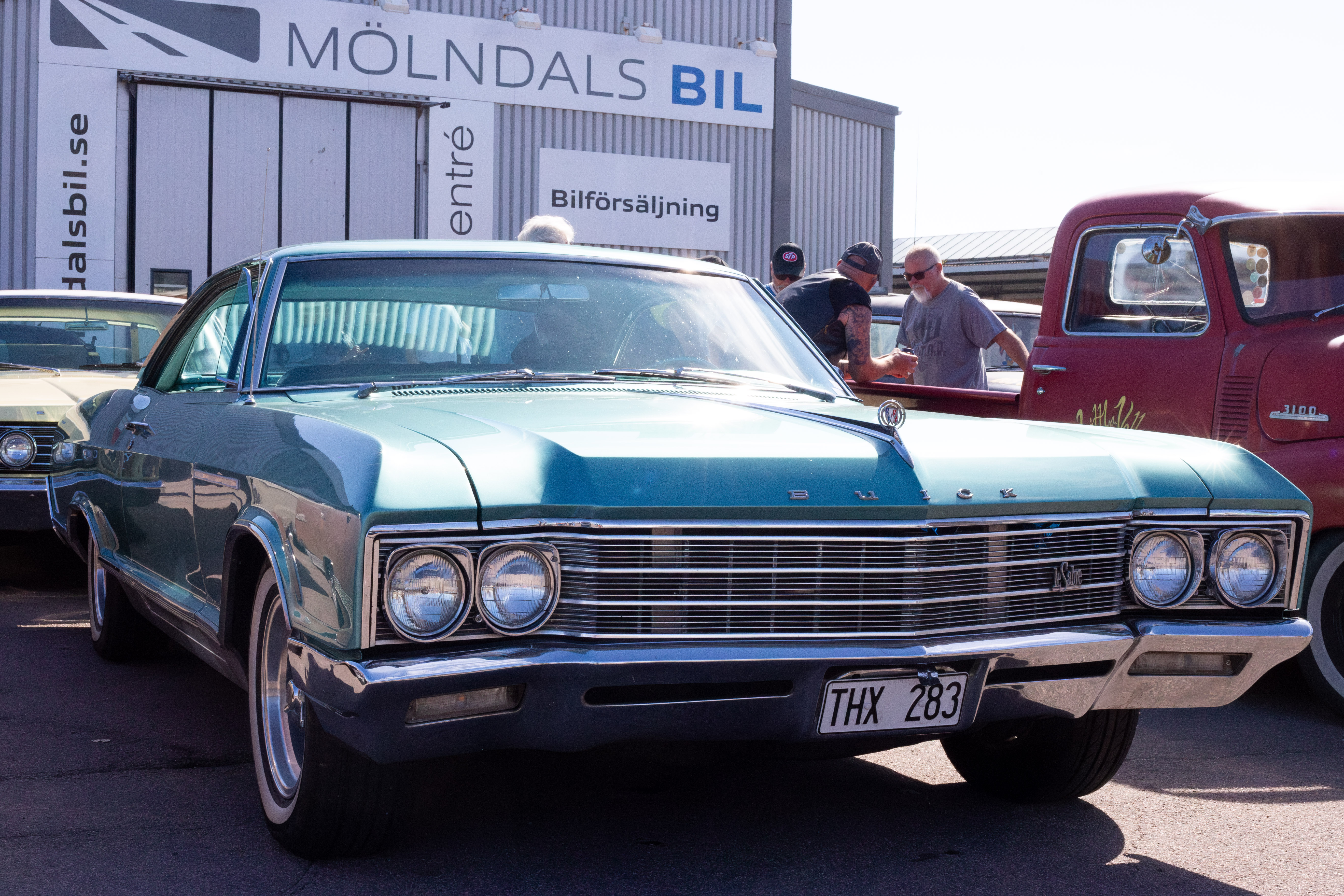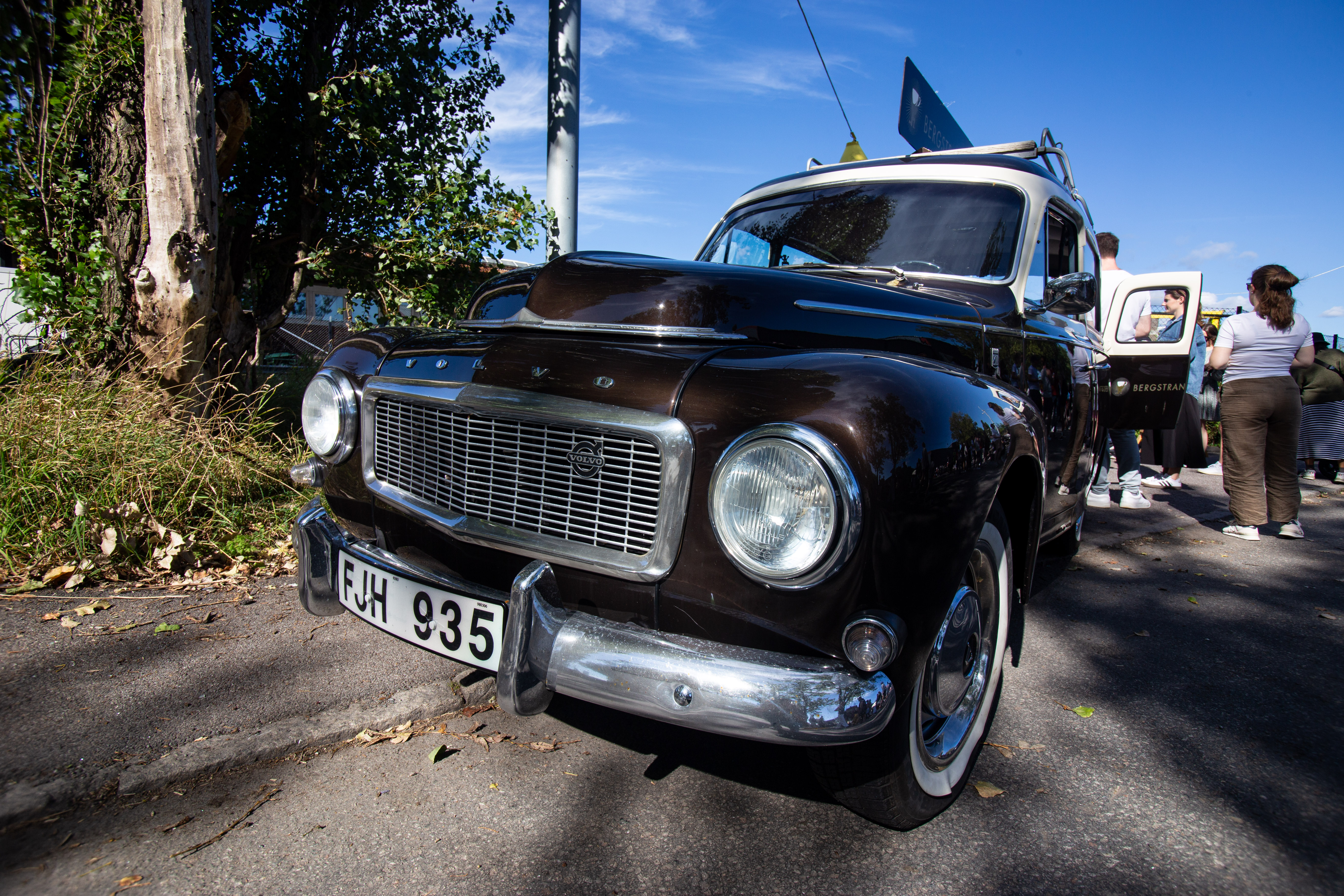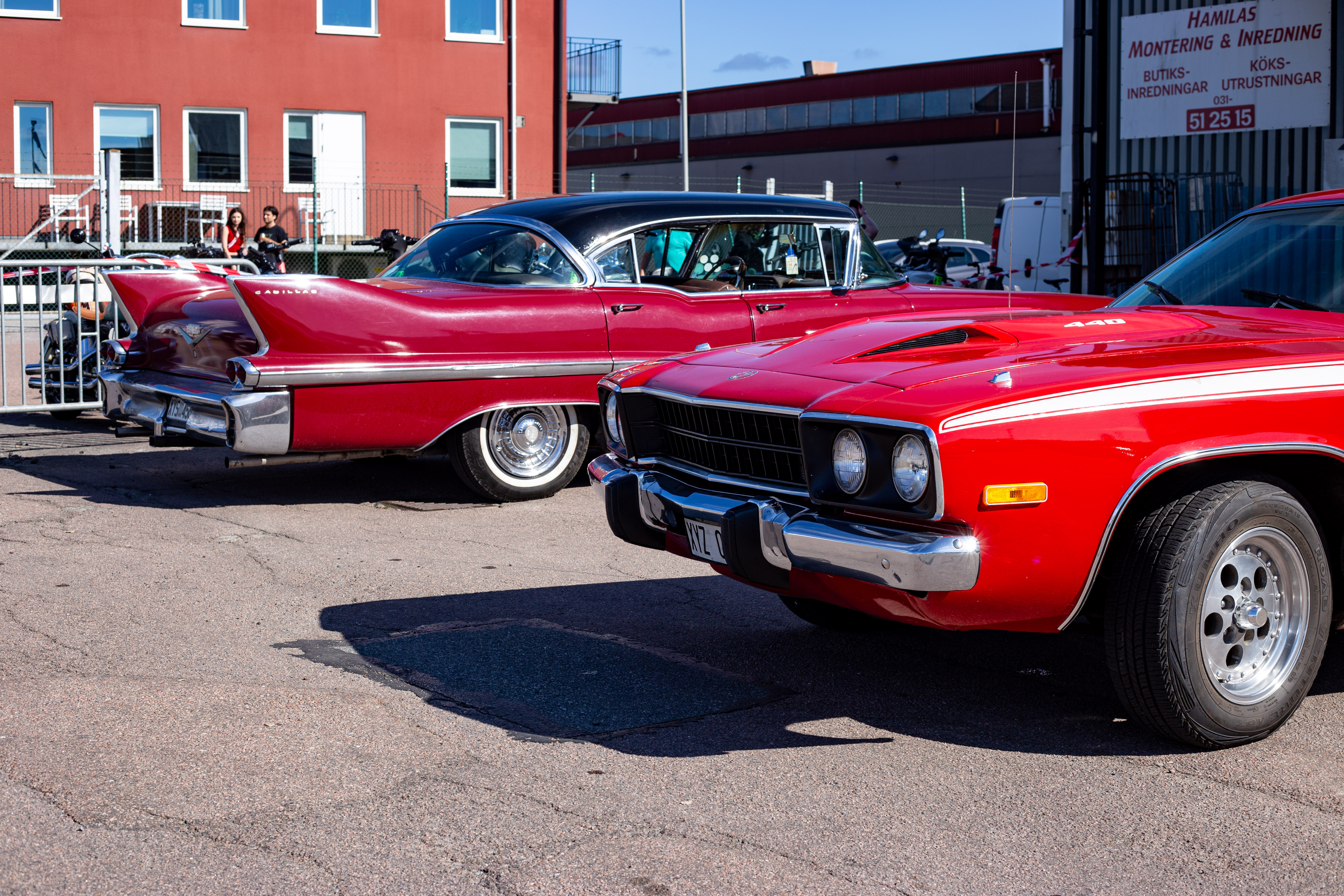 At a vintage car show, two classic cars, a white and a silver one, are parked side by side in a spacious parking lot. The white car has a chrome grille and a blue license plate, while the silver car has a chrome grille and a license plate with the number "100". The parking lot is bustling with people, and the background features a green building with a blue roof. The sky is a clear blue with a few clouds, and the overall atmosphere is lively and nostalgic.