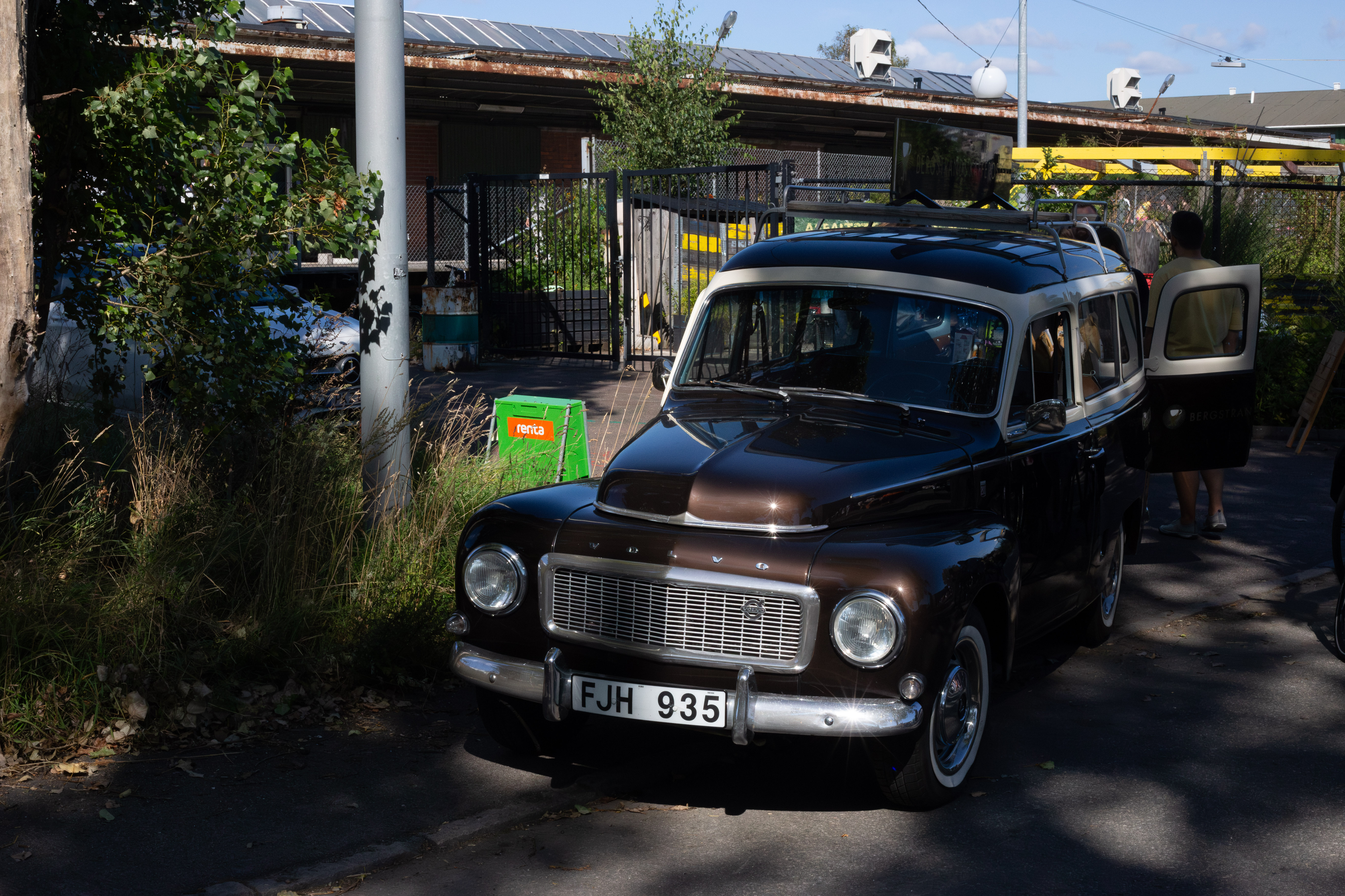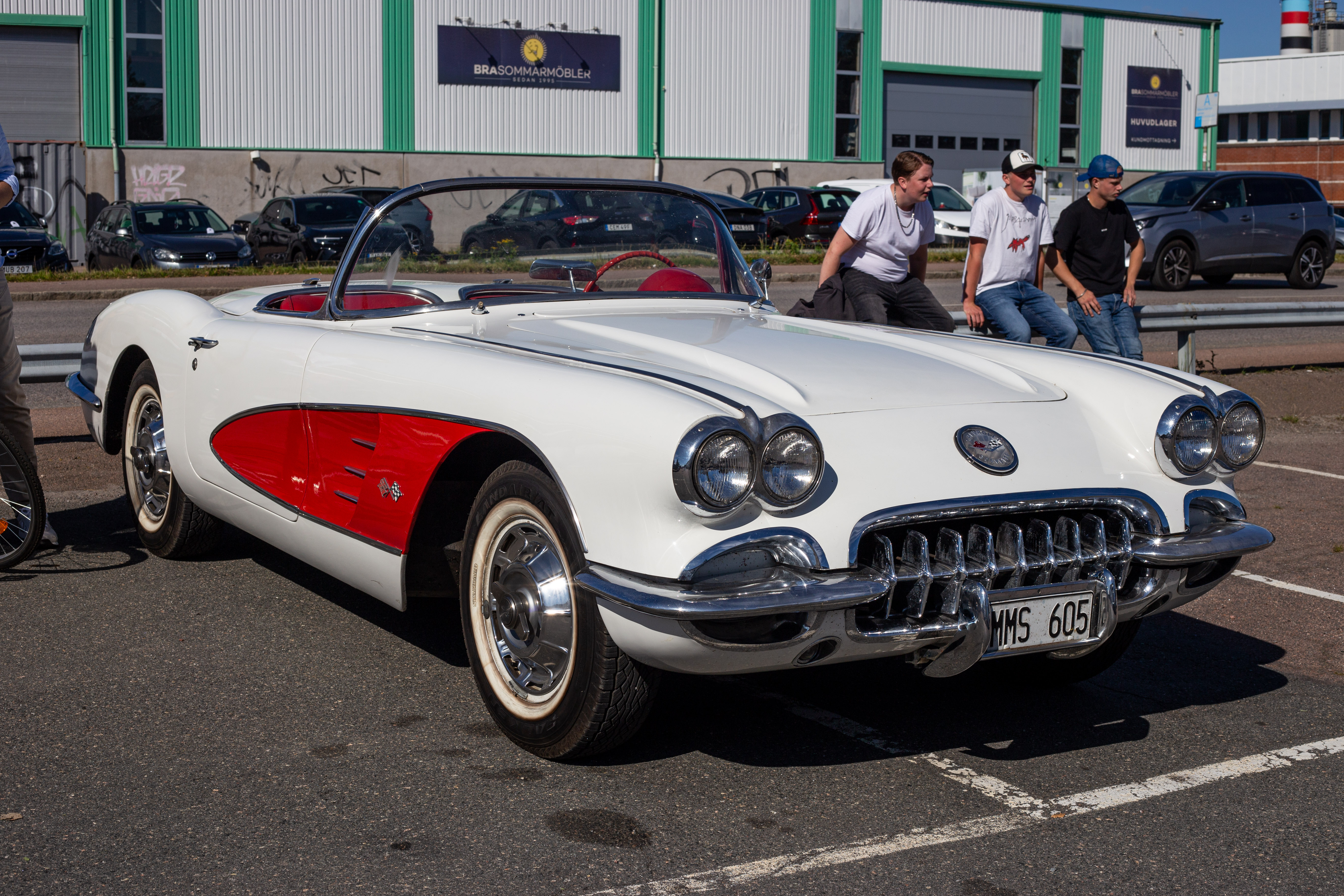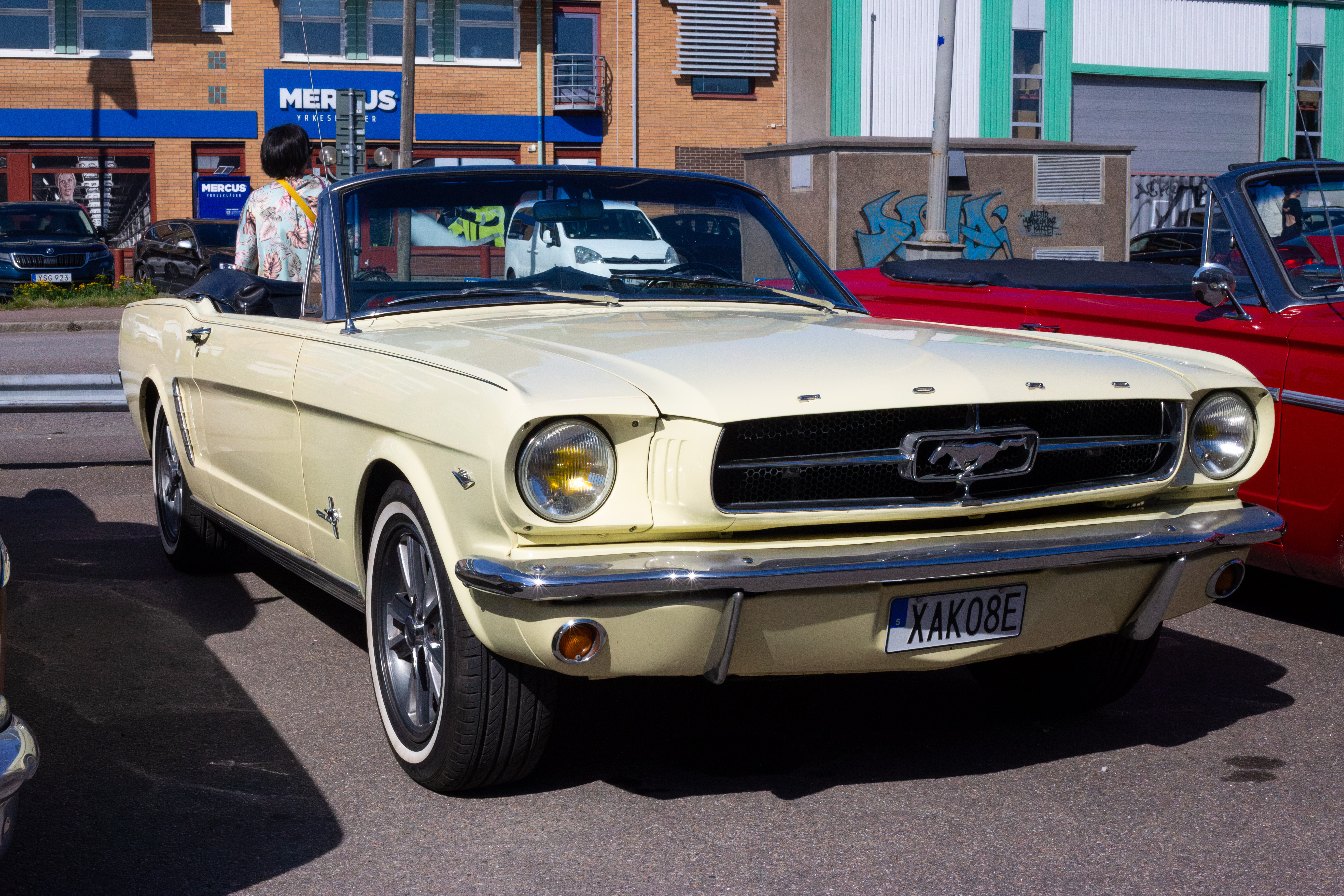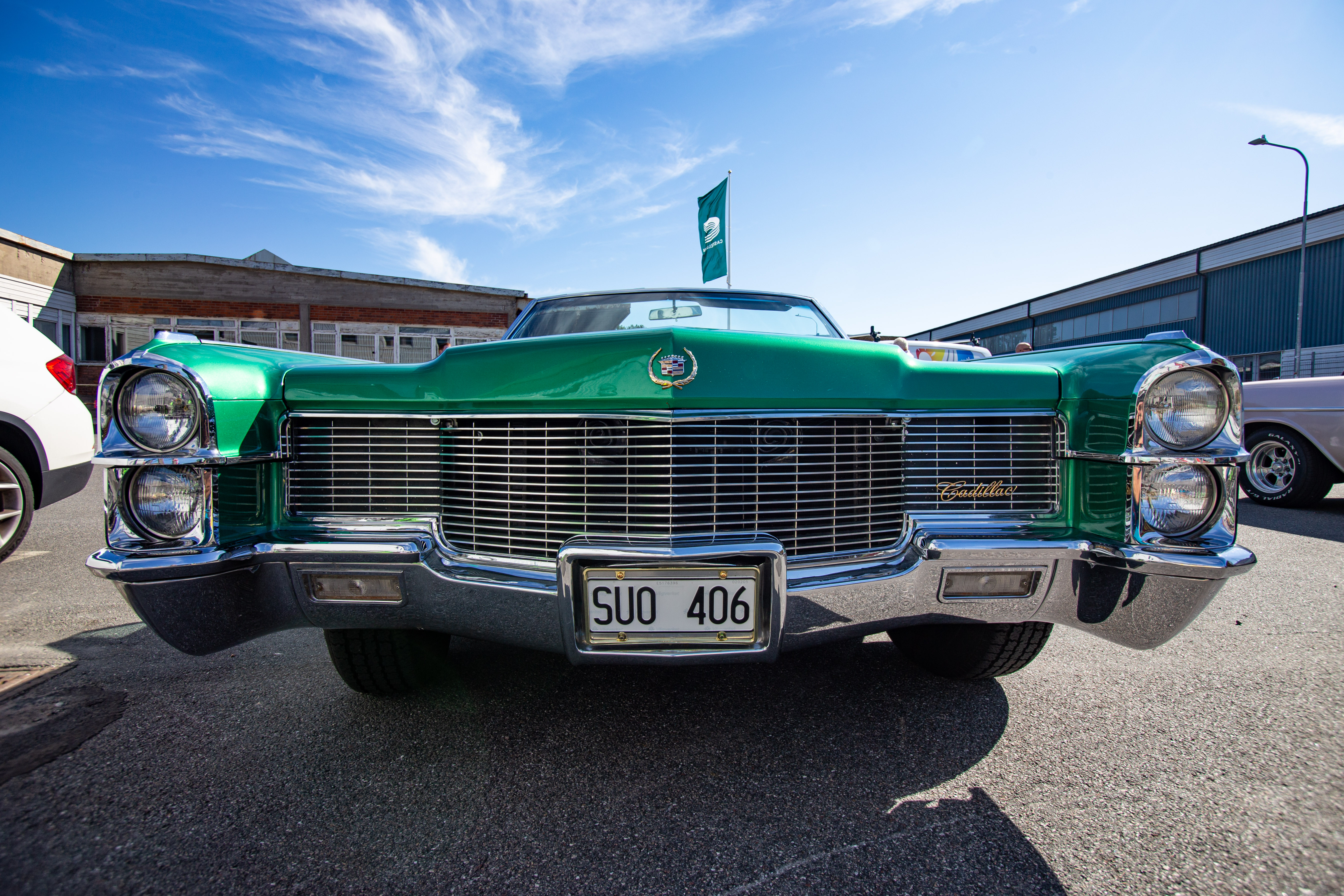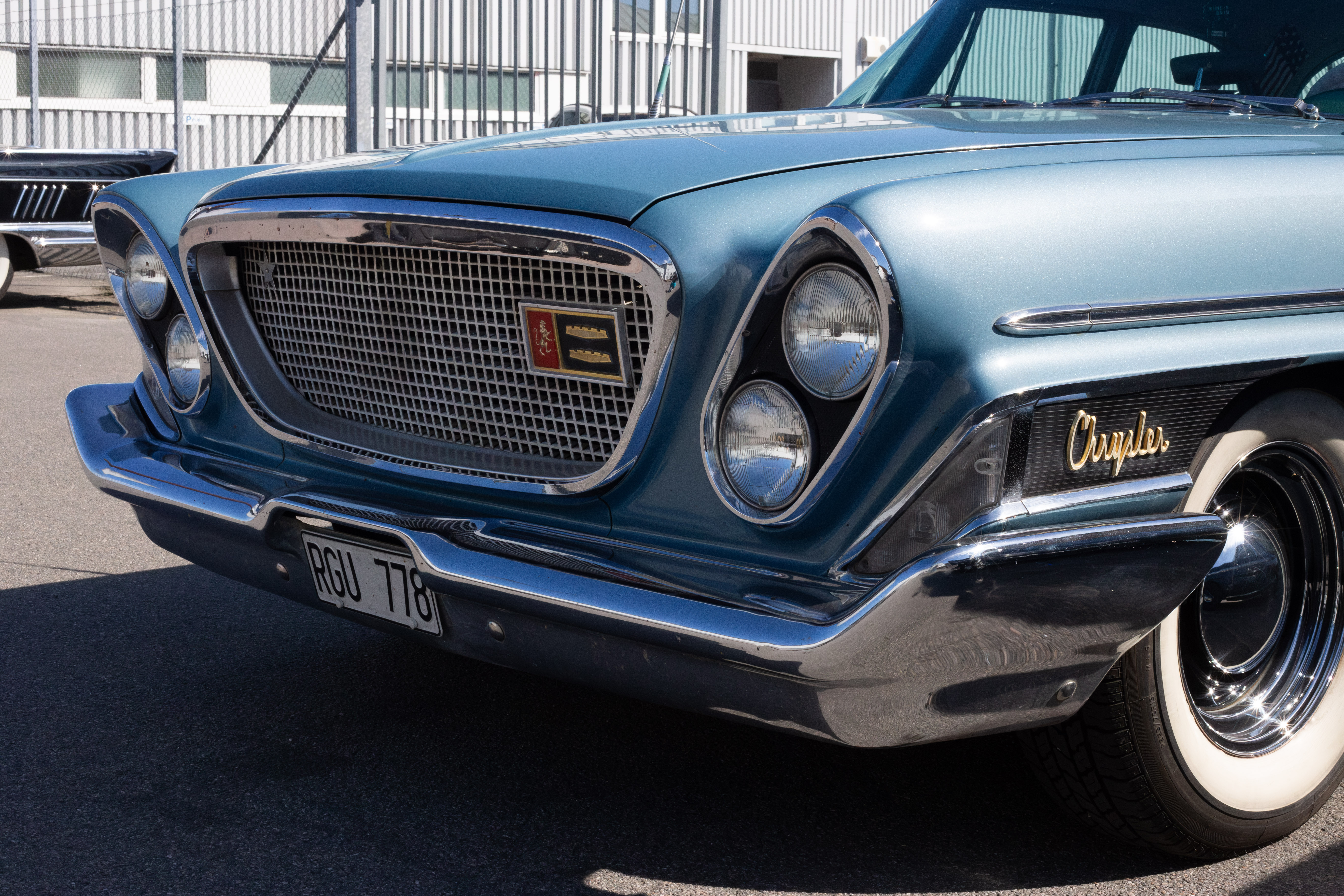 At a vintage car show, two classic cars, a white and a silver one, are parked side by side in a spacious parking lot. The white car has a chrome grille and a blue license plate, while the silver car has a chrome grille and a license plate with the number "100". The parking lot is bustling with people, and the background features a green building with a blue roof. The sky is a clear blue with a few clouds, and the overall atmosphere is lively and nostalgic.