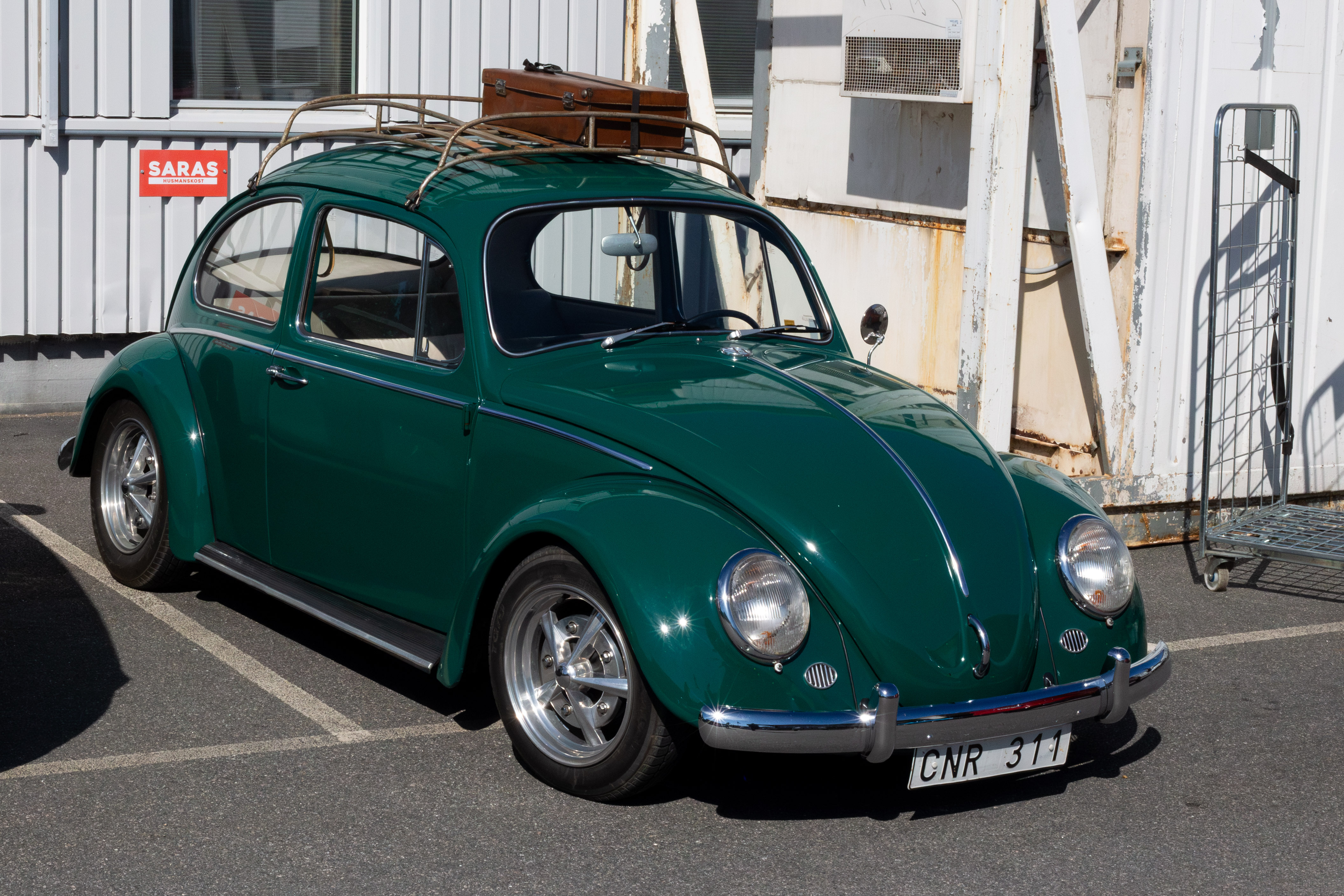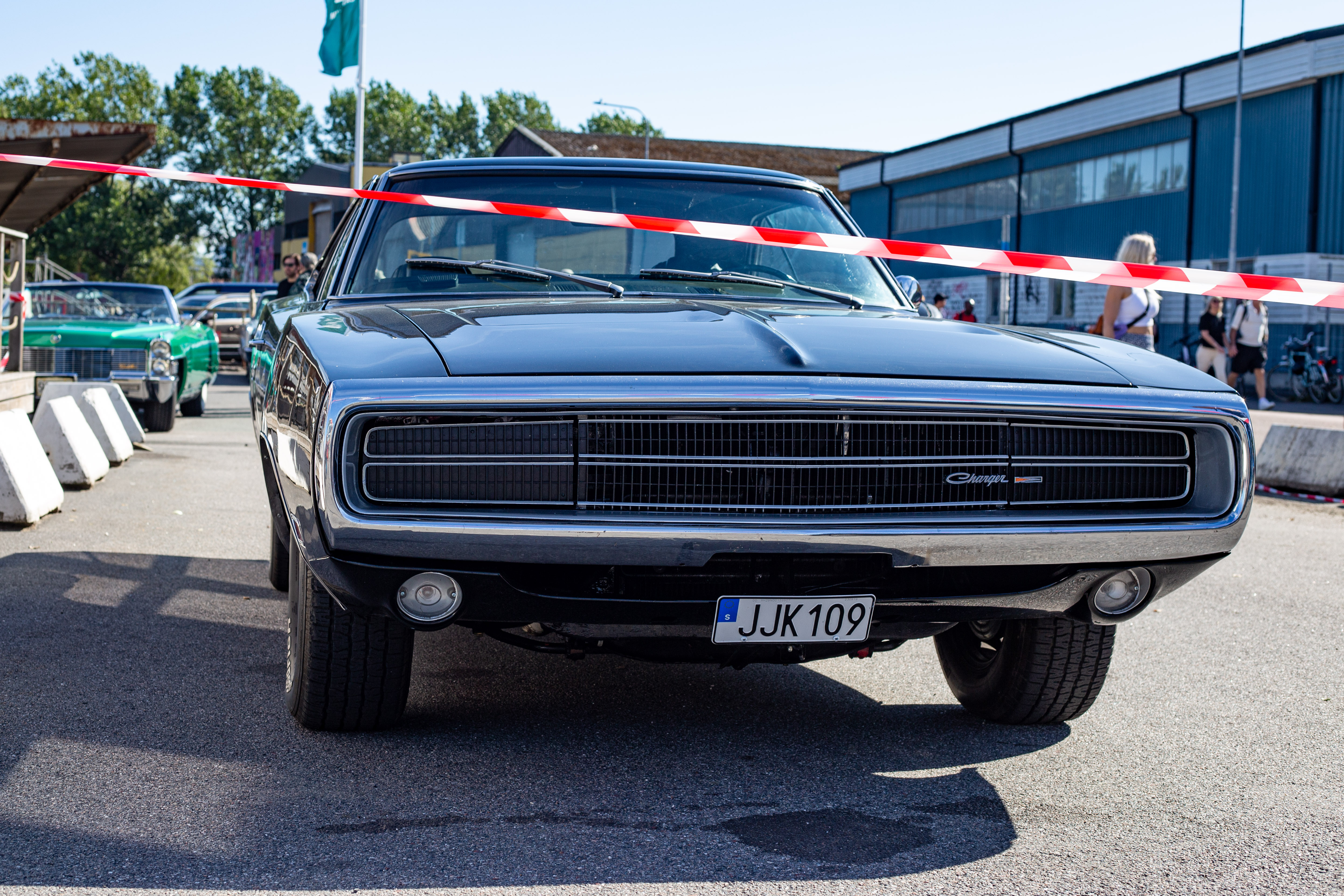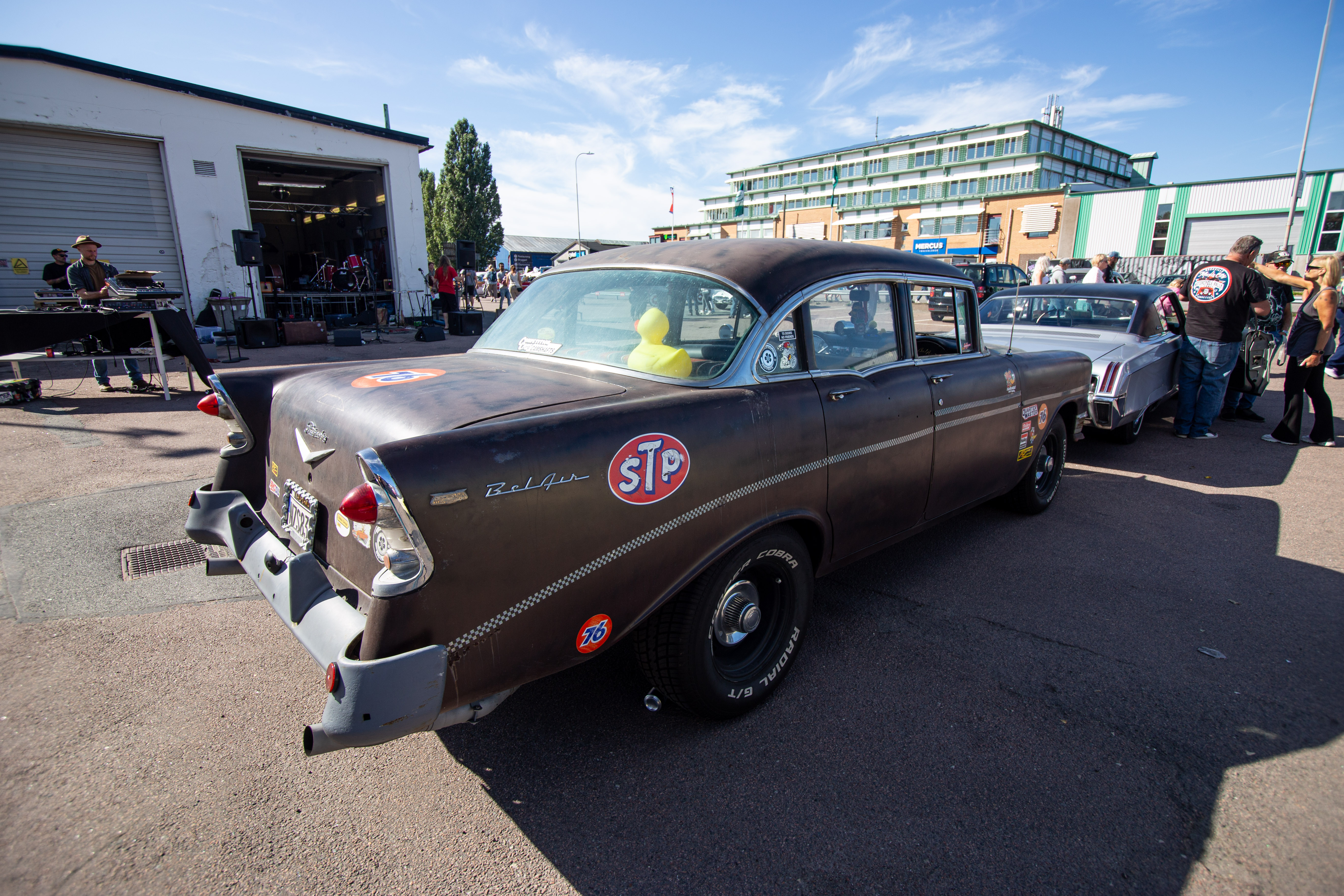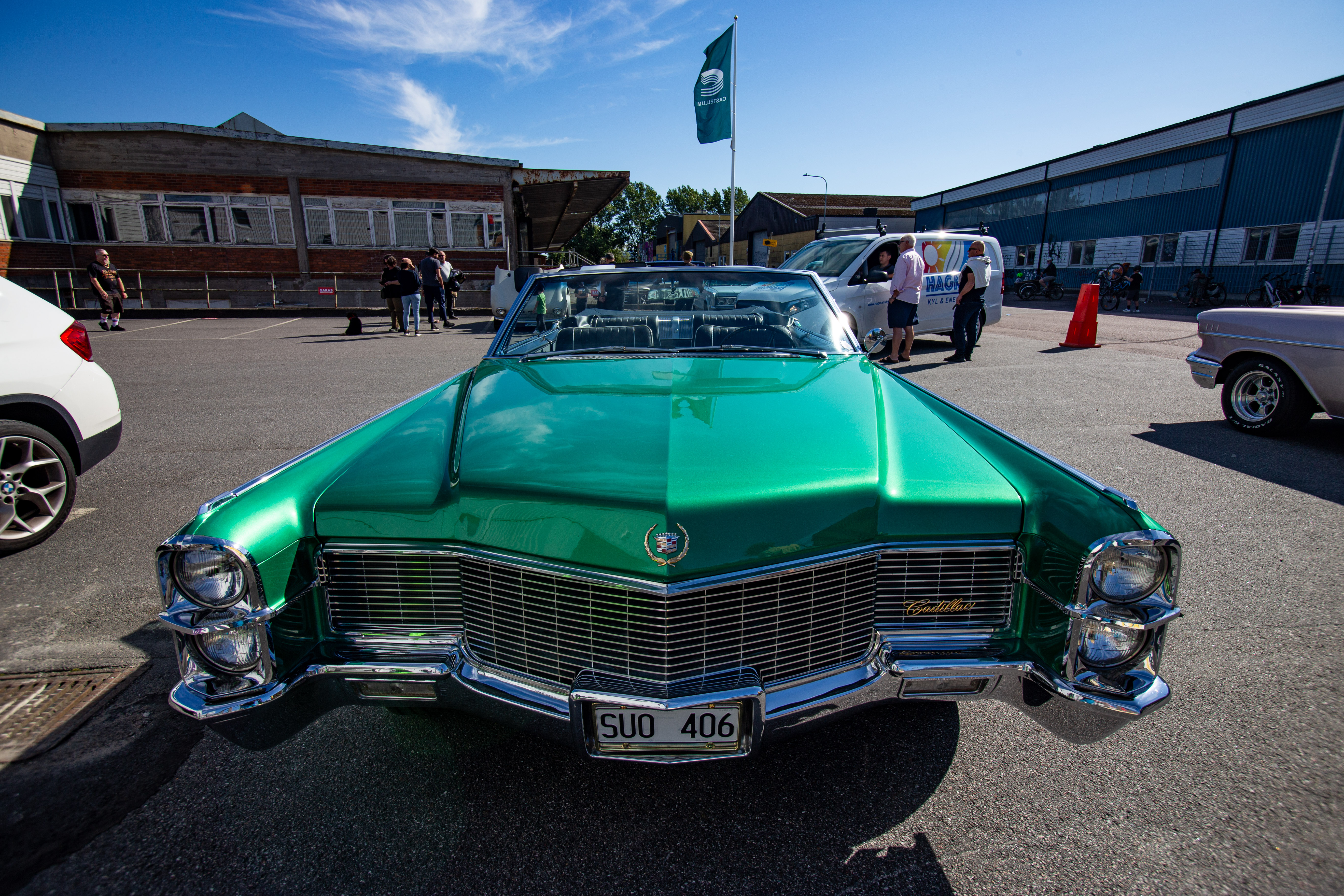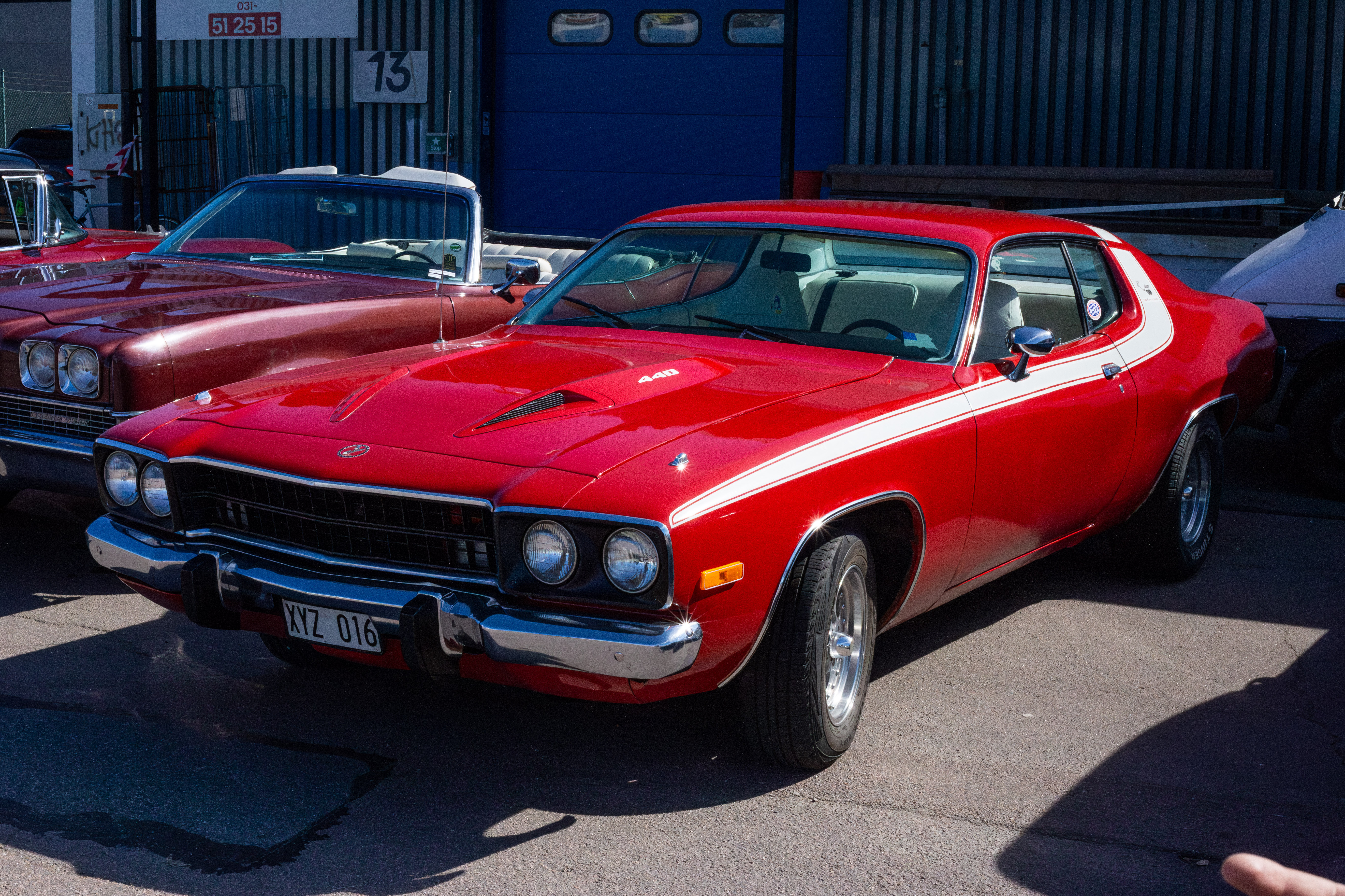At a vintage car show, two classic cars, a white and a silver one, are parked side by side in a spacious parking lot. The white car has a chrome grille and a blue license plate, while the silver car has a chrome grille and a license plate with the number "100". The parking lot is bustling with people, and the background features a green building with a blue roof. The sky is a clear blue with a few clouds, and the overall atmosphere is lively and nostalgic.