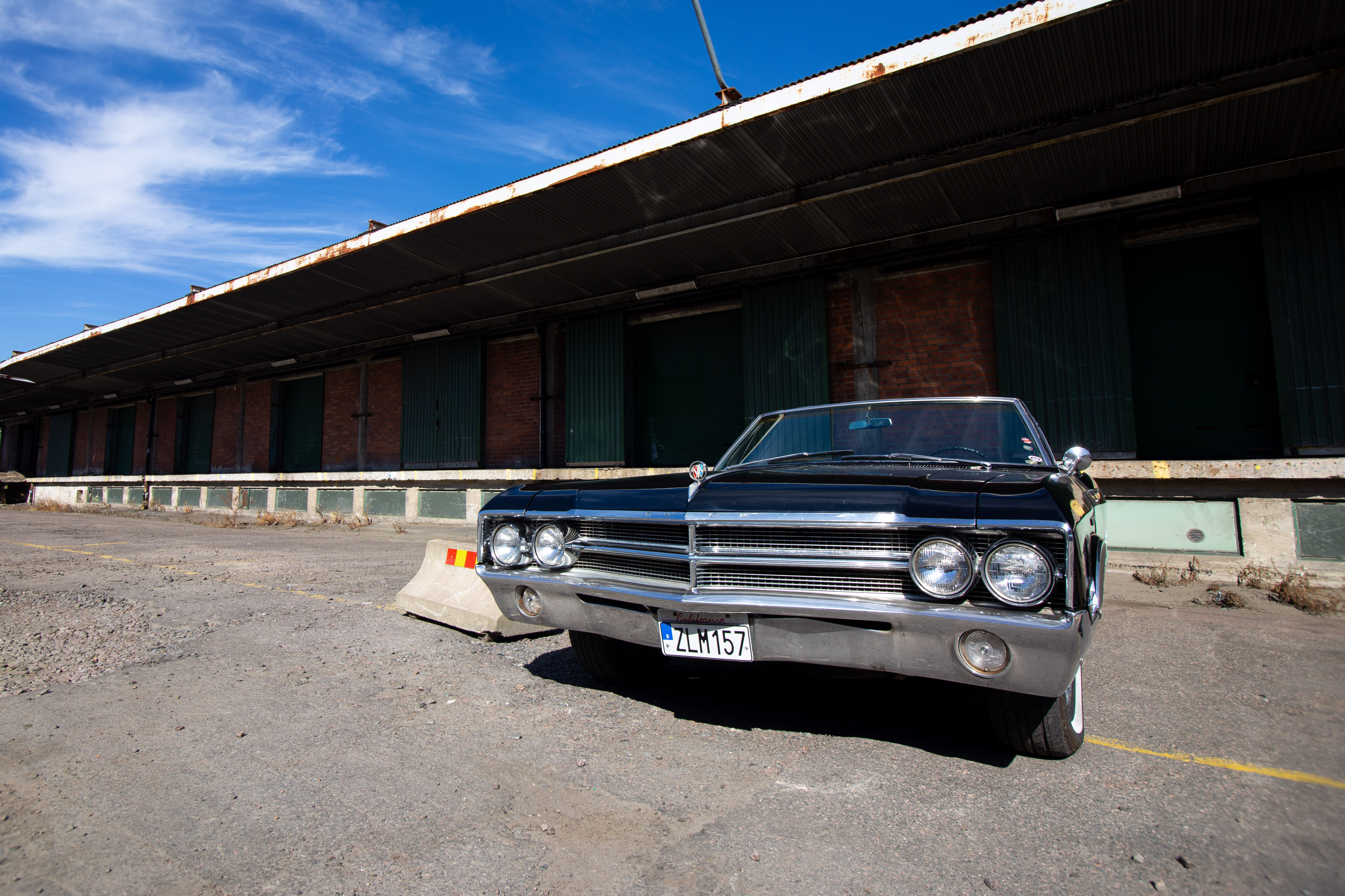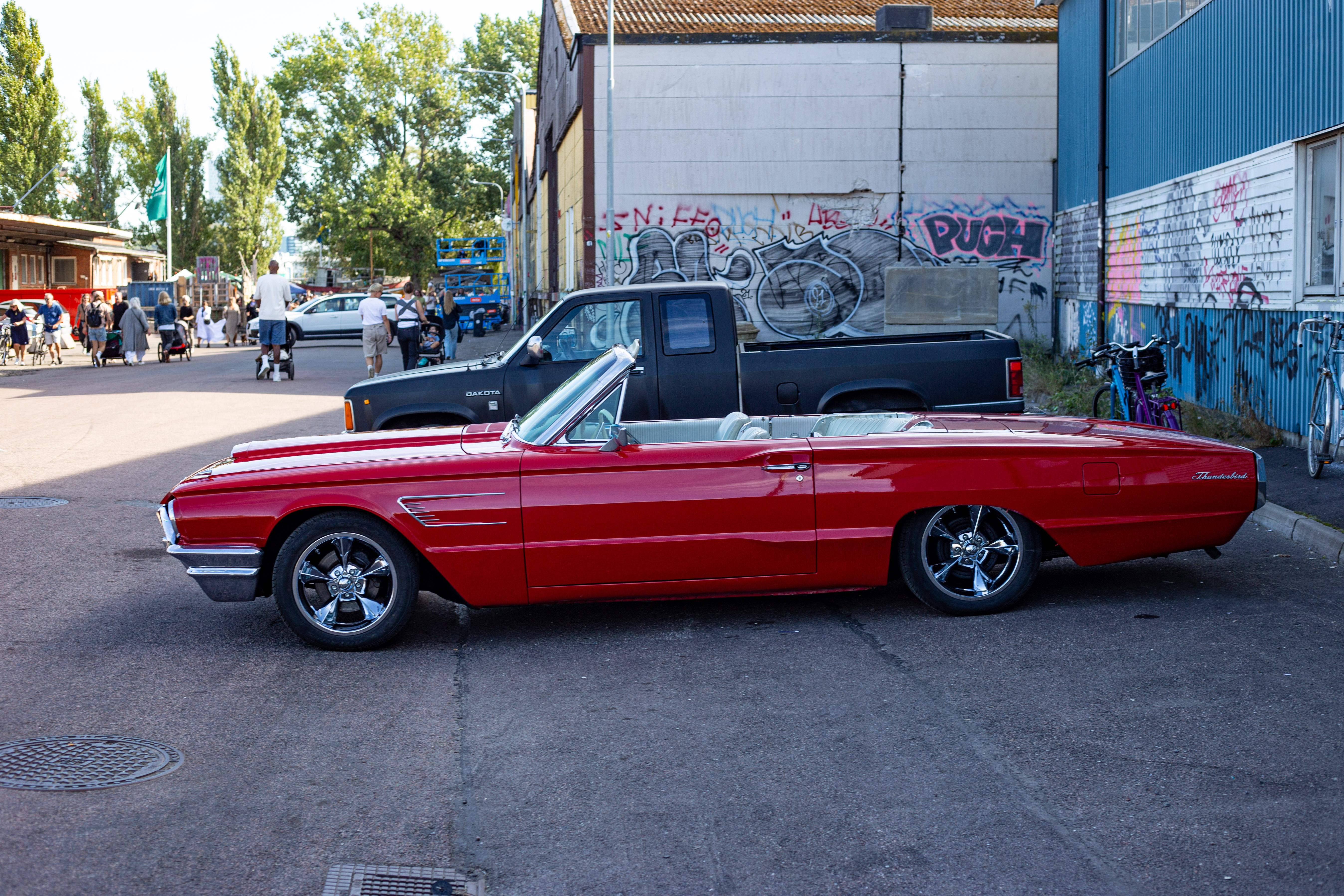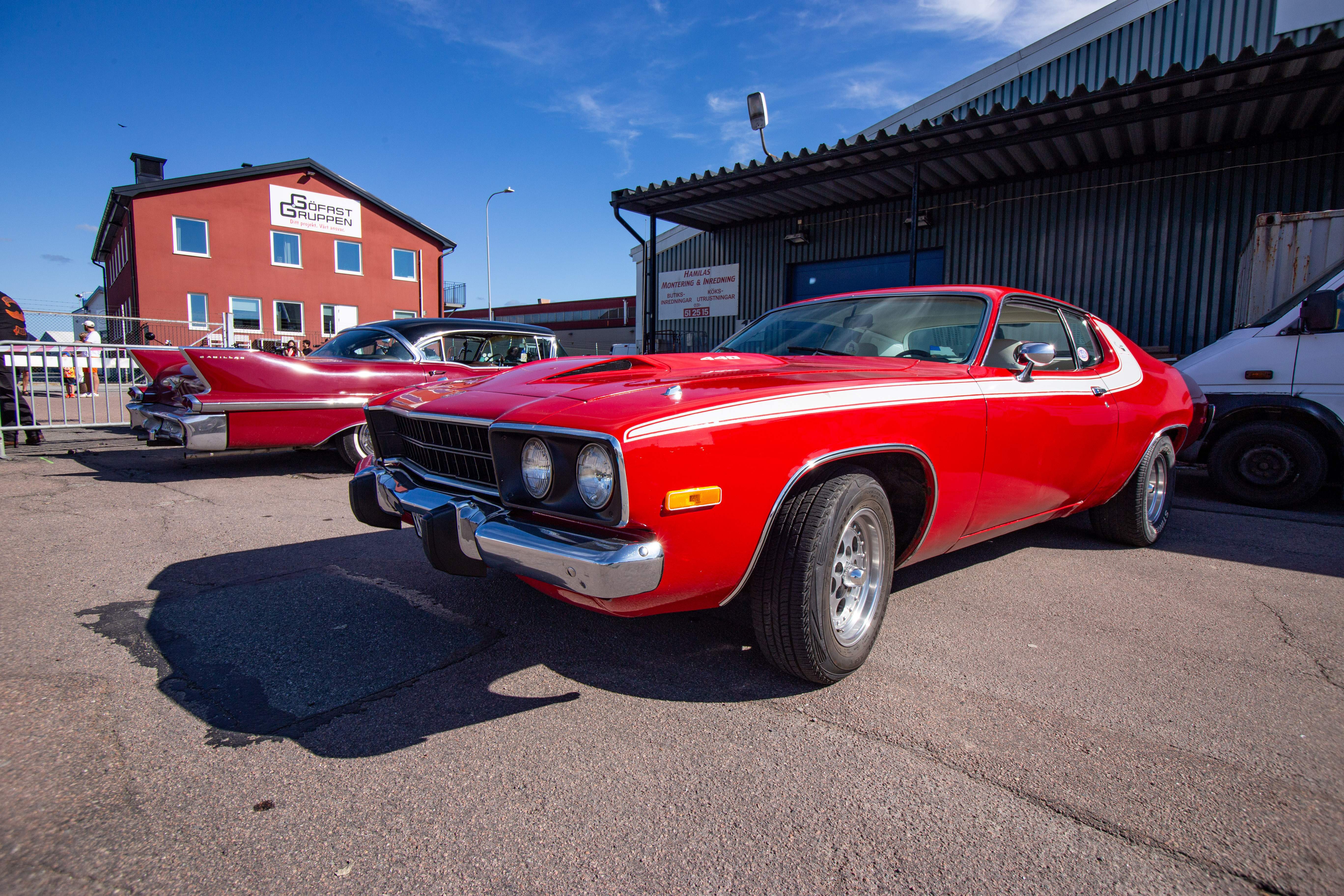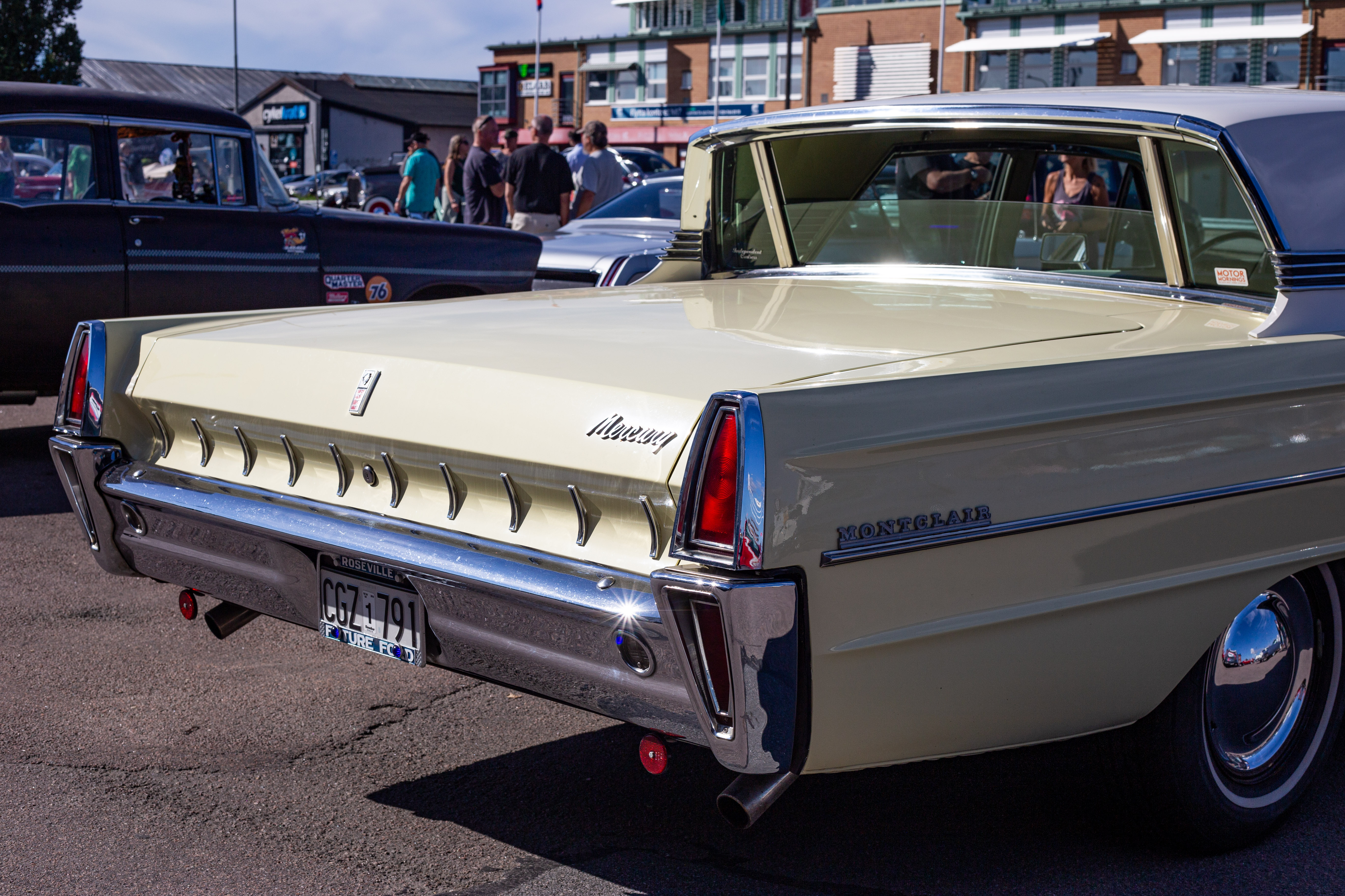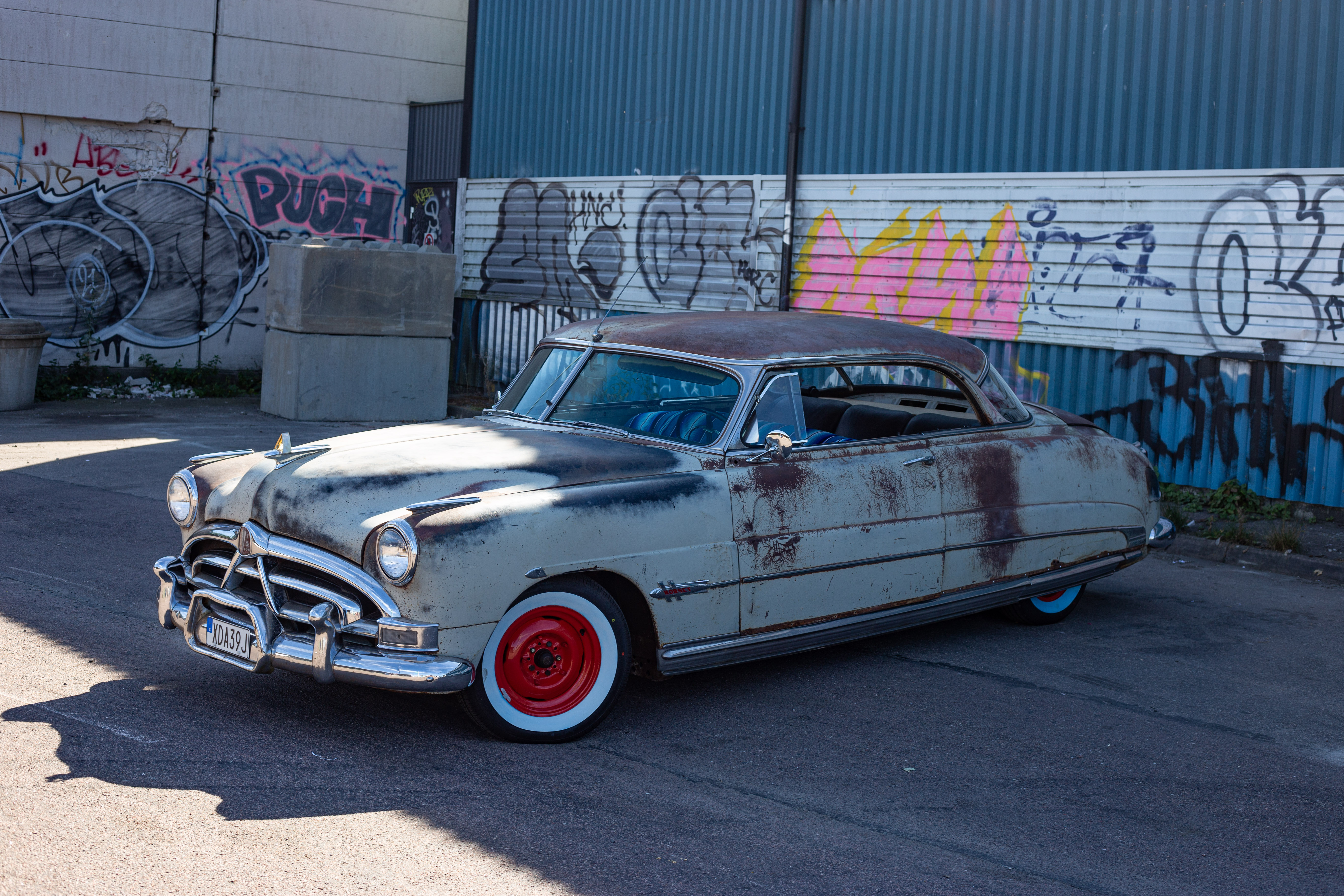 At a vintage car show, two classic cars, a white and a silver one, are parked side by side in a spacious parking lot. The white car has a chrome grille and a blue license plate, while the silver car has a chrome grille and a license plate with the number "100". The parking lot is bustling with people, and the background features a green building with a blue roof. The sky is a clear blue with a few clouds, and the overall atmosphere is lively and nostalgic.