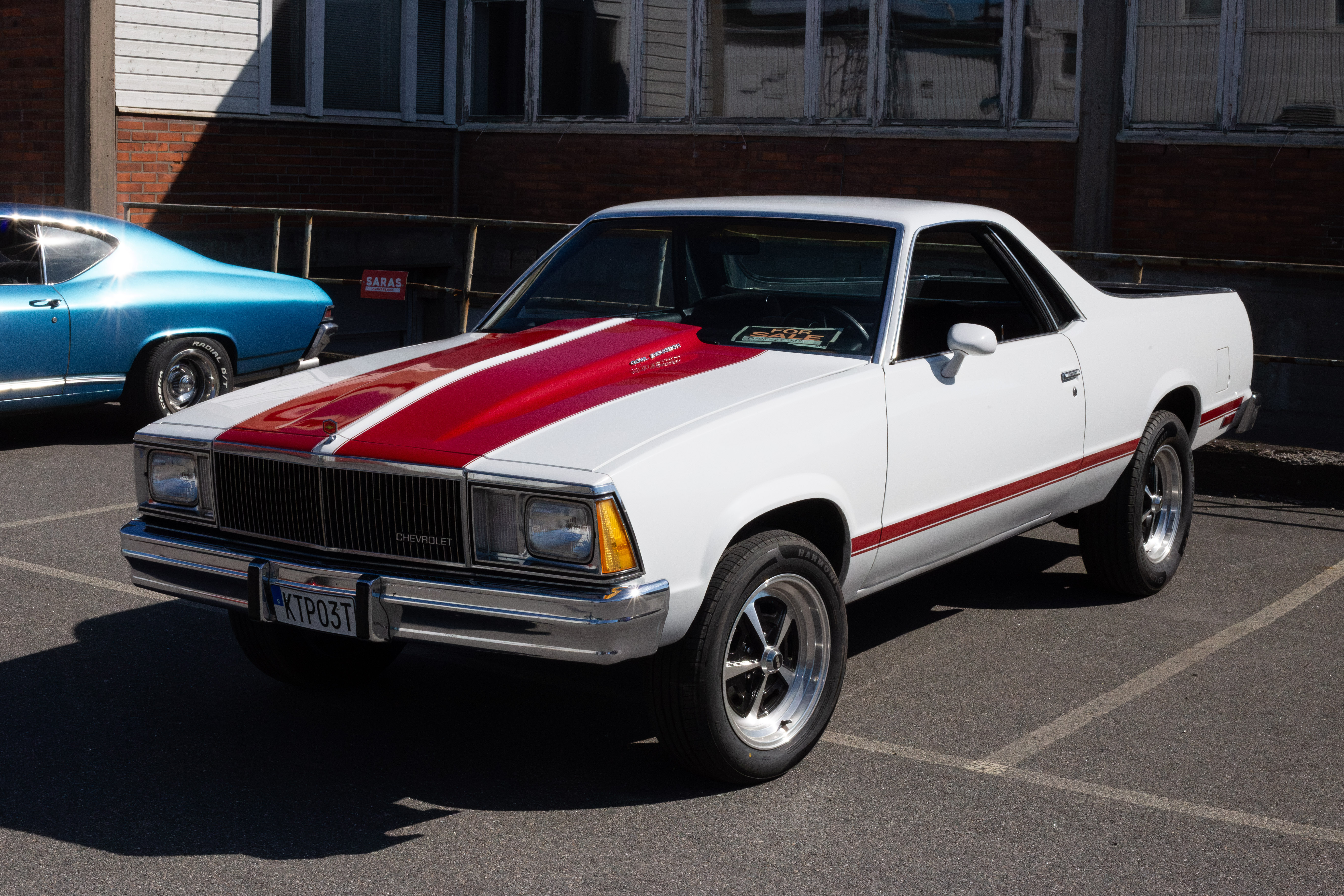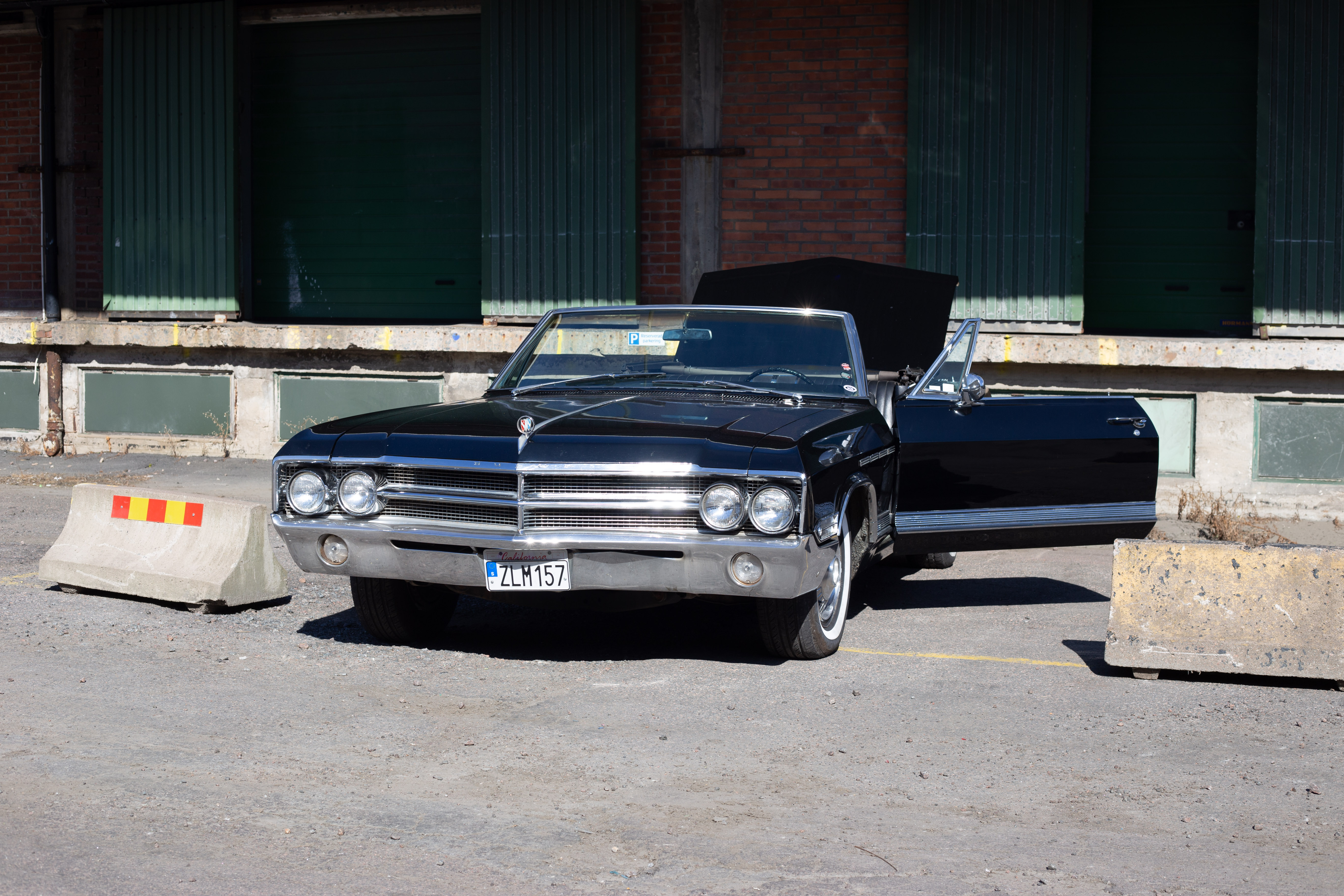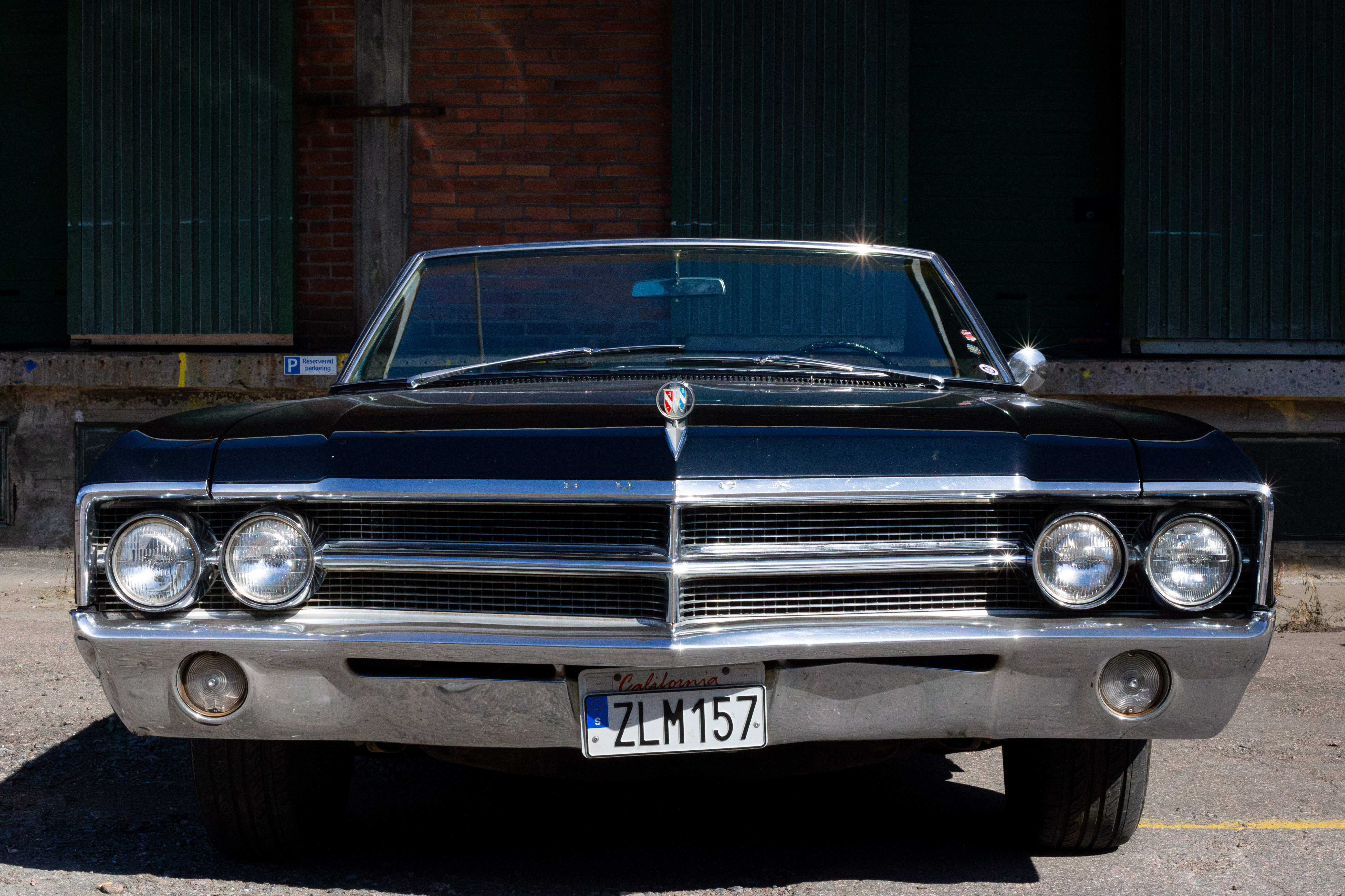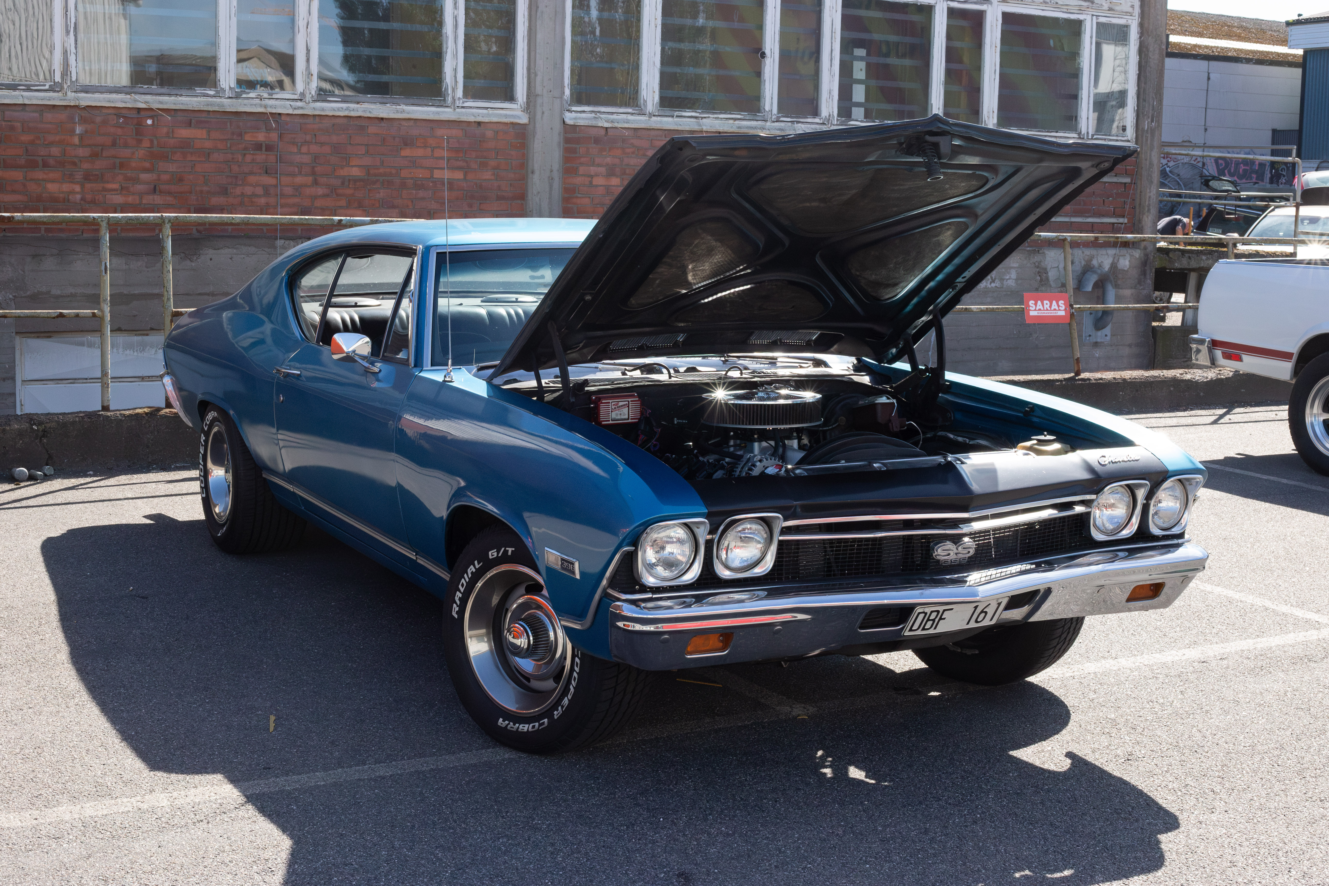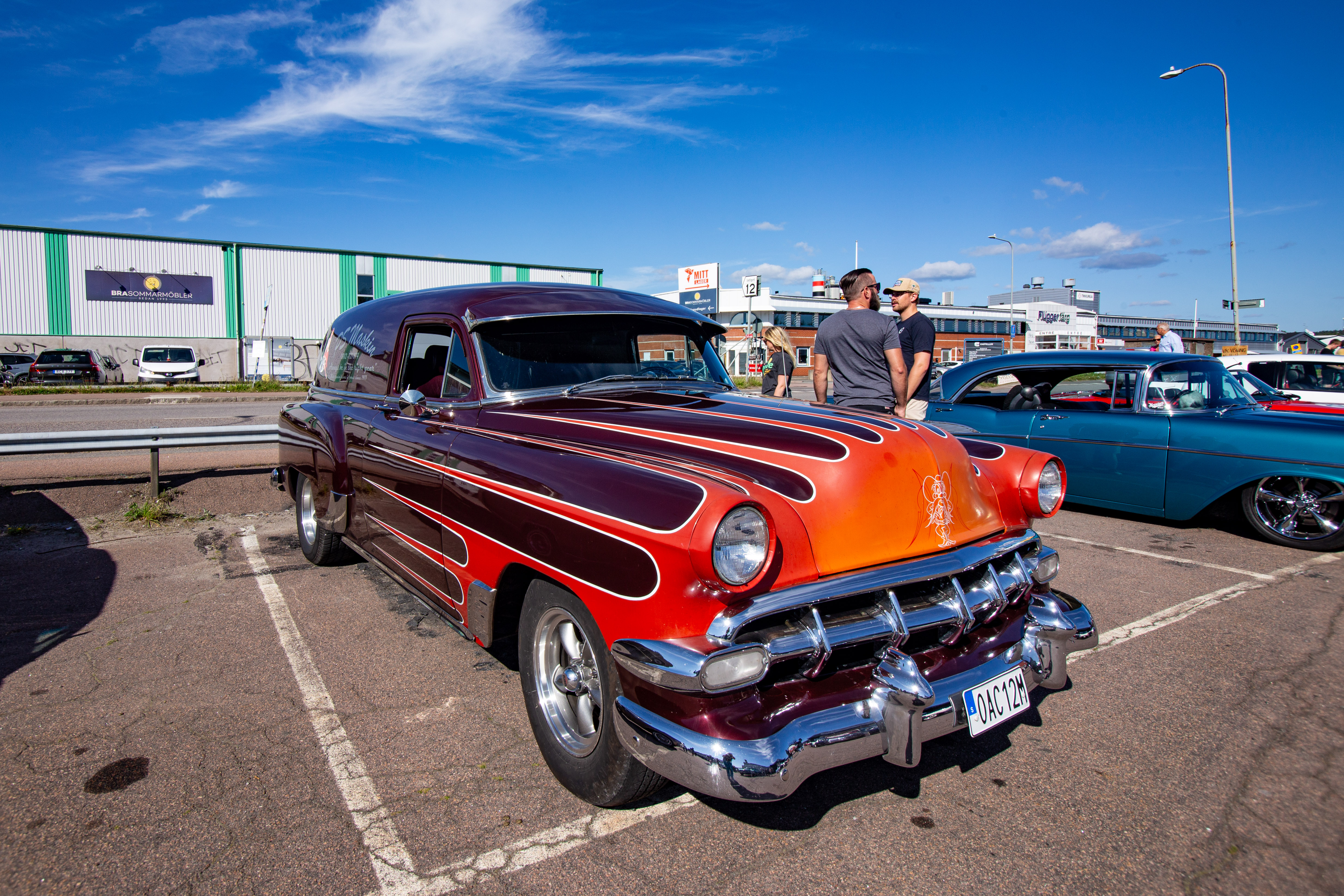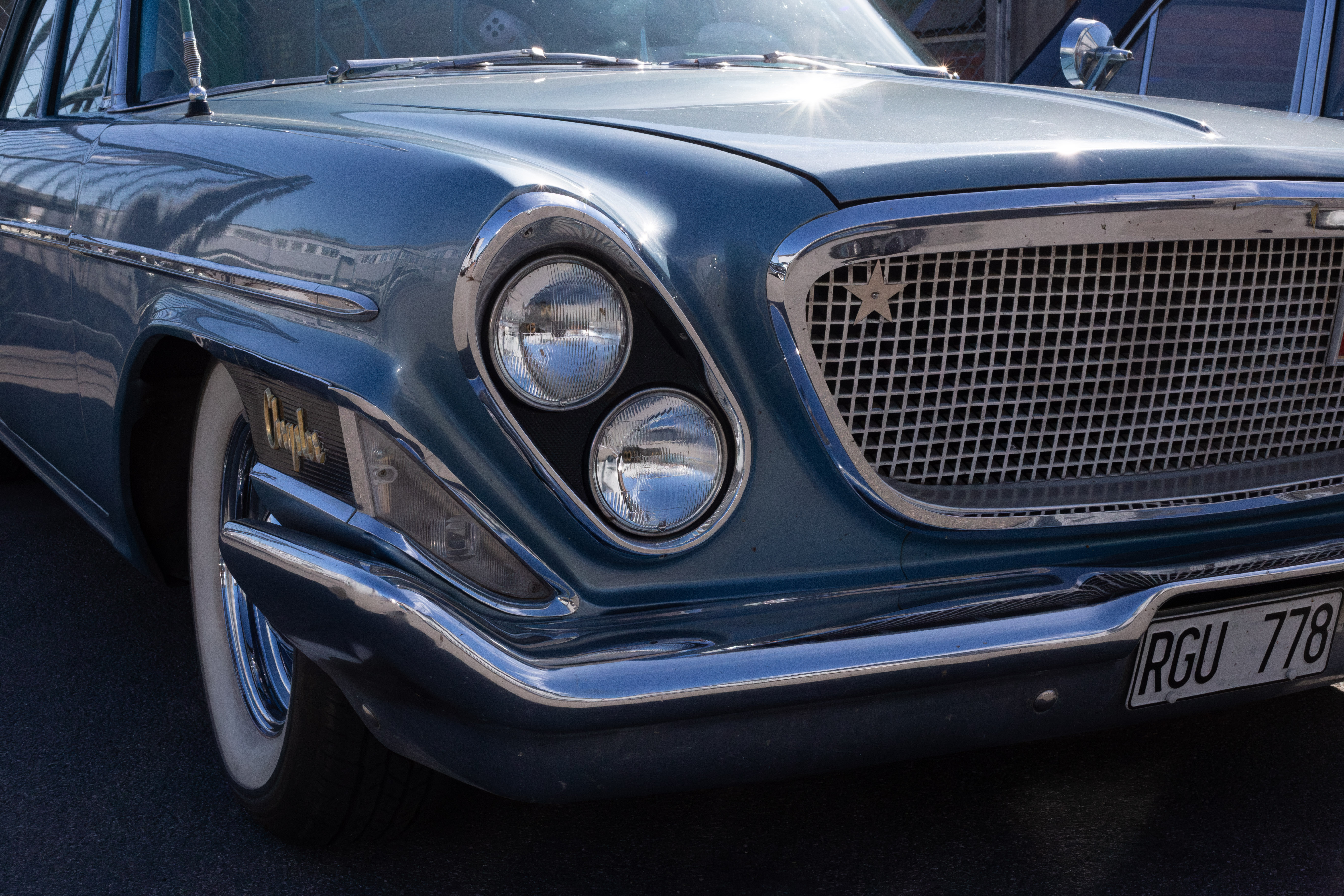 At a vintage car show, two classic cars, a white and a silver one, are parked side by side in a spacious parking lot. The white car has a chrome grille and a blue license plate, while the silver car has a chrome grille and a license plate with the number "100". The parking lot is bustling with people, and the background features a green building with a blue roof. The sky is a clear blue with a few clouds, and the overall atmosphere is lively and nostalgic.