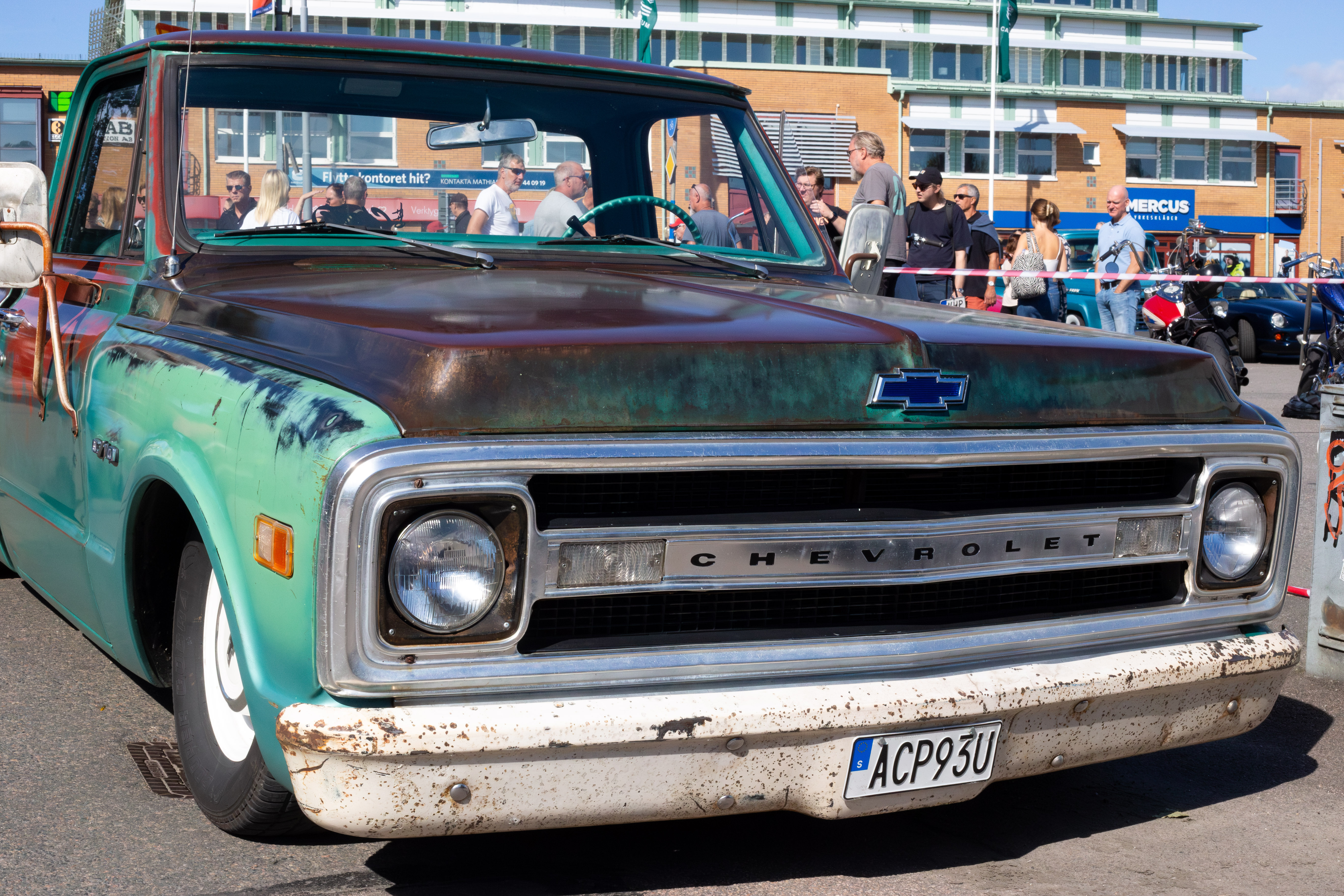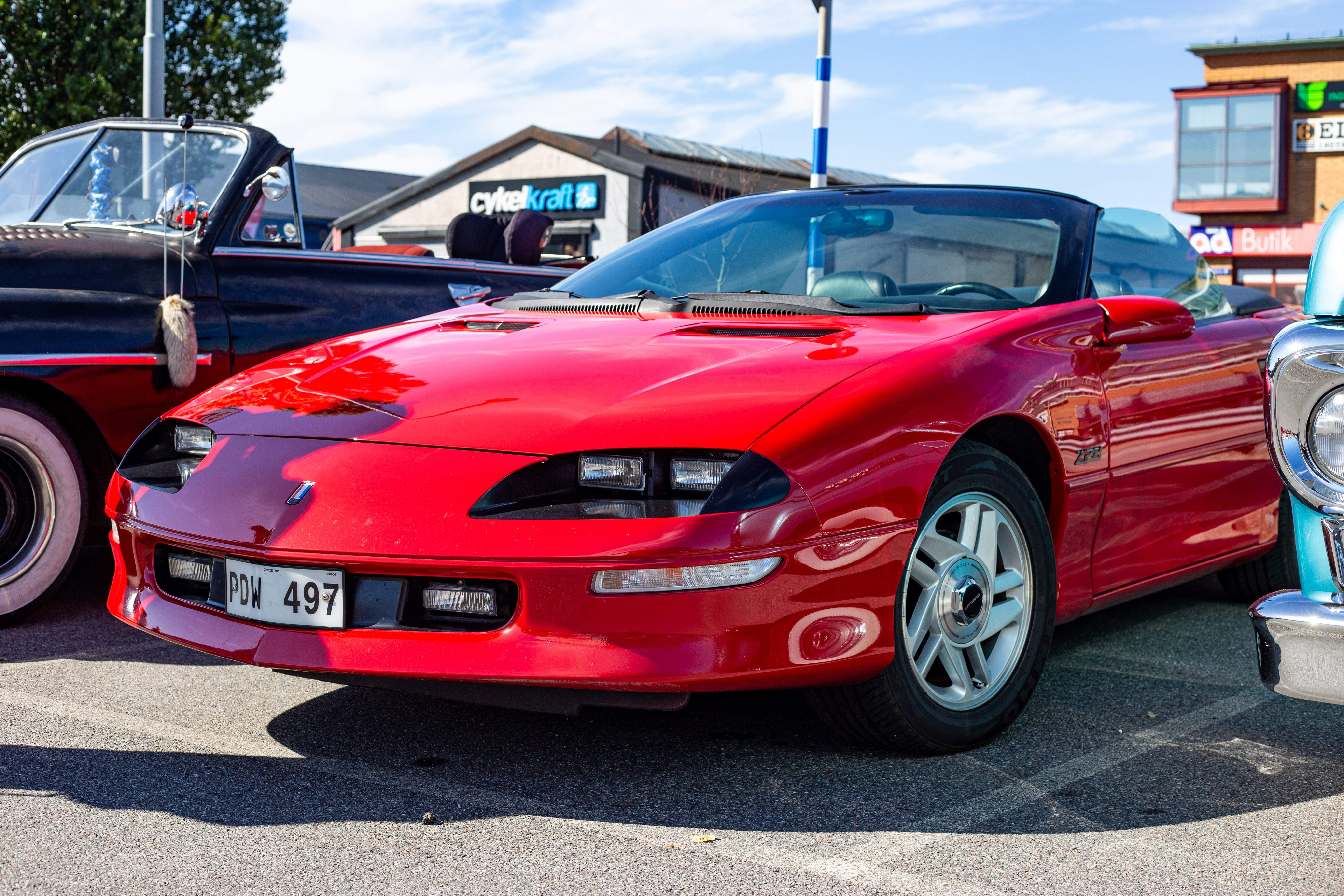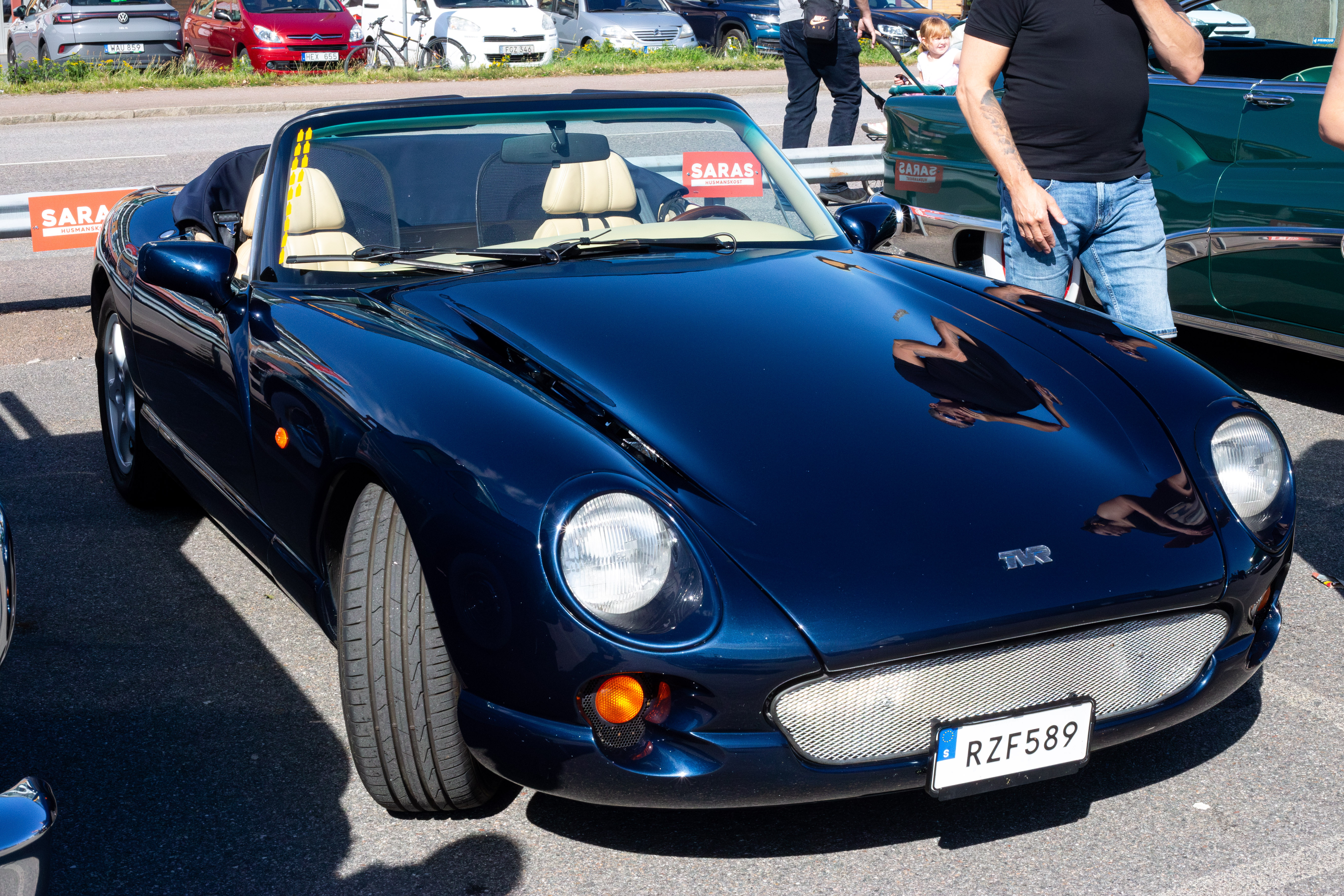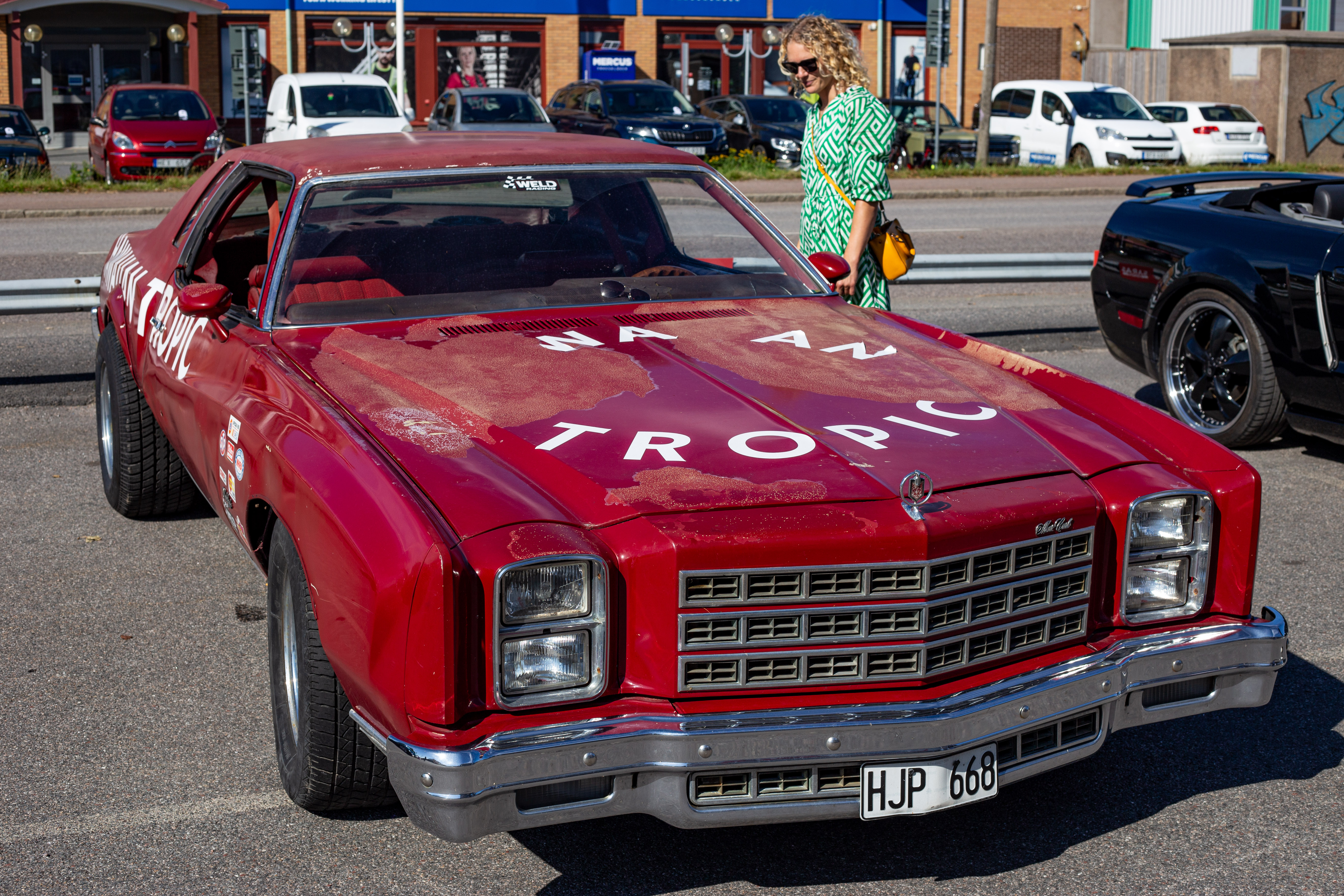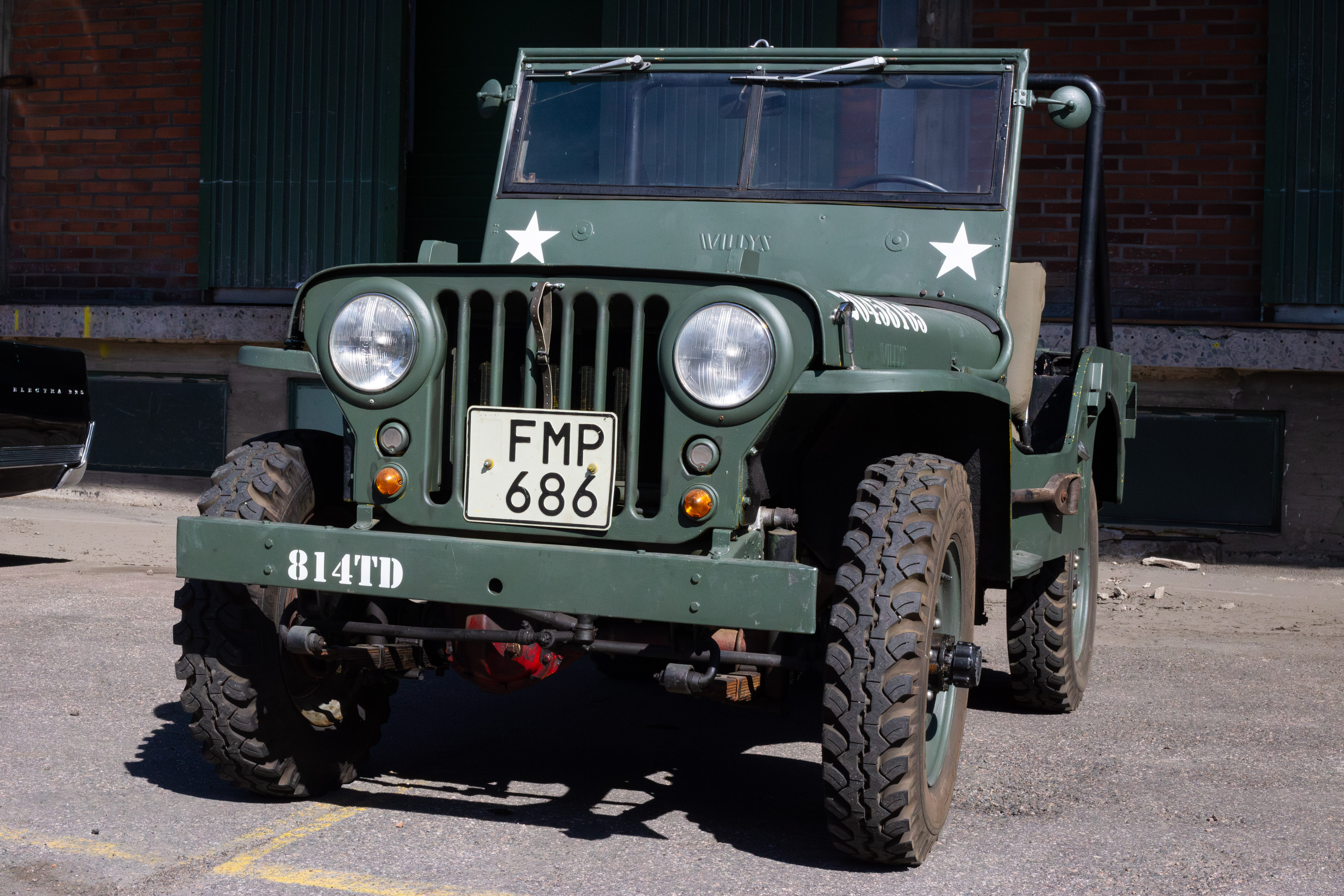 At a vintage car show, two classic cars, a white and a silver one, are parked side by side in a spacious parking lot. The white car has a chrome grille and a blue license plate, while the silver car has a chrome grille and a license plate with the number "100". The parking lot is bustling with people, and the background features a green building with a blue roof. The sky is a clear blue with a few clouds, and the overall atmosphere is lively and nostalgic.