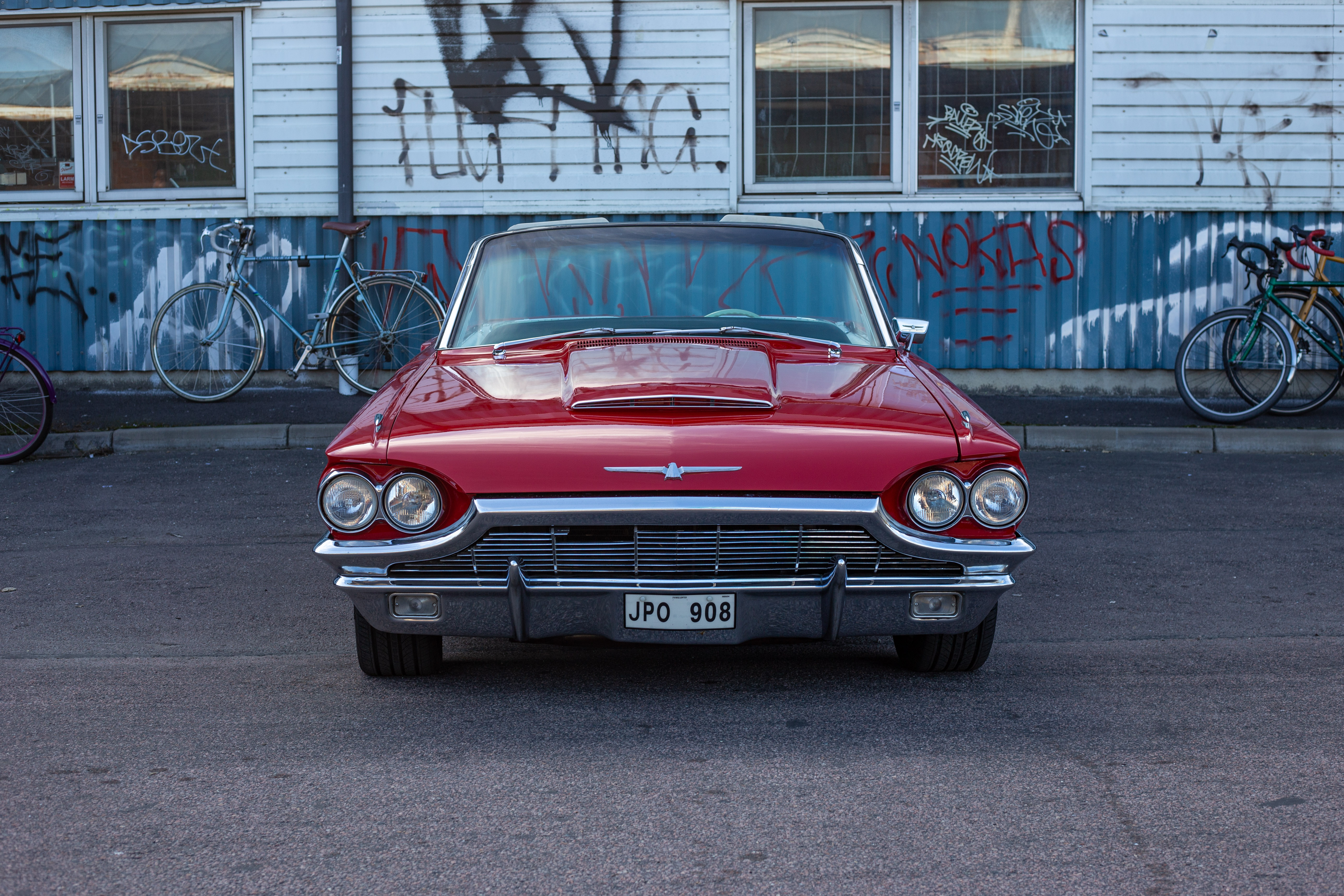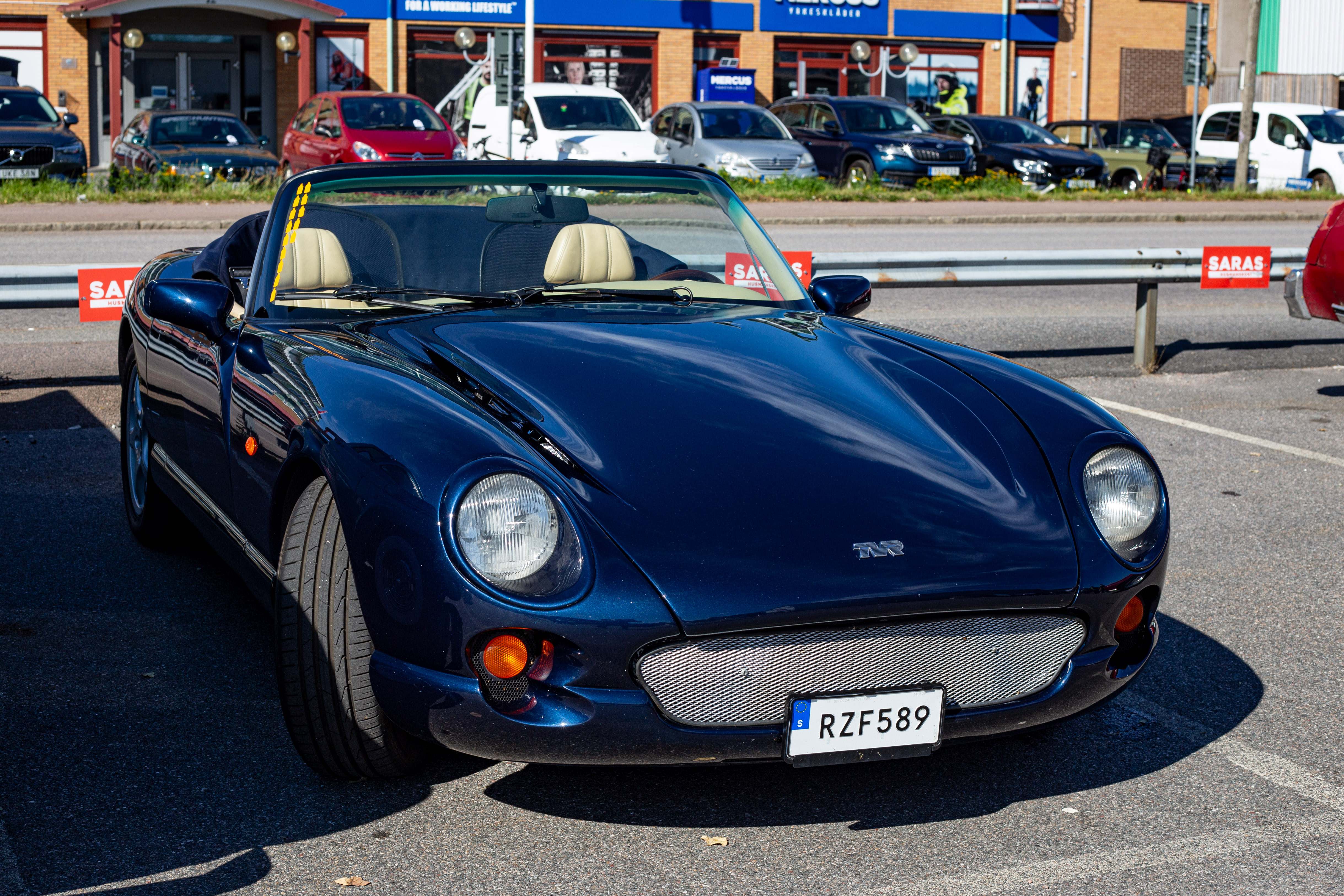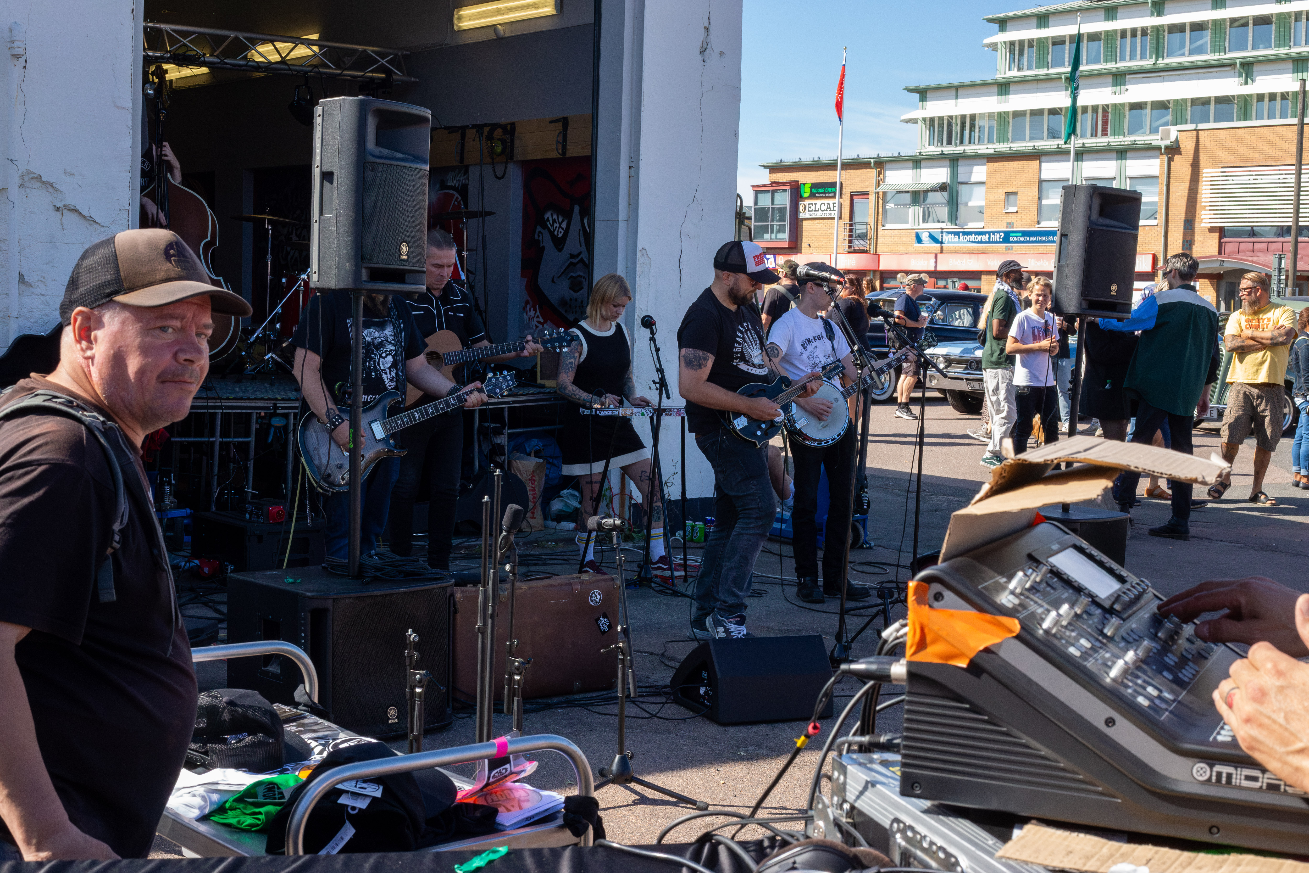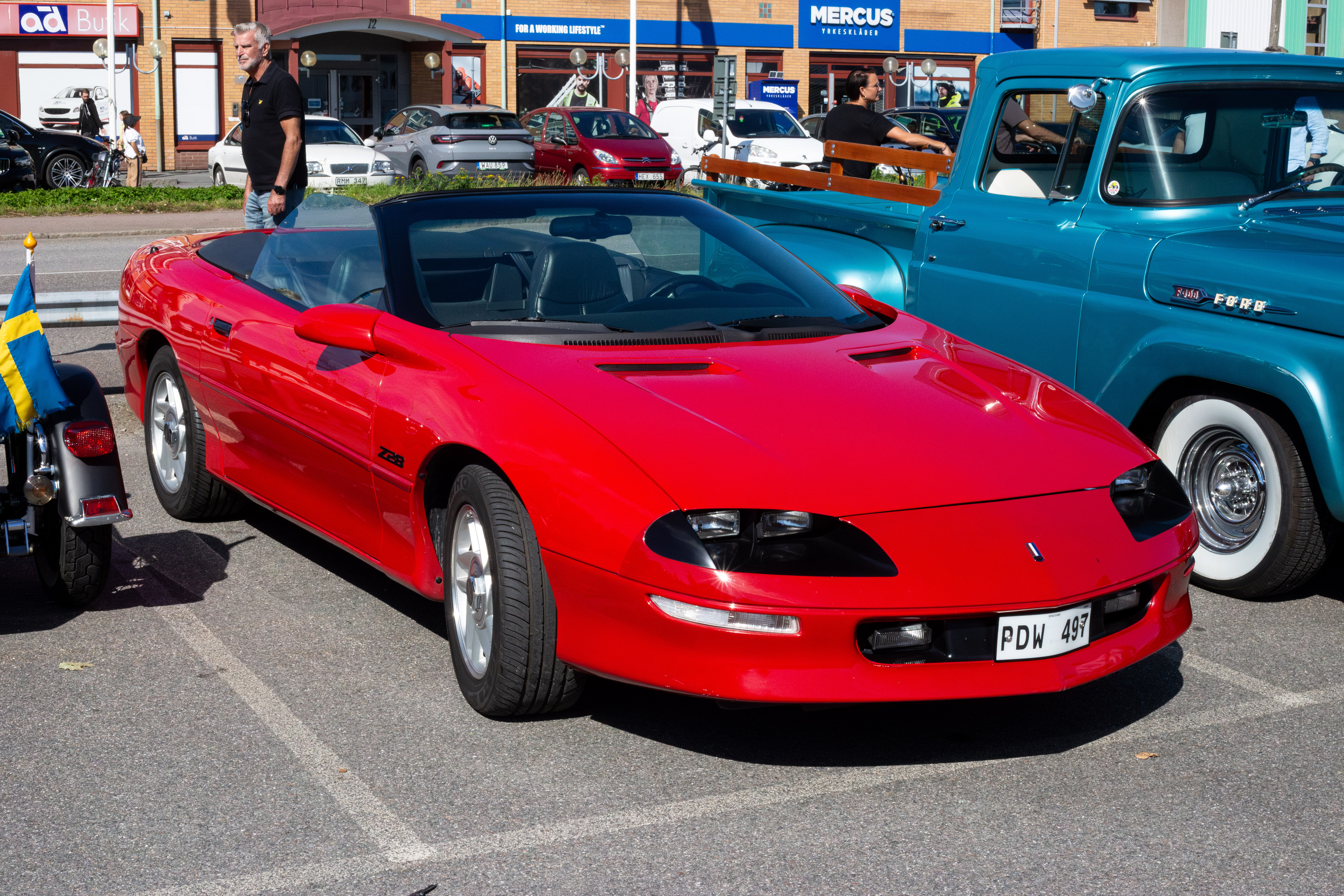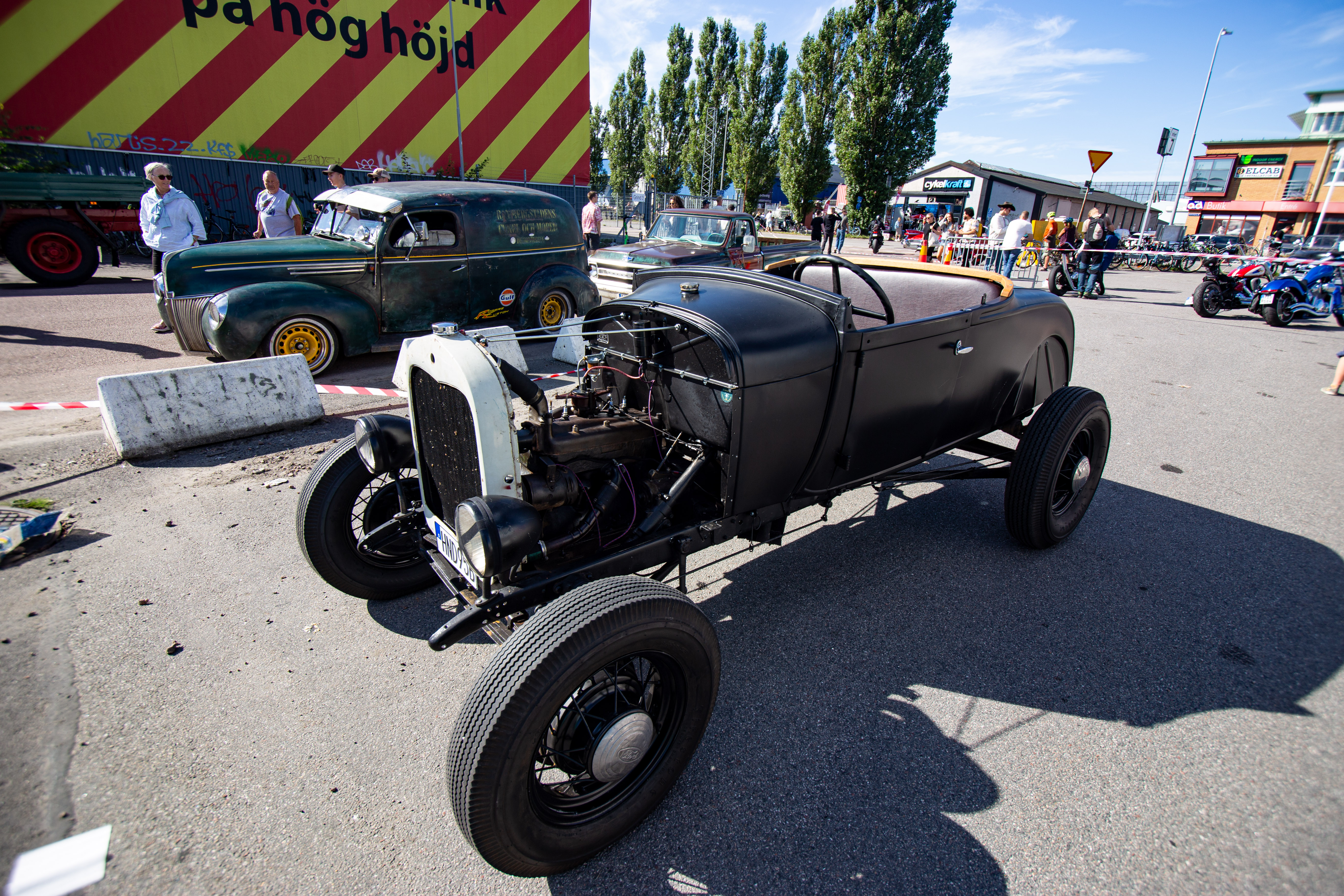 At a vintage car show, two classic cars, a white and a silver one, are parked side by side in a spacious parking lot. The white car has a chrome grille and a blue license plate, while the silver car has a chrome grille and a license plate with the number "100". The parking lot is bustling with people, and the background features a green building with a blue roof. The sky is a clear blue with a few clouds, and the overall atmosphere is lively and nostalgic.