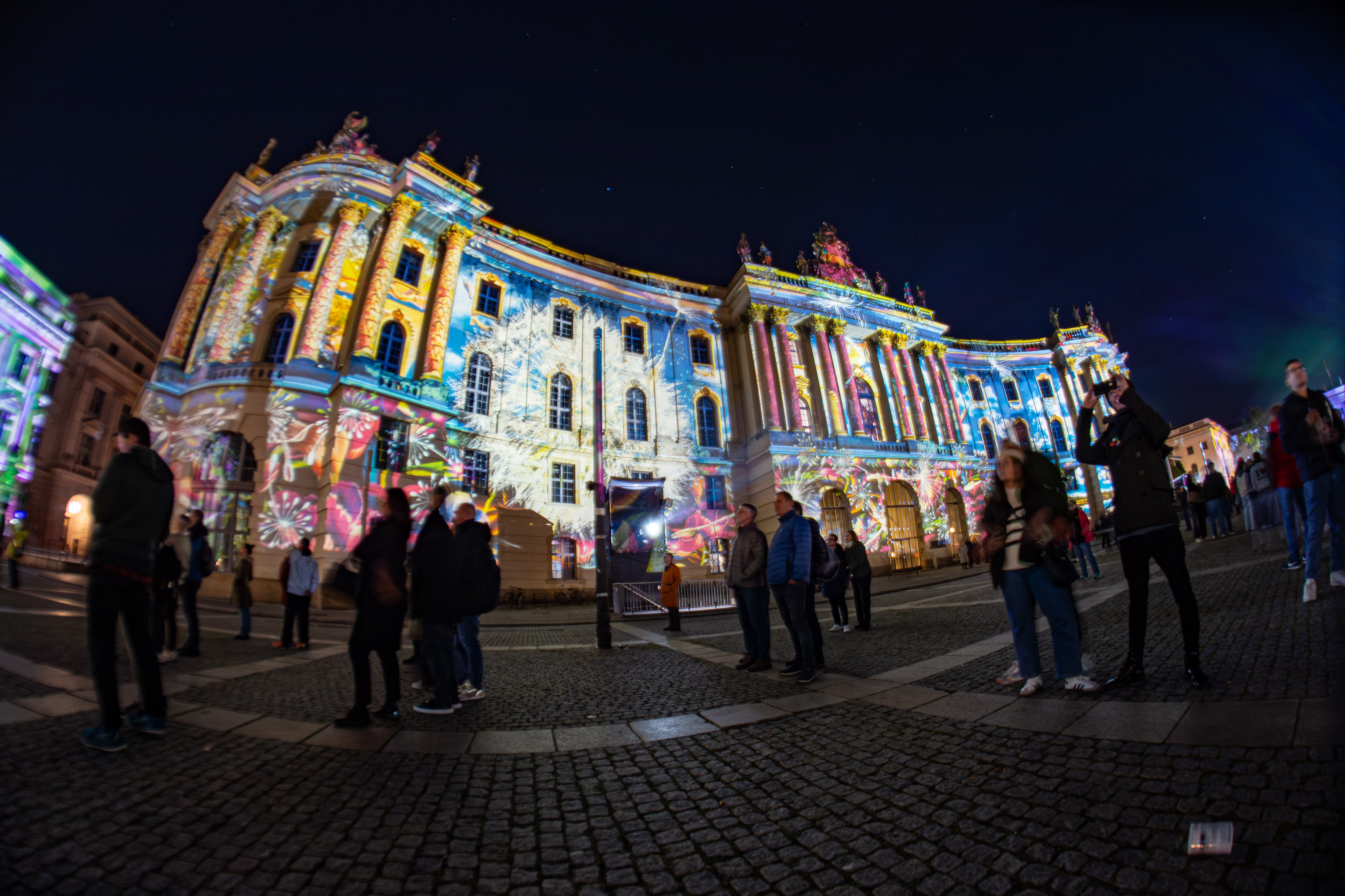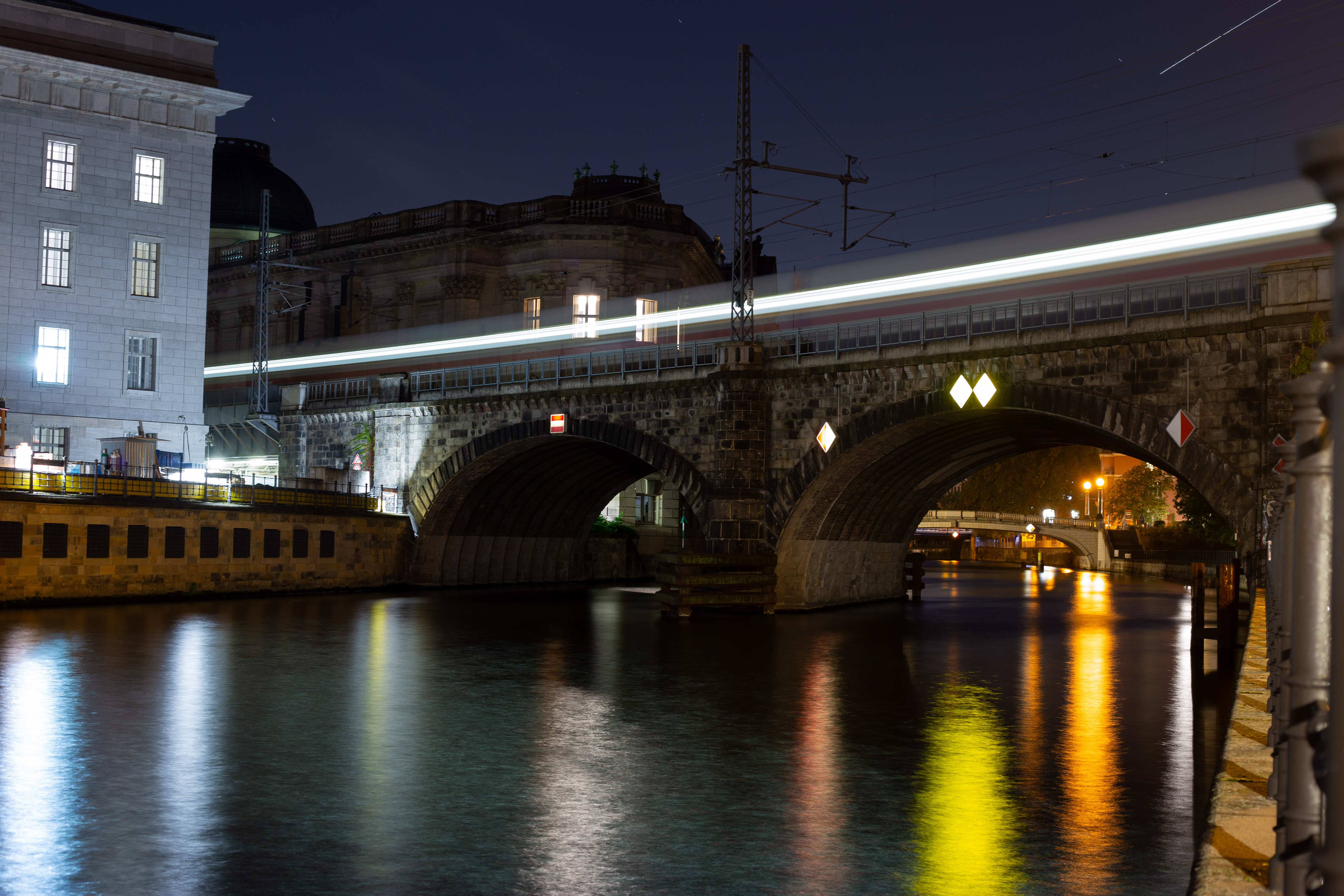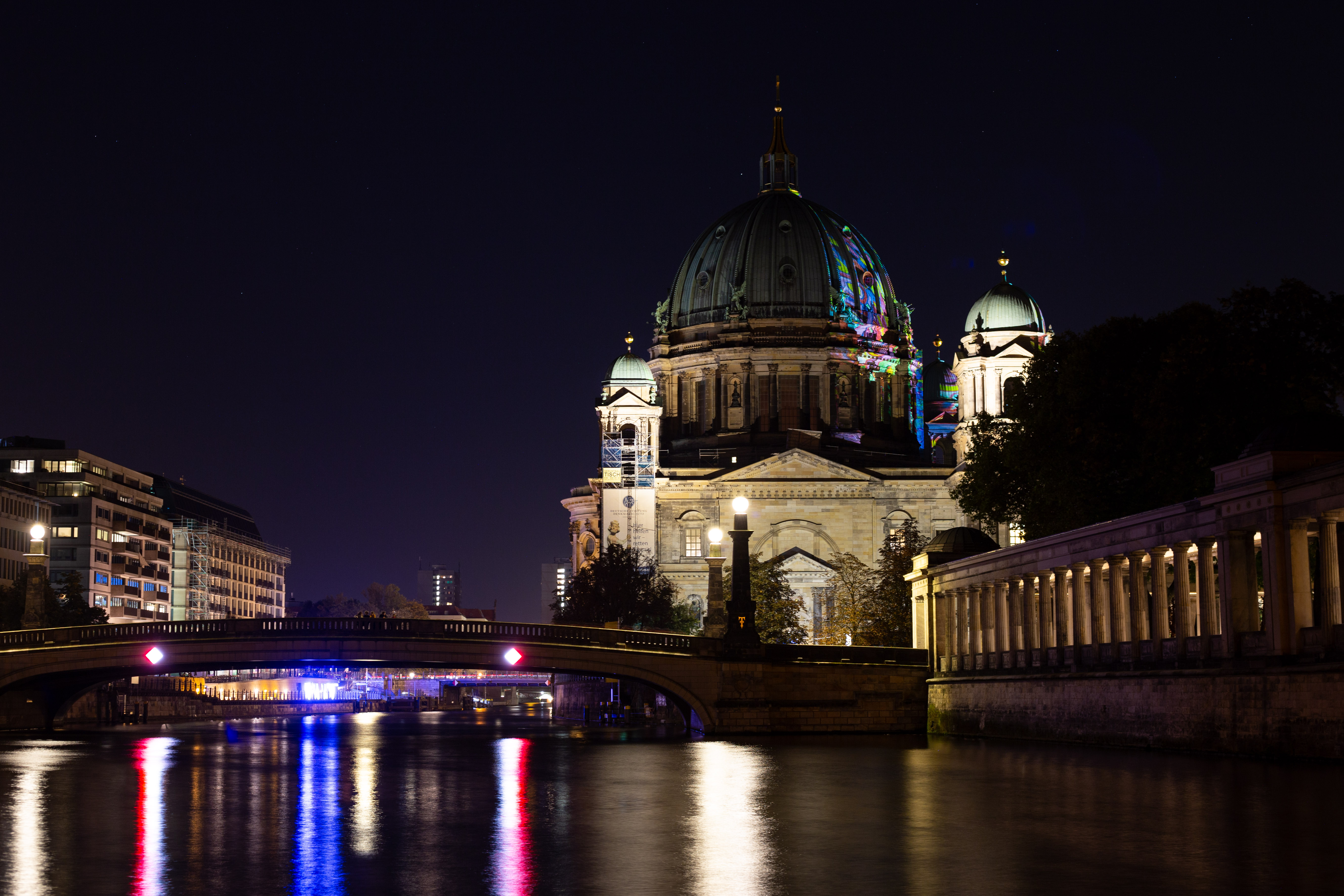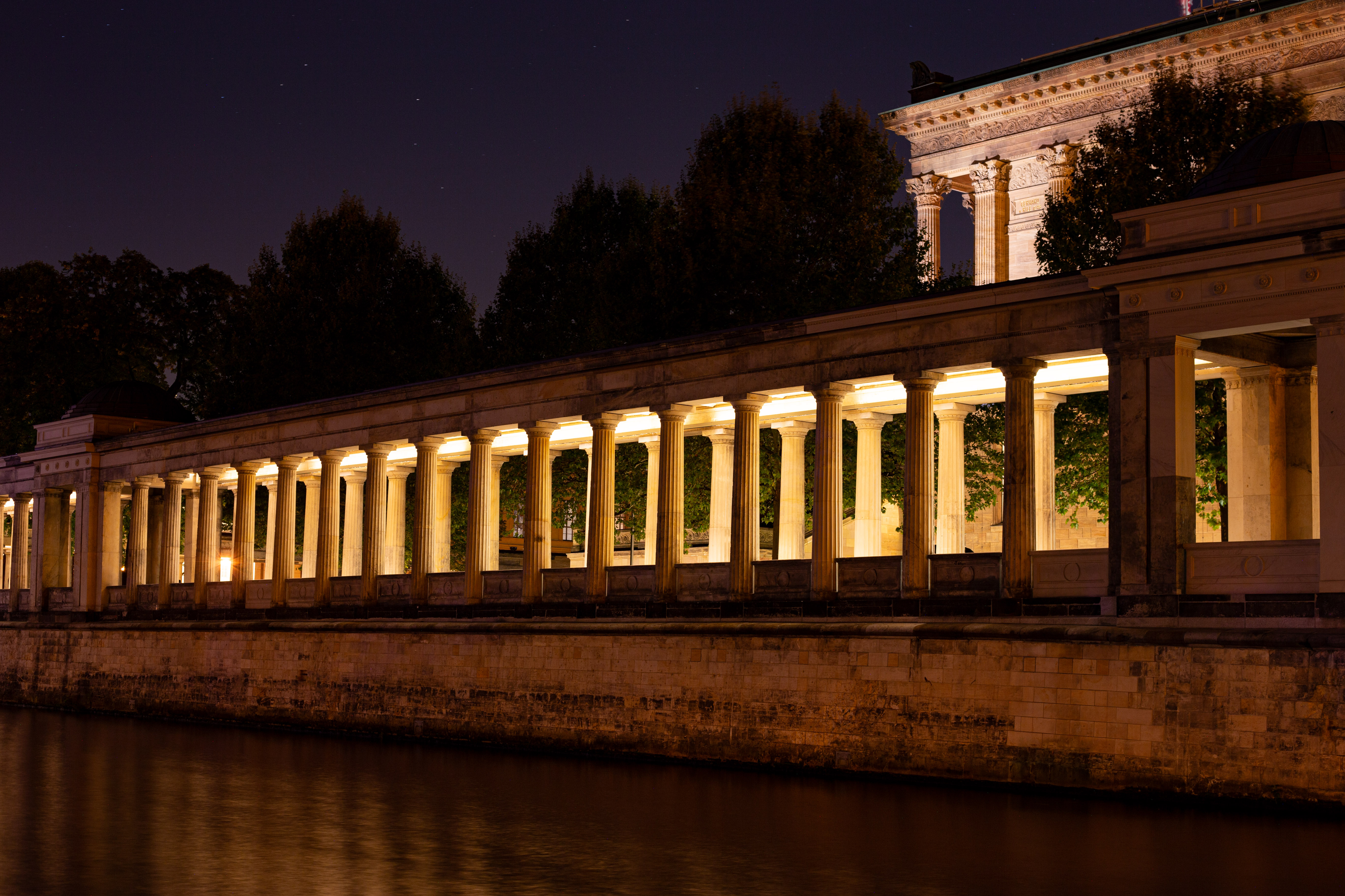 The image features a serene night scene by a river, with a row of white columns on the left side of the frame, illuminated by warm yellow lights. The columns are arranged in a grid, and the river mirrors the columns' glow, creating a mirror-like effect. In the background, a white building with a green roof stands, partially obscured by the river. The sky is dark, and the image is taken from a low angle, emphasizing the grandeur of the columns and the building. The scene is peaceful and tranquil, with no discernible text or actions.