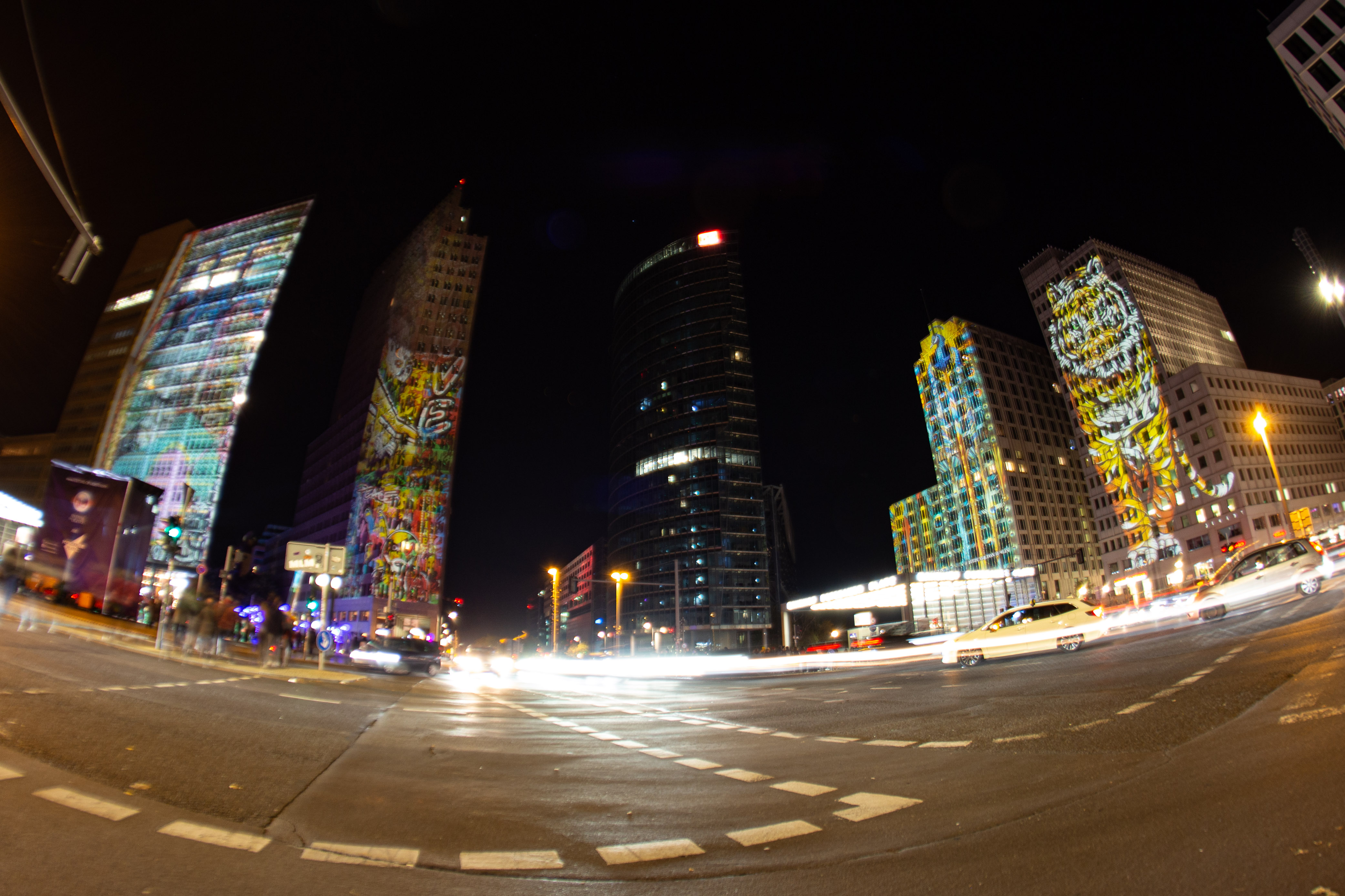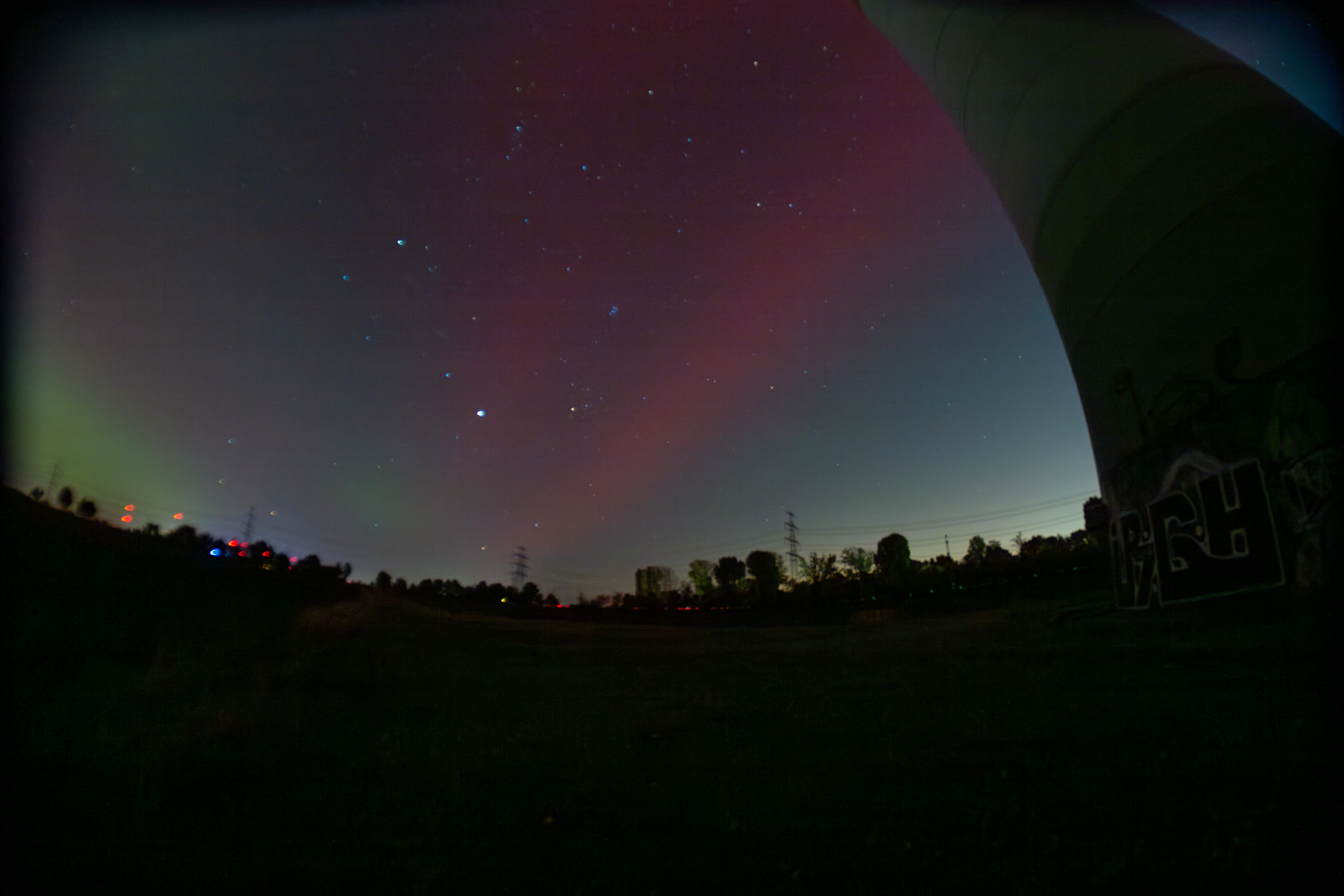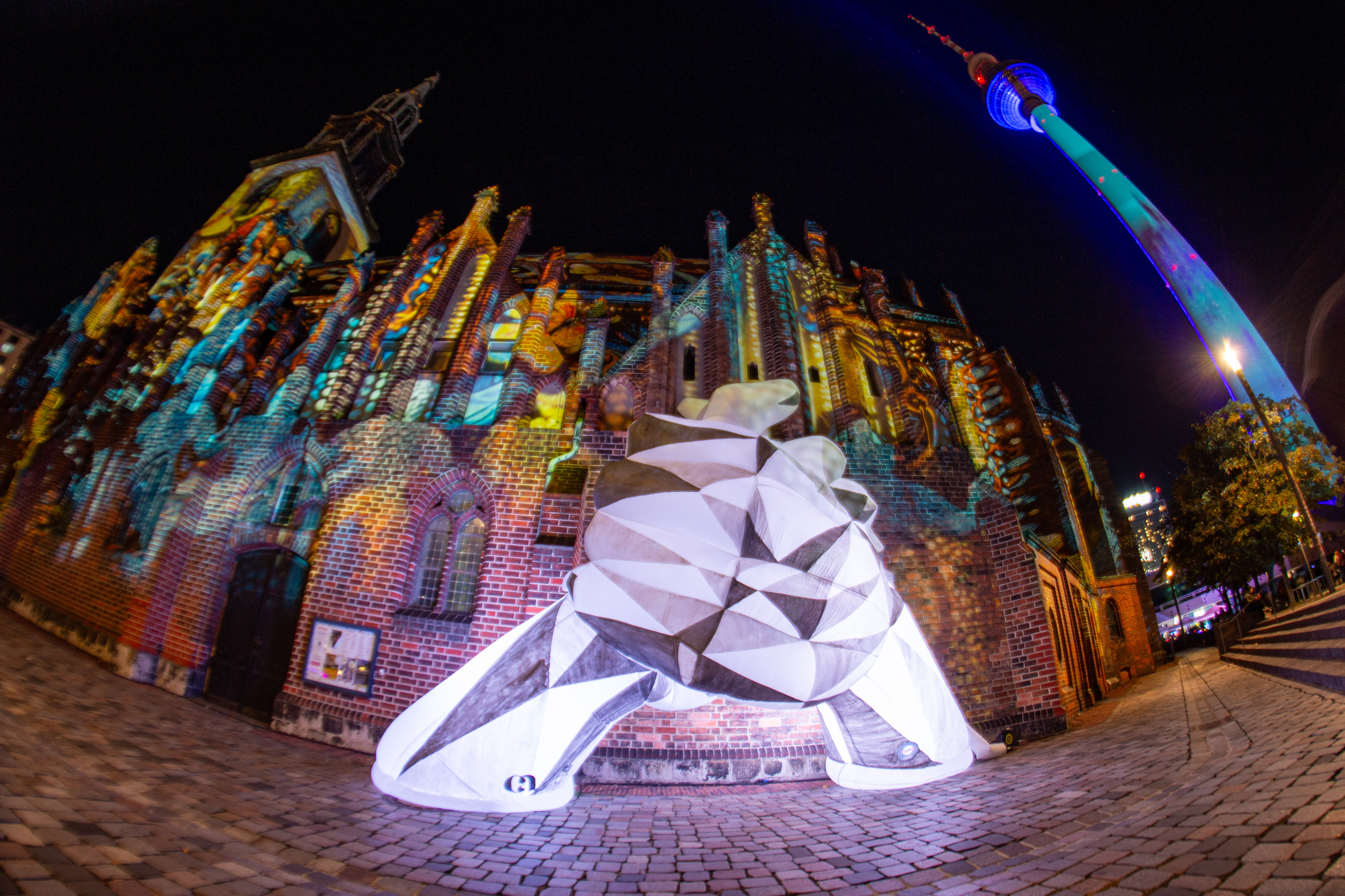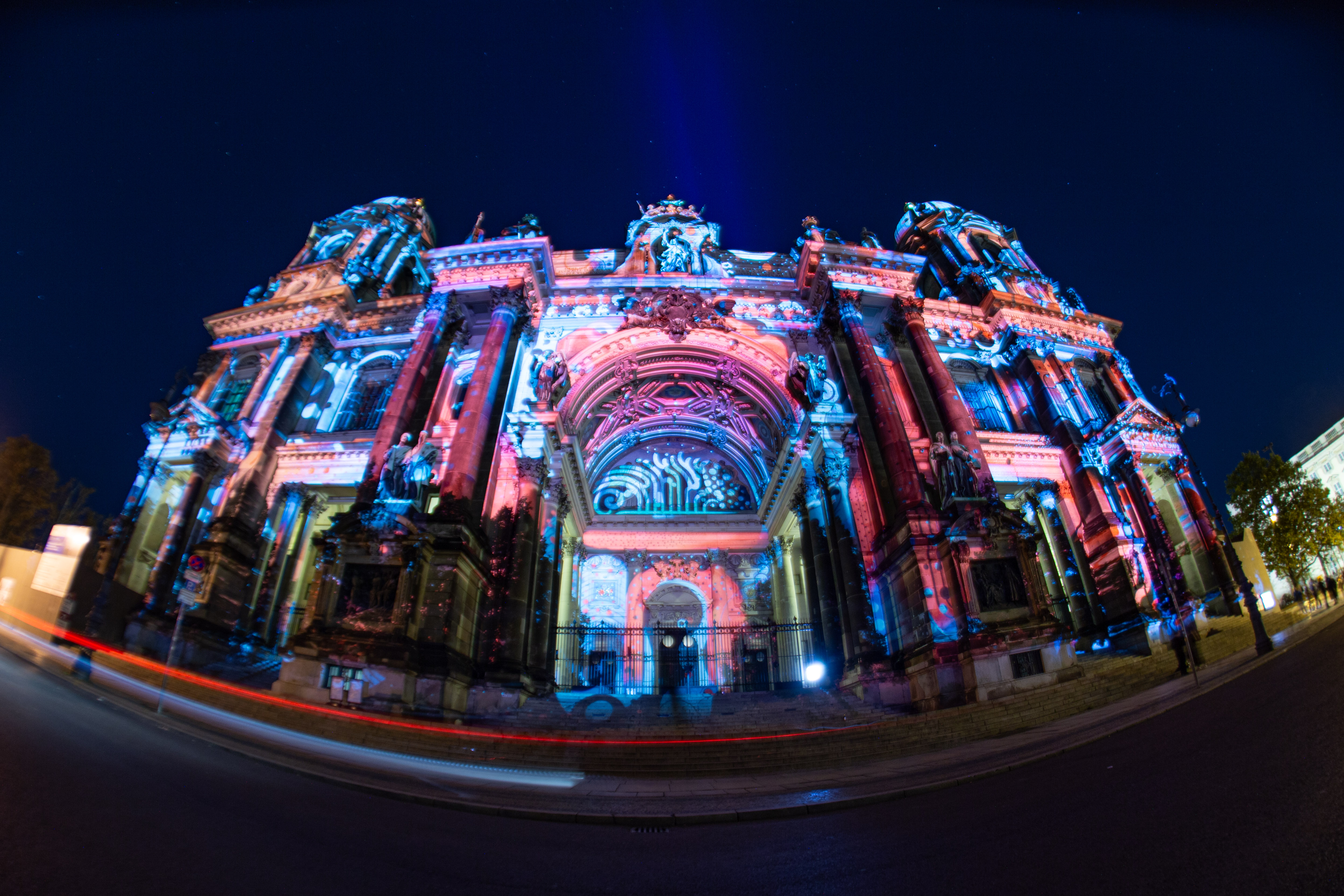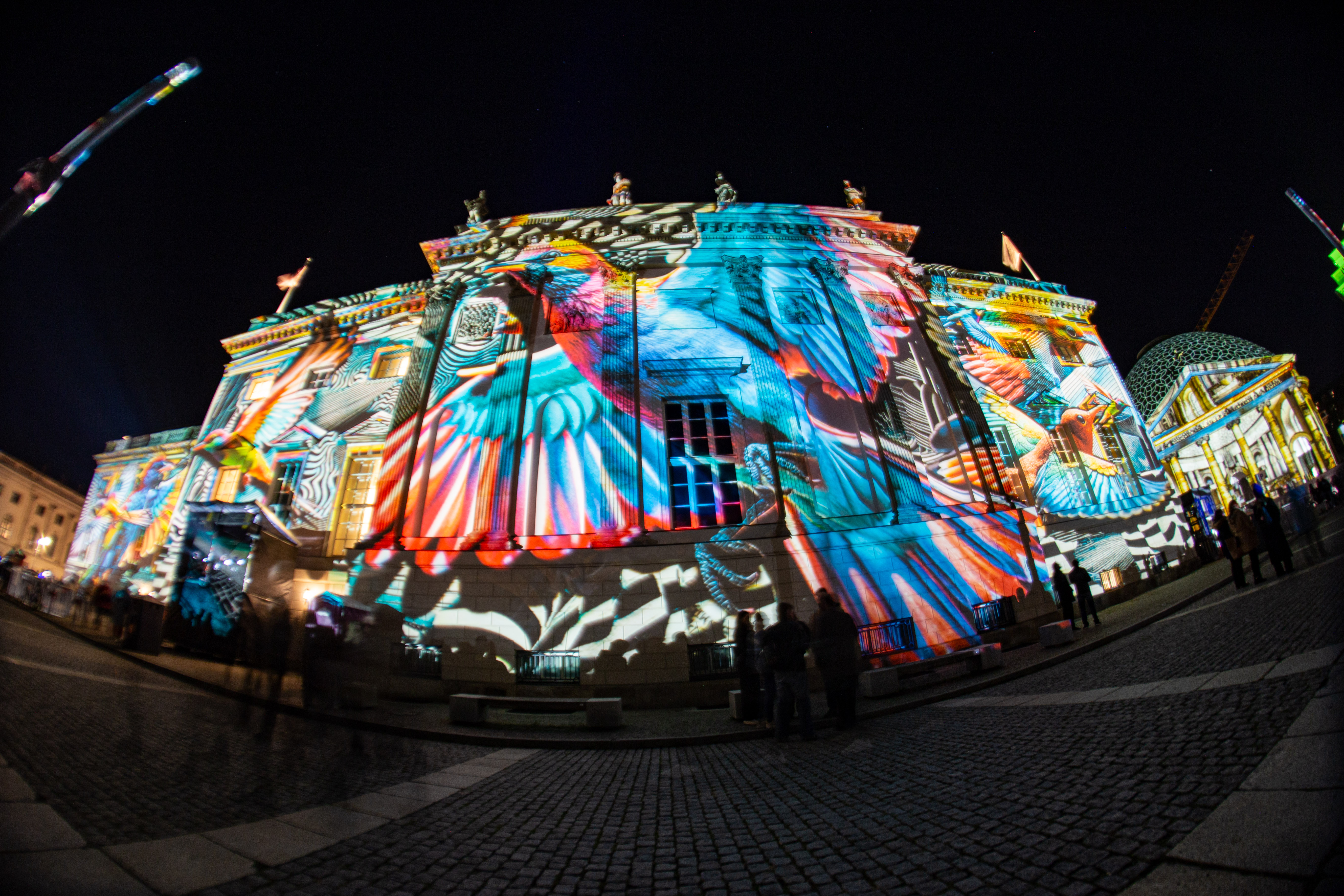 The image features a serene night scene by a river, with a row of white columns on the left side of the frame, illuminated by warm yellow lights. The columns are arranged in a grid, and the river mirrors the columns' glow, creating a mirror-like effect. In the background, a white building with a green roof stands, partially obscured by the river. The sky is dark, and the image is taken from a low angle, emphasizing the grandeur of the columns and the building. The scene is peaceful and tranquil, with no discernible text or actions.