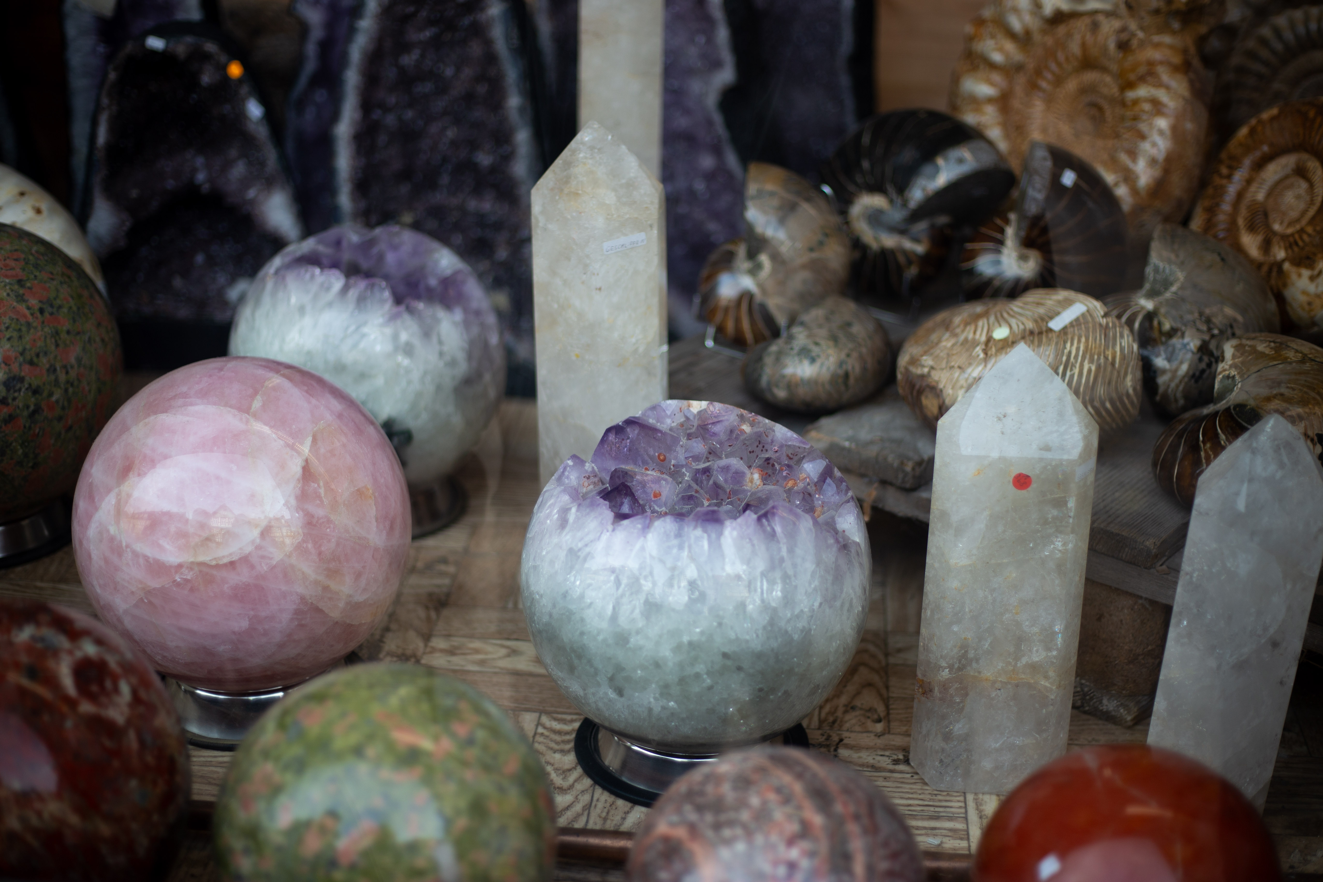 The image showcases a diverse collection of rocks and minerals, meticulously arranged on a wooden shelf. The rocks exhibit a range of colors and shapes, with some exhibiting a pinkish hue and others exhibiting a greenish hue. The minerals, on the other hand, exhibit a variety of colors and patterns, with some exhibiting a purple hue and others exhibiting a white or gray color. The arrangement is harmonious, with each object placed in its own space, creating a visually appealing display. The image does not contain any discernible text or actions. The relative positions of the objects are consistent, with the rocks and minerals arranged in a manner that suggests they are on display for viewing.