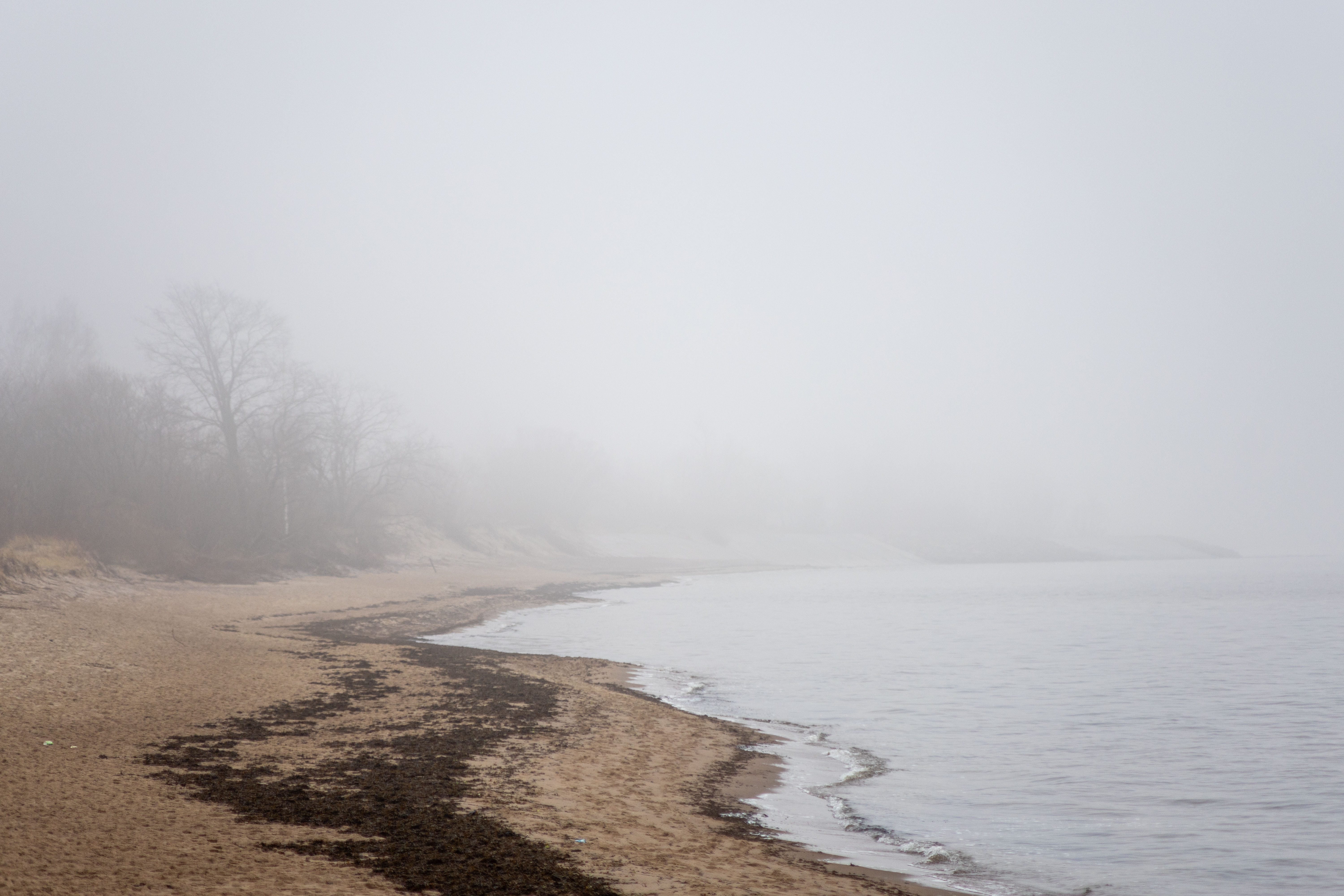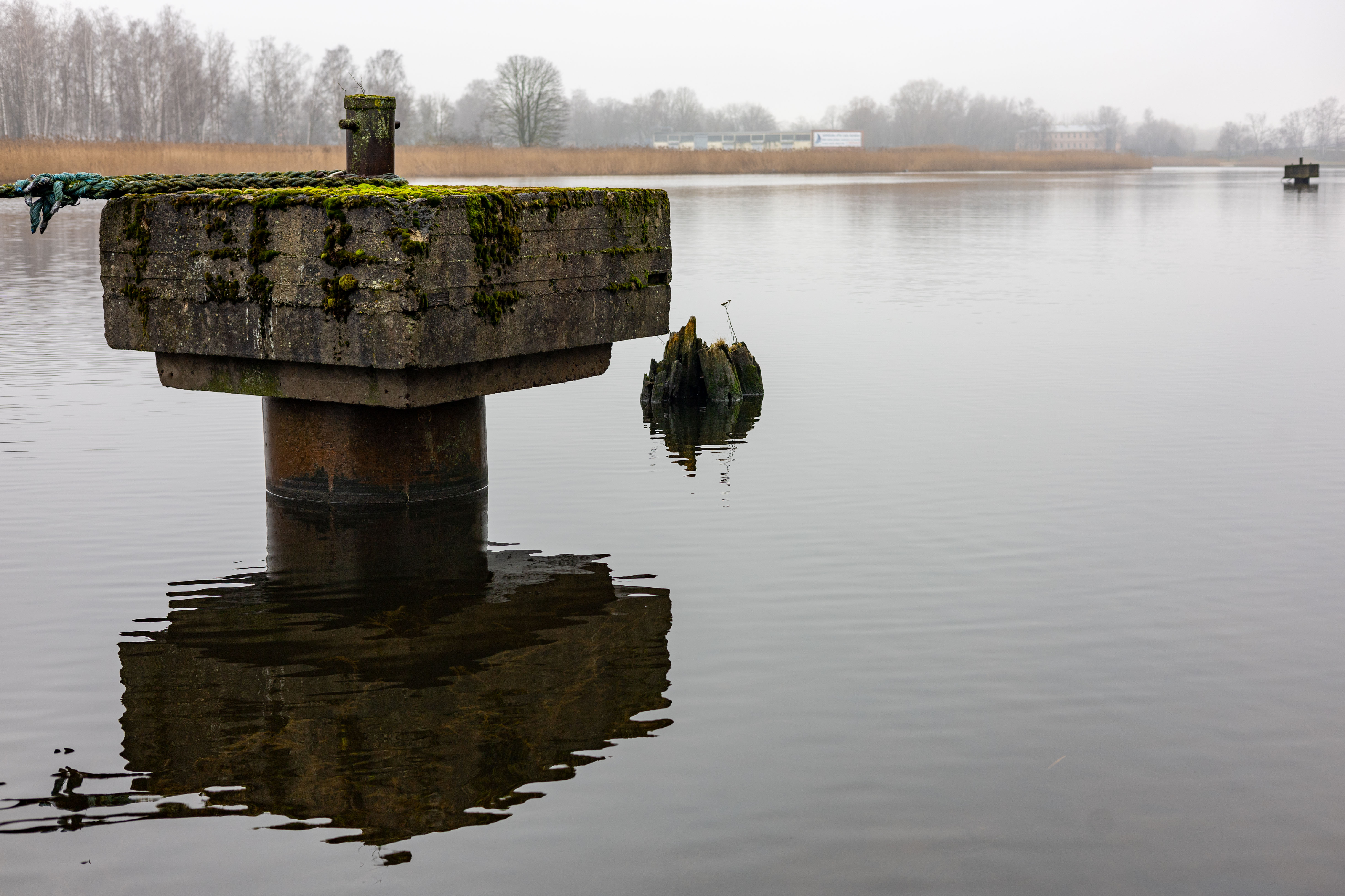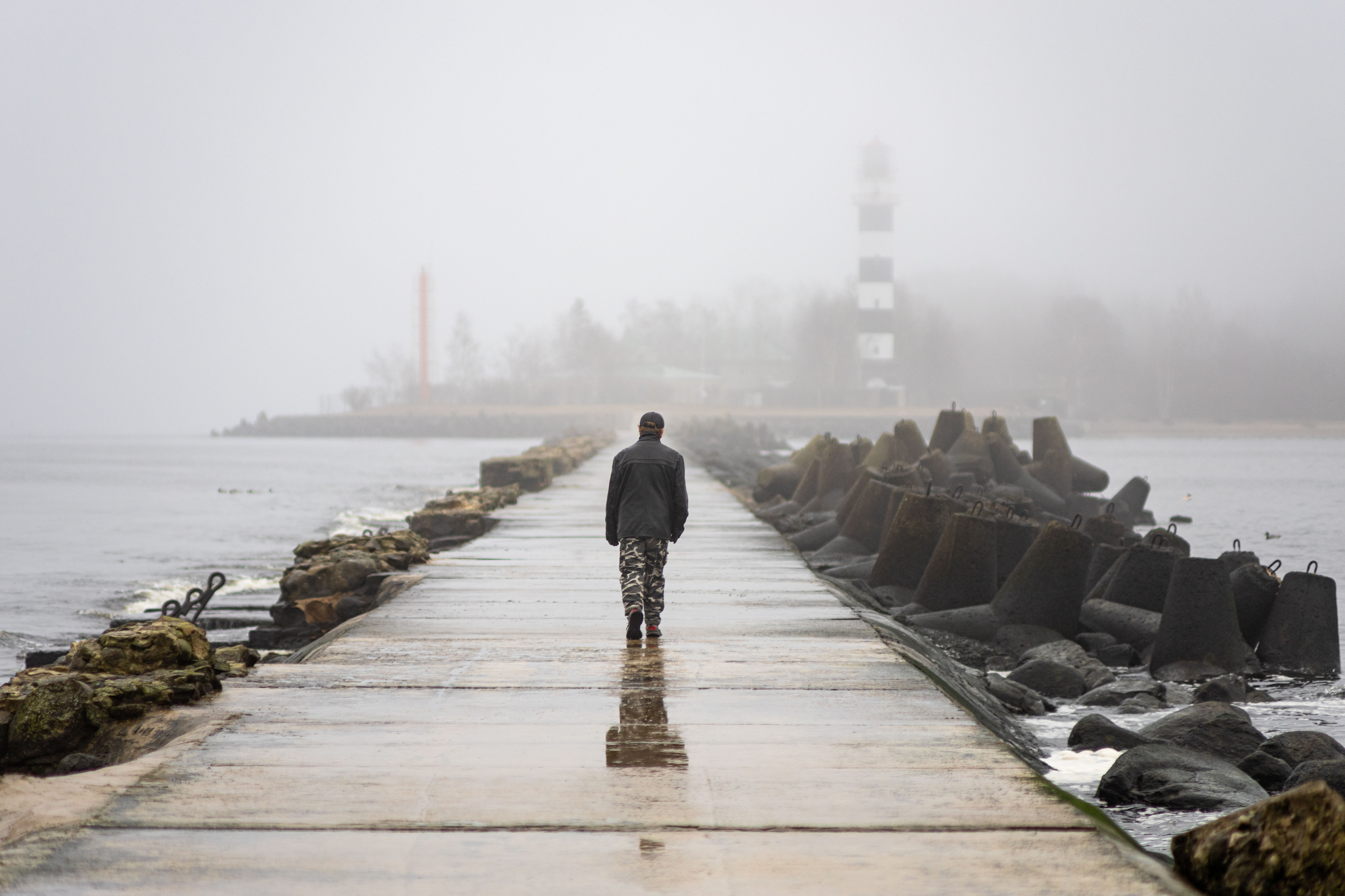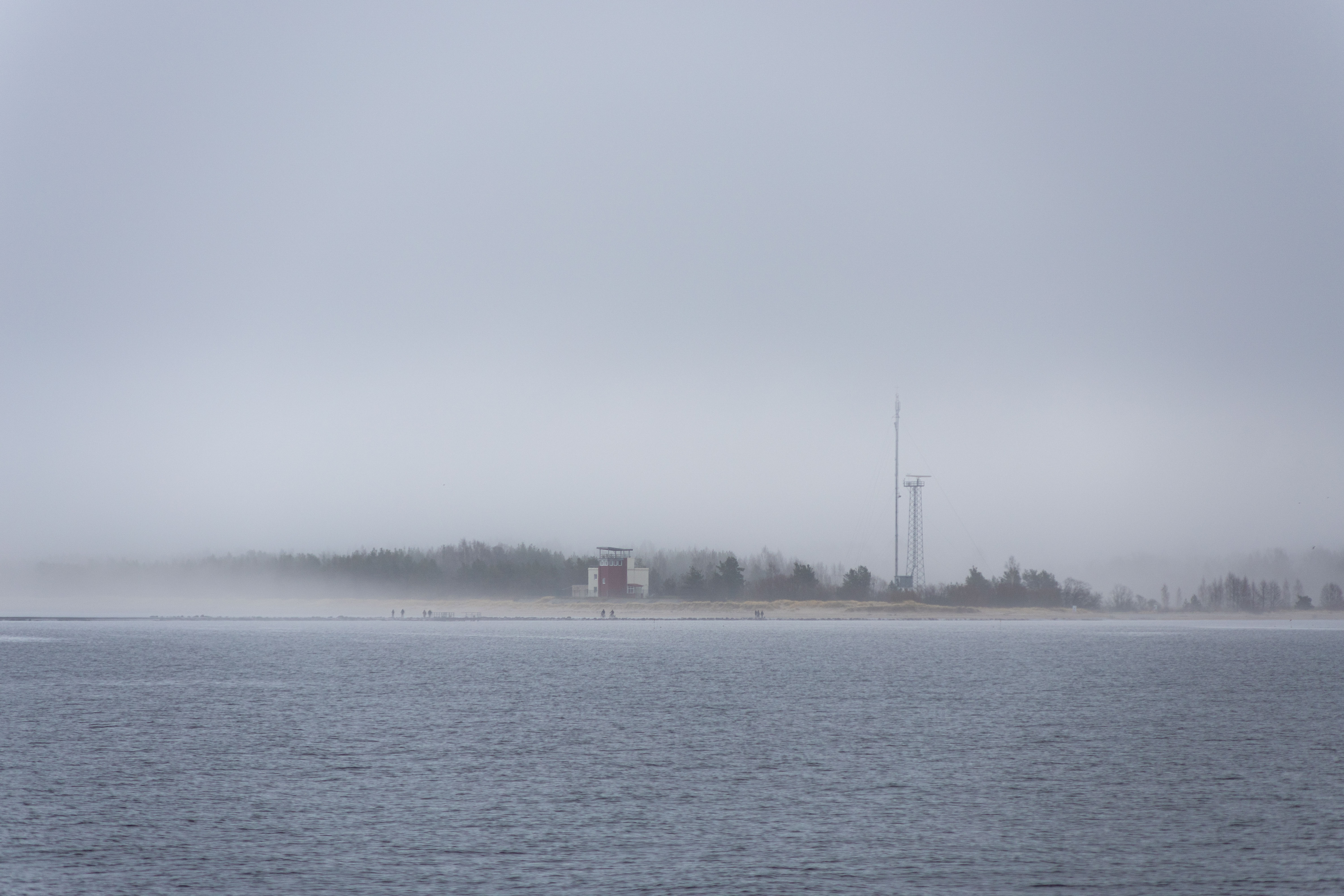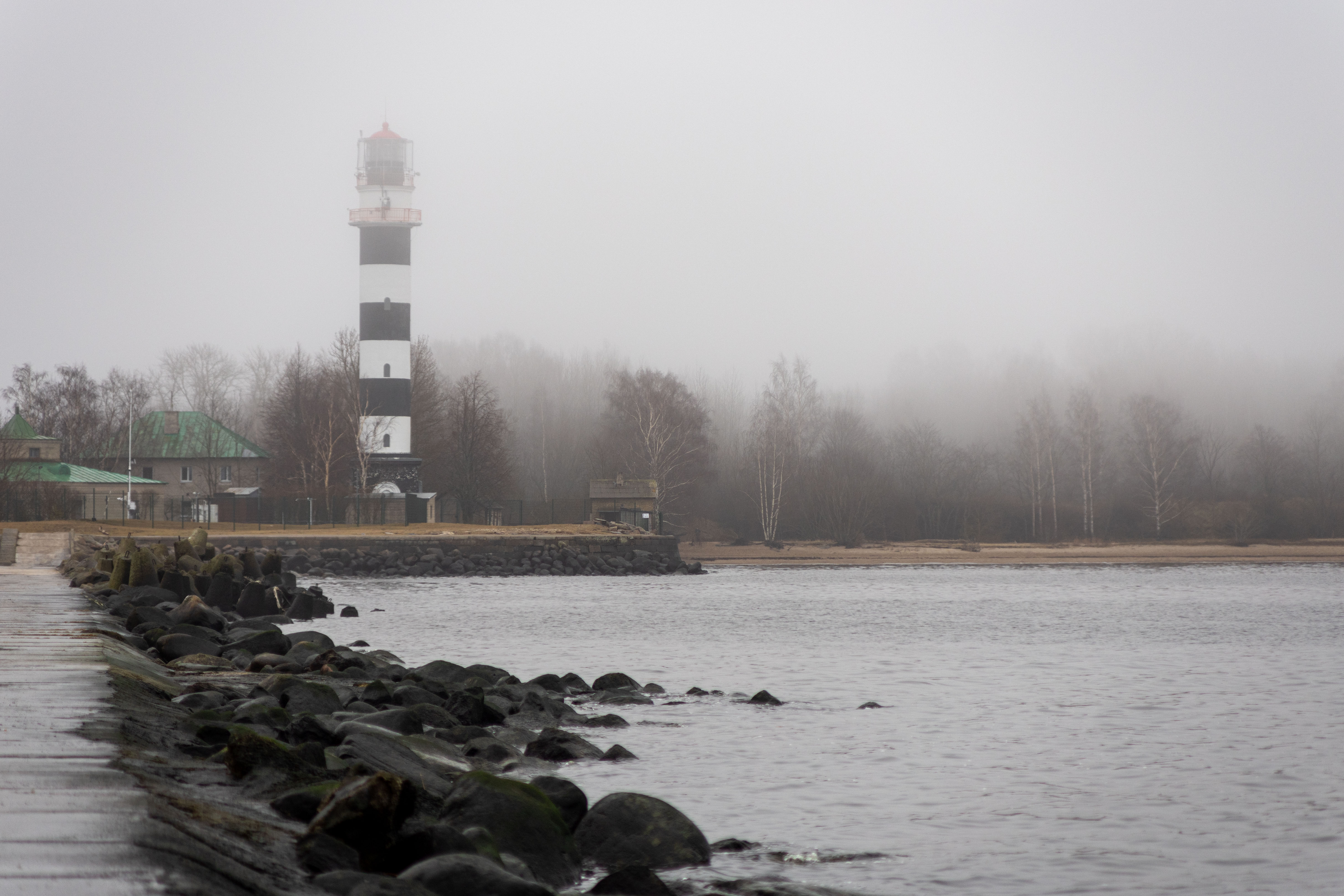 The bus from Riga to Daugavgrive takes about half an hour. But walking to the lighthouse turned out non-trivial. Google maps misled me into a logging industrial area with a dead end and closed gates. I already thought to abandon hope and get back, but decided to check OpenStreetMap navigation. There was a hiking path around the area leading to the sea shore. It was very foggy, the lighthouse was barely visible. There were seals and ducks near the end of the pier.