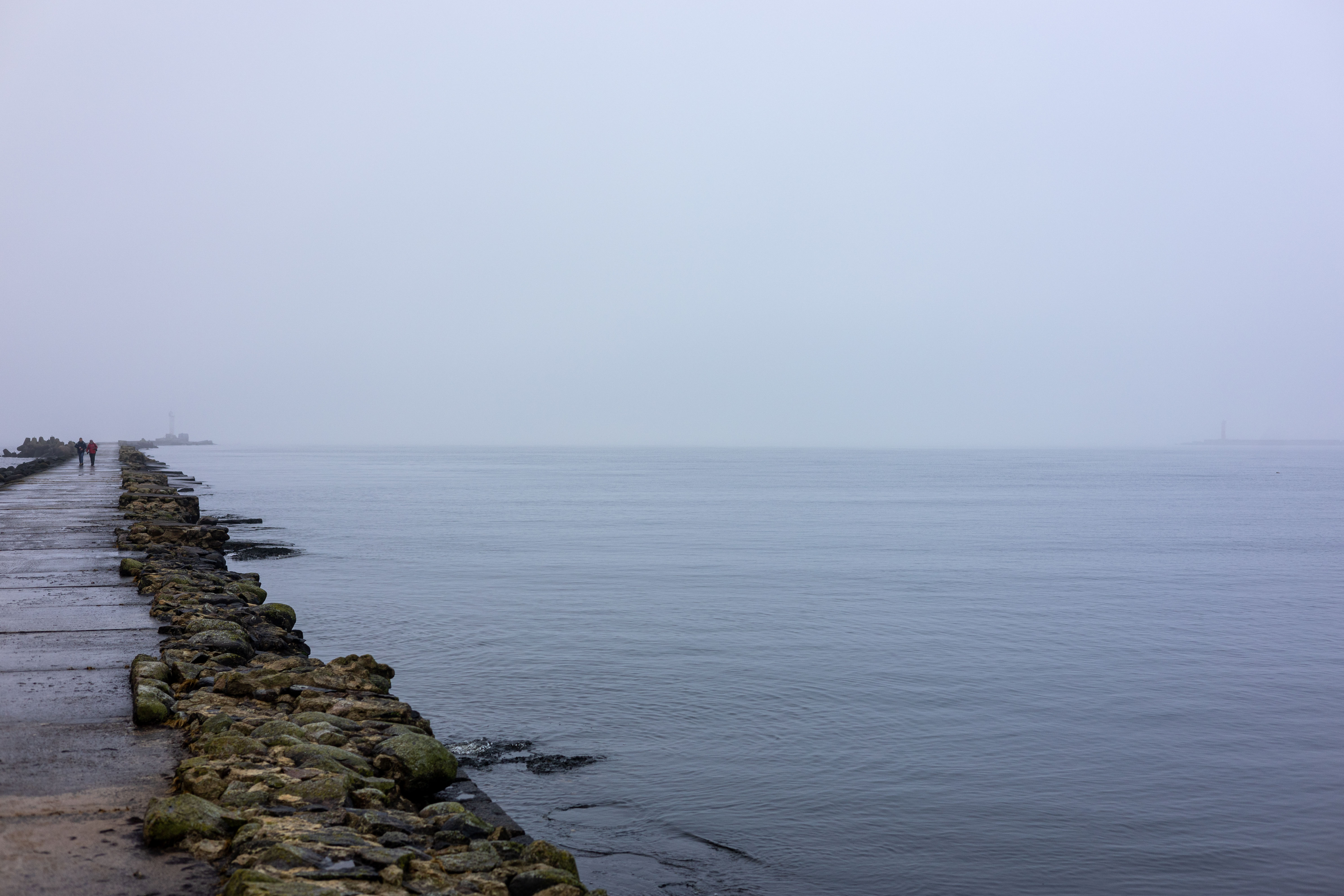 For a few minutes the wind have removed the fog and a neighbor pier with another lighthouse became visible.