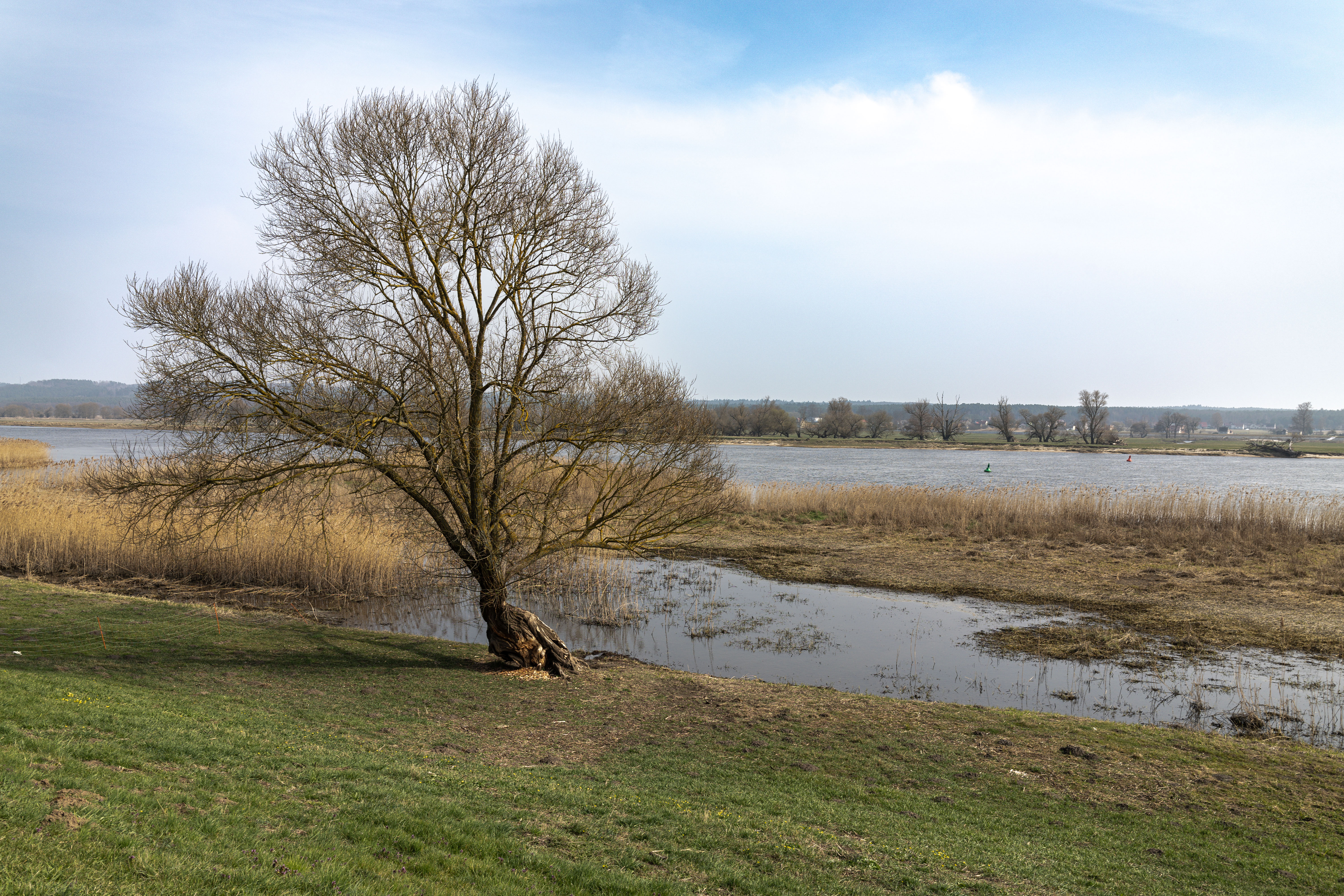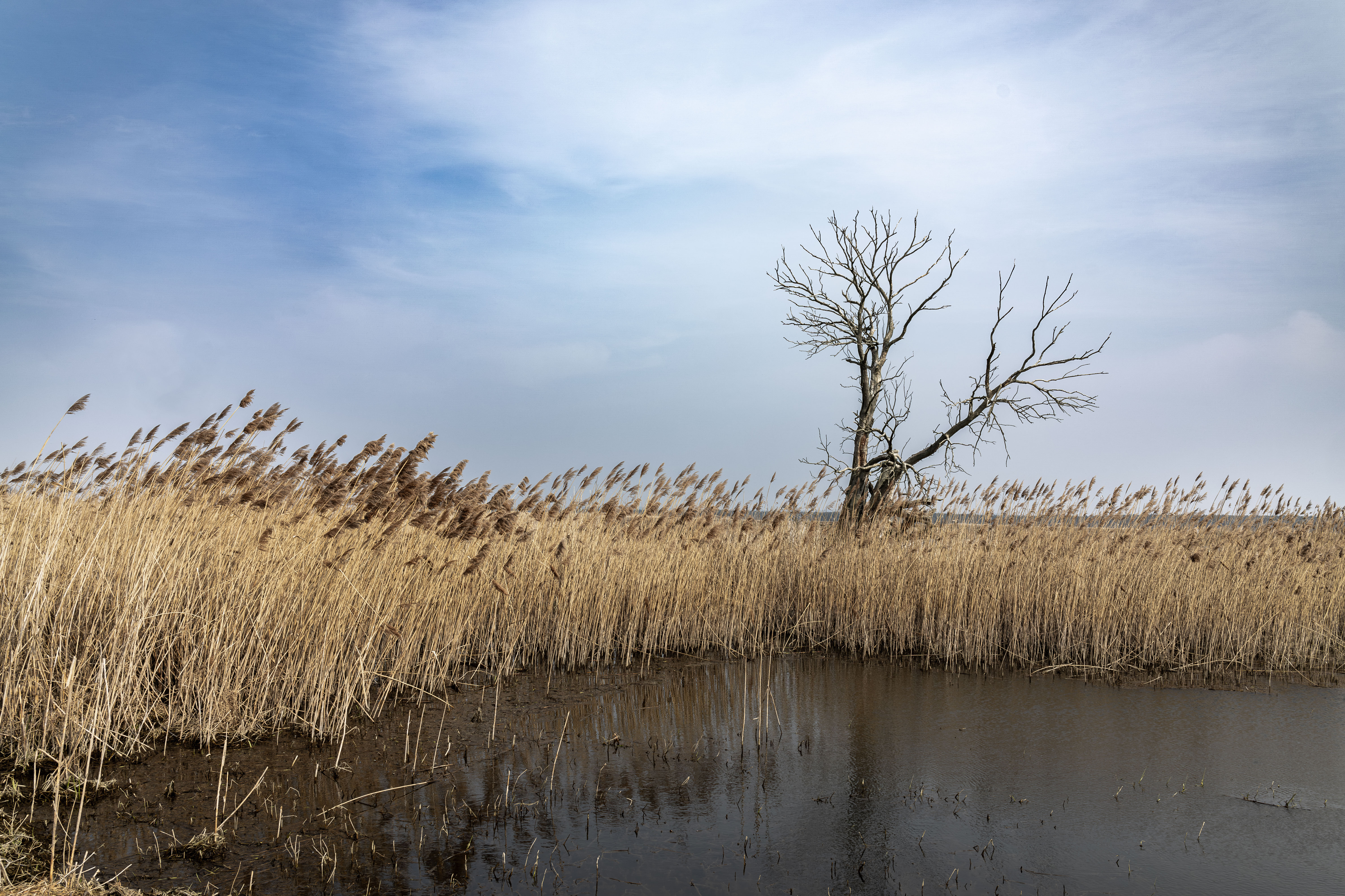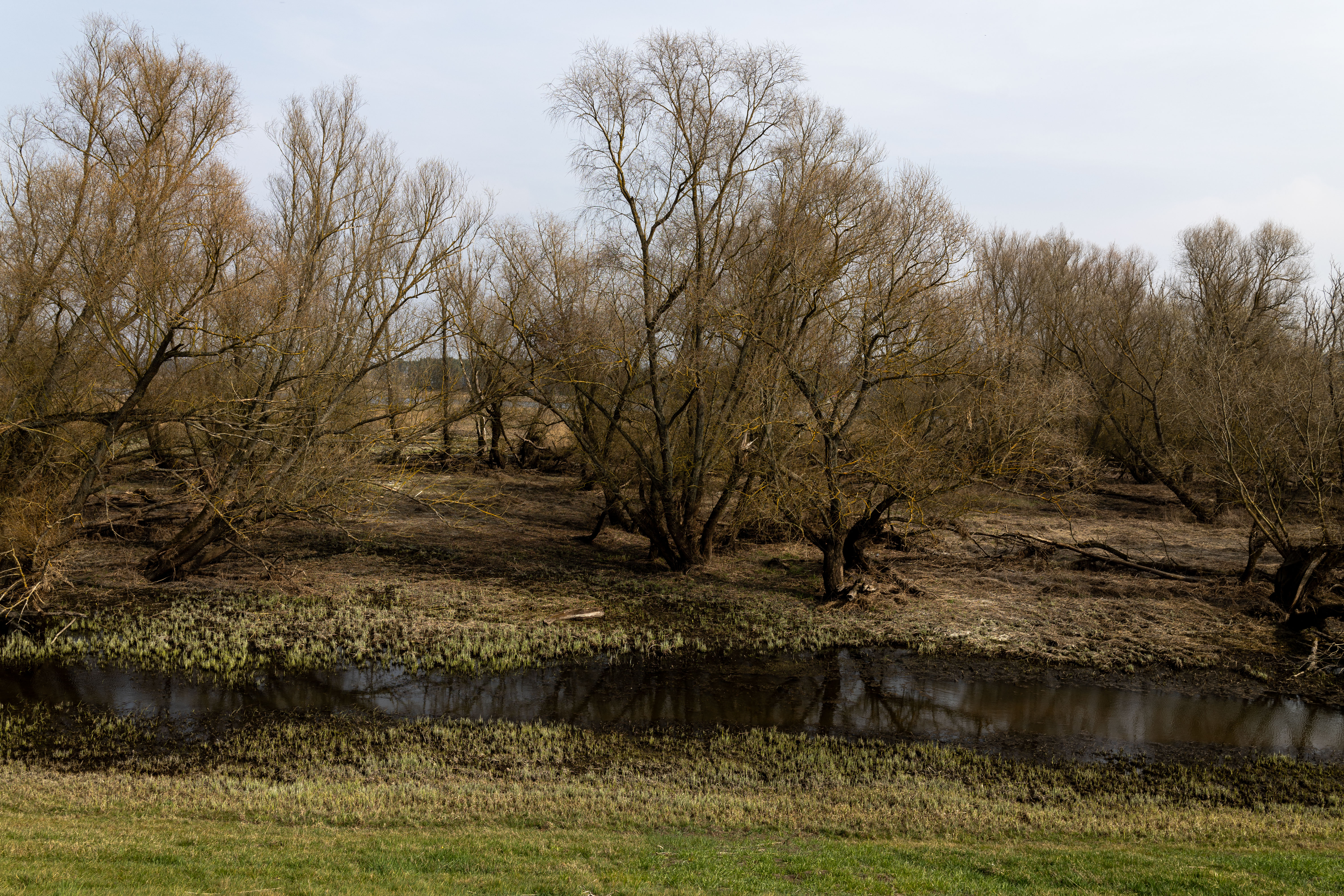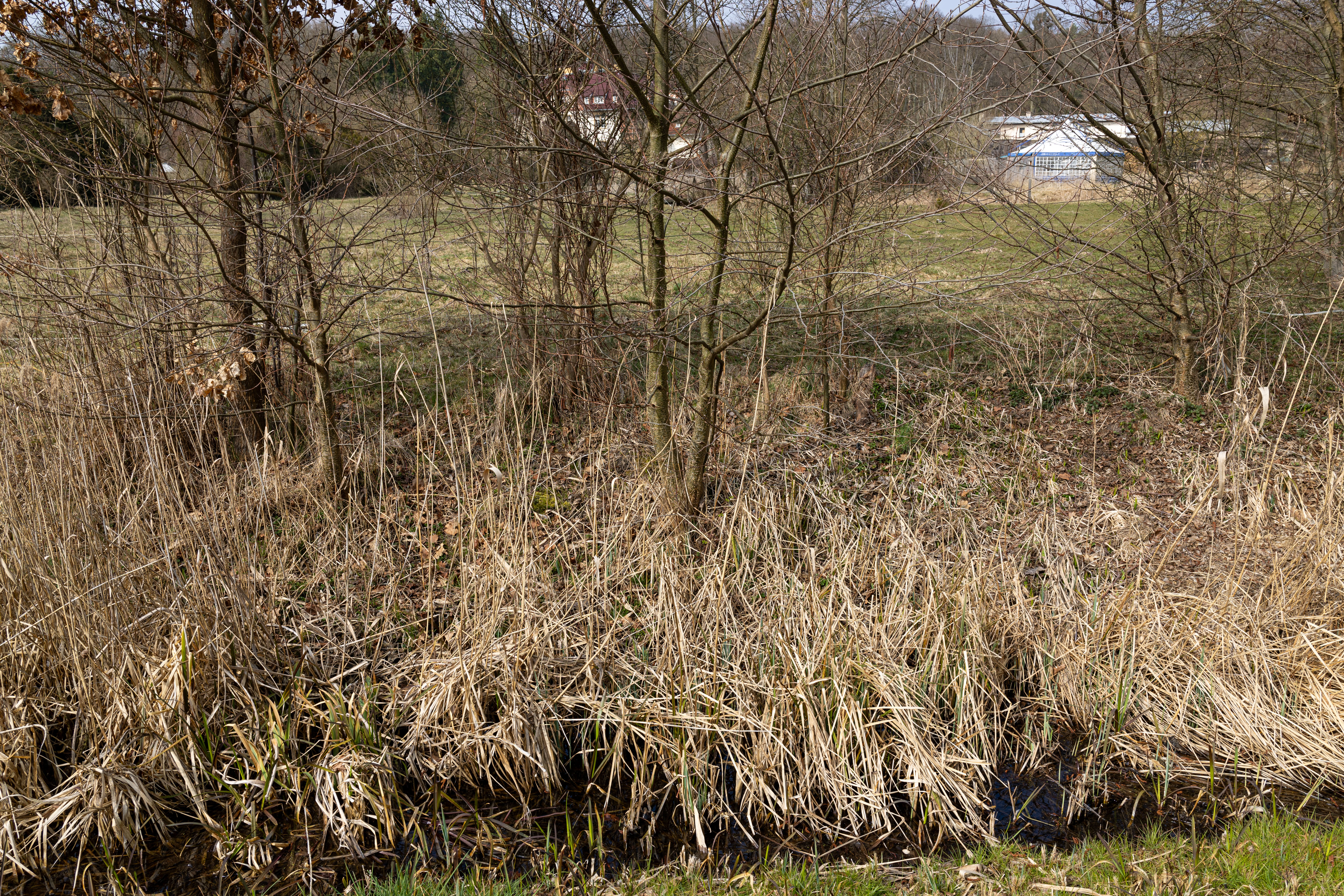 A tranquil scene of a field with a small stream, surrounded by tall, dry grass and bare trees, is captured in a low-angle perspective. In the distance, a white building with a blue roof is visible, and a few trees are scattered around the field. The sky is a clear blue, and the overall mood is serene and peaceful.
