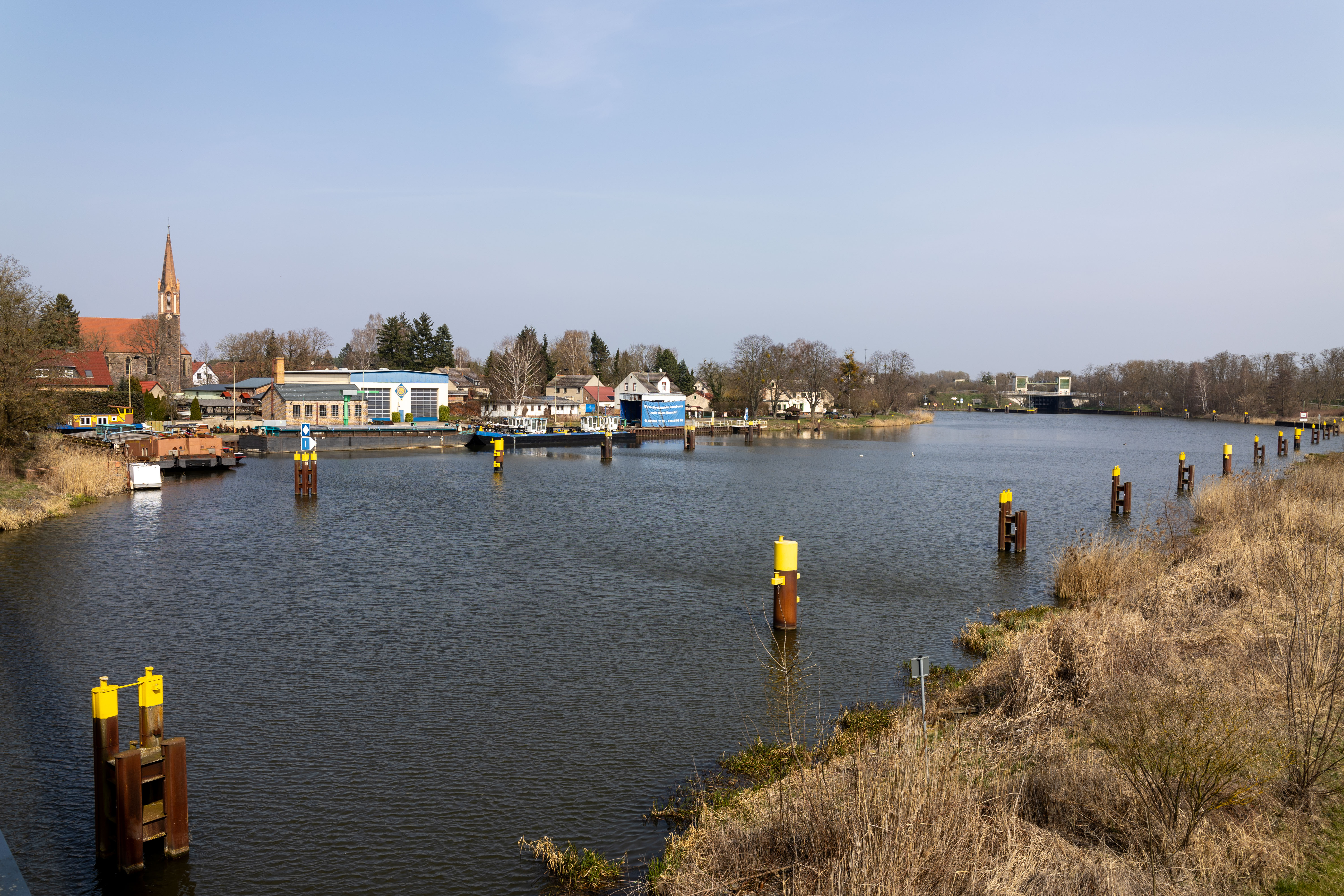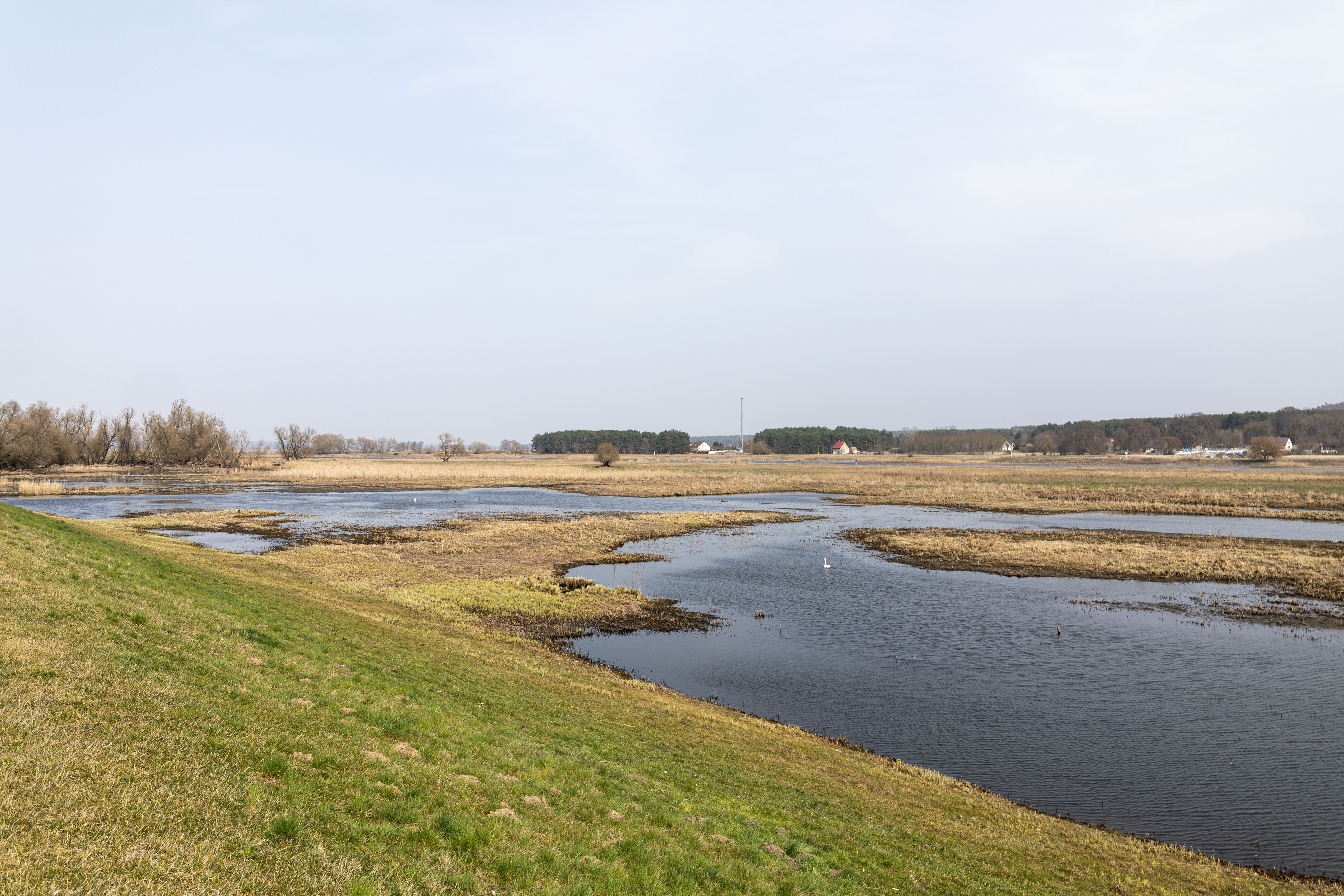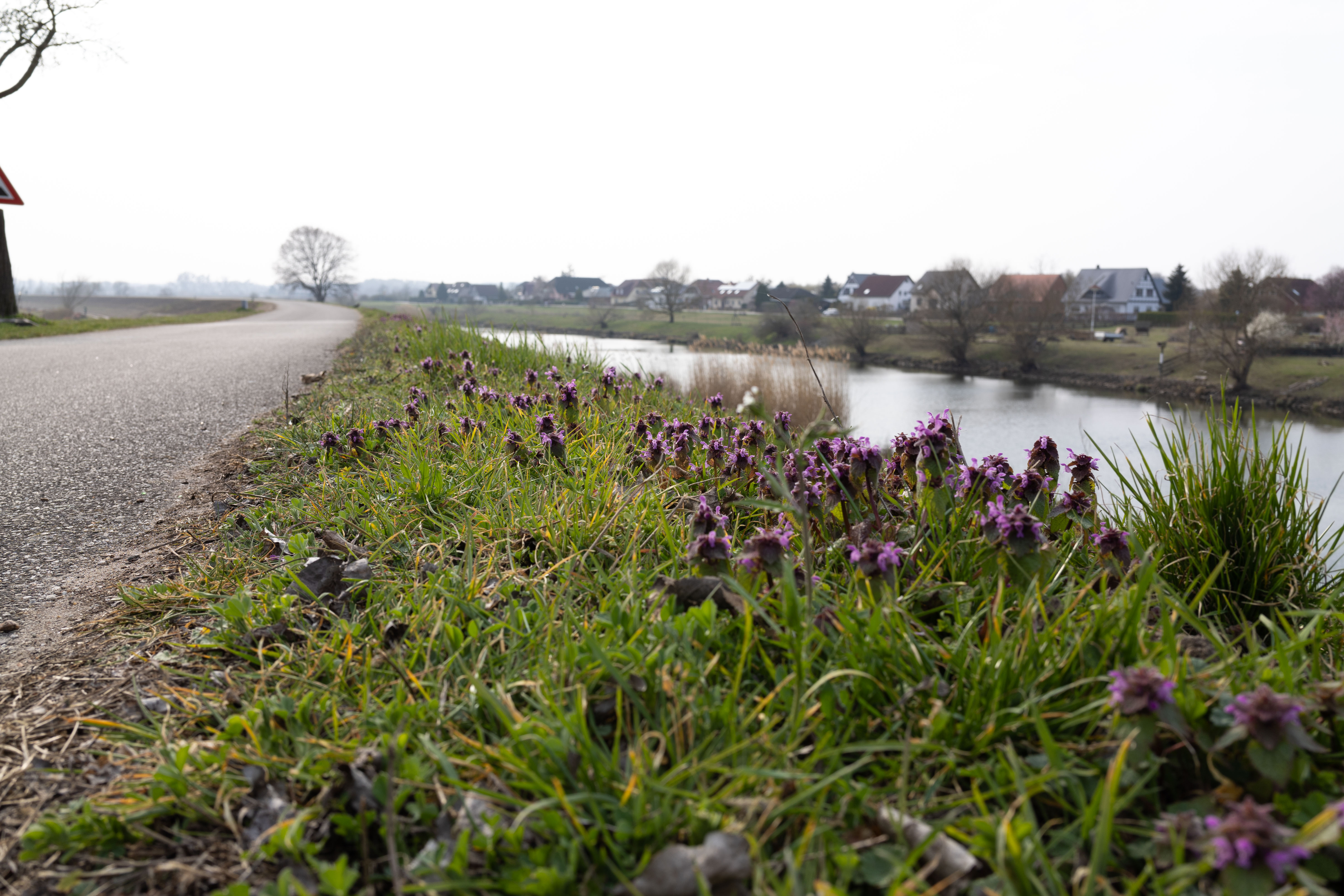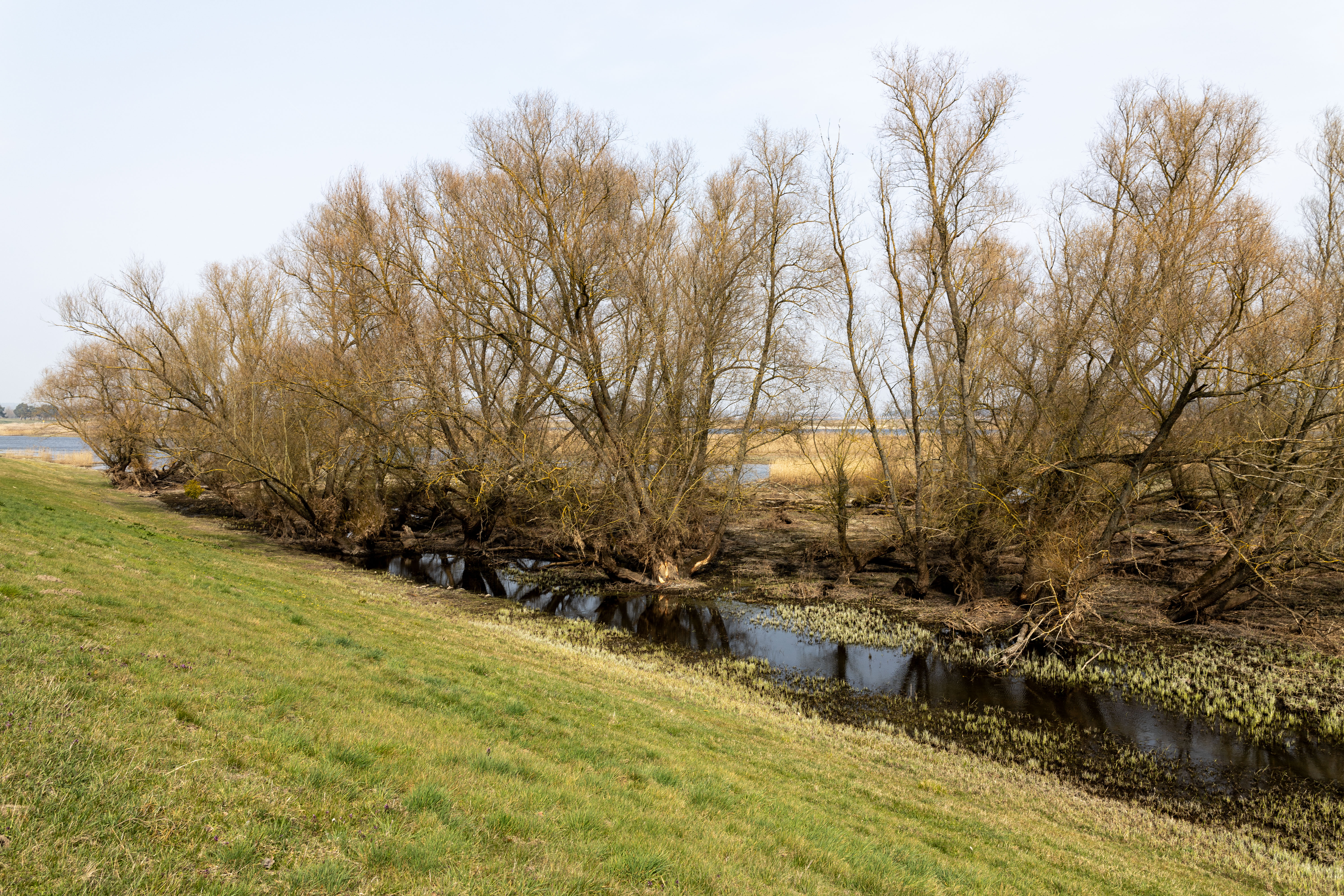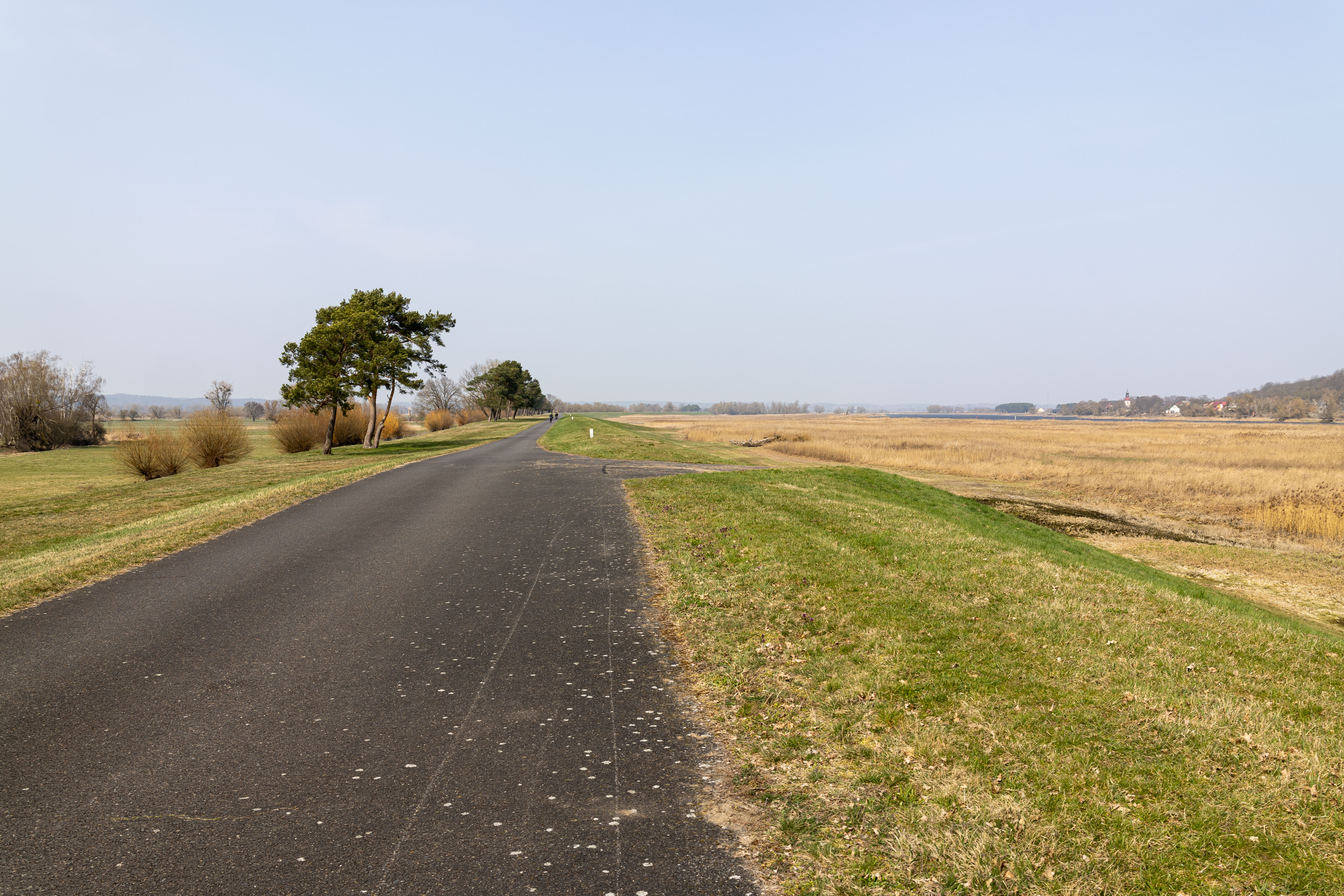 A tranquil scene of a field with a small stream, surrounded by tall, dry grass and bare trees, is captured in a low-angle perspective. In the distance, a white building with a blue roof is visible, and a few trees are scattered around the field. The sky is a clear blue, and the overall mood is serene and peaceful.