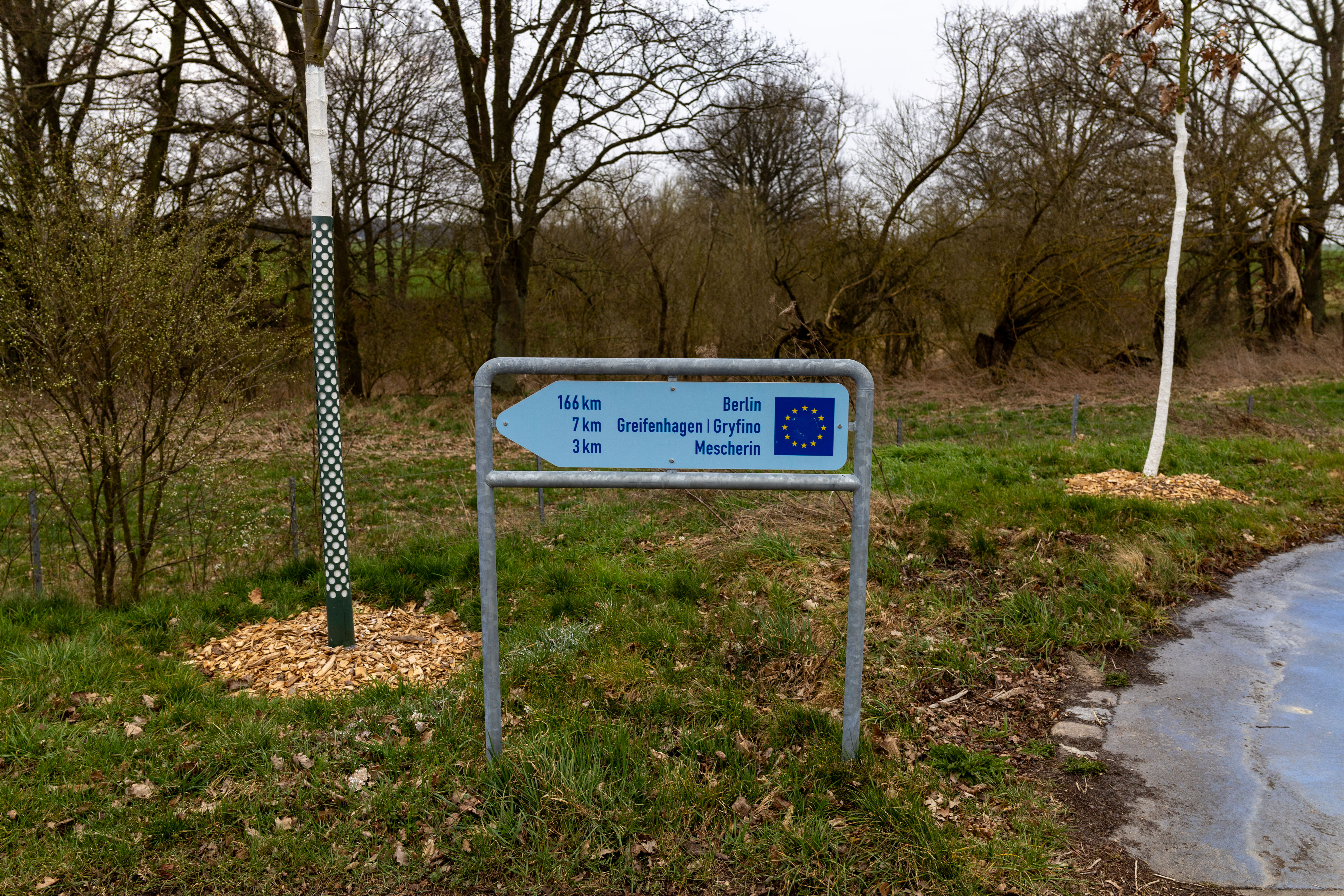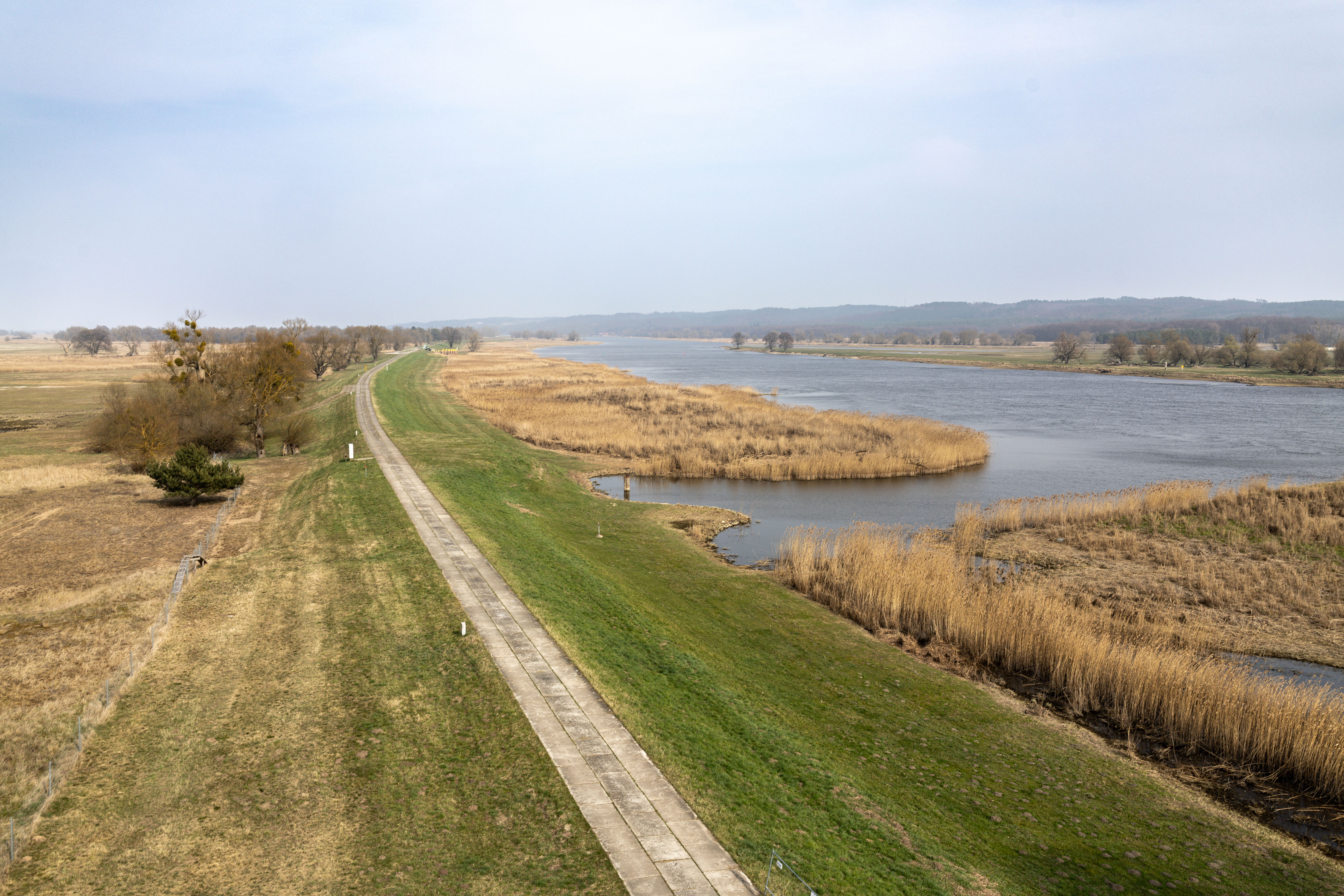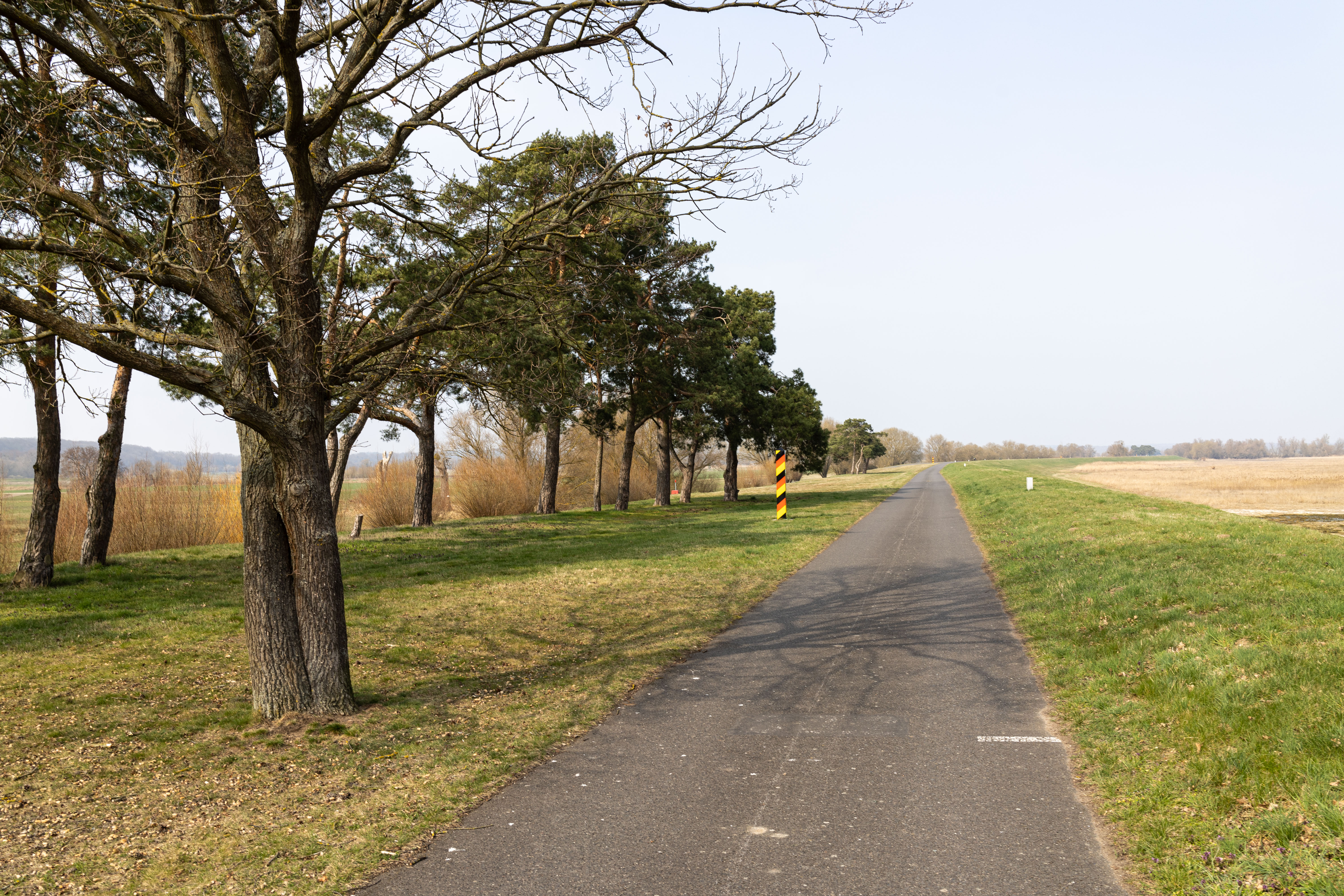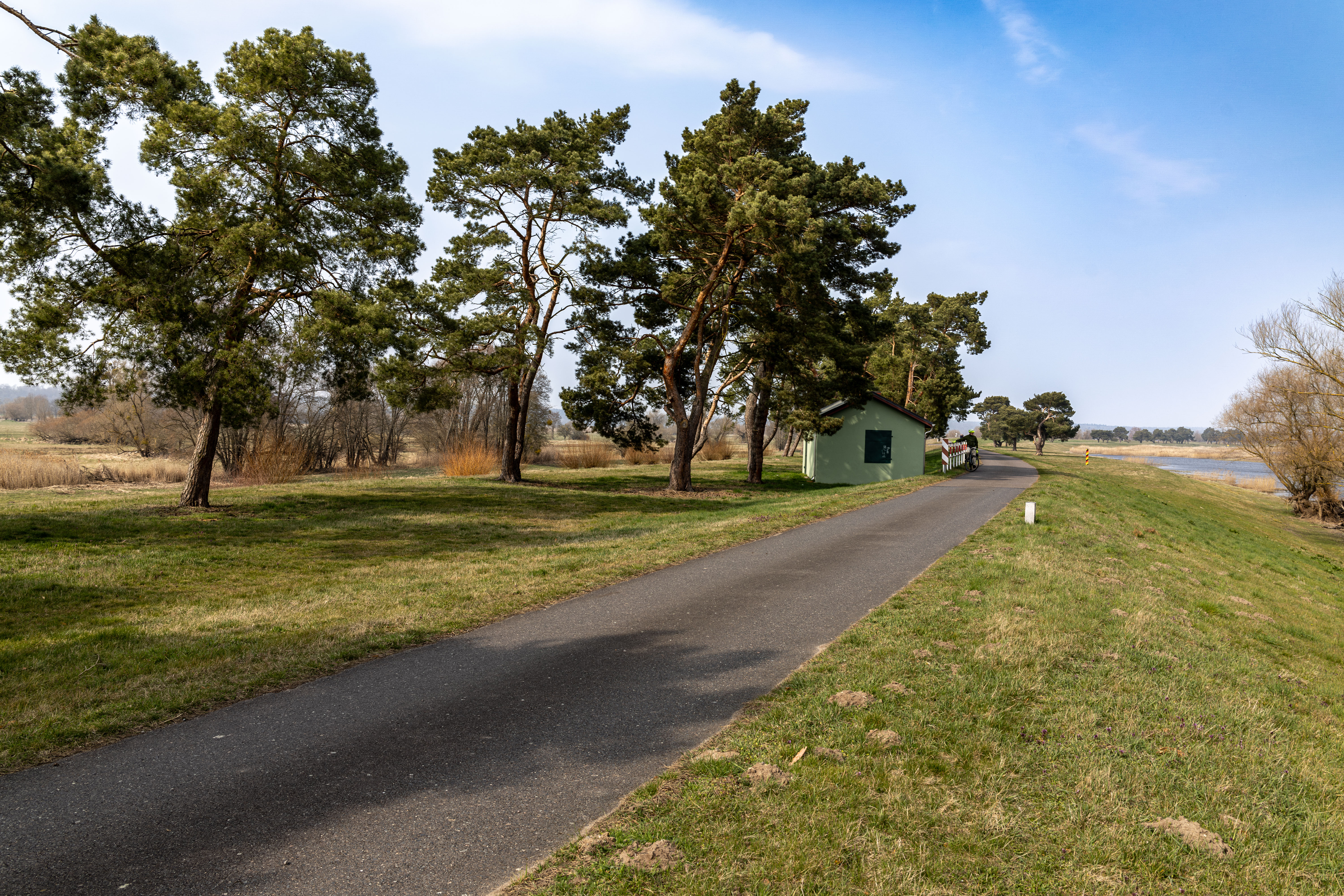 A tranquil scene of a field with a small stream, surrounded by tall, dry grass and bare trees, is captured in a low-angle perspective. In the distance, a white building with a blue roof is visible, and a few trees are scattered around the field. The sky is a clear blue, and the overall mood is serene and peaceful.