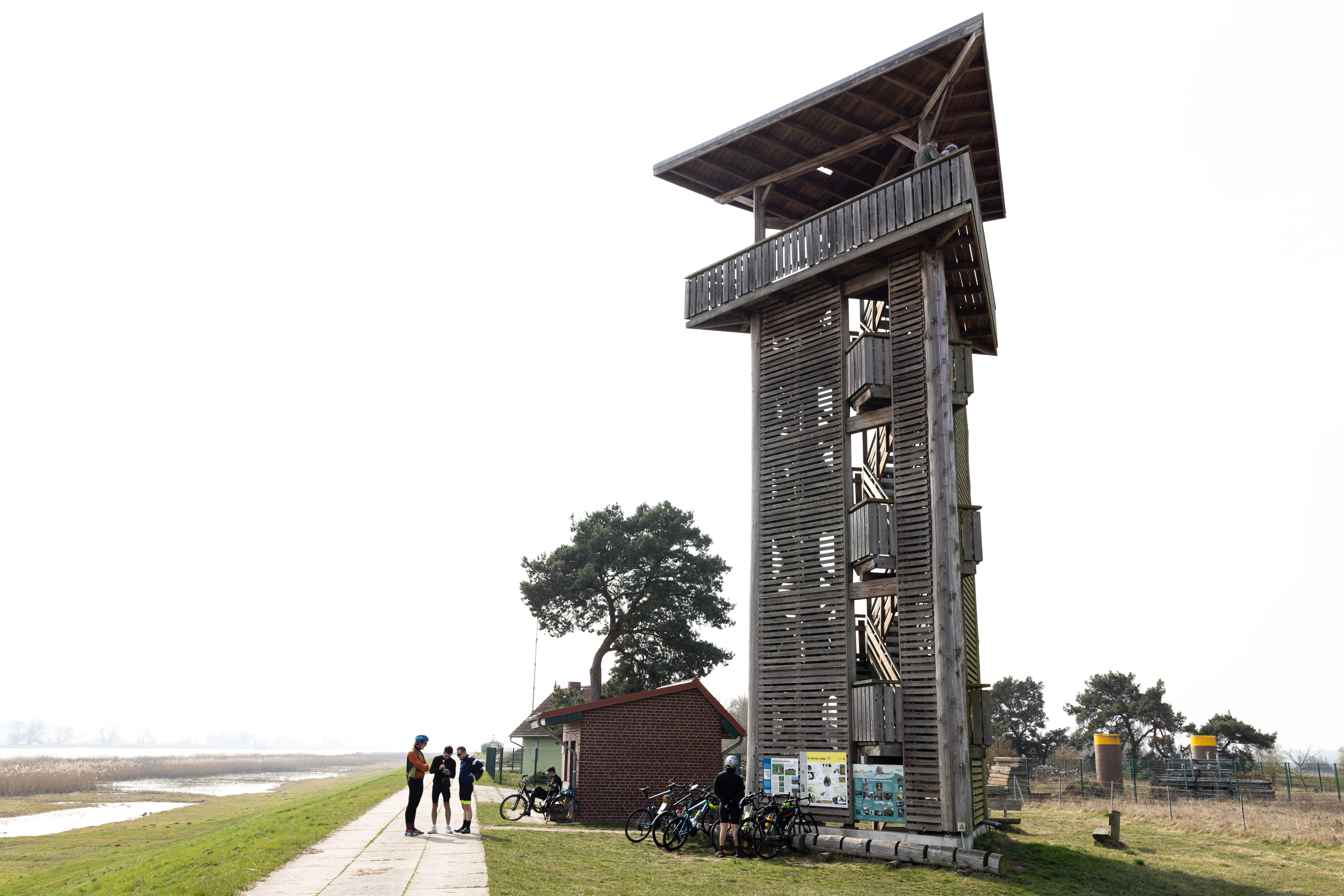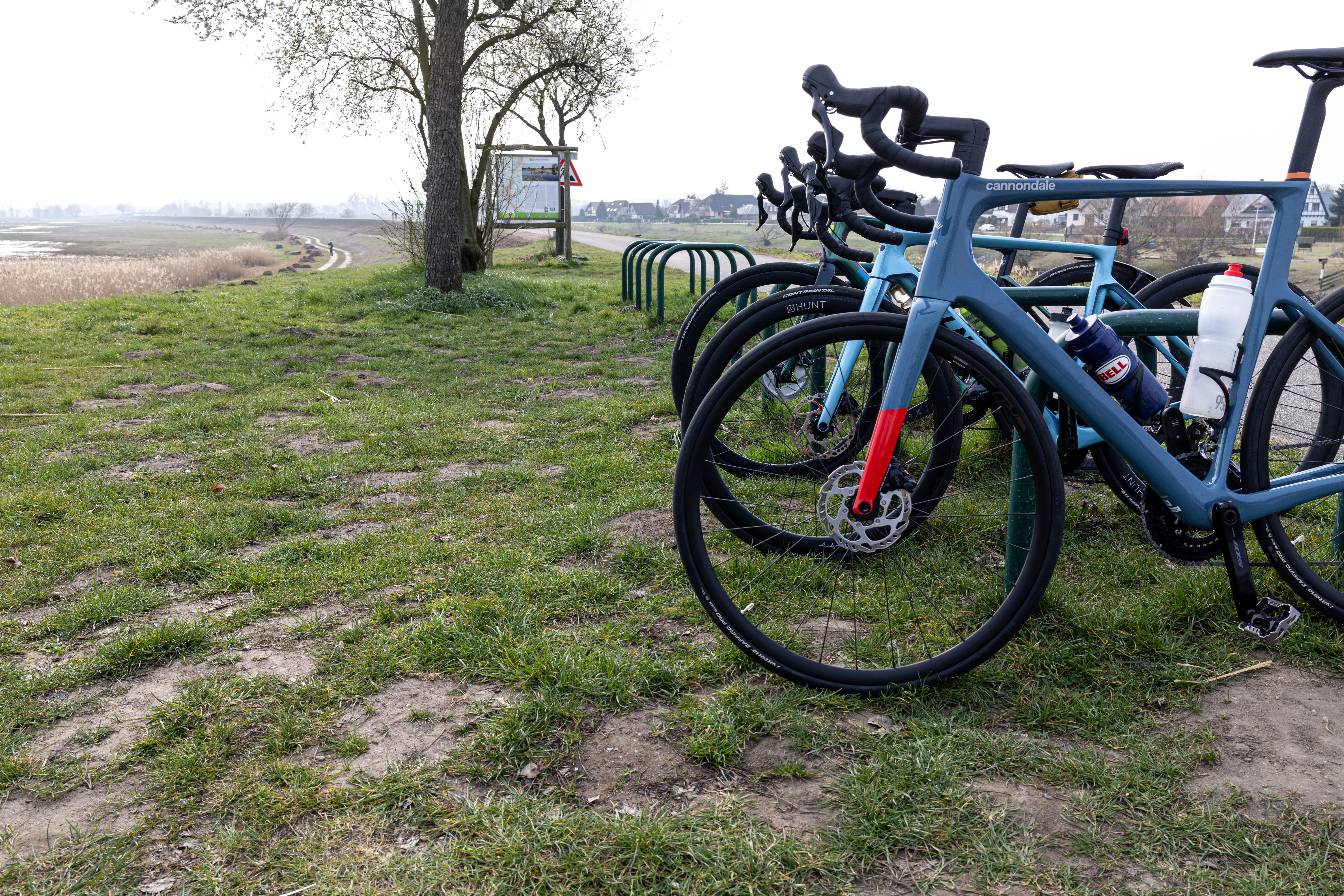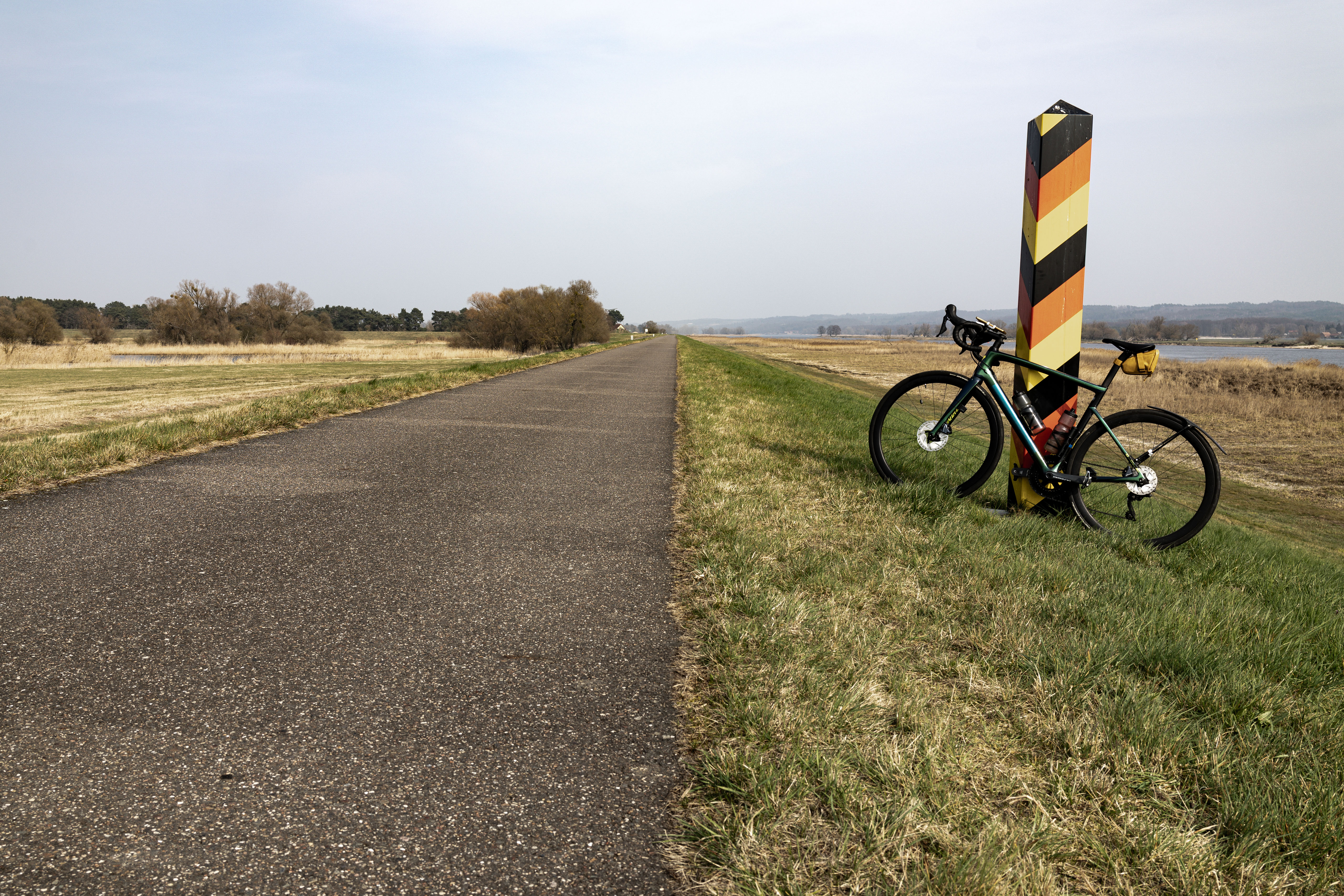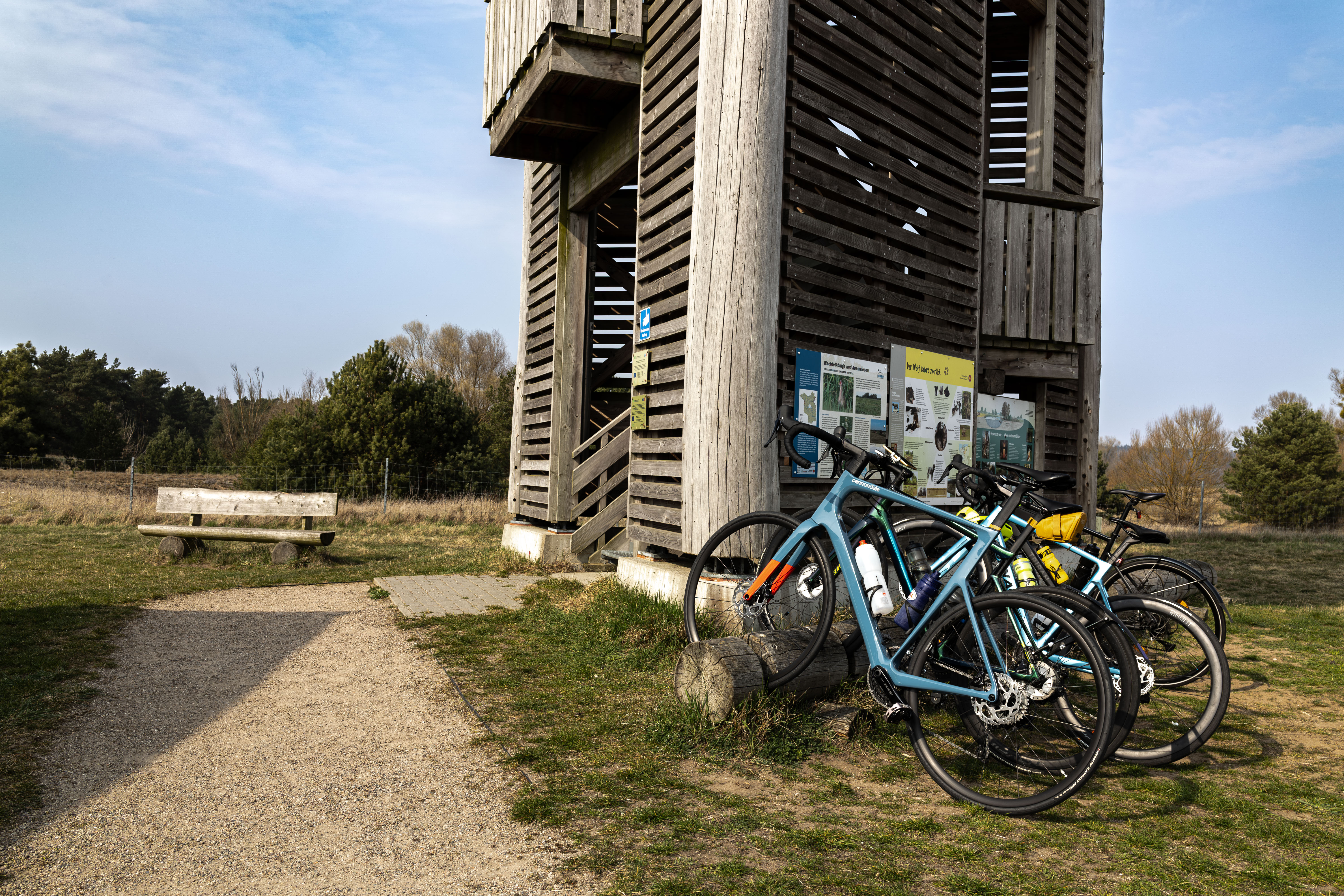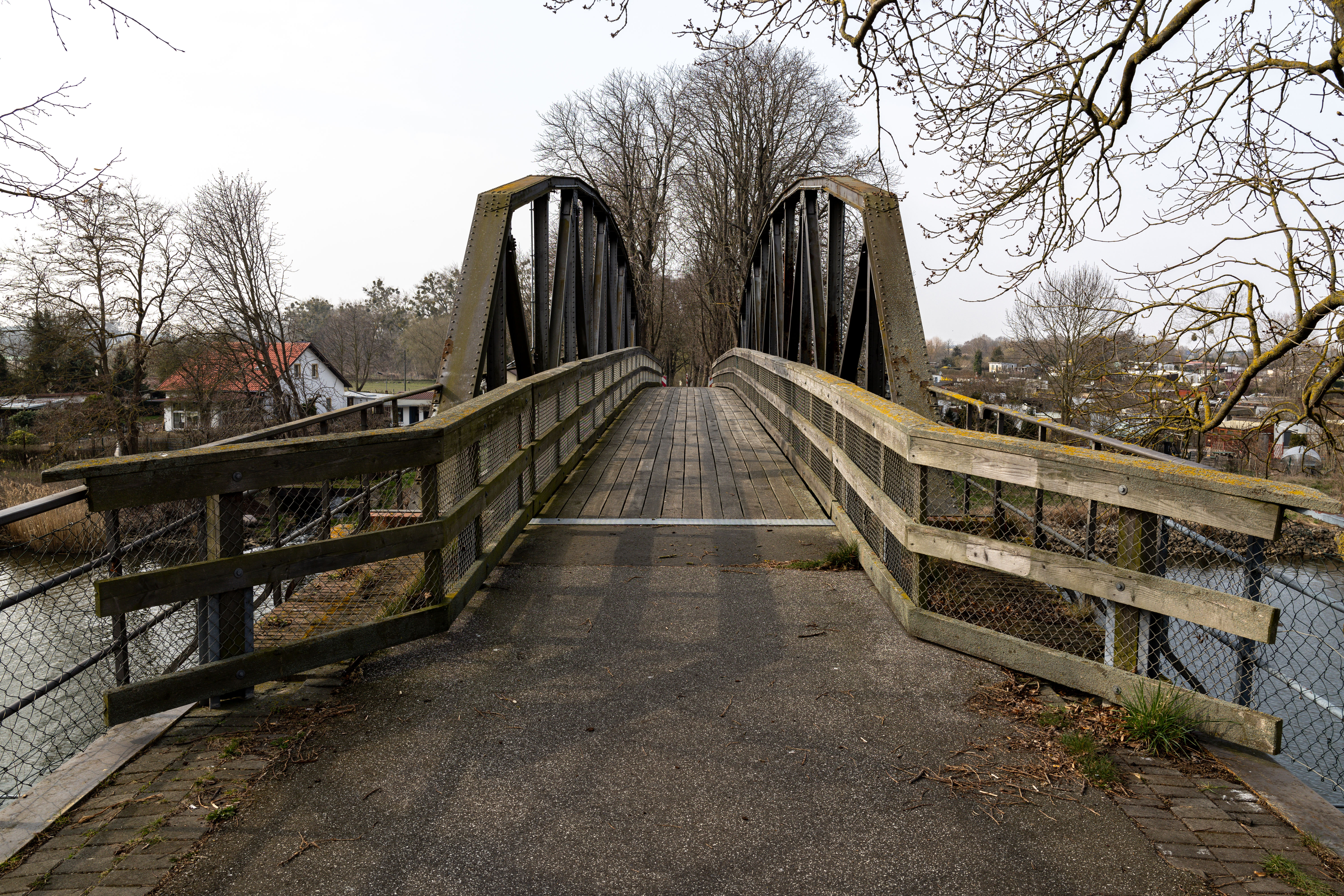 A tranquil scene of a field with a small stream, surrounded by tall, dry grass and bare trees, is captured in a low-angle perspective. In the distance, a white building with a blue roof is visible, and a few trees are scattered around the field. The sky is a clear blue, and the overall mood is serene and peaceful.