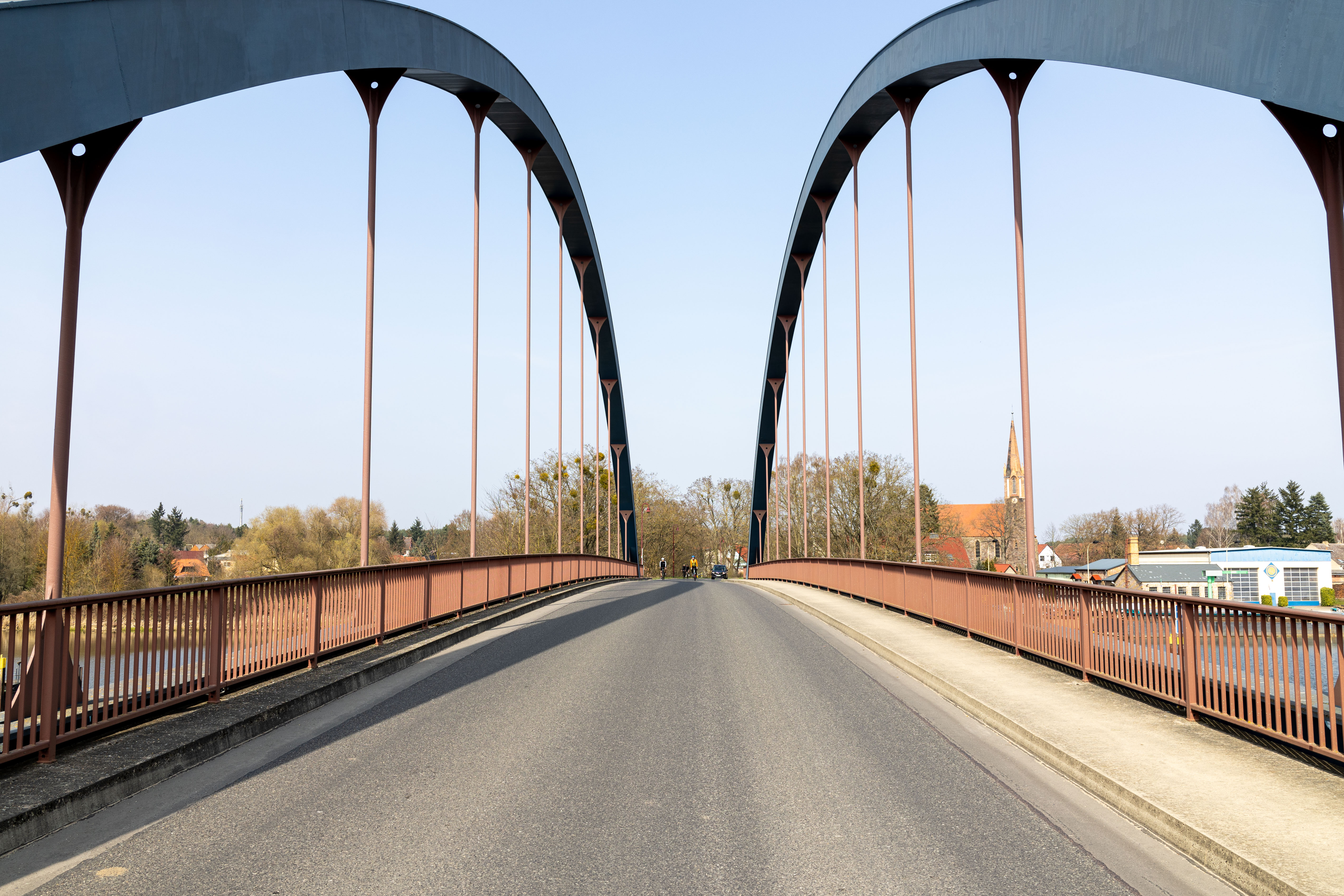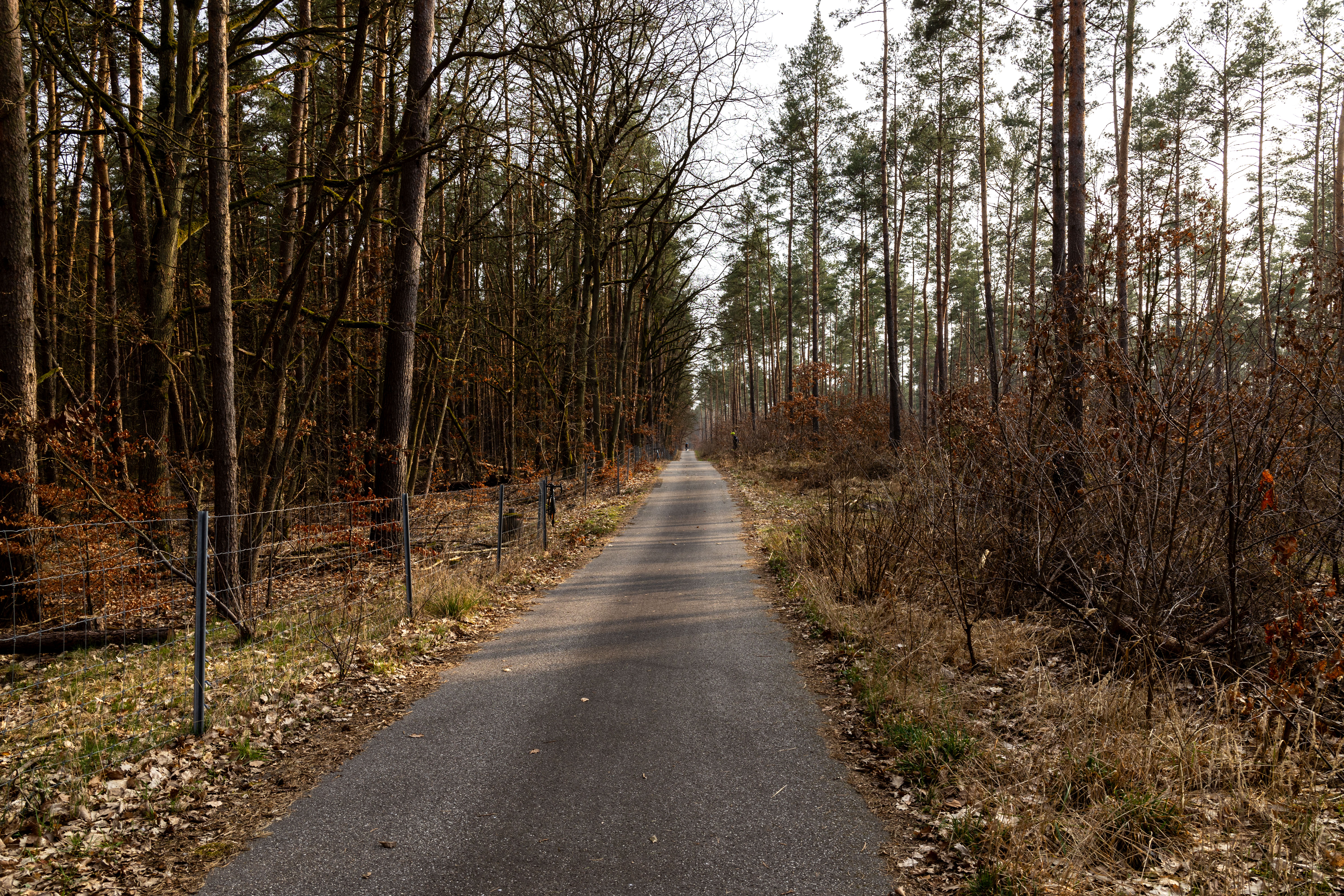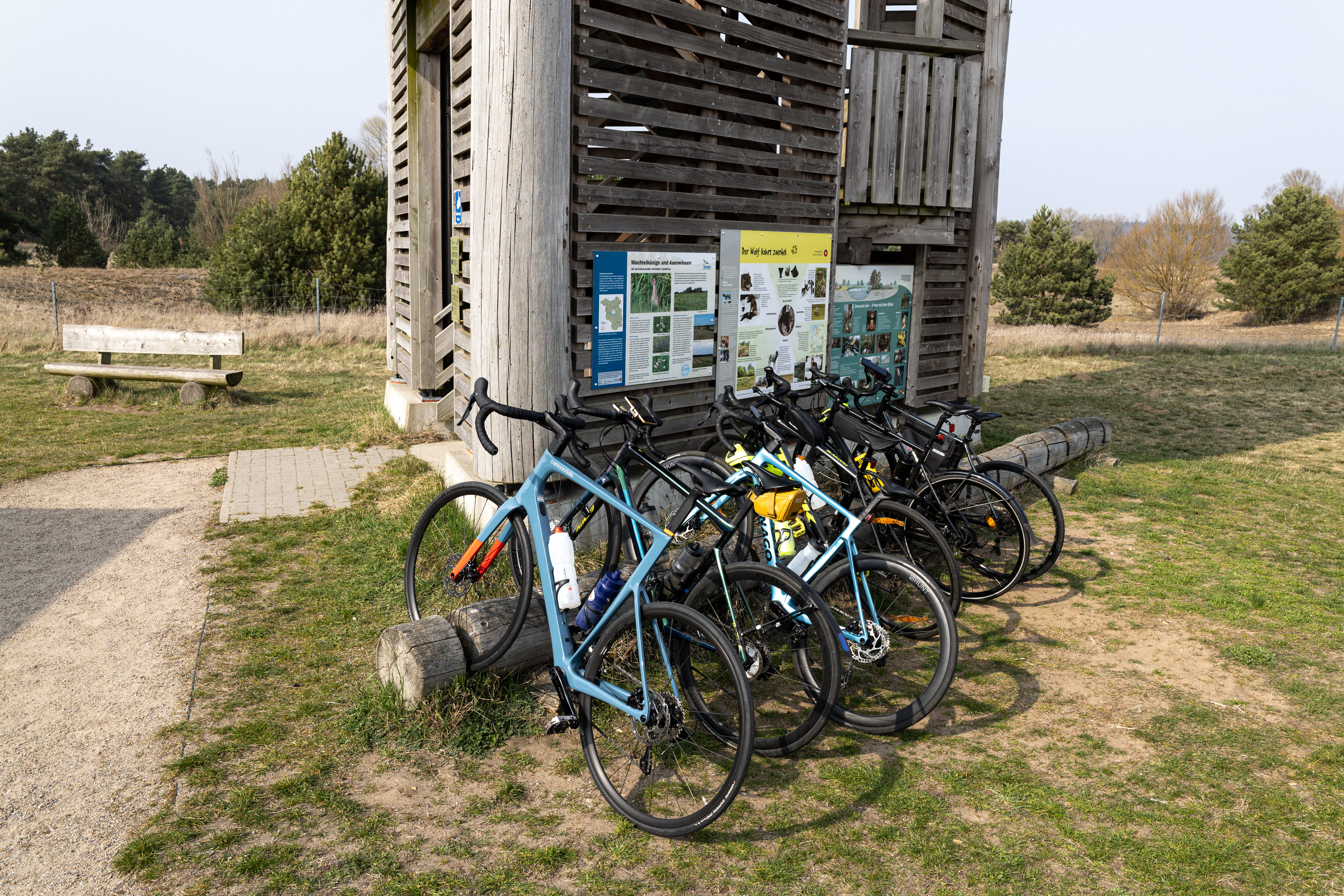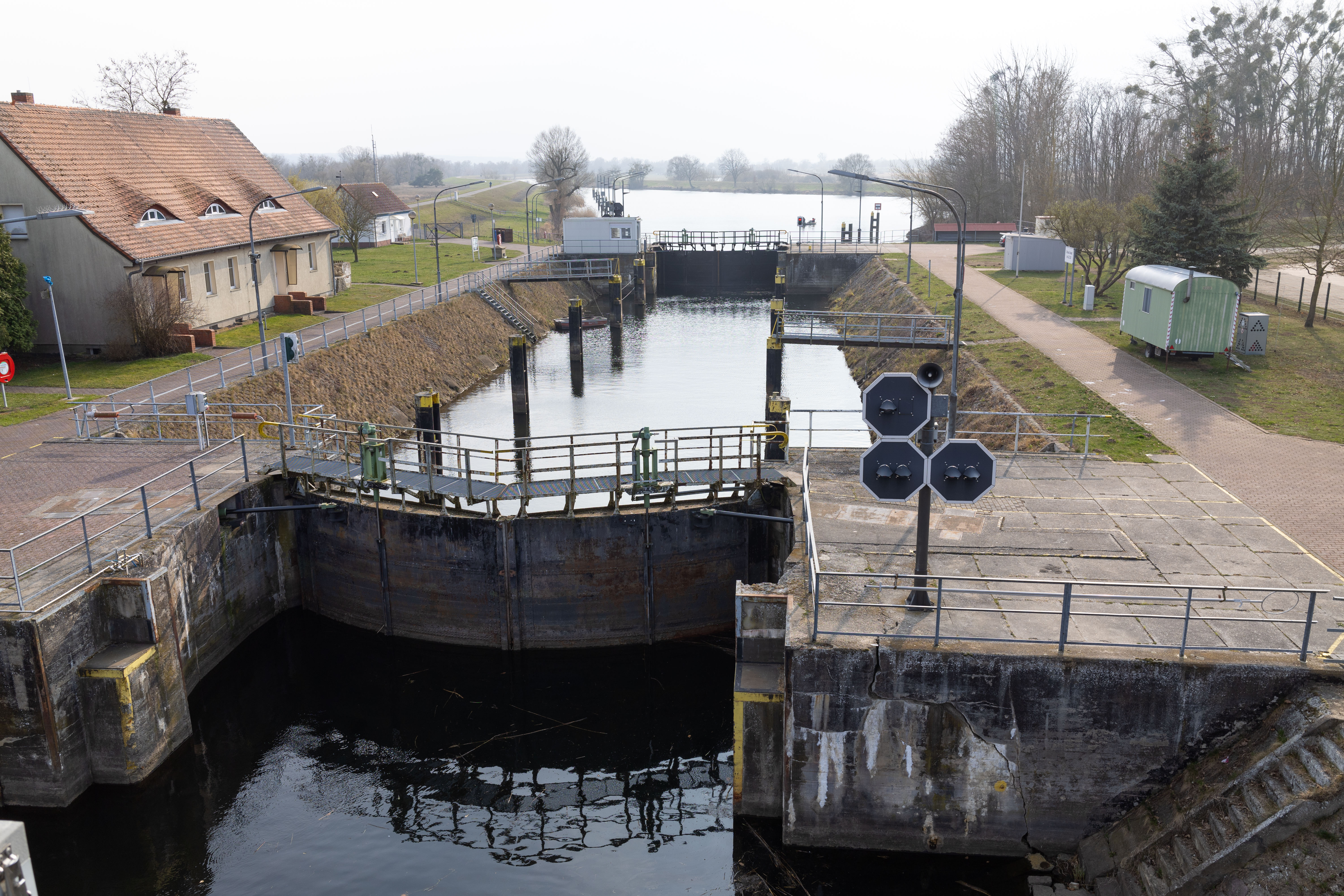 A tranquil scene of a field with a small stream, surrounded by tall, dry grass and bare trees, is captured in a low-angle perspective. In the distance, a white building with a blue roof is visible, and a few trees are scattered around the field. The sky is a clear blue, and the overall mood is serene and peaceful.