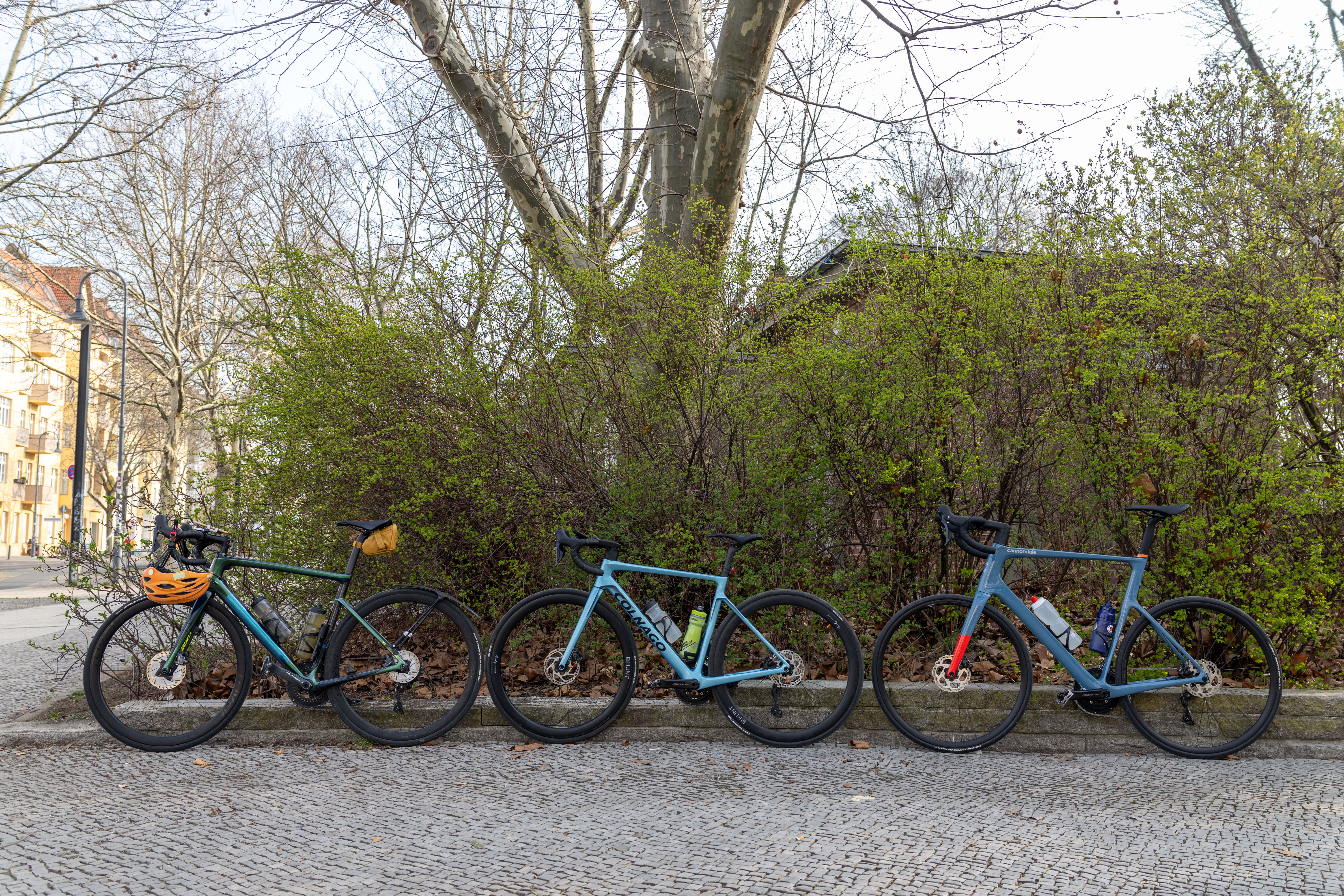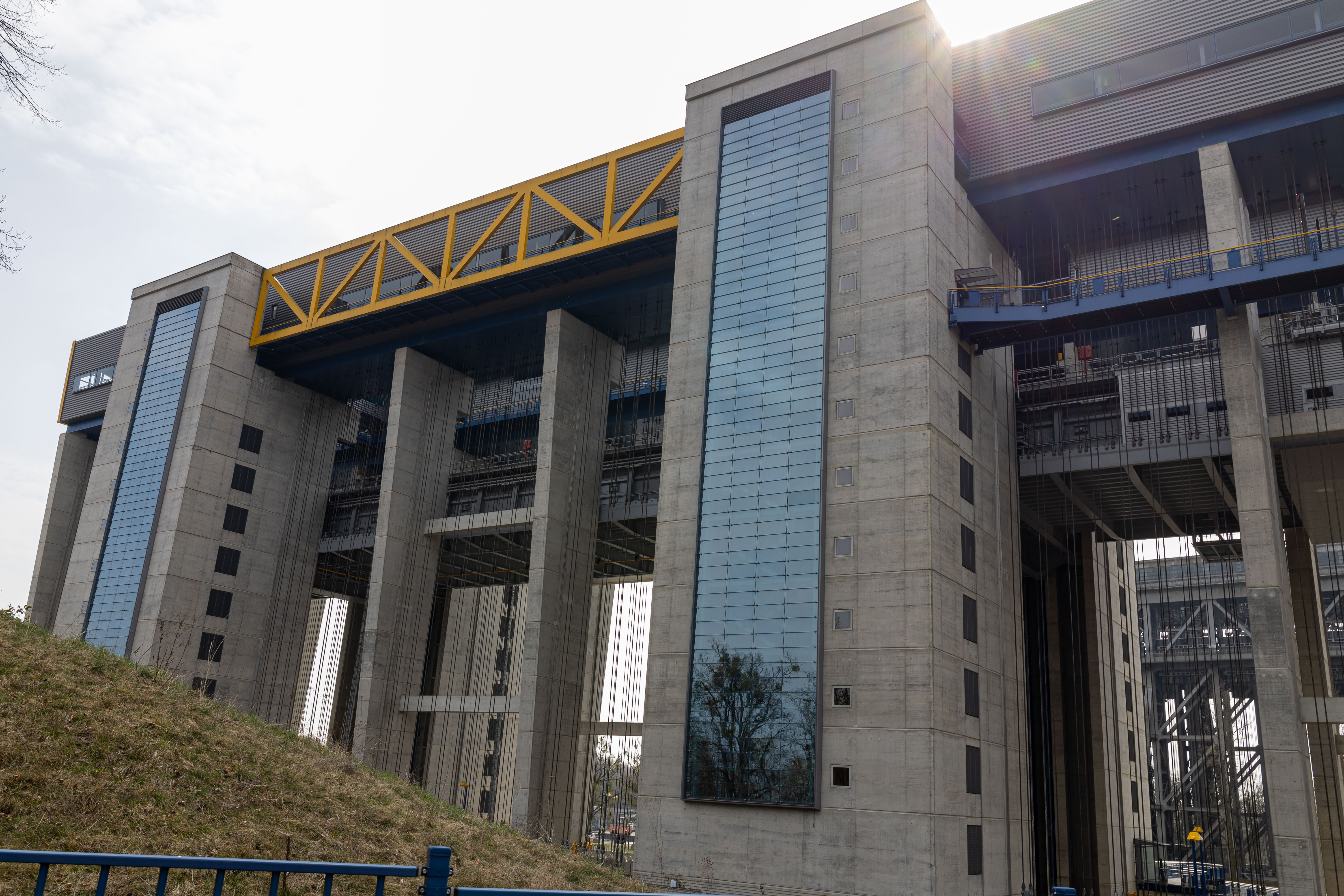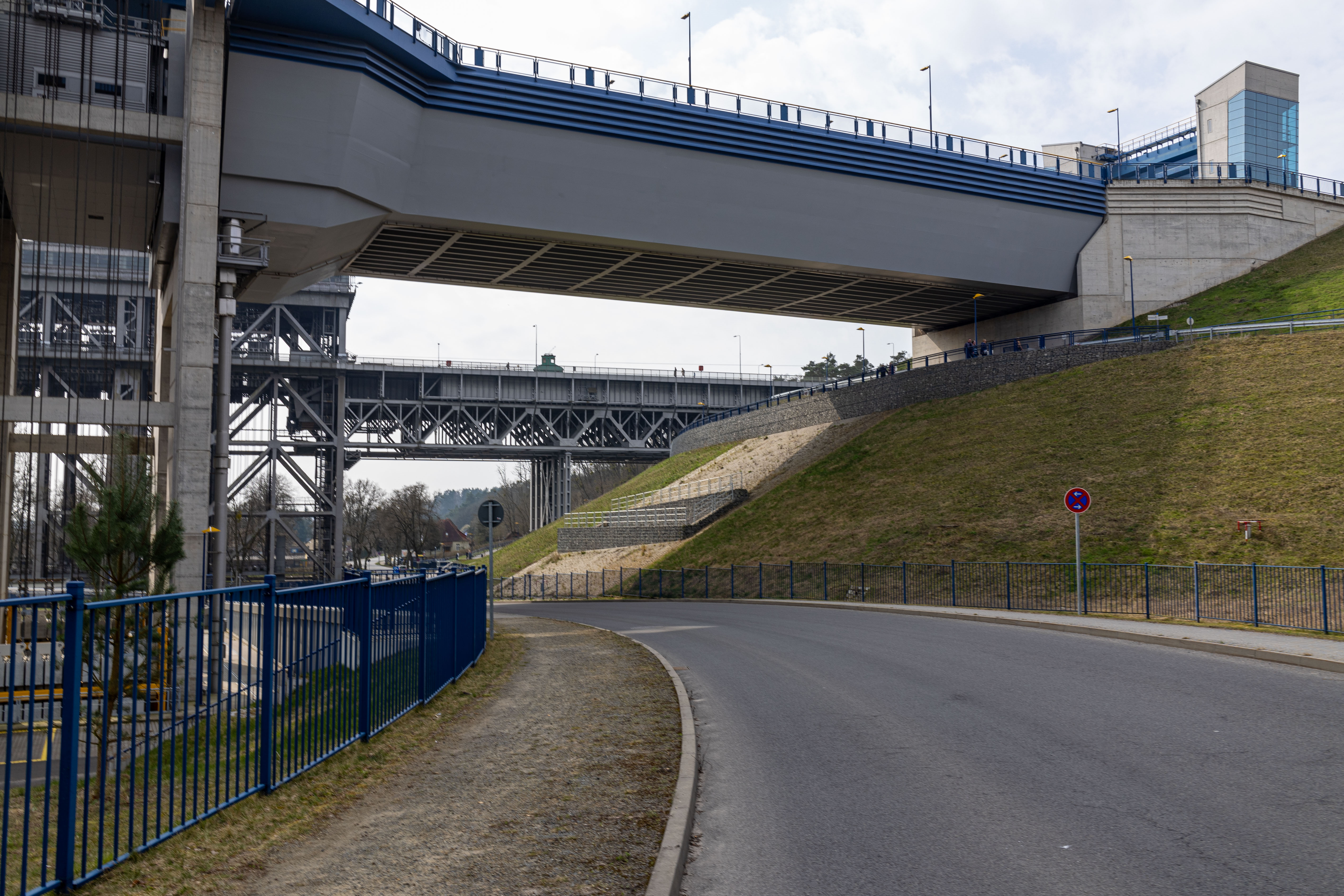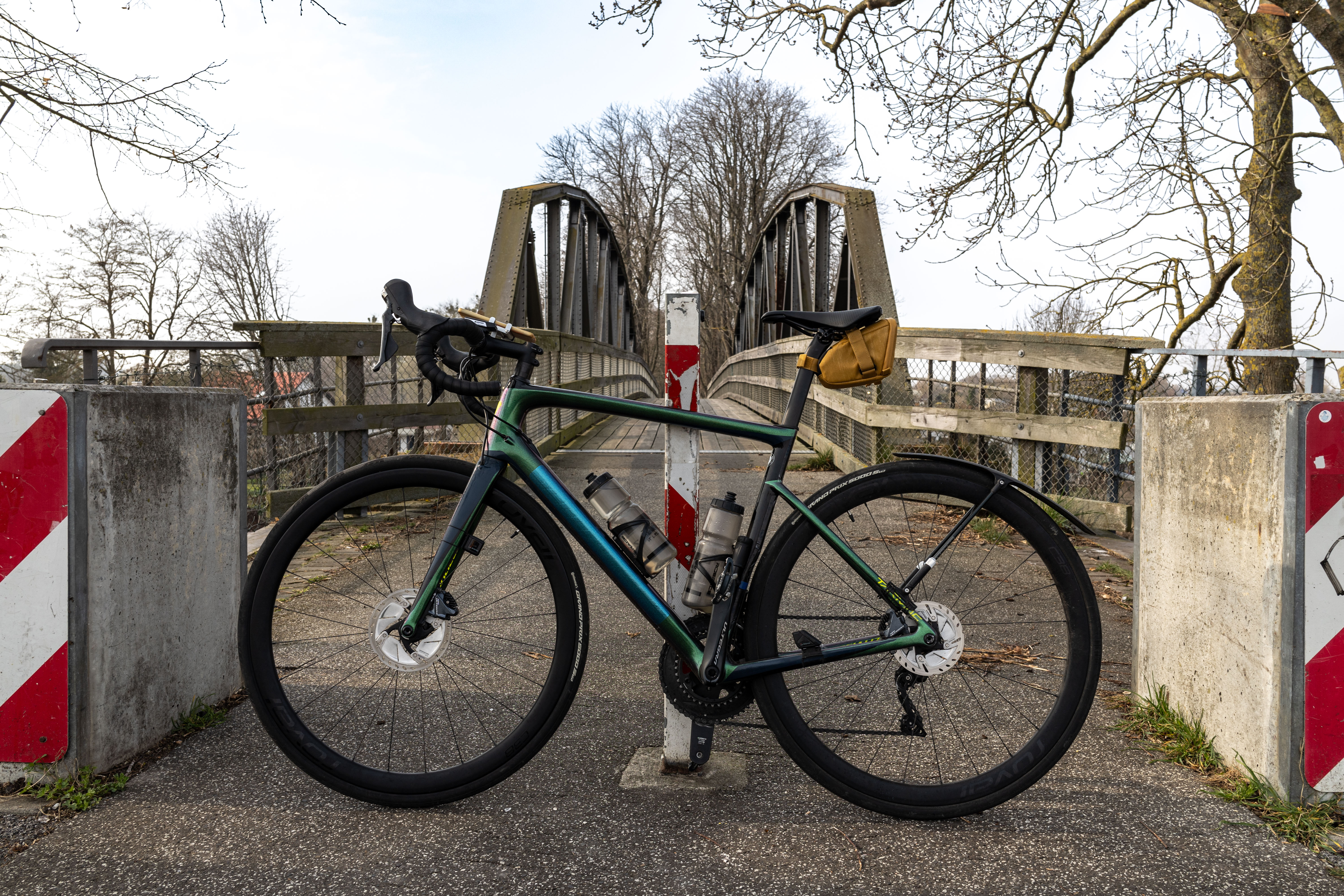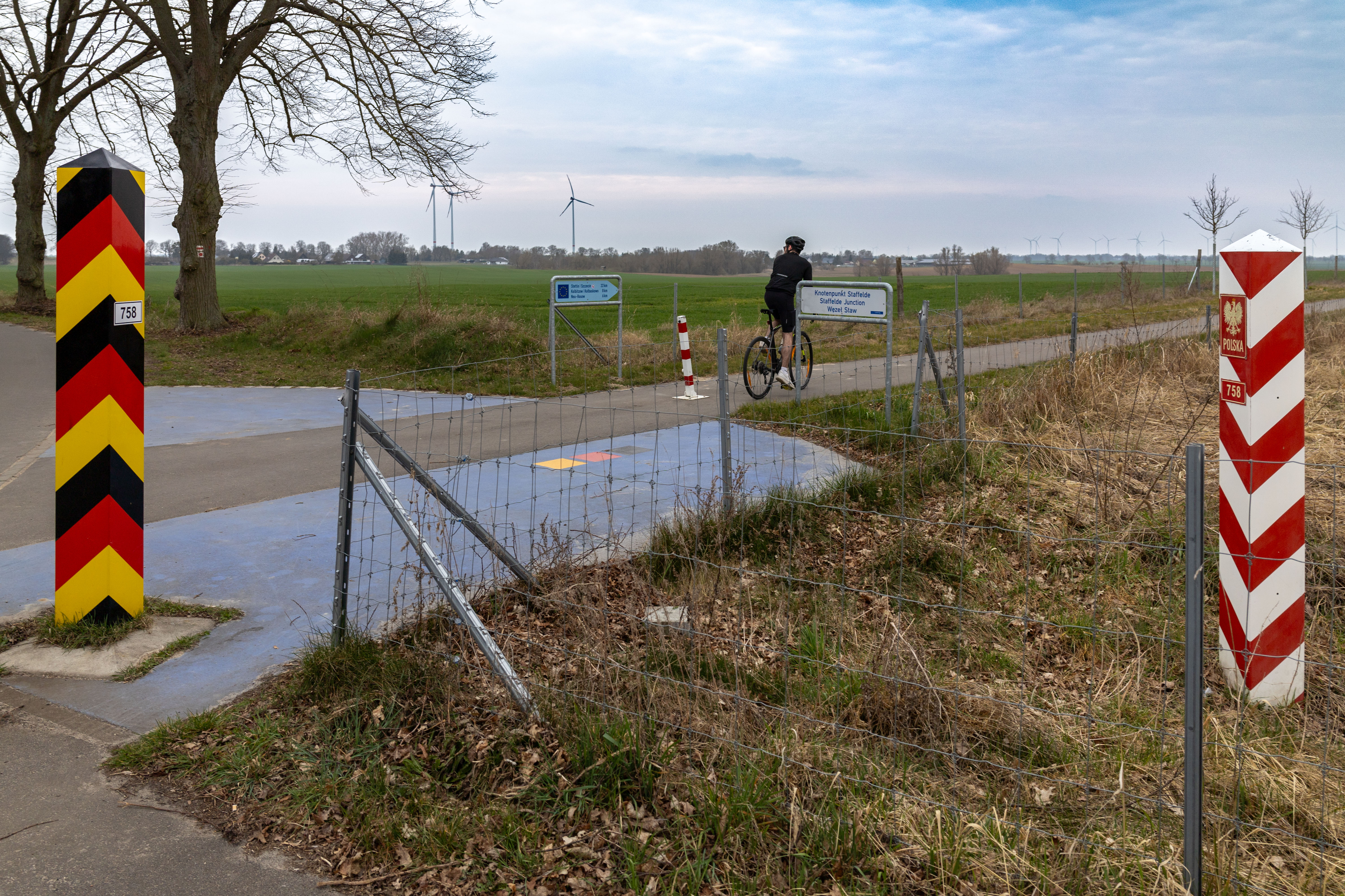 A tranquil scene of a field with a small stream, surrounded by tall, dry grass and bare trees, is captured in a low-angle perspective. In the distance, a white building with a blue roof is visible, and a few trees are scattered around the field. The sky is a clear blue, and the overall mood is serene and peaceful.