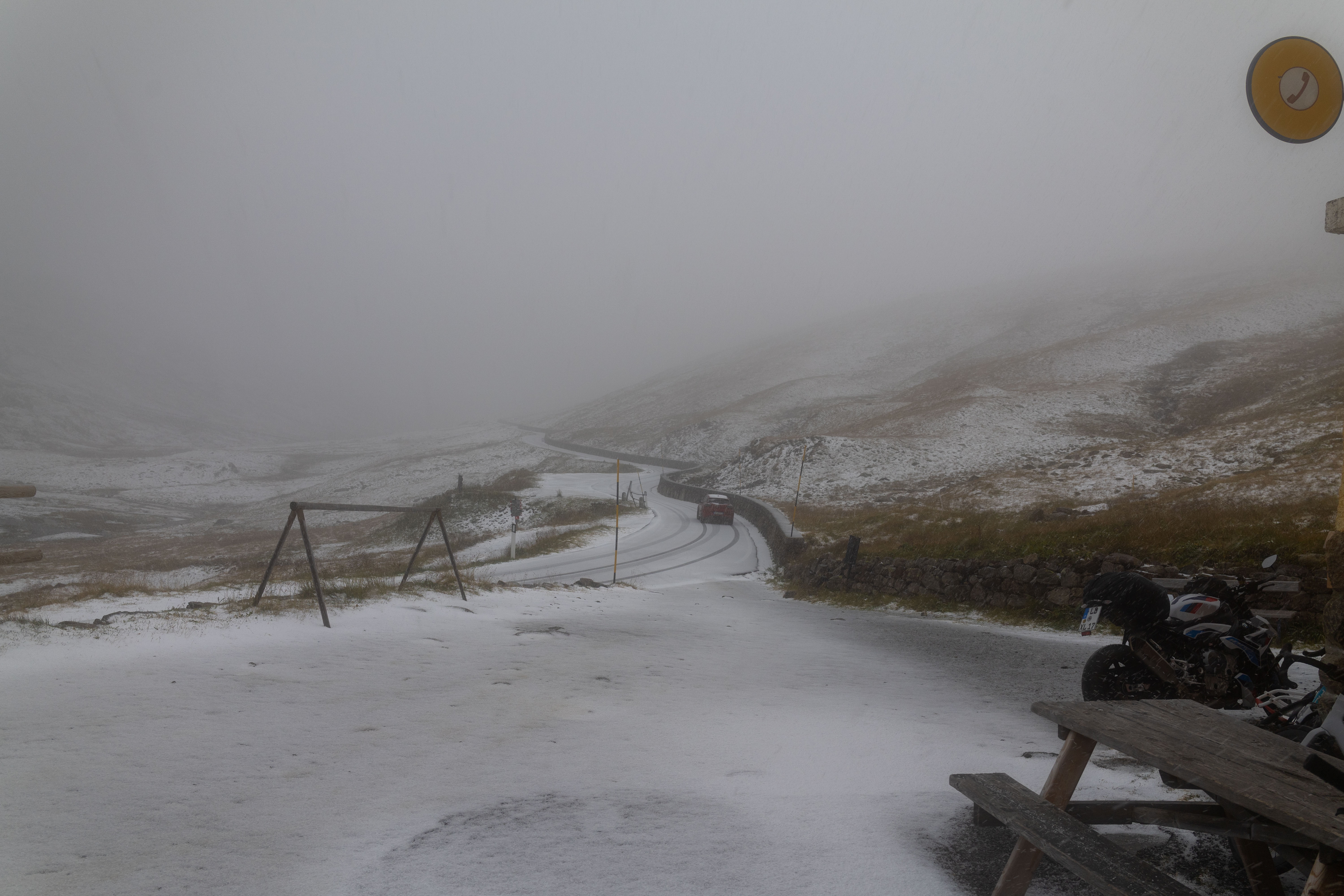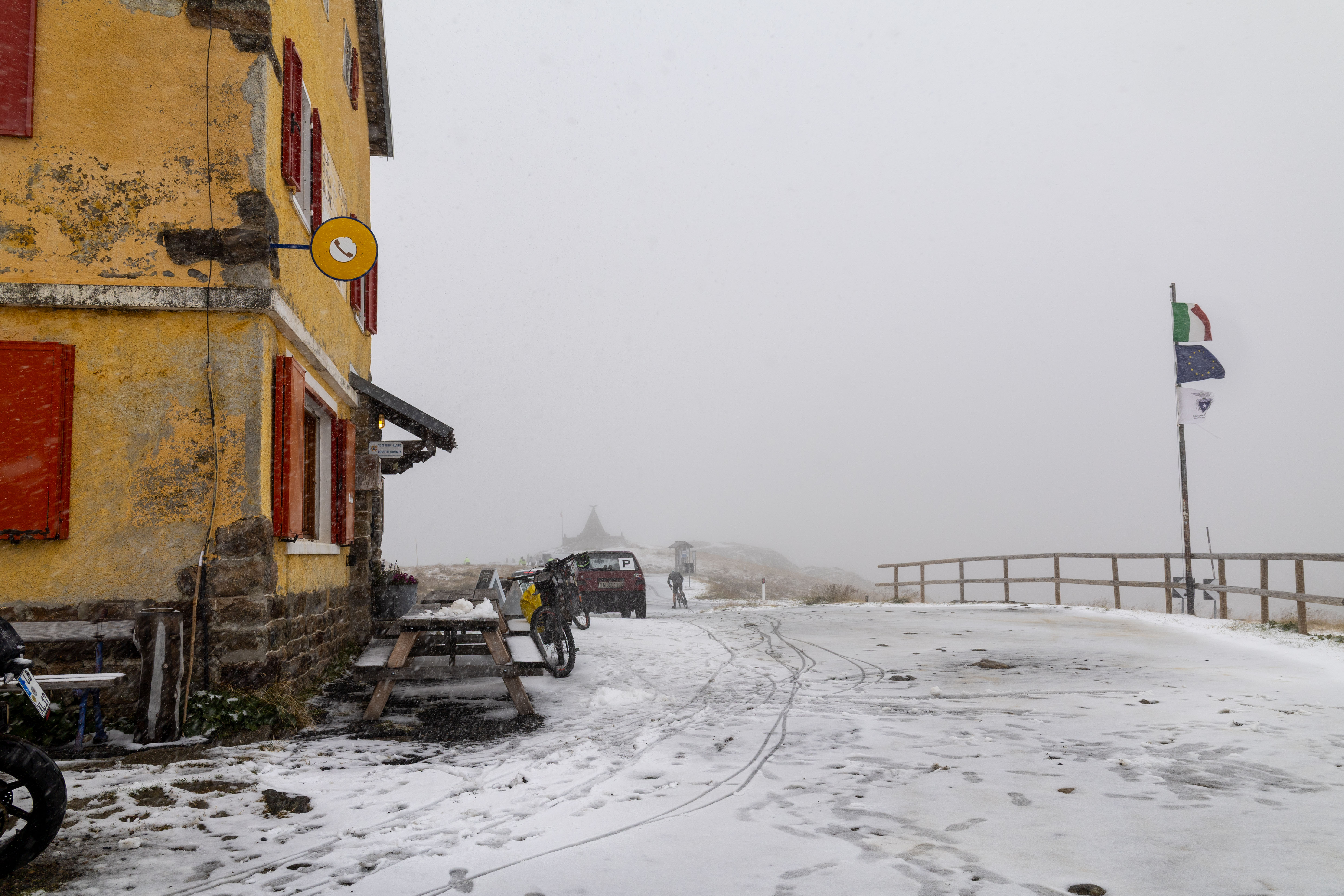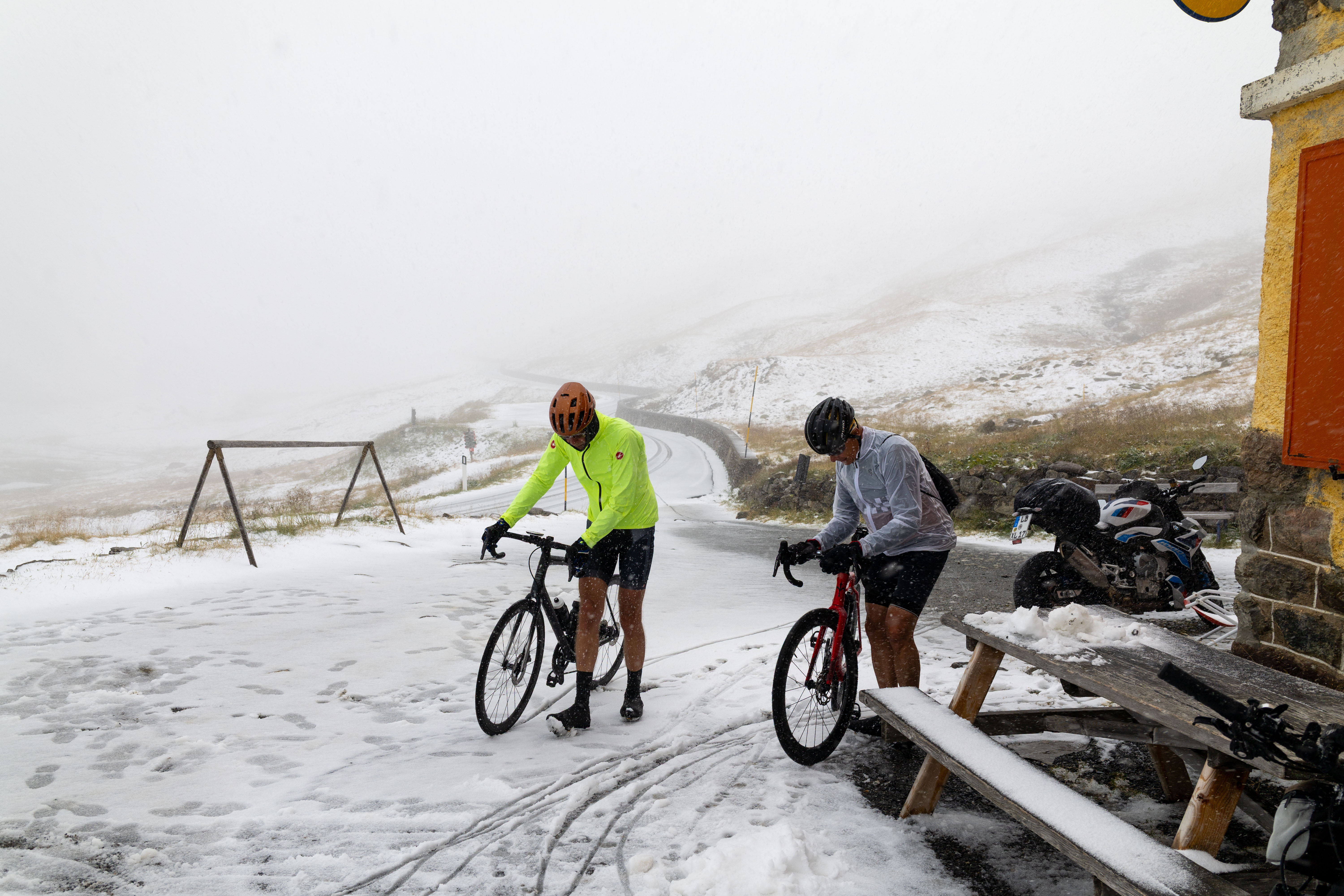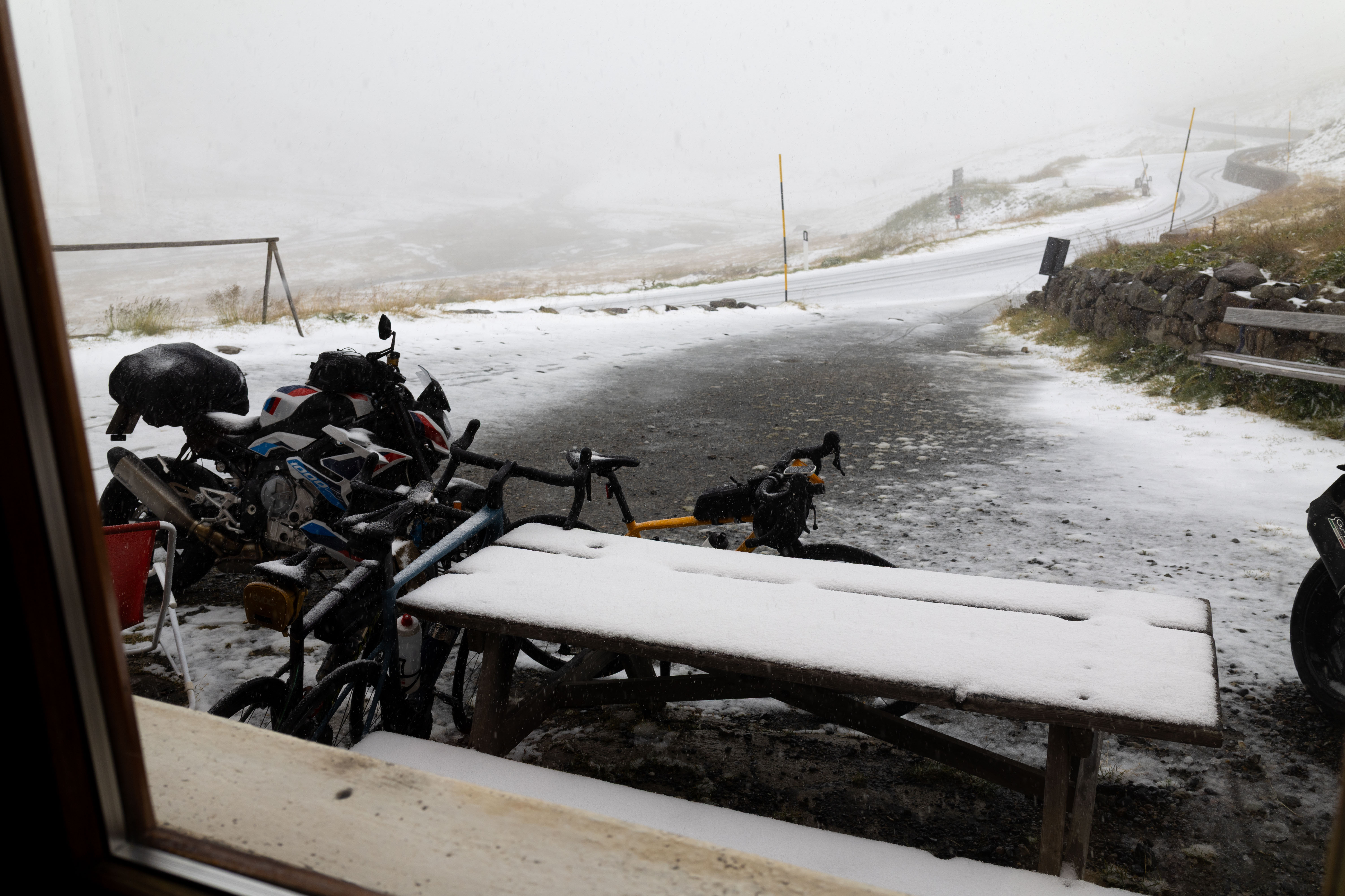 The temperature dropped as we climbed. We started at around 25°C at the base and reached 0°C with wet snow at the summit. The forecast came true with a delay, and we found ourselves in a snowstorm. Riding became tougher, but we made it to a small restaurant at the top, where we warmed up by the stove and refueled with a delicious local lunch.