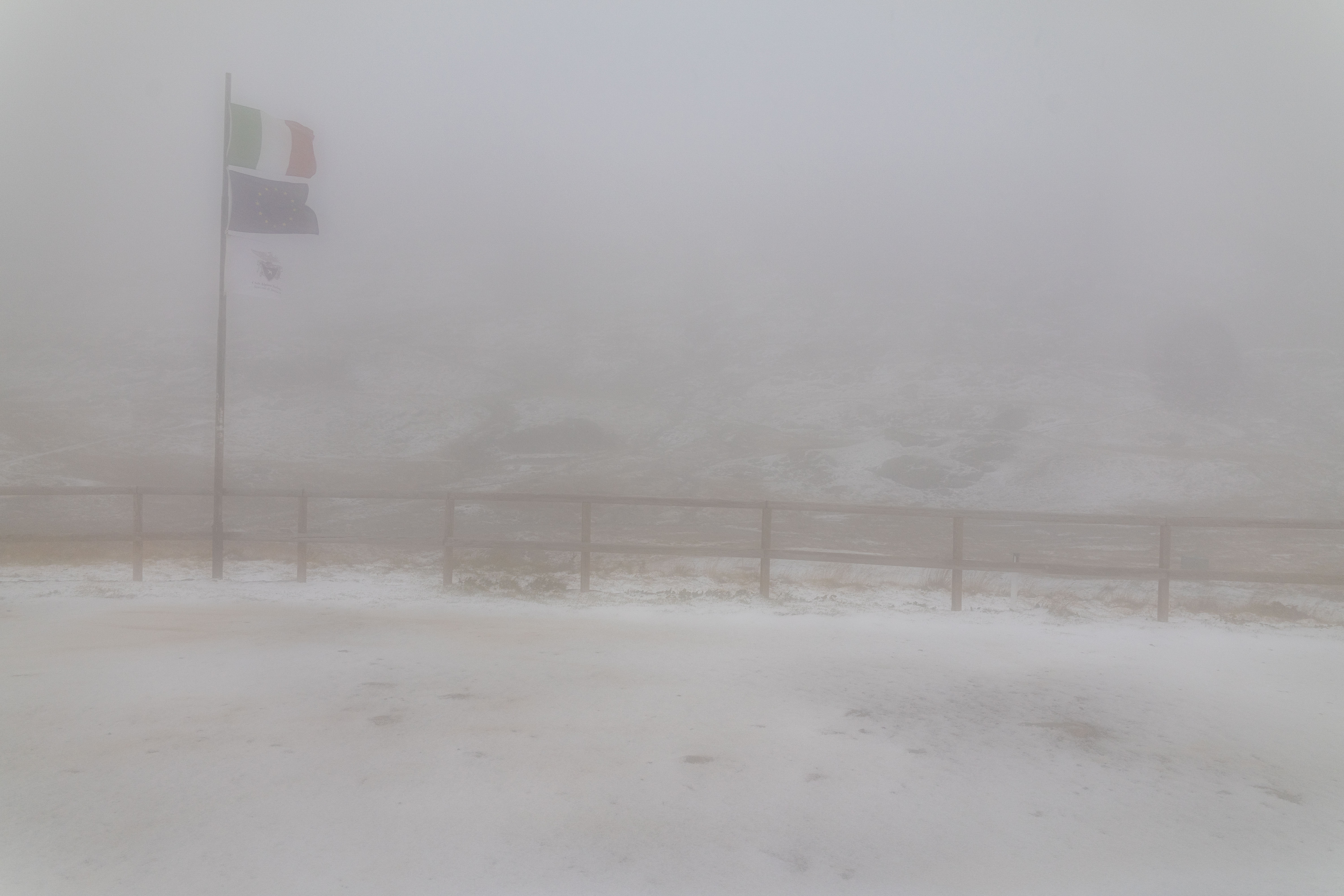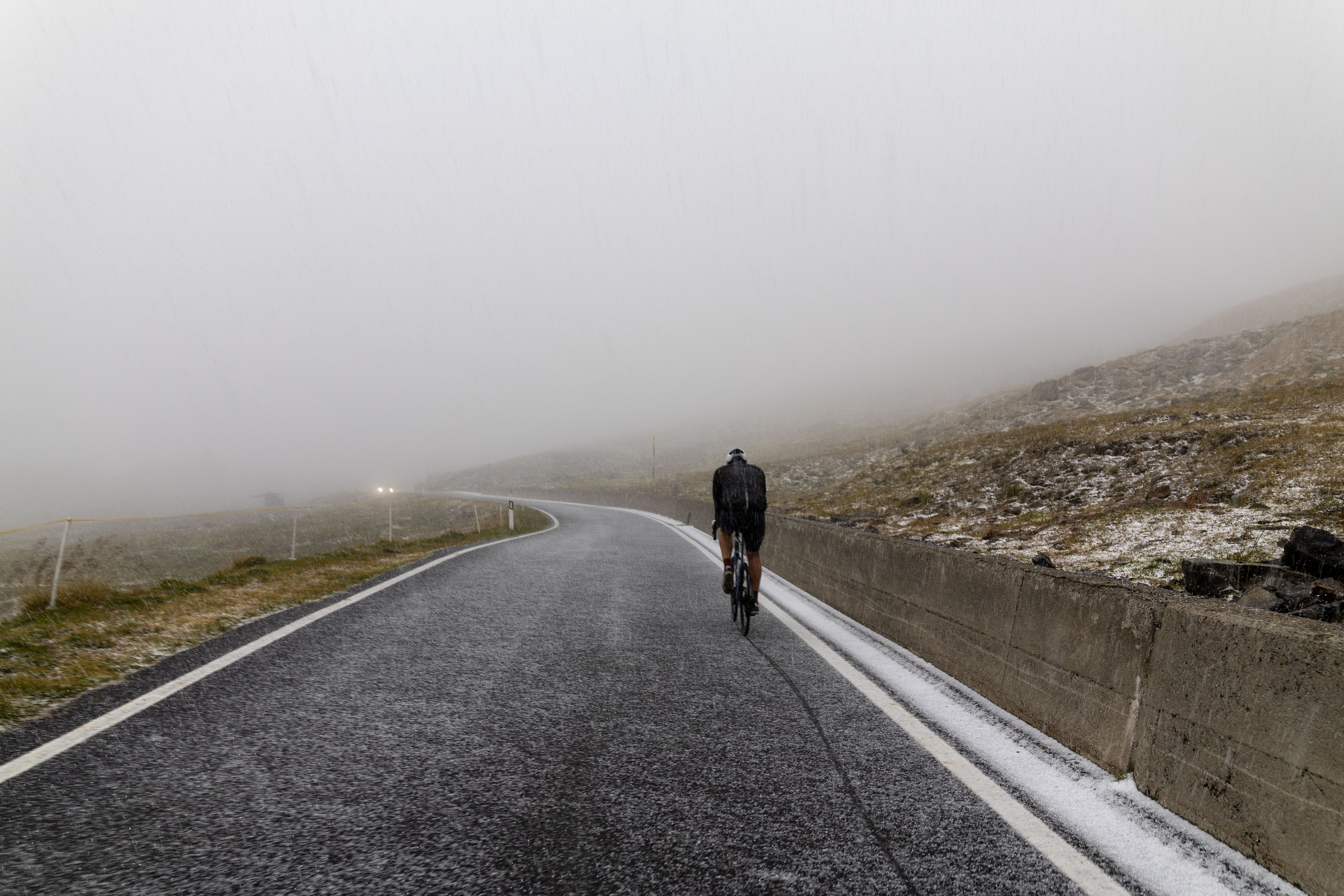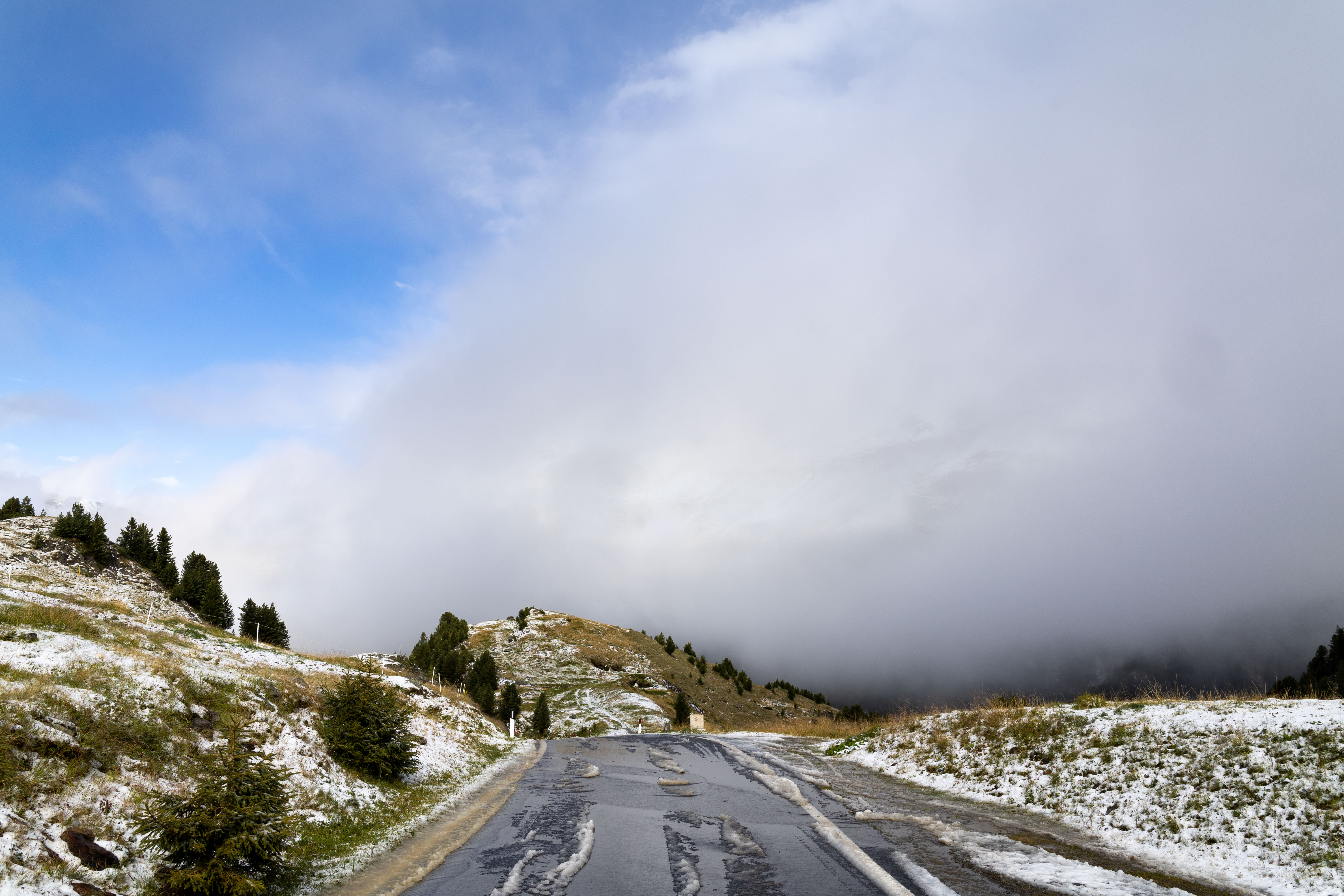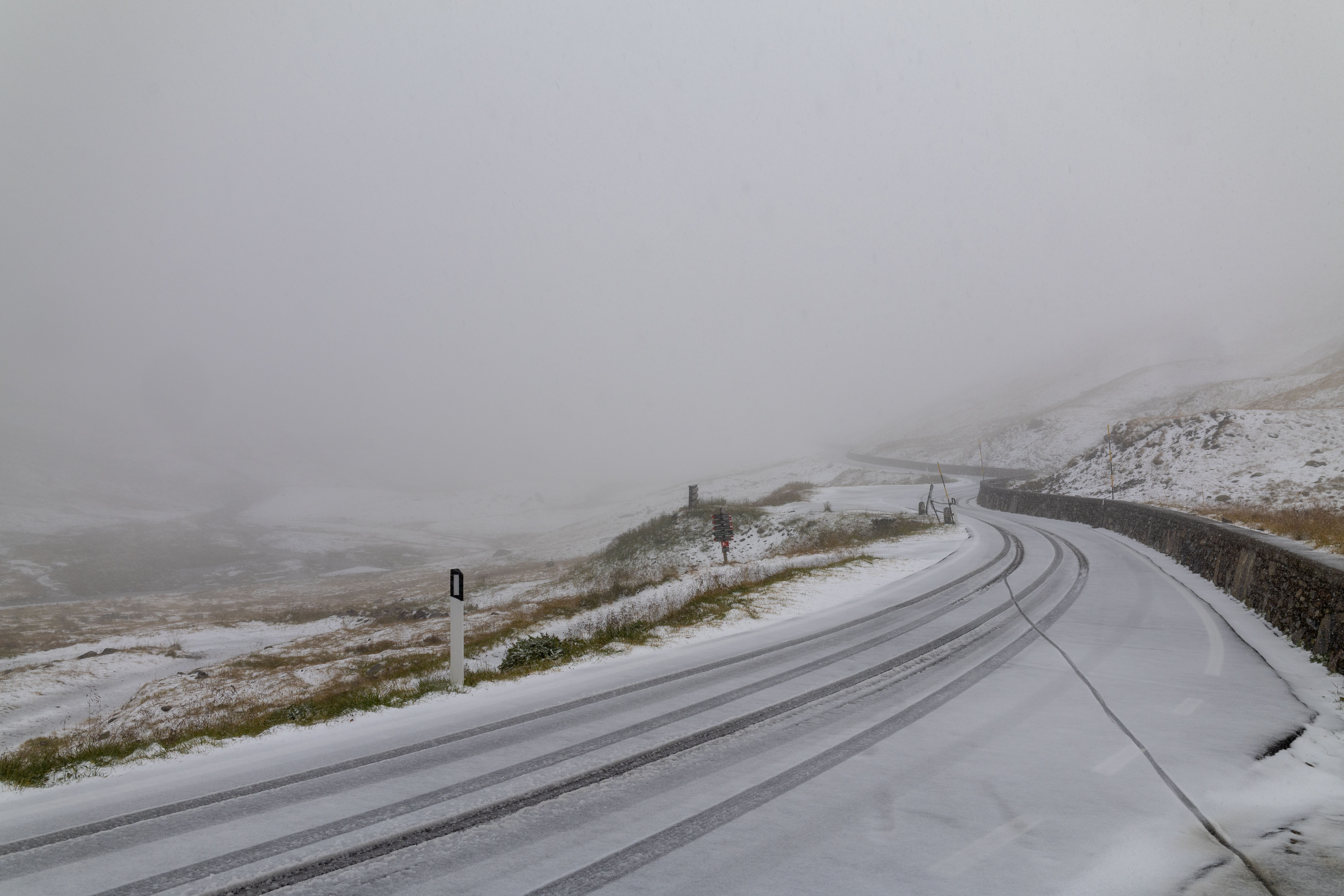 The temperature dropped as we climbed. We started at around 25°C at the base and reached 0°C with wet snow at the summit. The forecast came true with a delay, and we found ourselves in a snowstorm. Riding became tougher, but we made it to a small restaurant at the top, where we warmed up by the stove and refueled with a delicious local lunch.