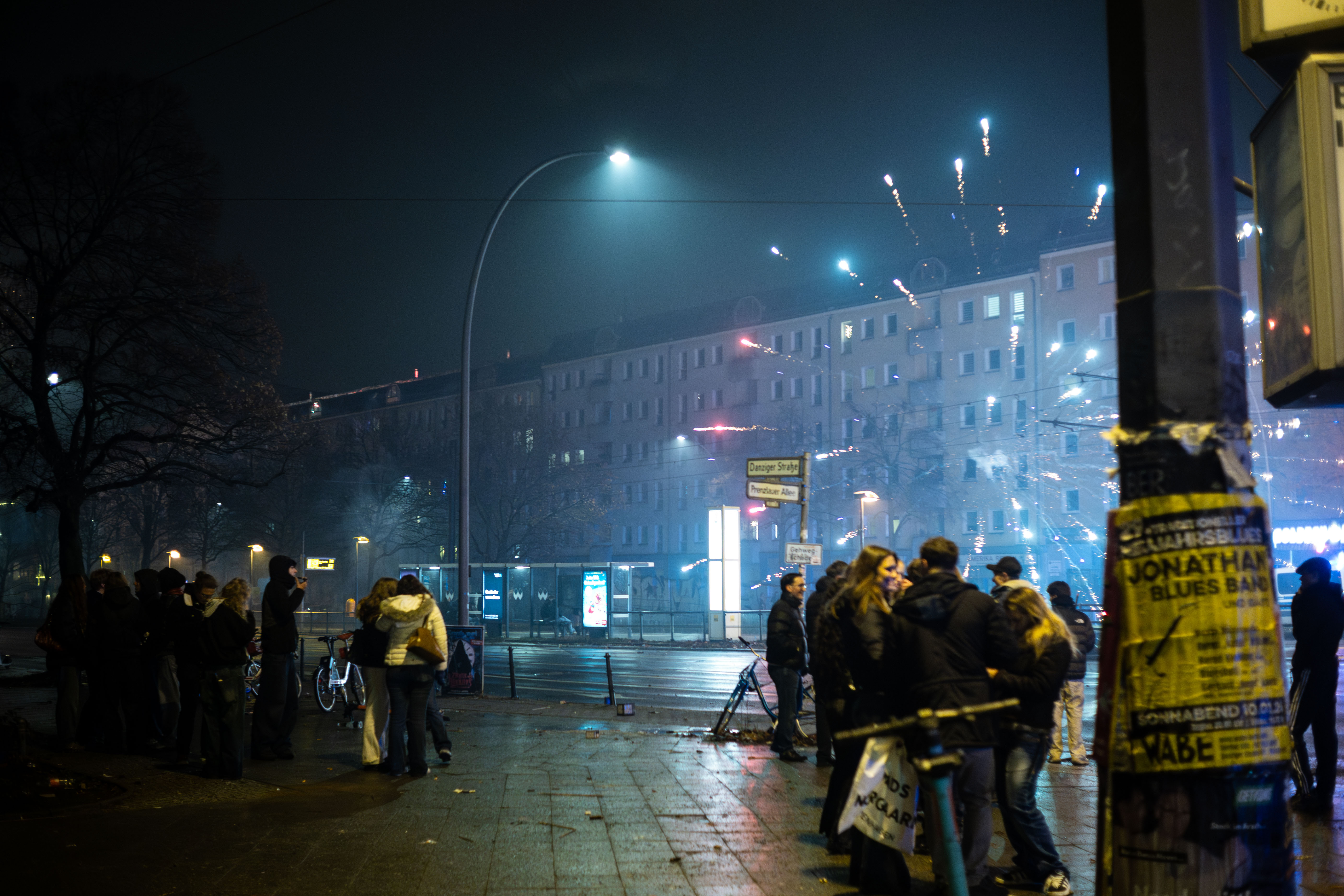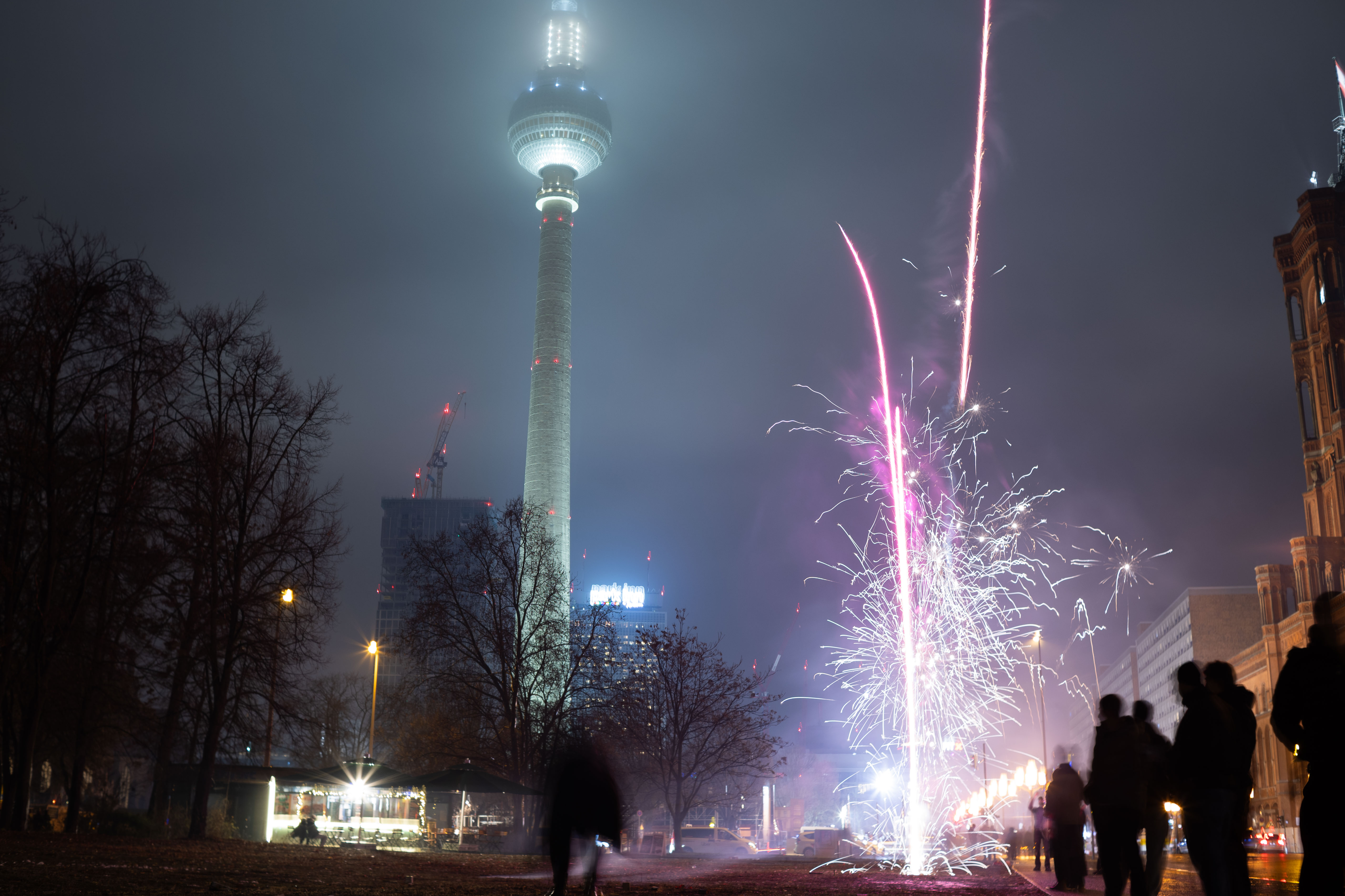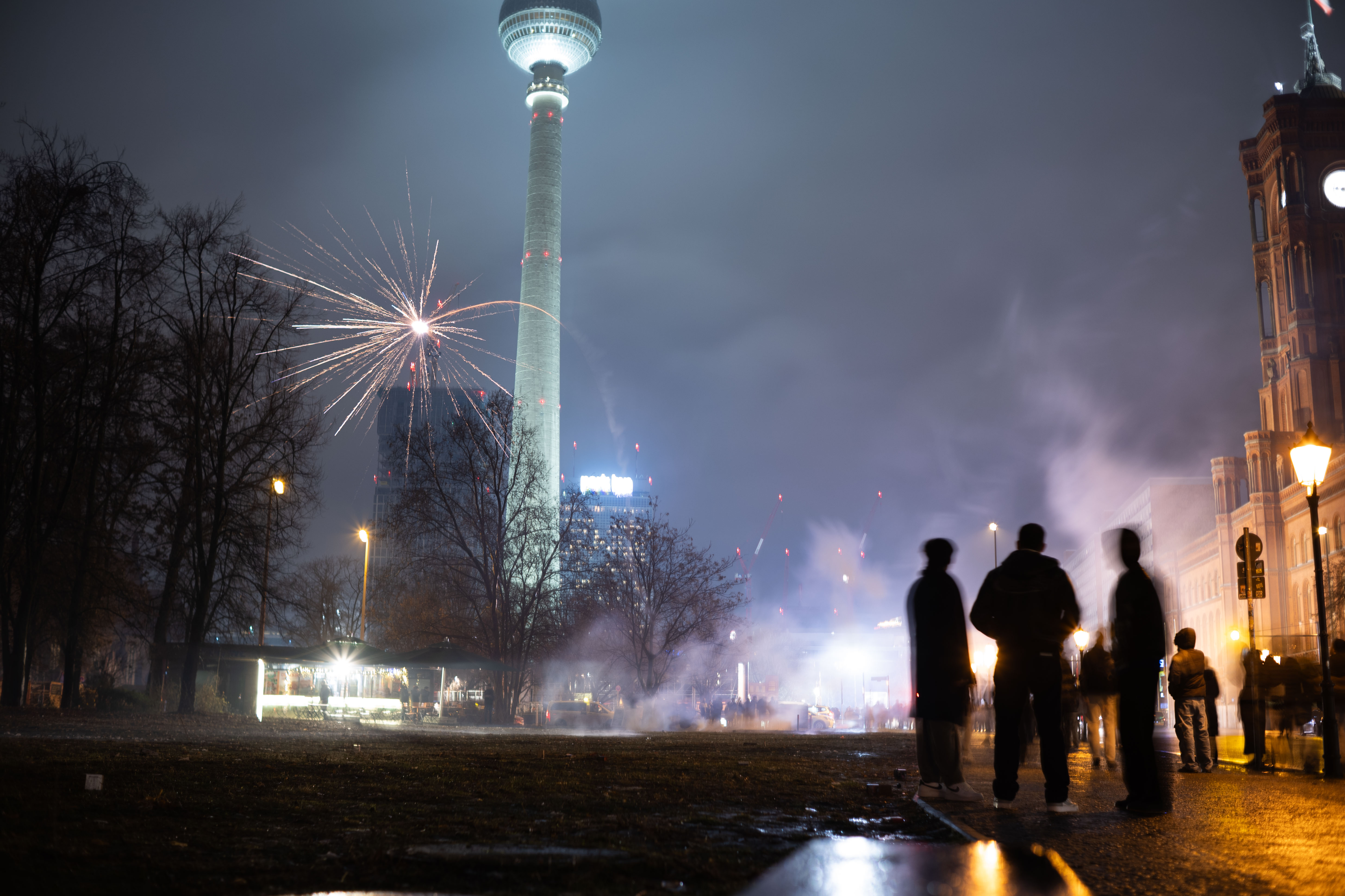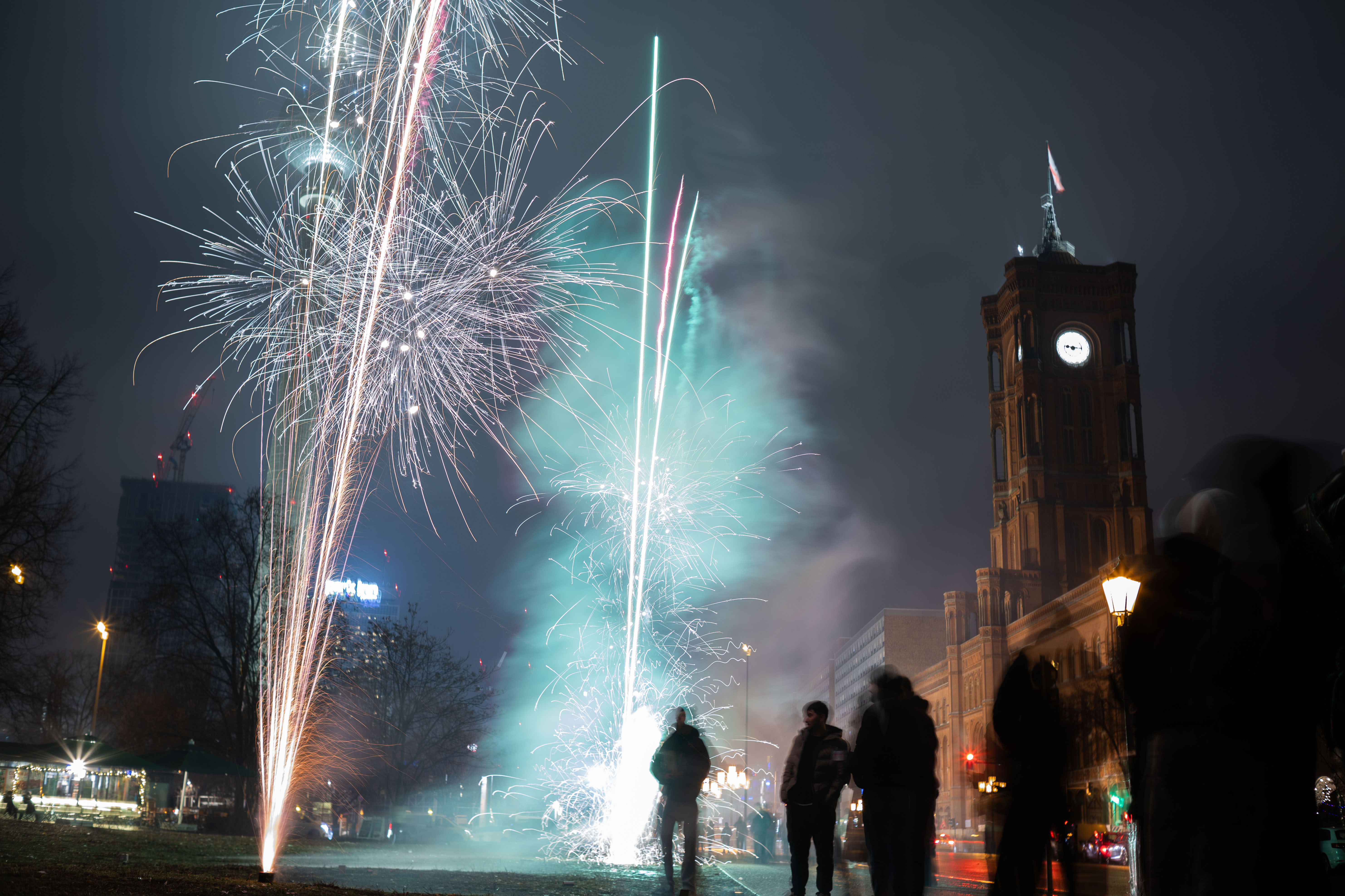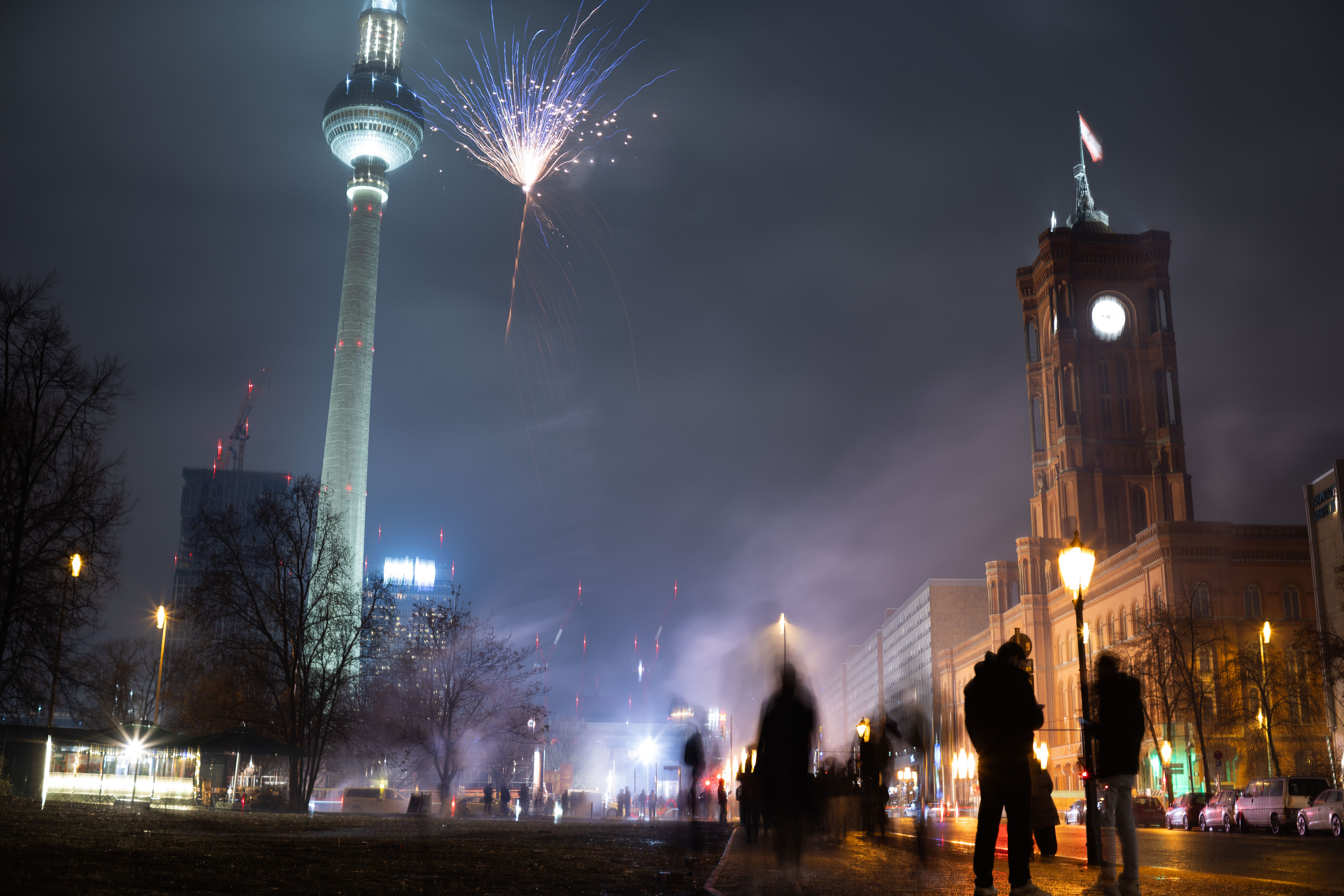 The image captures a vibrant night scene in Berlin, Germany, with a fireworks display illuminating the sky. The fireworks, in hues of red, green, and white, are scattered across the sky, creating a dazzling spectacle. The cityscape in the background features tall buildings and a clock tower, with people visible in the foreground. The image is taken from a low angle, emphasizing the grandeur of the fireworks and the towering structures. The identifier "sa_1500" could be a reference to the specific location or event captured.