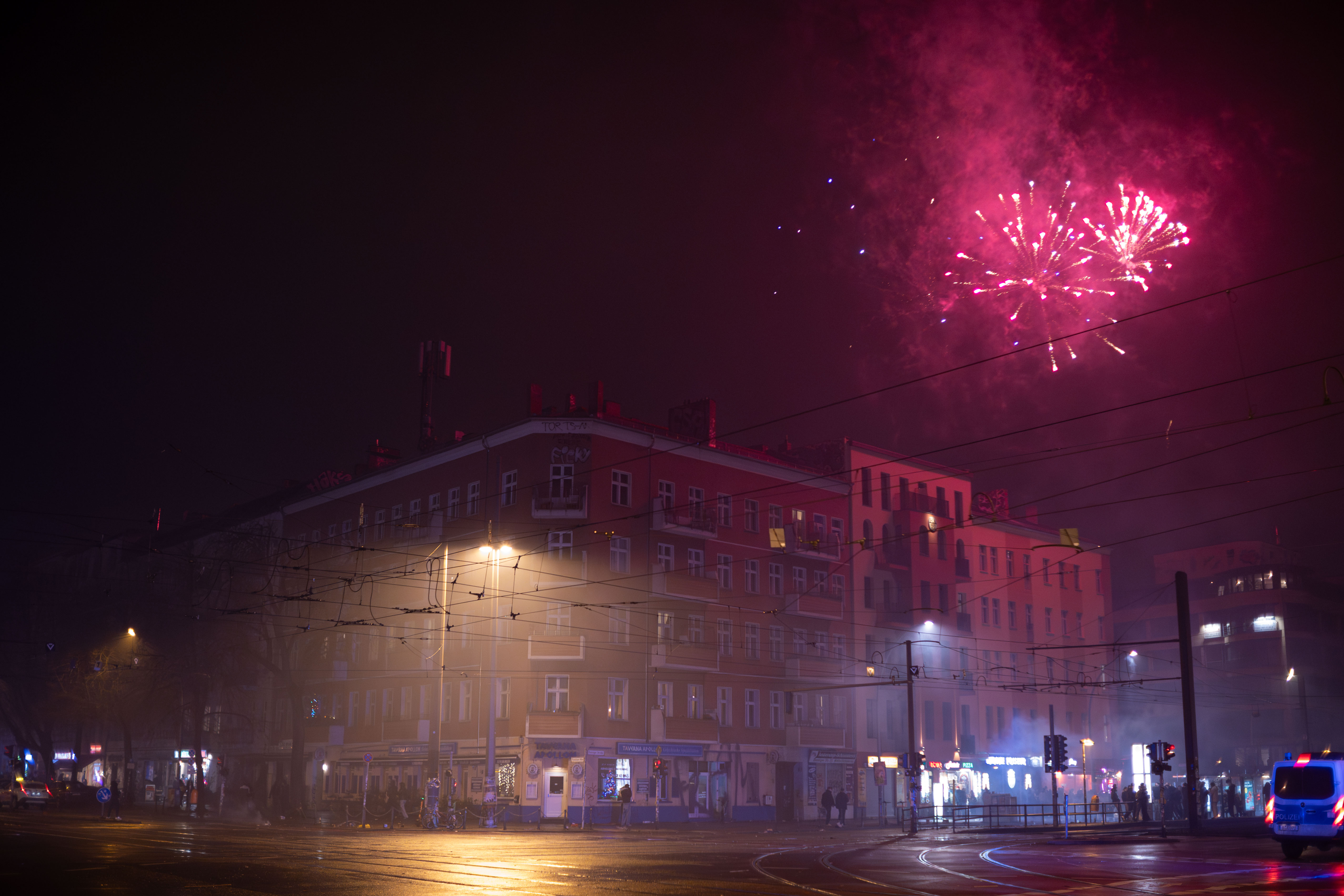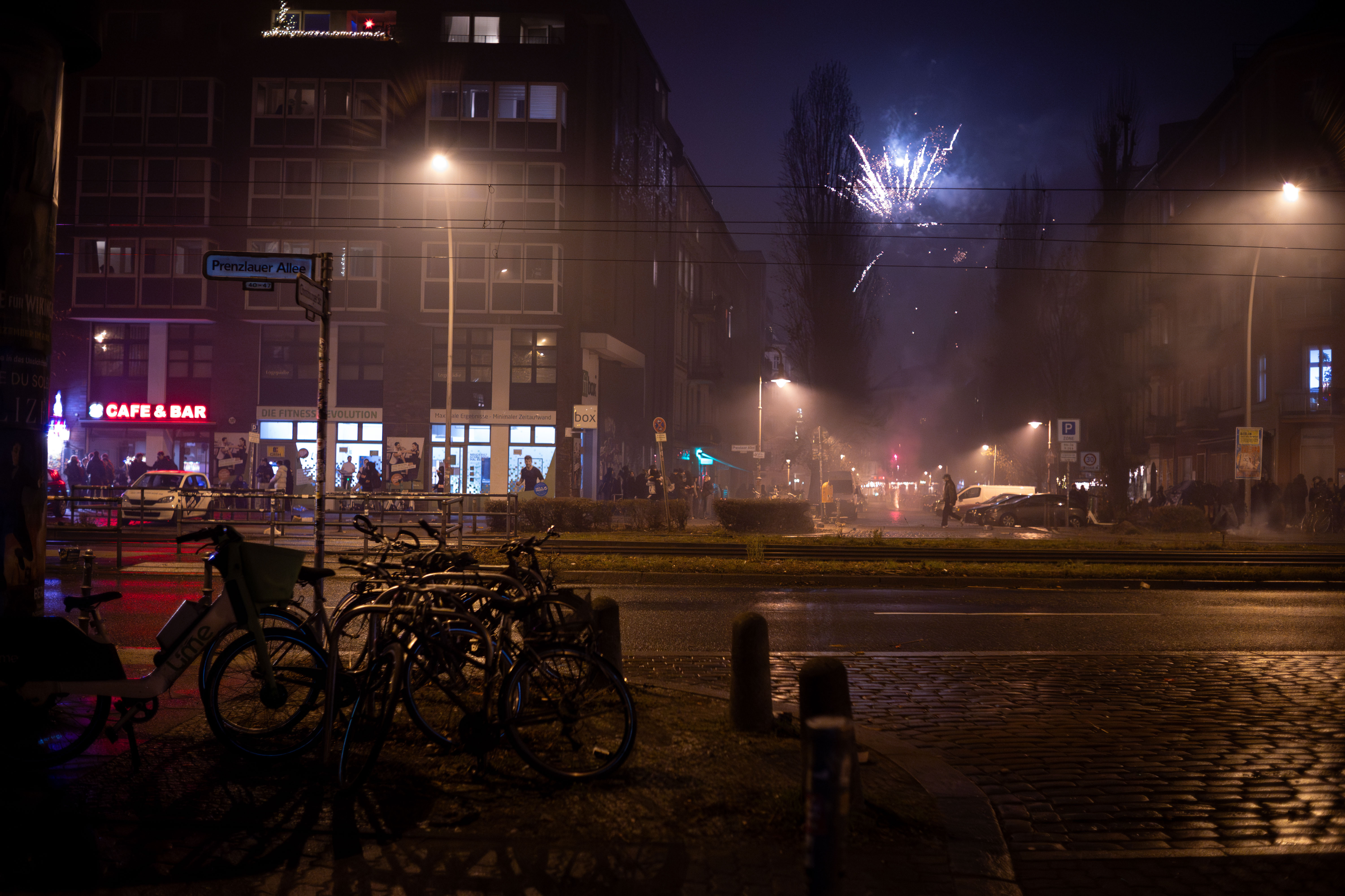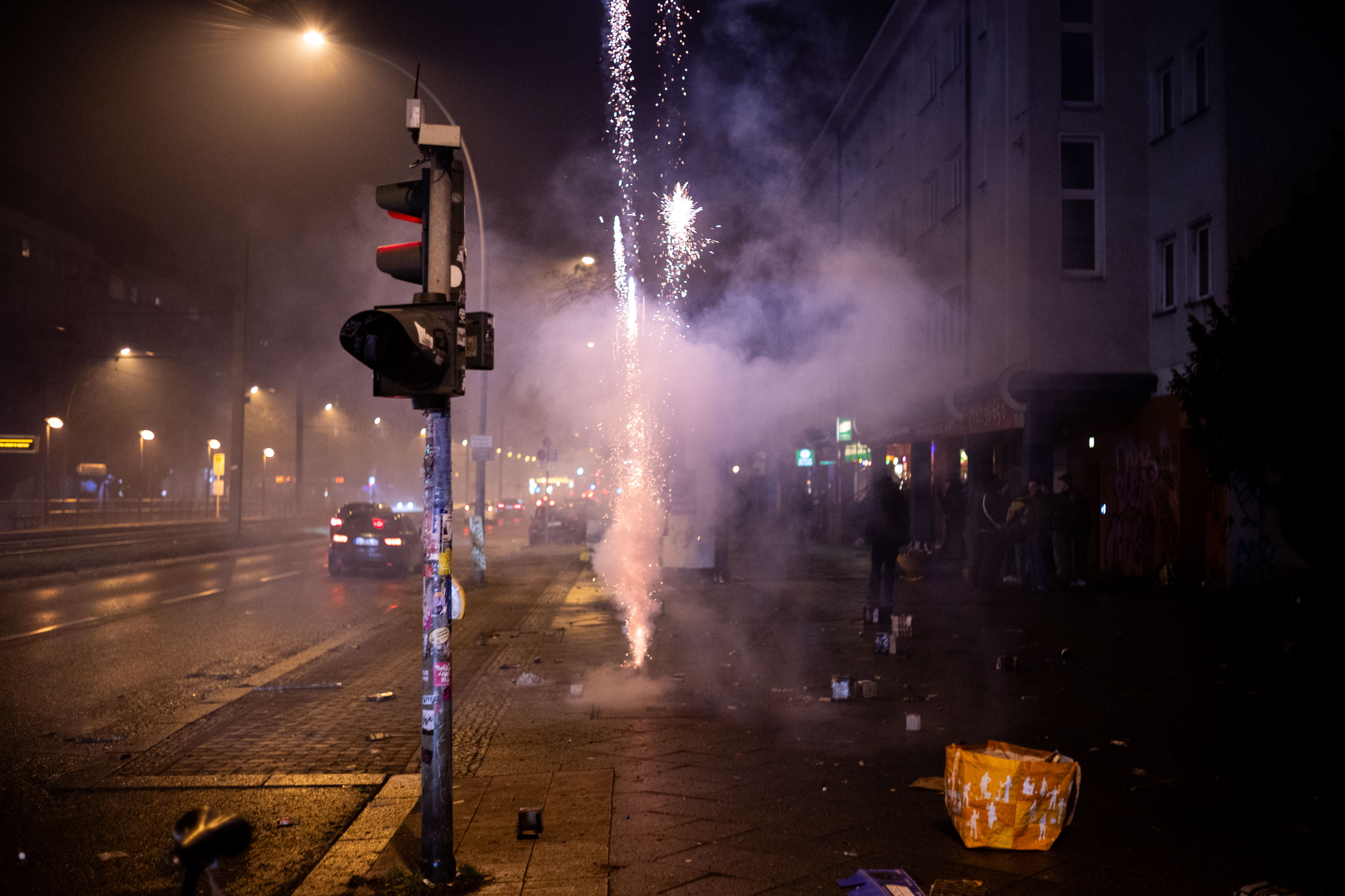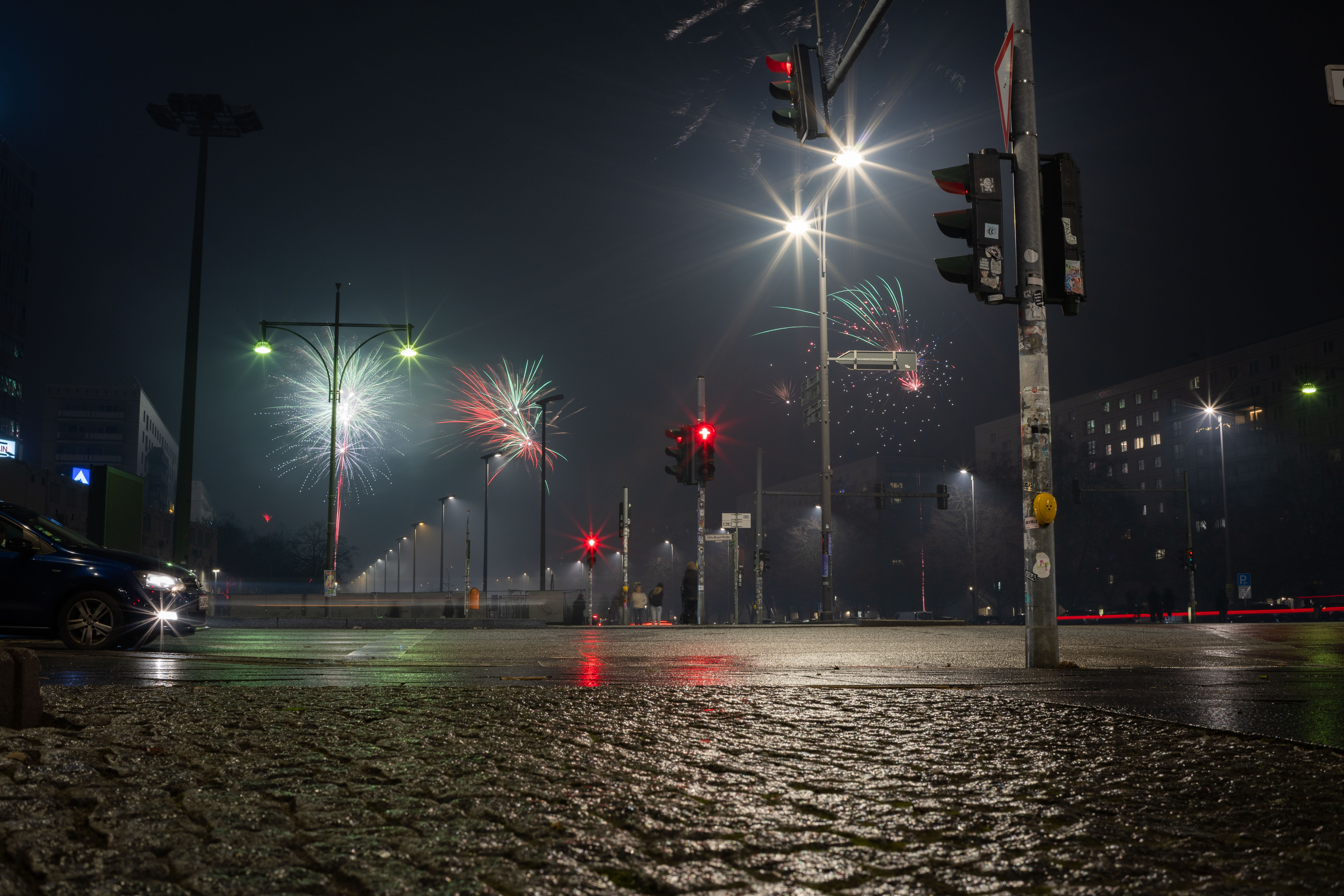 The image captures a vibrant night scene in Berlin, Germany, with a fireworks display illuminating the sky. The fireworks, in hues of red, green, and white, are scattered across the sky, creating a dazzling spectacle. The cityscape in the background features tall buildings and a clock tower, with people visible in the foreground. The image is taken from a low angle, emphasizing the grandeur of the fireworks and the towering structures. The identifier "sa_1500" could be a reference to the specific location or event captured.