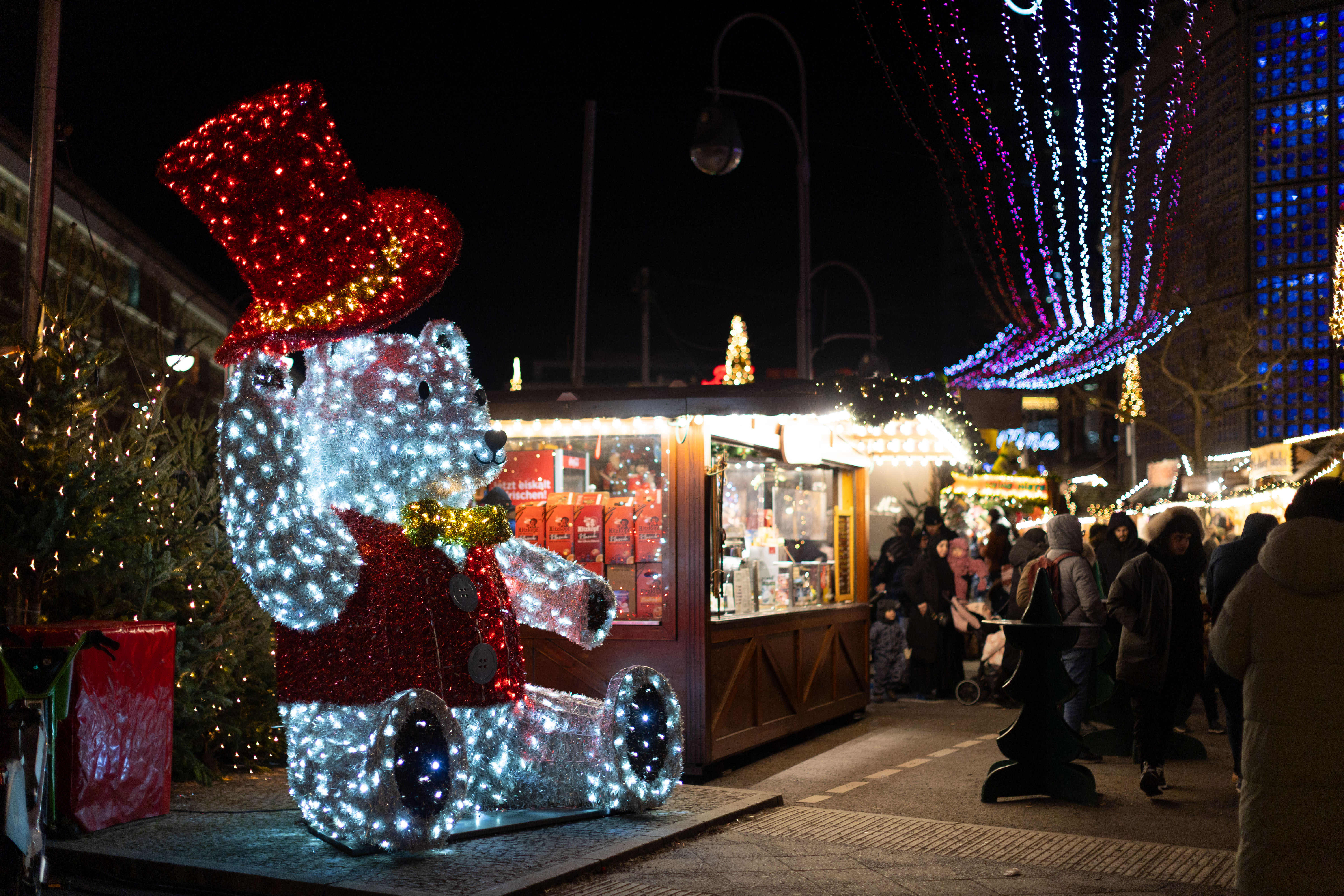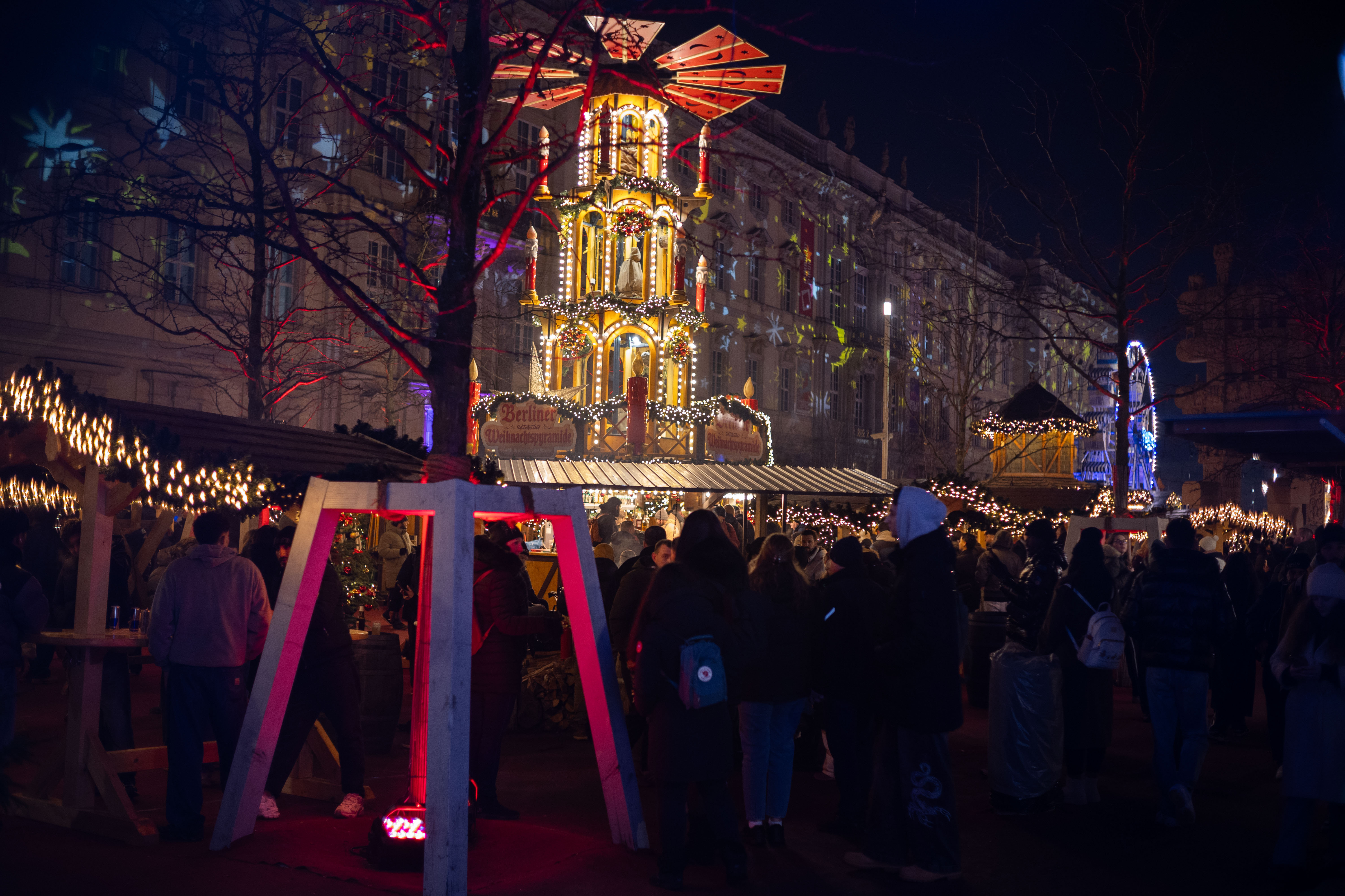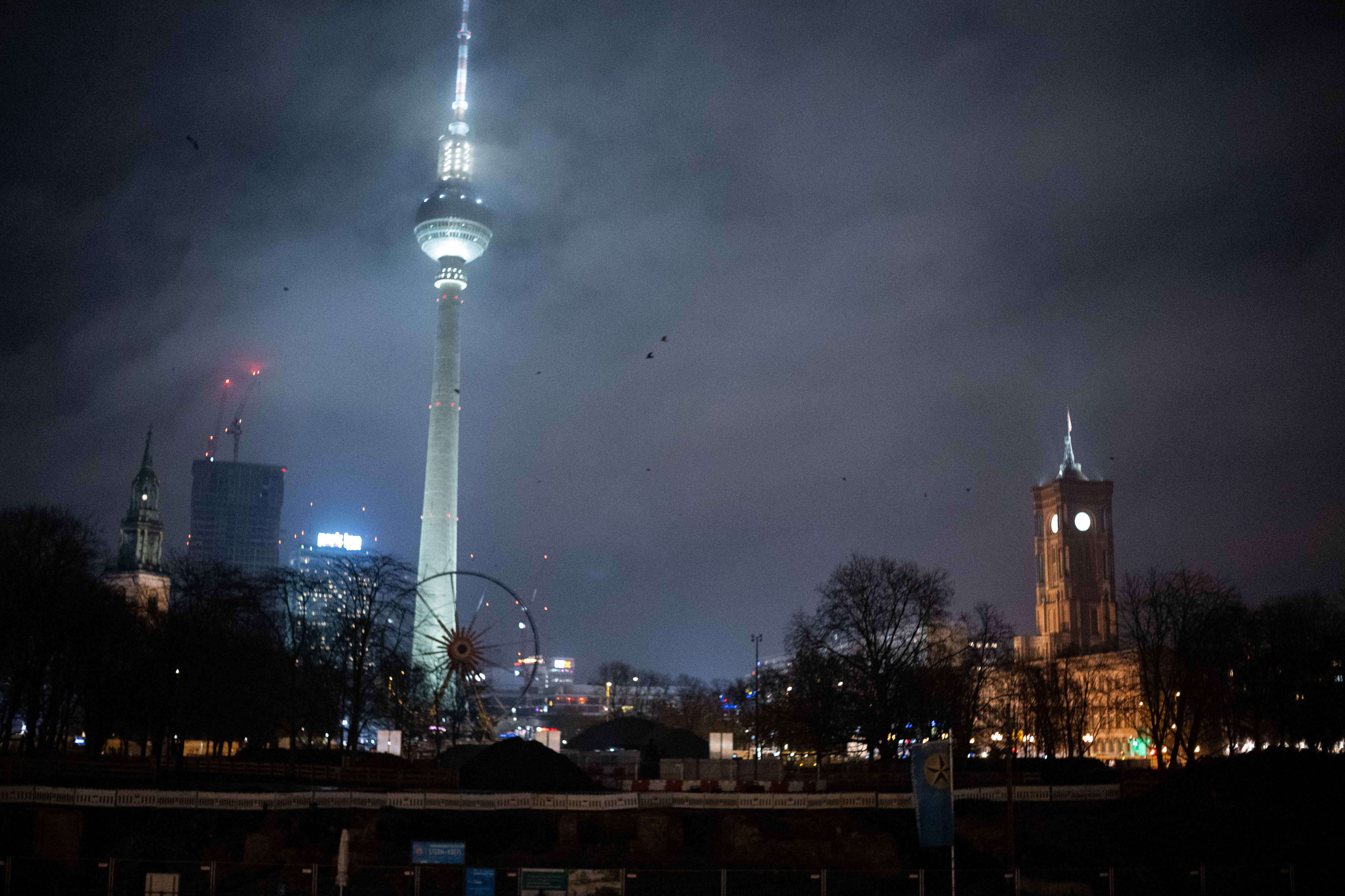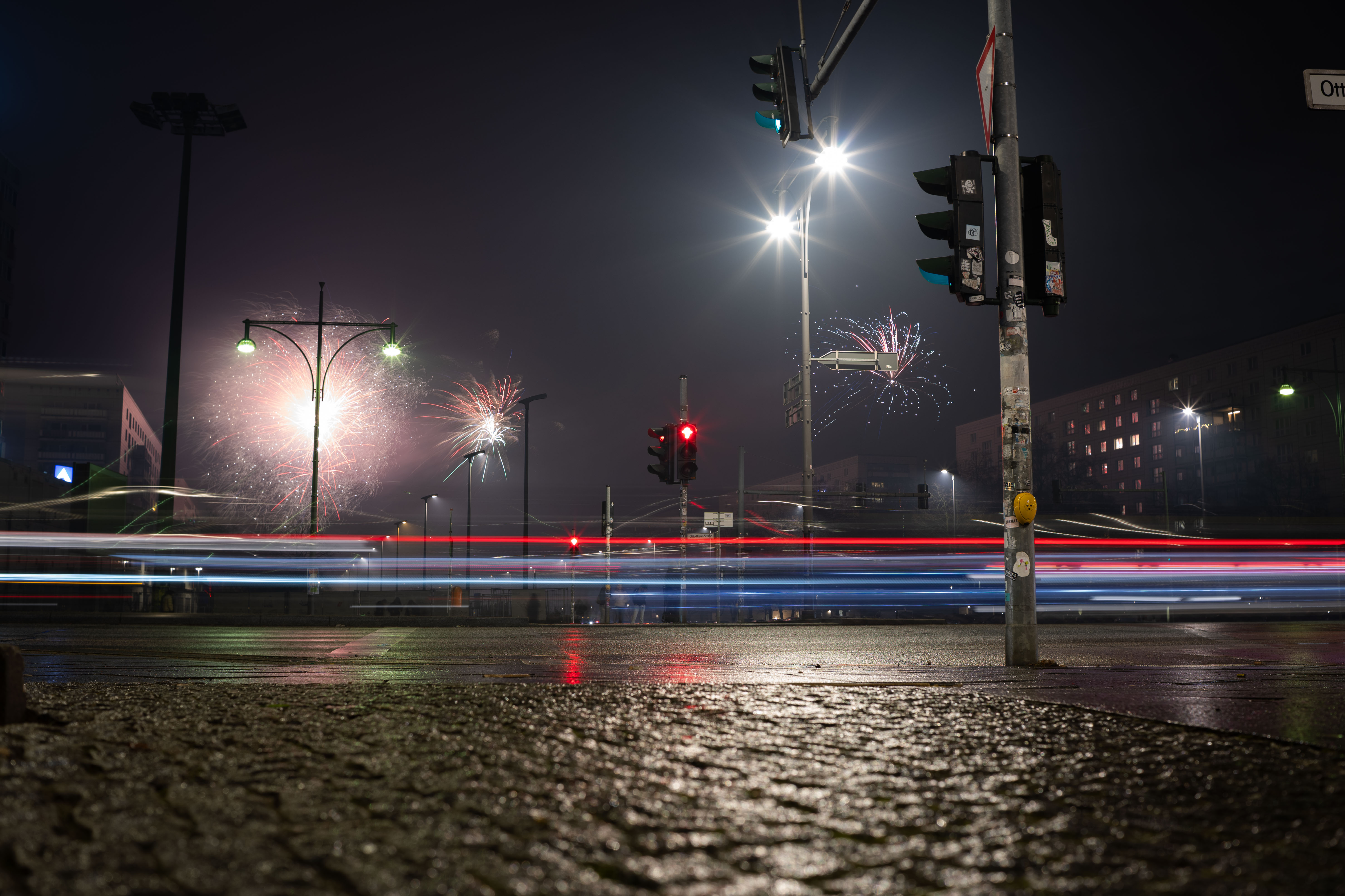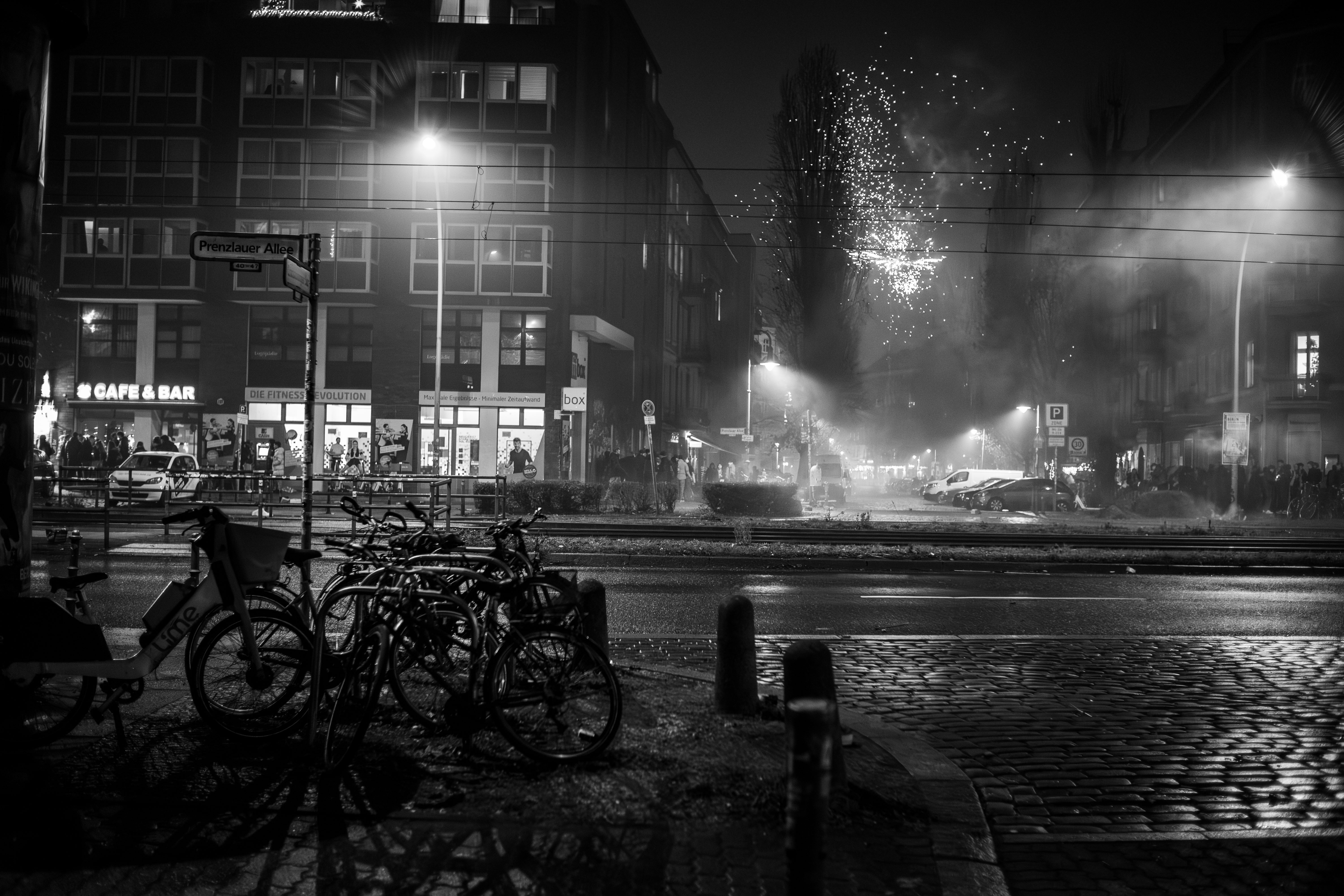 The image captures a vibrant night scene in Berlin, Germany, with a fireworks display illuminating the sky. The fireworks, in hues of red, green, and white, are scattered across the sky, creating a dazzling spectacle. The cityscape in the background features tall buildings and a clock tower, with people visible in the foreground. The image is taken from a low angle, emphasizing the grandeur of the fireworks and the towering structures. The identifier "sa_1500" could be a reference to the specific location or event captured.